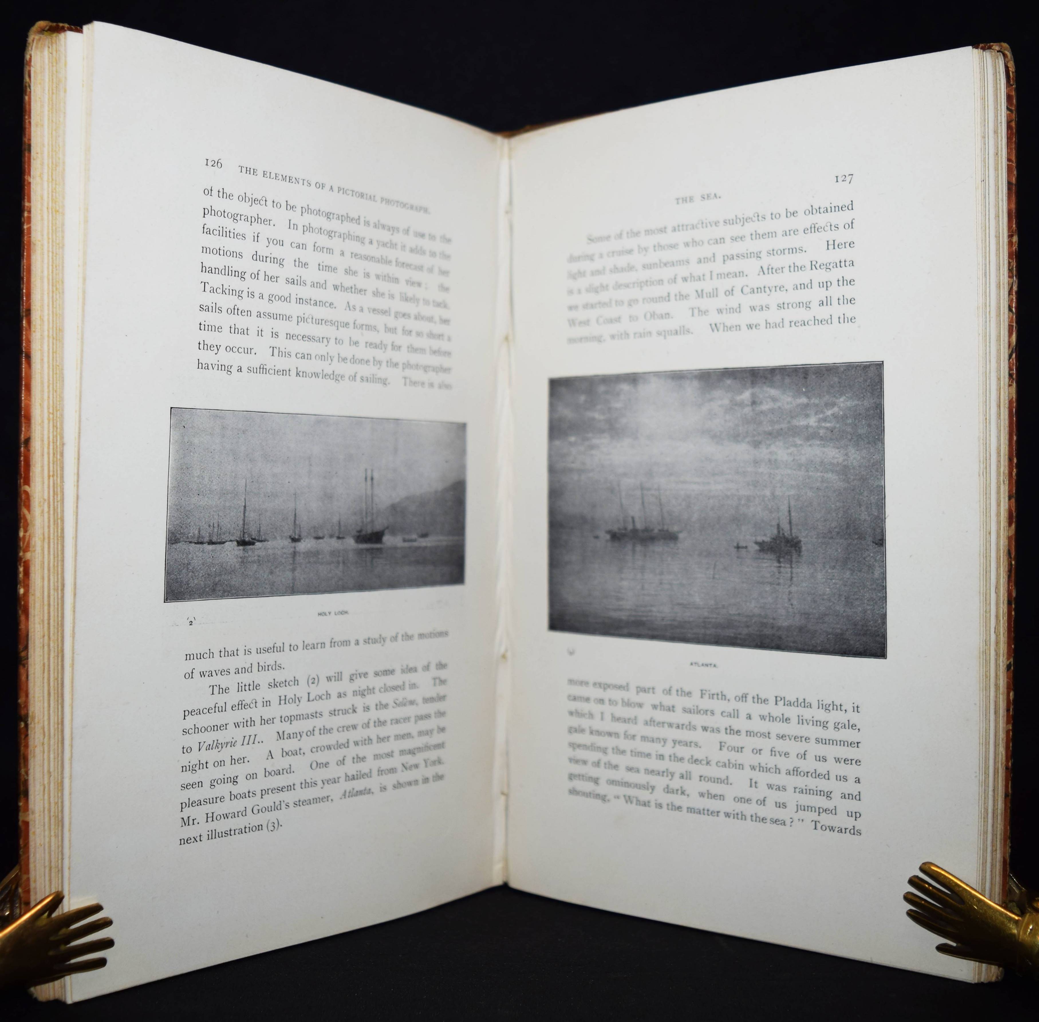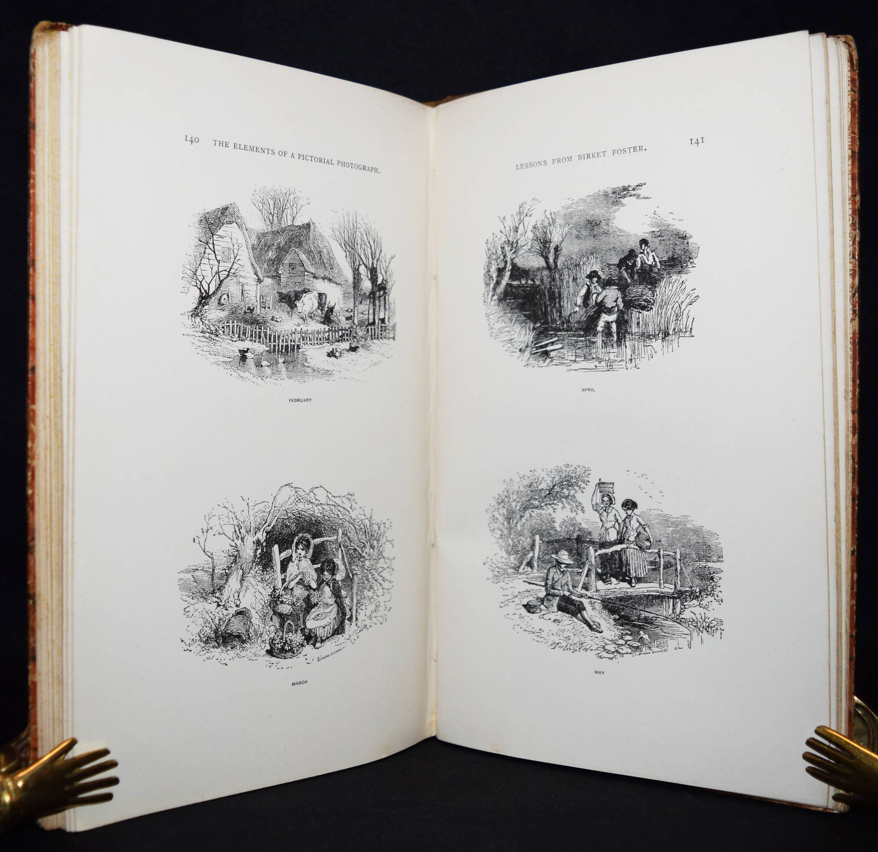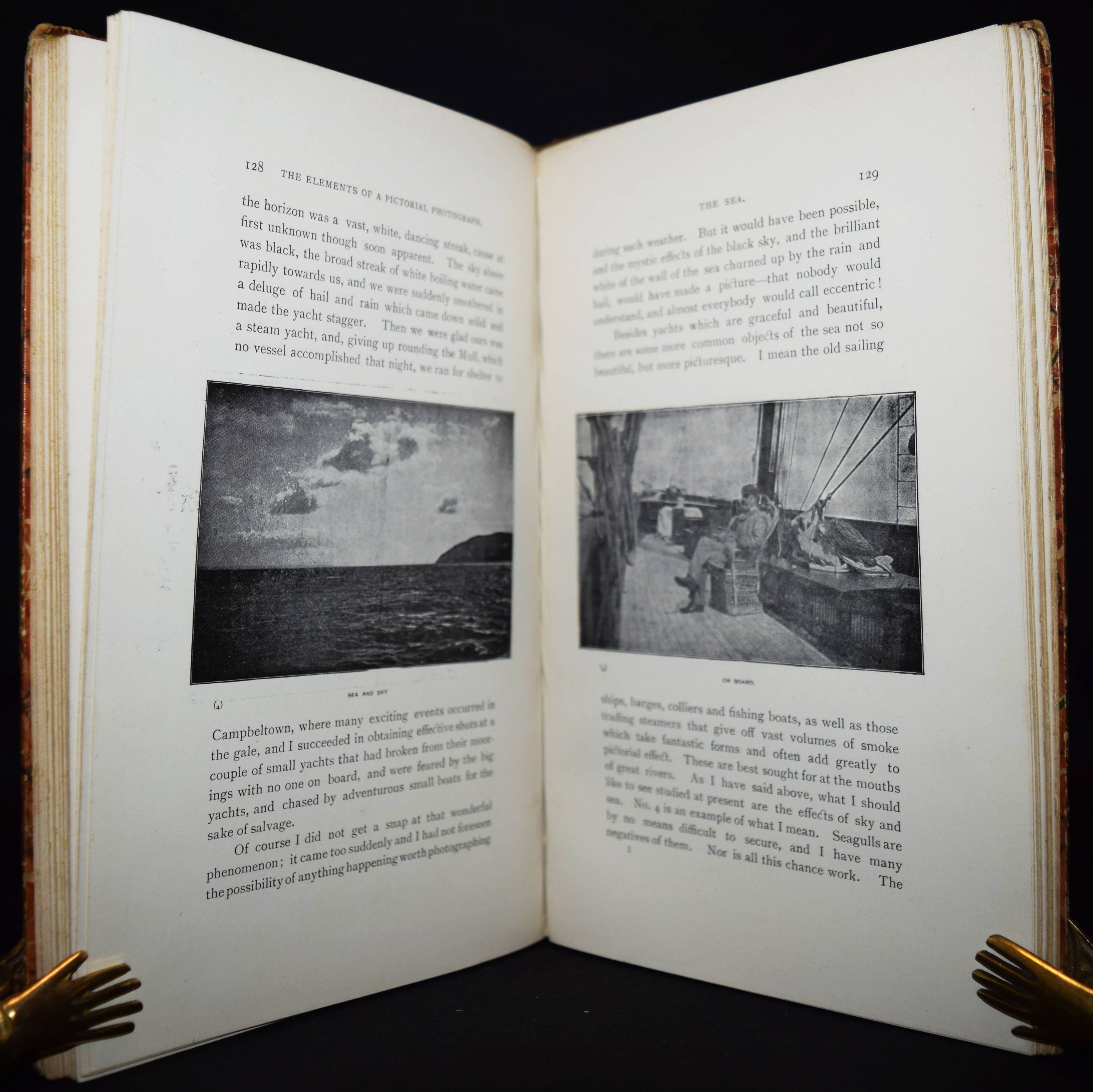 Robinson, H(enry) P(each). The elements of a pictorial photograph. Bradford, London, Percy Lund & Co. 1896. 8°. 167 S., [2] Bl. mit Frontispiz u. 39 Abb. Hln. d. Zt. mit goldgepr. Rückenschild. Roosens/Salu 8508. – Erste Ausgabe. – „(E)influssreichster Vertreter jener Maler-Photographen war Henry Peach Robinson, ursprünglich Buchhändler und Amateurmaler. Er wandte sich, obgleich eines seiner Bilder 1852 in der Royal Academy gezeigt wurde, der Photographie zu und eröffnete 1857 in Leamington Spa ein Porträtatelier. Im Ausgleich für die Massenproduktion von Visitenkartenphotos, mit denen er – wie Rejlander – seinen Lebensunterhalt verdiente, fertigte Robinson in seiner freien Zeit einige Kompositionen an, die er auf die Jahresausstellungen schickte, in der Erwartung, dem Recht der Photographie auf Anerkennung als Kunst auf diesem Wege Nachdruck verleihen zu können. … Wie andere künstlerisch begabte Photographen seiner Zeit begegnete auch Robinson der Überbetonung der photographischen Technik mit großer Abneigung. Die Beschäftigung mit ihr war zum Selbstzweck geworden. „Wir wollen, daß diese Erfindung zu erhabeneren Zwecken eingesetzt wird als bisher“.“ (H. Gernsheim, Geschichte der Photographie S. 297). – Einband etwas berieben, Rückenschild stärker, Wappen-Exlibris, sonst gut erhalten.