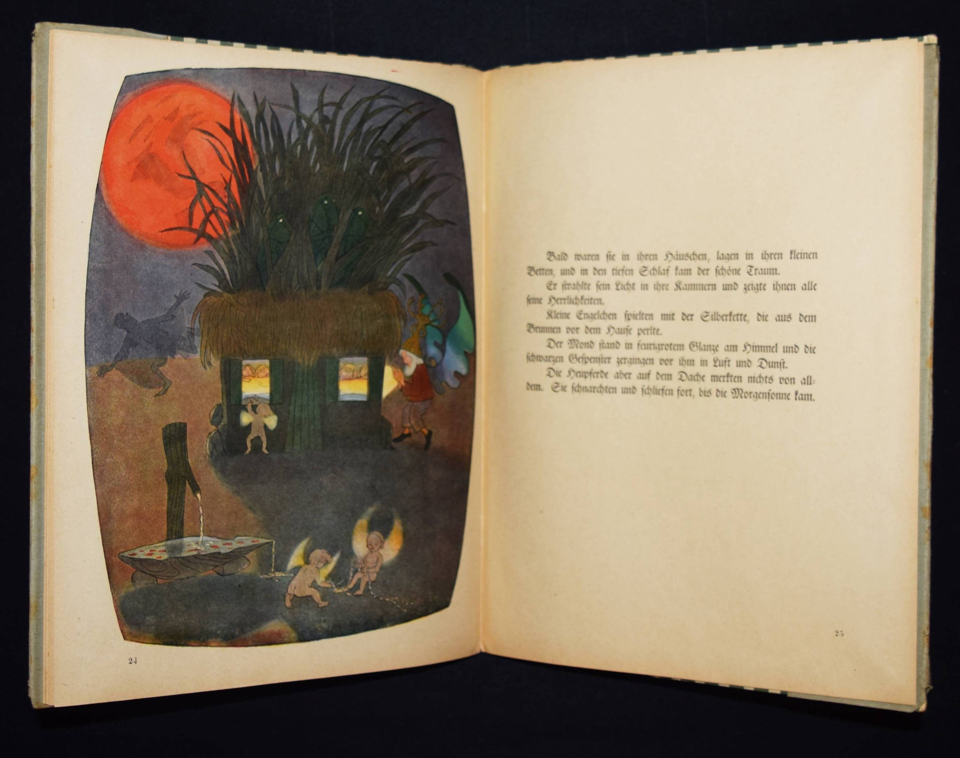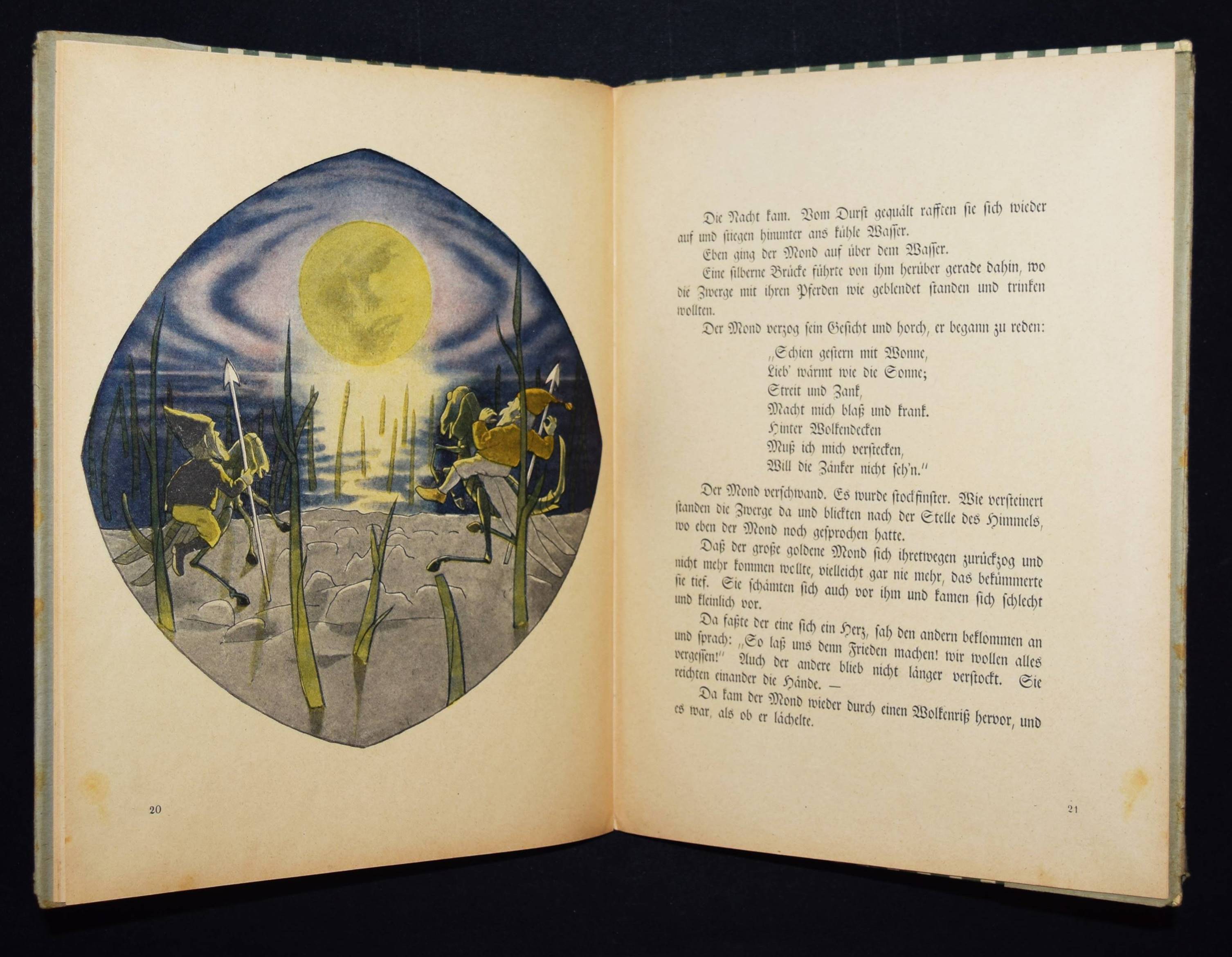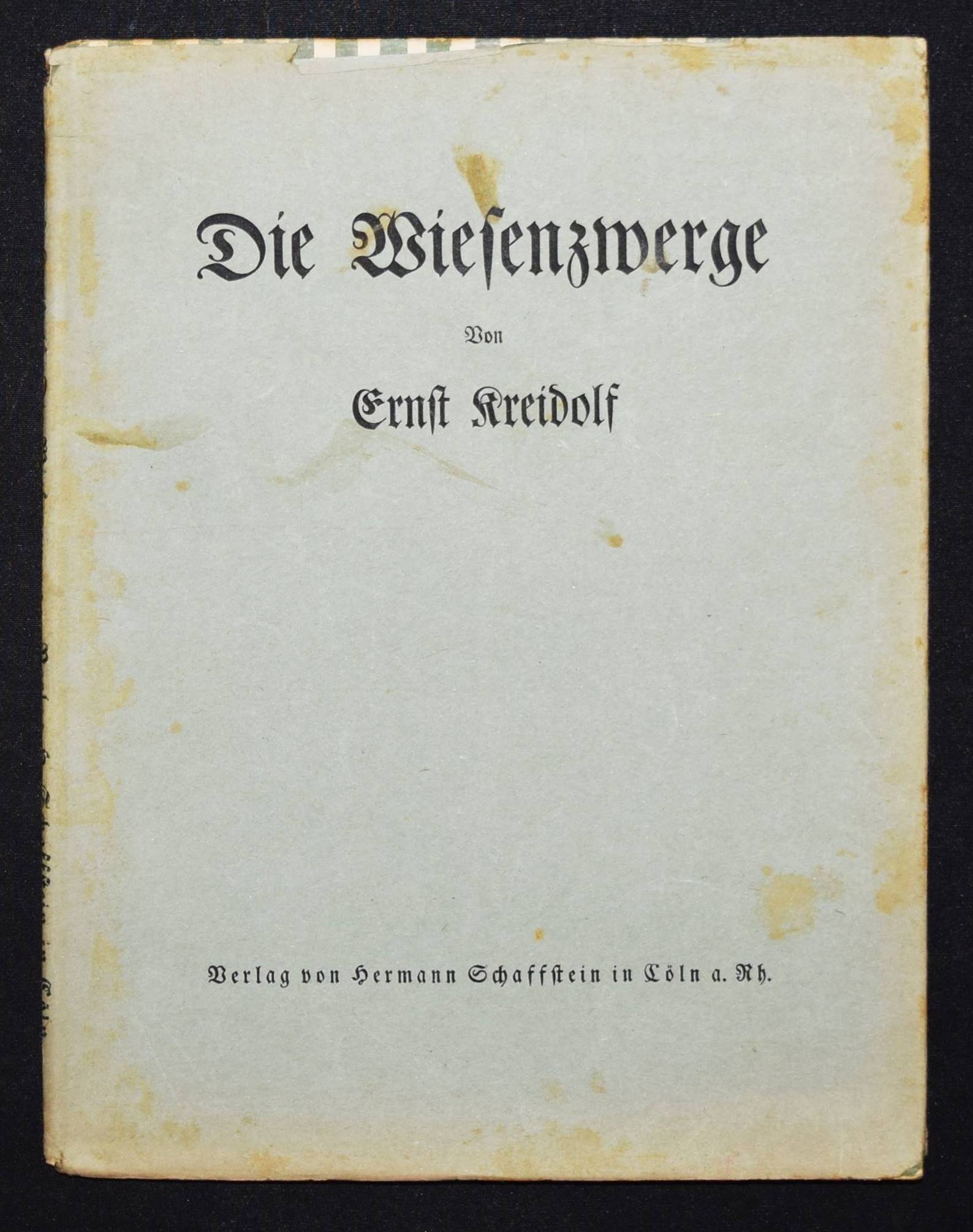 Kreidolf, Ernst. Die Wiesenzwerge. Köln, Schaffstein o. J. (um 1915). 4°. 27, (1) S. farbig illustr. Titel, farbig illustr. Widmungsblatt, 10 Farbtafeln u. Schlußvignette. Illustr. OPbd. mit OU. Bilderwelt 487. Doderer-Müller S. 240 f. Hess-Wachter A 3, S. 26. Huggler 173. LKJ II, 256. Oldenburg, Künstler 132. Ries 659, 5. Stuck-Villa II, 236. – Neue Ausgabe von Kreidolfs erfolgreichstem Bilderbuch, hier erstmals mit pag. Seiten; die Verlagsanzeige am Schluß von „Alte Kinderreime“ bis „Strabanzerchen“. Die erste Ausgabe erschien 1902 mit der Verlagsangabe „Schafstein & Co.“ – „Die Illustrationen dieses Buches mit den vermenschlichten Zwergen verweisen durch die unterschiedliche lineare Begrenzung der Bildformate sowie durch die Betonung vegetabiler Bildelemente auf den Formenvorrat des Jugendstils… Im Vergleich mit dem „Blumen-Märchen“ sowie späteren Werken Kreidolfs sieht Halbey in den künstlerischen Mitteln dieses Buches „eine Rückflucht in Bilderbuchgewohnheiten des 19. Jahrhunderts“, die eine „mehr aus der Tradition begreifbare Grundhaltung im Bildnerischen“ offenbare. In den „Wiesenzwergen“ stellt er… eine Unentschiedenheit zwischen der „ganz in den Jugendstil gehörenden dekorativen Malweise“ und „völlig naturalistisch gemalten“ Bildteilen fest (S. 239-240)“ (U. Rütten in Oldenburg, Künstler). – Der meist fehlende Schutzumschlag etwas braunfleckig und mit Randläsuren (Einriss am Rückendeckel ca. 4 cm.), Widm. a. T. (dat. 1925), gutes Exemplar.