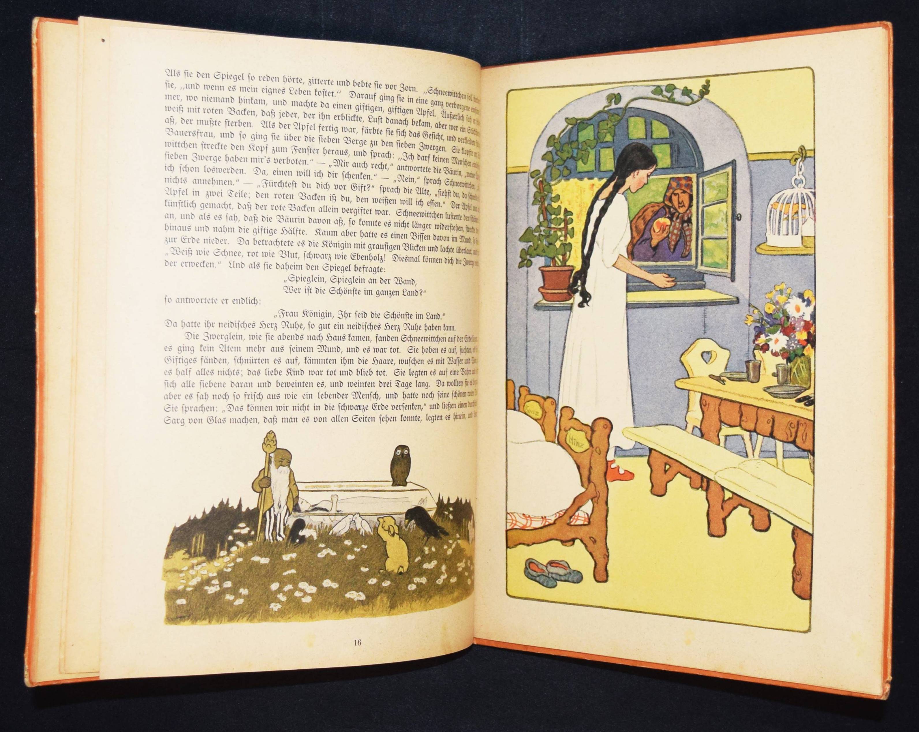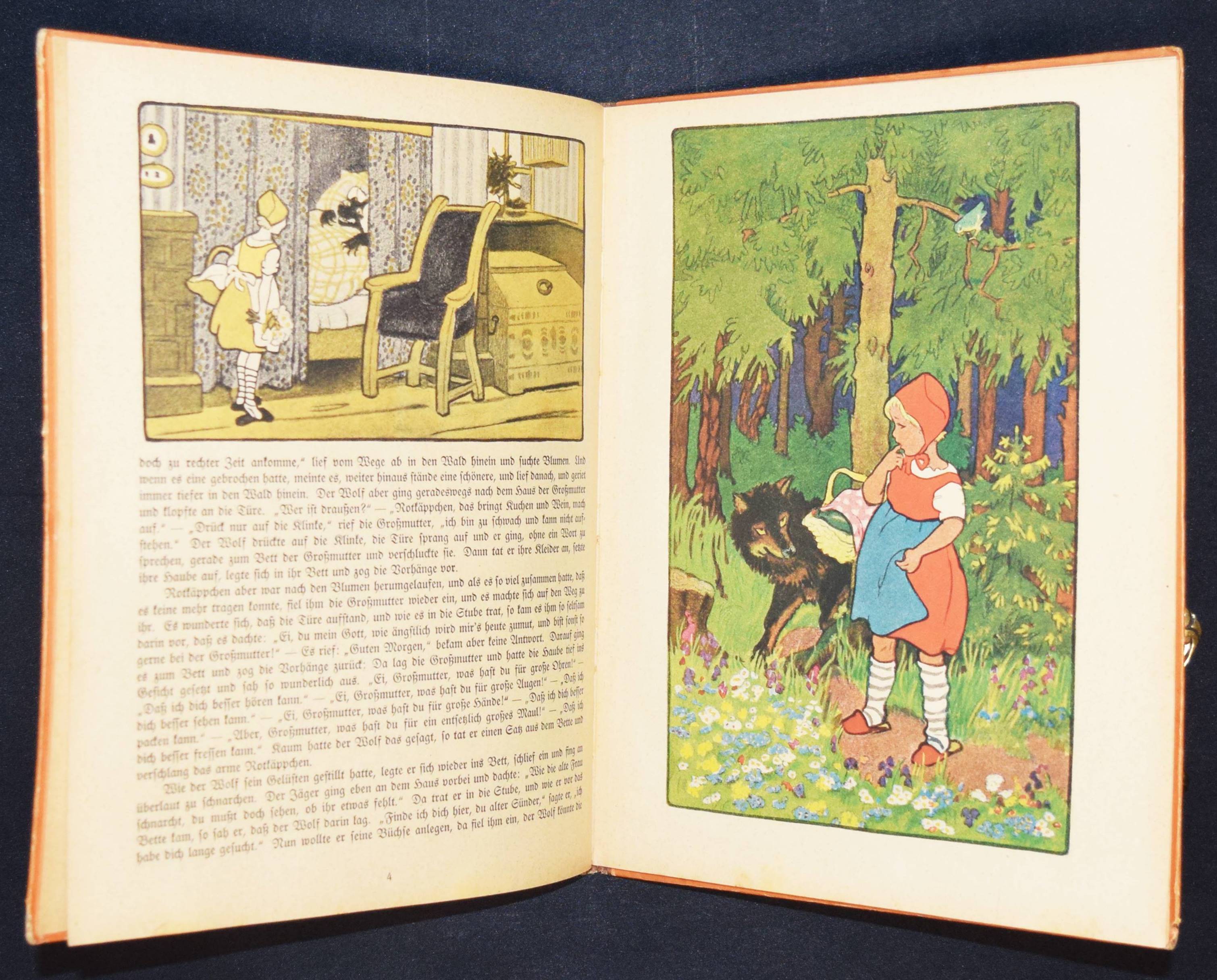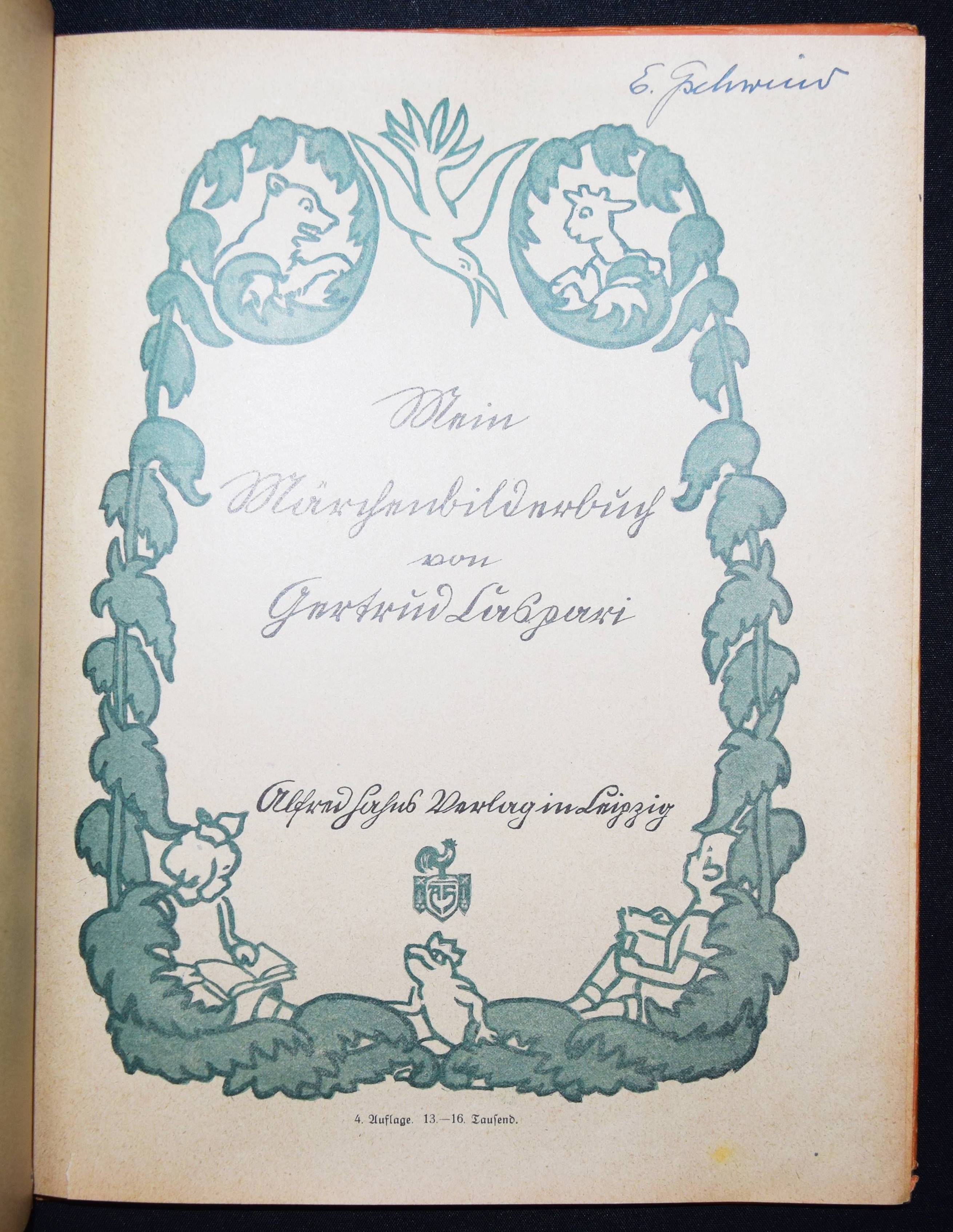 Caspari, Gertrud. Mein Märchenbilderbuch. 4. Aufl. Leipzig, Hahn o. J. (um 1925). 4°. 32 S. mit farbig illustr. Titel, 4 Farbtafeln u. 39 zwei- bzw. dreifarb. Illustrationen. Farbig illustr. OHln. LKJ I, 248. Neubert 29.4. – Zuerst 1921 erschienenes Märchen-Bilderbuch der bekannten Bilderbuchkünstlerin. – Mit den Märchen: Rotkäppchen, Hänsel und Gretel, Schneewittchen, Dornröschen, Aschenputtel, Der Wolf und die 7 Geislein und Frau Holle. – Rücken und Kanten etwas berieben, zeitgenöss. Besitzvermerk a. D., papierbedingt etwas gebräunt, gutes Exemplar.