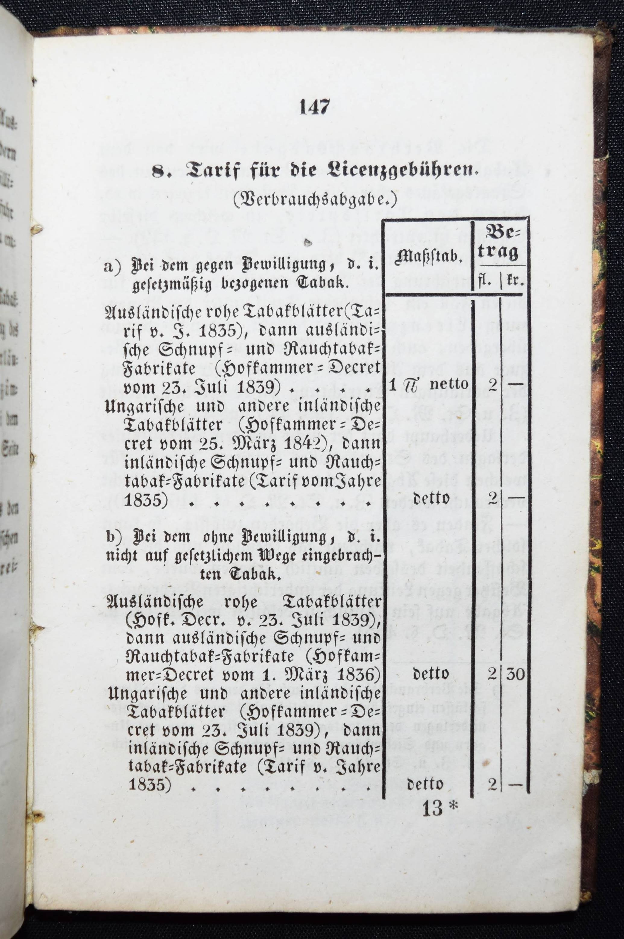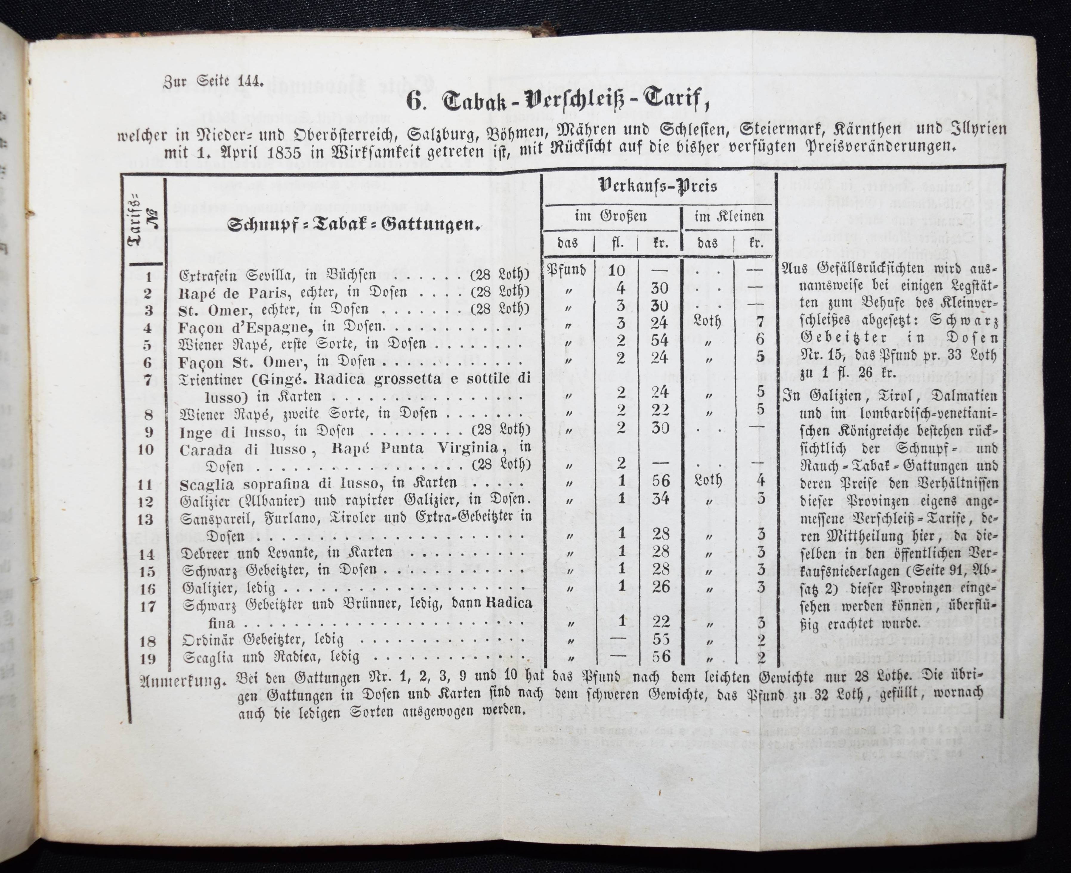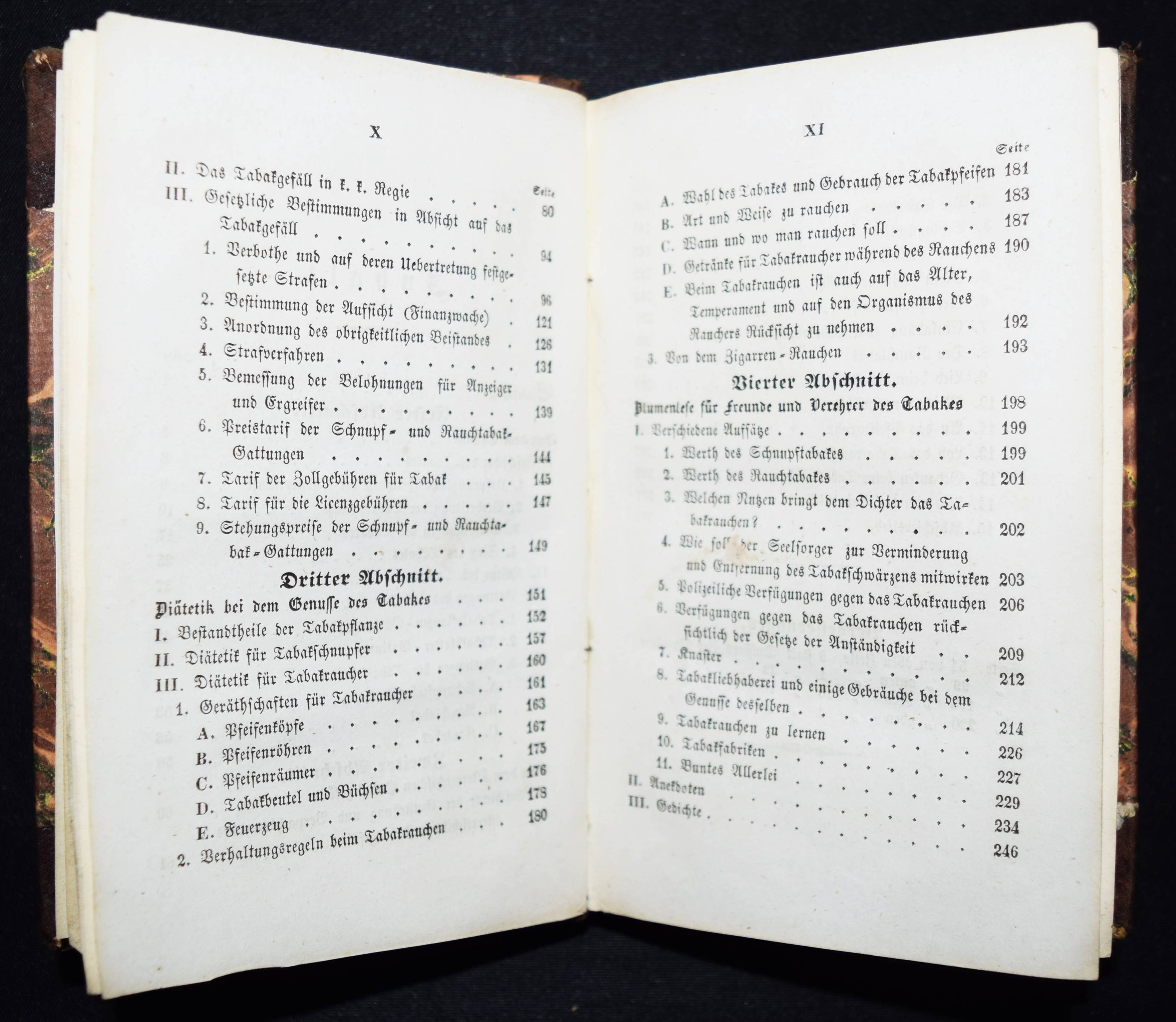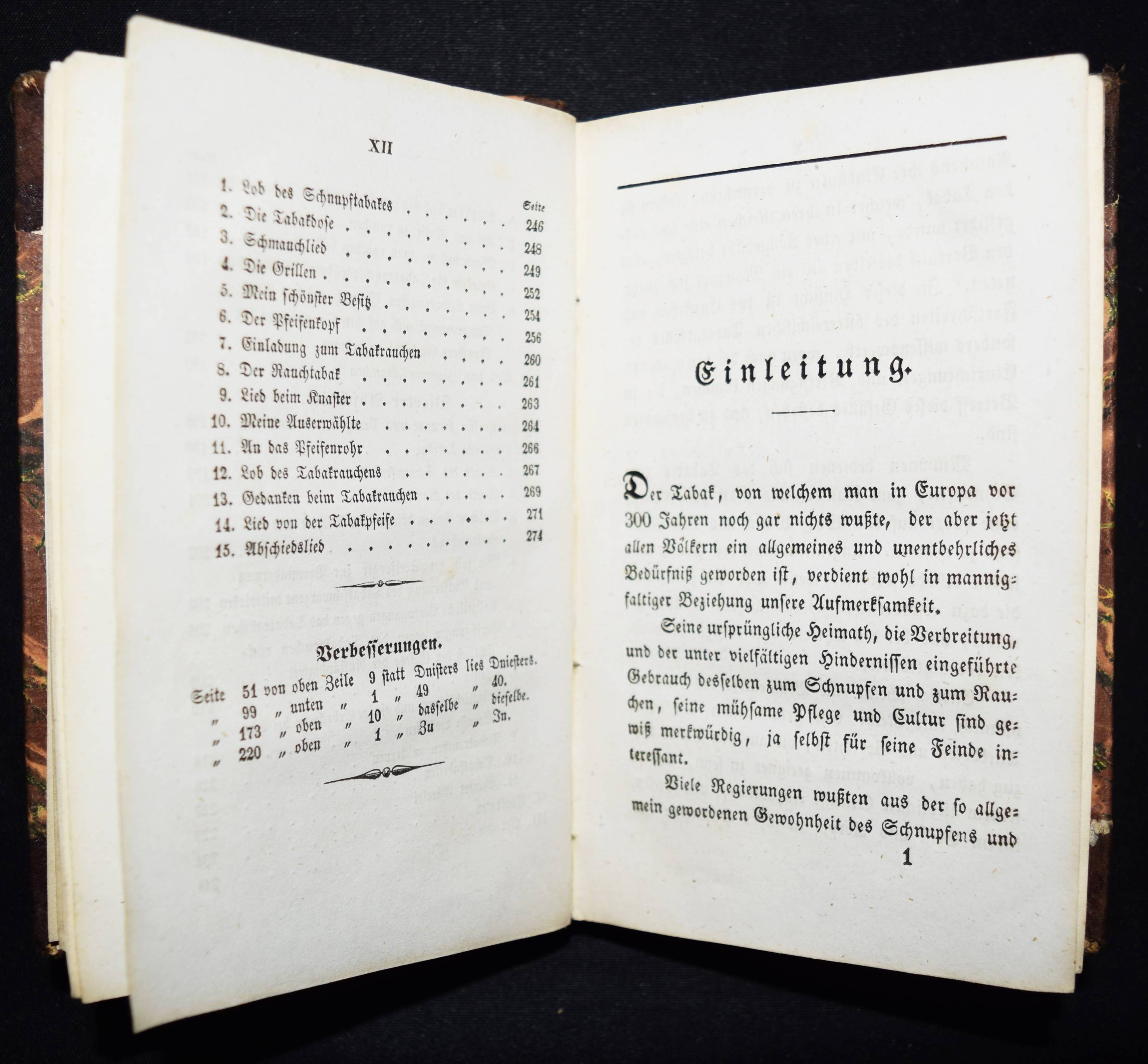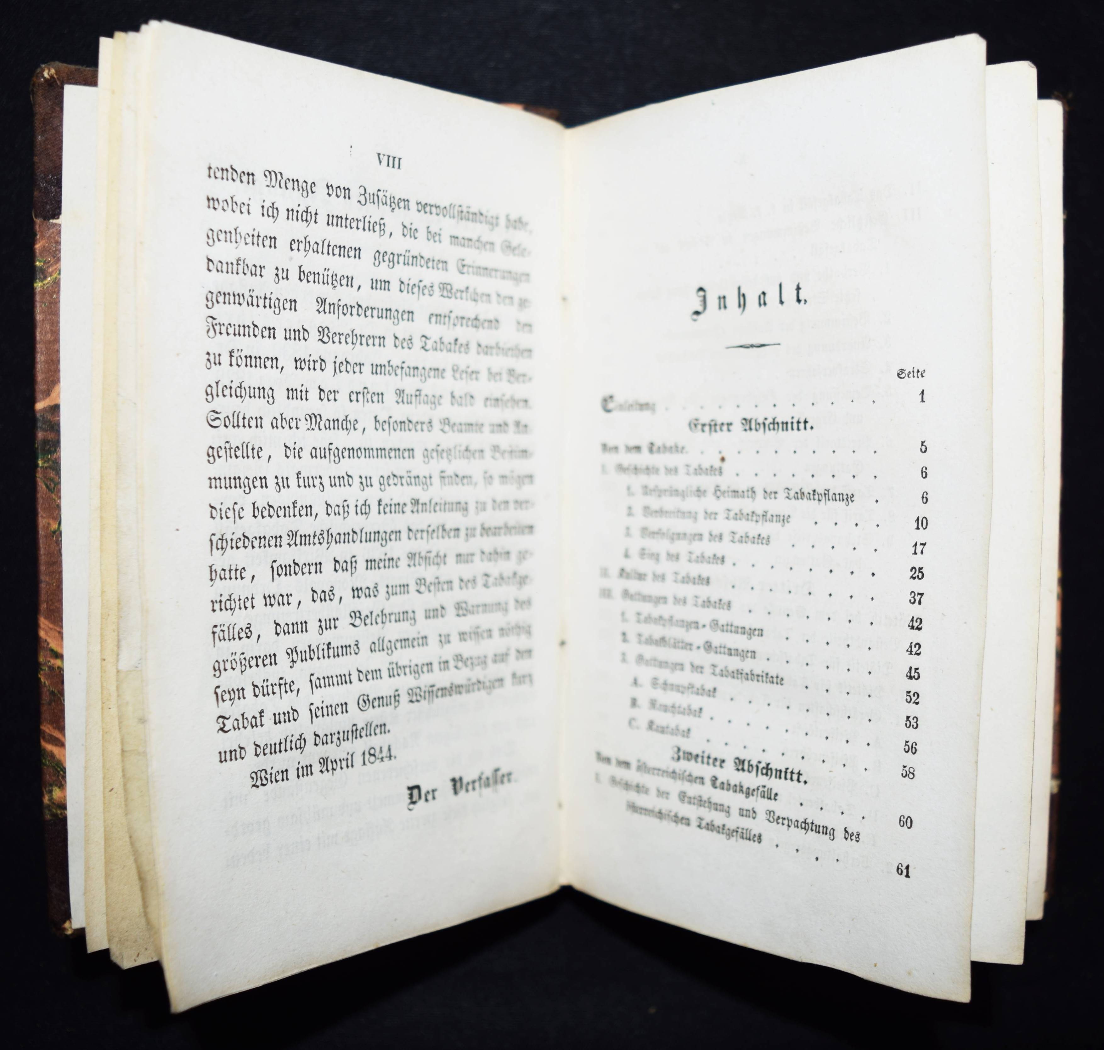 Hornstein, Anton. Der Tabak in historischer, finanzieller und diätetischer Beziehung, mit einer Blumenlese. Ein Taschenbuch für Freunde und Verehrer desselben. 2. (umgearb.) Aufl. Wien, Jasper 1845. Kl.-8°. XII, 275 S. Hln. d. Zt. mit mont. typogr. OU. Immensack 111. Vgl. Arents IV, 1336 (EA Brünn 1828): „General treatise on tobacco, with anecdotes and poems in praise of it“. – Einband etwas berieben, St.a.T, nur vereinzelt leicht fleckig, gutes Exemplar.