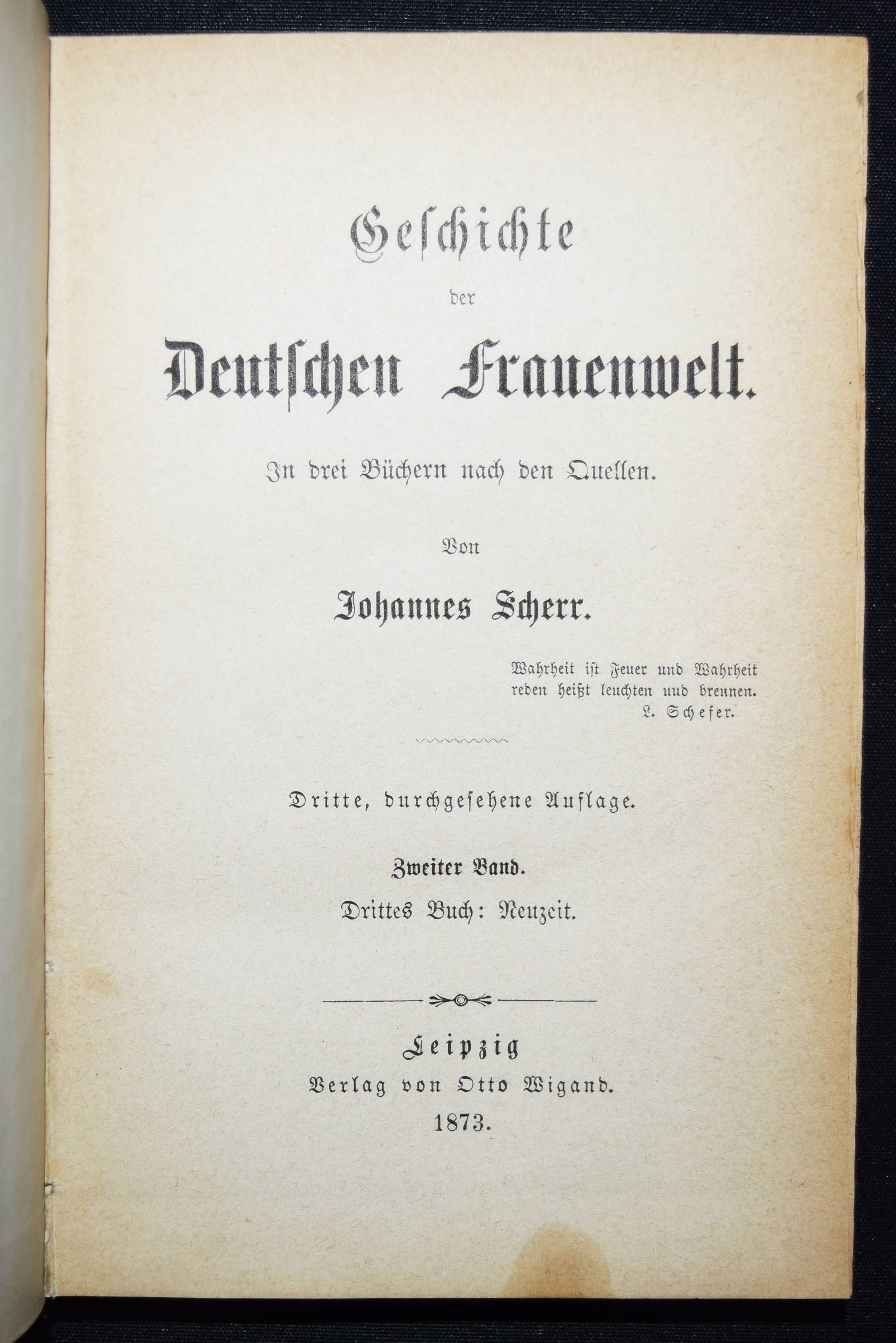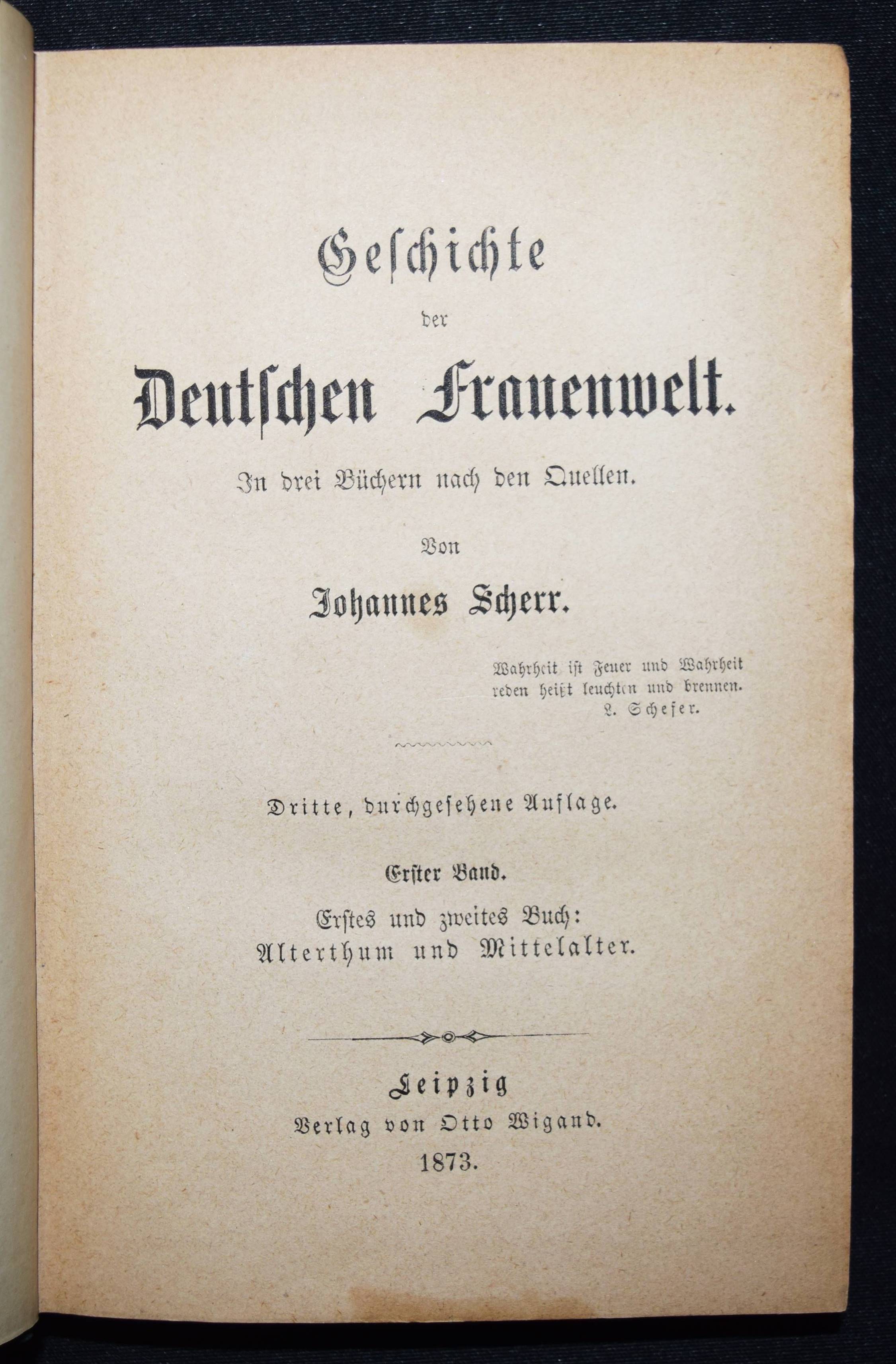 Scherr, Johannes. Geschichte der deutschen Frauenwelt. In drei Büchern nach Quellen. Erster Band: Erstes und zweites Buch: Alterthum und Mittelalter. Zweiter Band. Drittes Buch: Neuzeit. 3, durchgesehene Auflage. 2 Bände. Leipzig, Otto Wigand 1873. 8°. X, 320 S., [1] Bl.; Titel, 310 S., [1] Bl. OLn. mit goldgepr. Rückentitel. Hayn-Gotendorf VII, 147 f.: „… geschätztes und hochinteressantes Werk“. – Einbände geringf. berieben, papierbedingt gebräunt, gutes Exemplar.