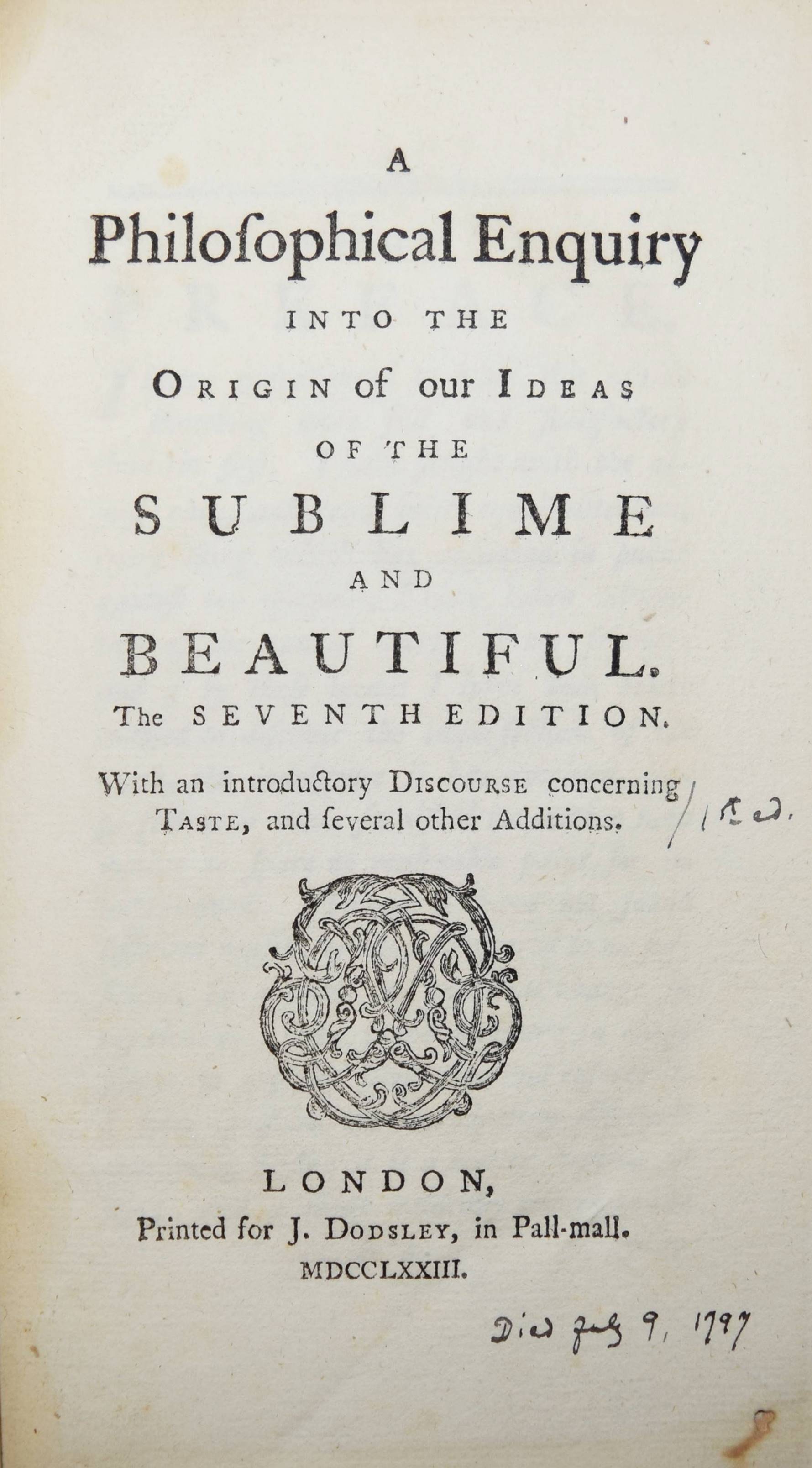 (Burke, Edmund). Philosophical enquiry into the origin of our ideas of the sublime and beautiful. With an introductory discourse concerning taste, and several other additions. The seventh edition. London, Printed for J. Dodsley in Pall-mall 1773. 8°. IX, (7), 342 S. Lederband der Zeit mit goldgepr. Rückenschild und Linienvergoldung. Lowndes I, 316. Vgl. Ziegenfuss I, 160. – Burkes sensualistische Ästhetik erschien erstmals 1756 und war seine zweite größere Schrift. – Eine deutsche Übersetzung von Garve erschien ebenfalls 1773 in Riga. – Der britische Ästhetiker und Politiker E. Burke (1729-1797) „begründet die Ästhetik psychologisch. Er ordnet dem Selbsterhaltungstrieb das Erhabene, dem Geselligkeitstrieb das Schöne zu; aus dem Streben nach Selbsterhaltung entspringen Handlungen, die gefahrvoll sind und Schmerzen bringen können. Das dadurch ausgelöste Empfinden, das man uns die Vorstellung von diesen Unlustgefühlen vermittelt, ohne daß wir uns selbst in der gedachten Situation befinden, ist das Gefühl des Erhabenen. Aus dem Geselligkeitstrieb entspringen lustvolle Handlungen der Sympathie und des Wohlwollens, die uns positiv Freude bereiten und das Gefühl des Schönen auslösen“ (W. Ziegenfuss). – Gelenke alt restauriert´, gestoch. Exlibris u. zeitgenöss. Besitzvermerk a. V. u. T., gutes sauberes Exemplar. – Burke’s sensualist aesthetics first appeared in 1756 and was his second major work. – A German translation by Garve was also published in Riga in 1773. – The British aesthetician and politician E. Burke (1729-1797) “founded aesthetics psychologically. He assigns the sublime to the instinct of self-preservation and the beautiful to the instinct of sociability; actions that are dangerous and can cause pain arise from the pursuit of self-preservation. The feeling triggered by this, which gives us the idea of these feelings of unpleasantness without us being in the imagined situation ourselves, is the feeling of the sublime. Pleasurable acts of sympathy and benevolence arise from the sociability instinct, which give us positive pleasure and trigger the feeling of beauty” (W. Ziegenfuss). – Joints ‚old restored‘, engraved bookplate. Engraved bookplate and contemp. Ownership note on front and back, good clean copy.