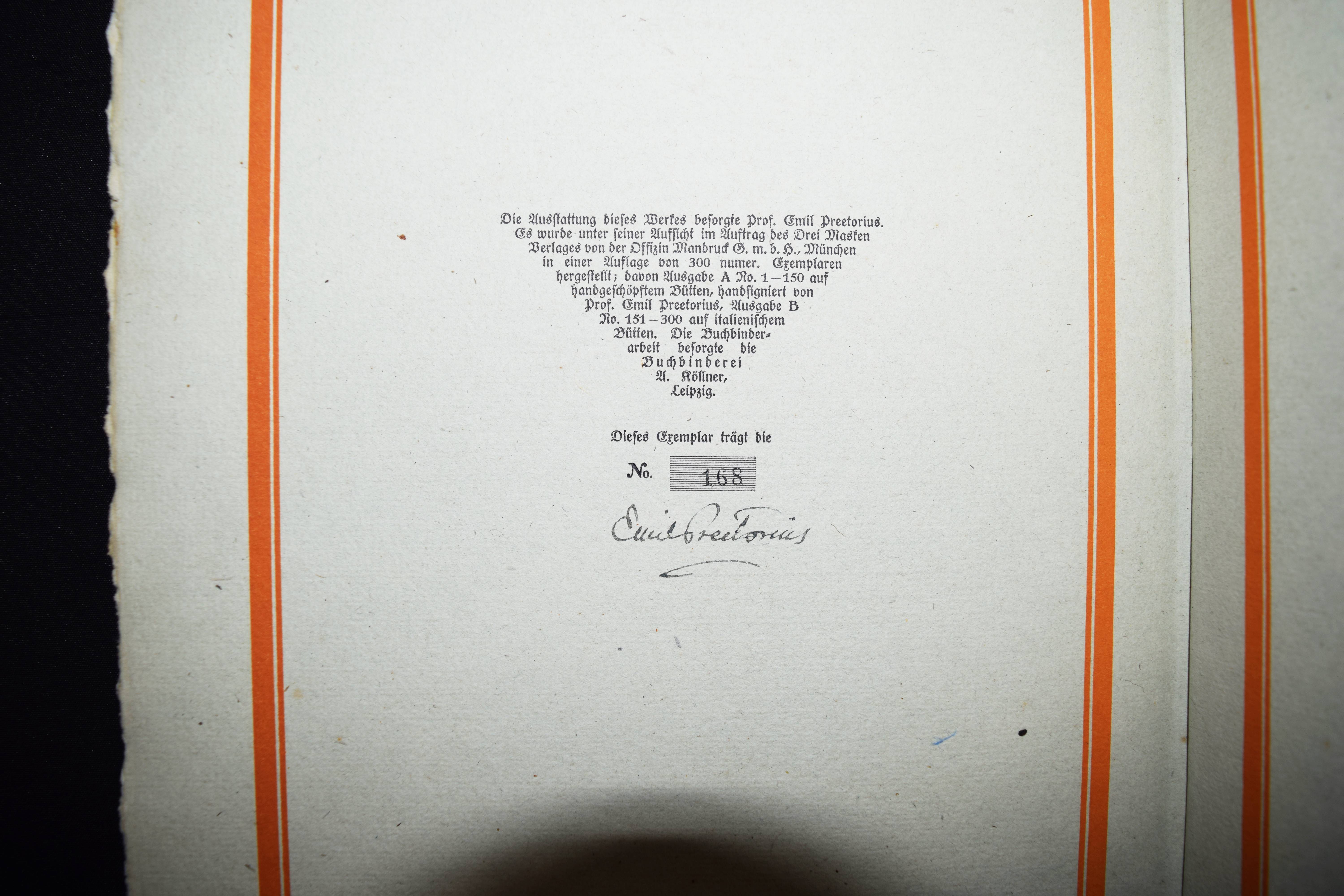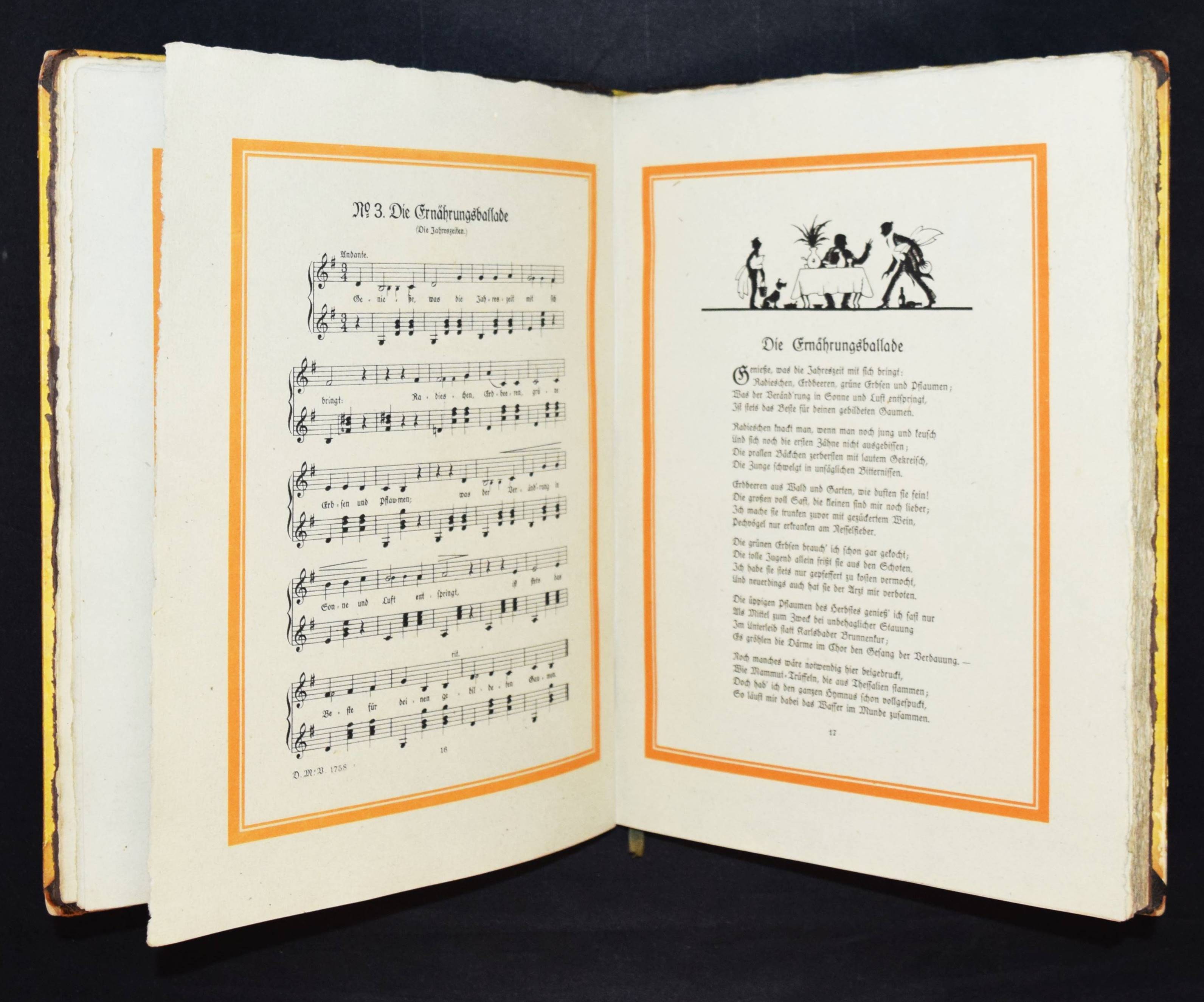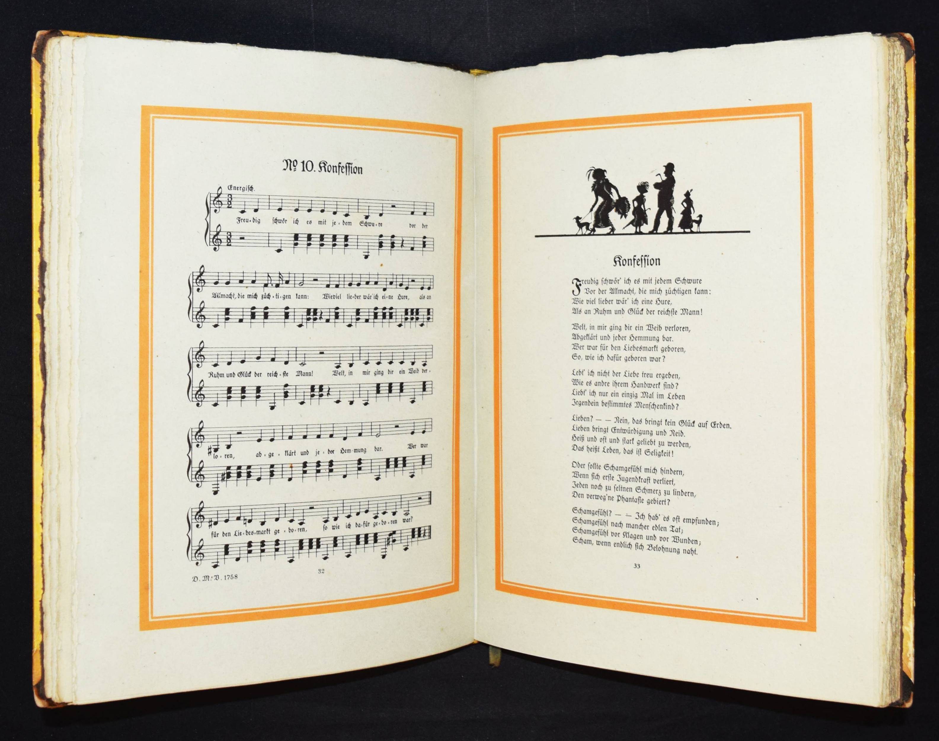 Wedekind, Frank Lautenlieder. 53 Lieder mit eigenen und fremden Melodien. München, Drei Masken-Verlag 1920. 4°. 173, (3) S. mit farbig illustriertem Titel und zahlreichen Vignetten von Emil Preetorius. OHldr. mit goldgepr. Rückentitel. Ohr 26. Rodenberg 387. Schauer II, 56. – Erste Ausgabe, eines von 300 num. Exemplaren. Im Druckvermerk von Emil Preetorius signiert. – Jede Seite des breitrandigen Drucks auf handgeschöpftem Bütten mit orangefarbener Texteinfassung, die Texte alle mit einer Scherenschnitt-Kopfvignette. Nach eigener Einschätzung des Künstlers „seine letzte größere illustrative Arbeit“ (nach G. Ohr). – Rücken unauffällig restauriert, gutes sauberes Exemplar.