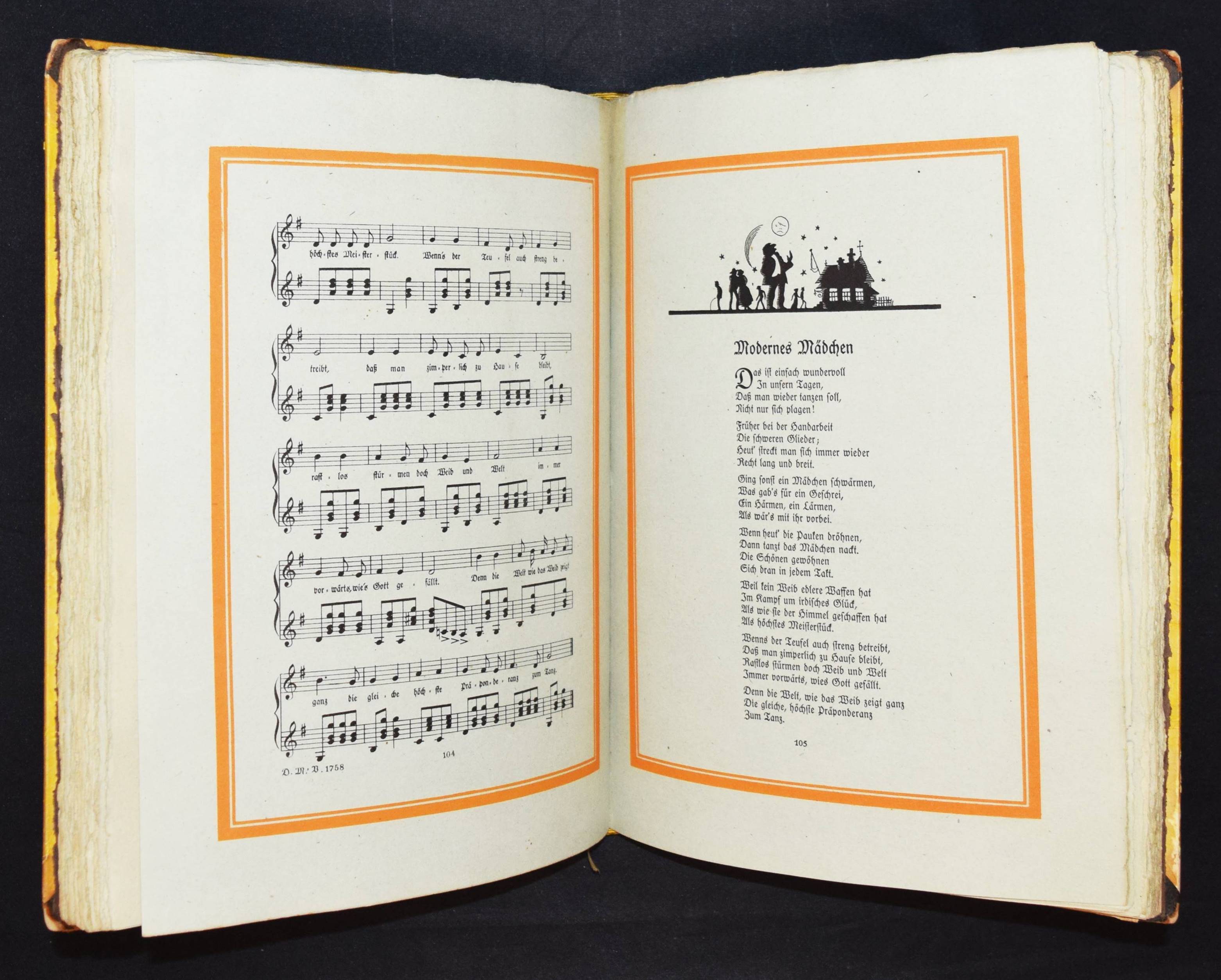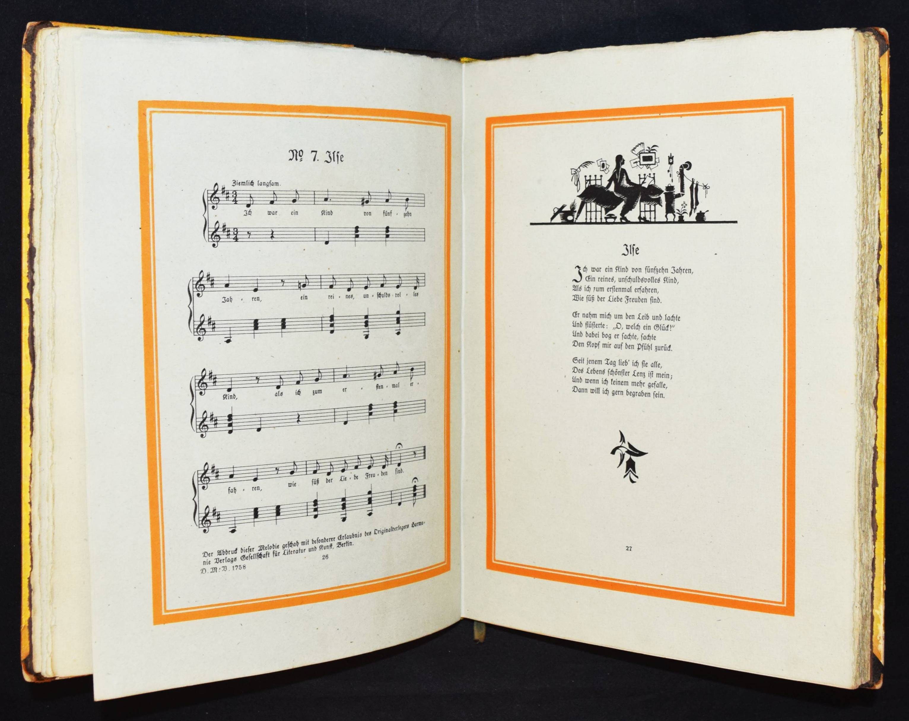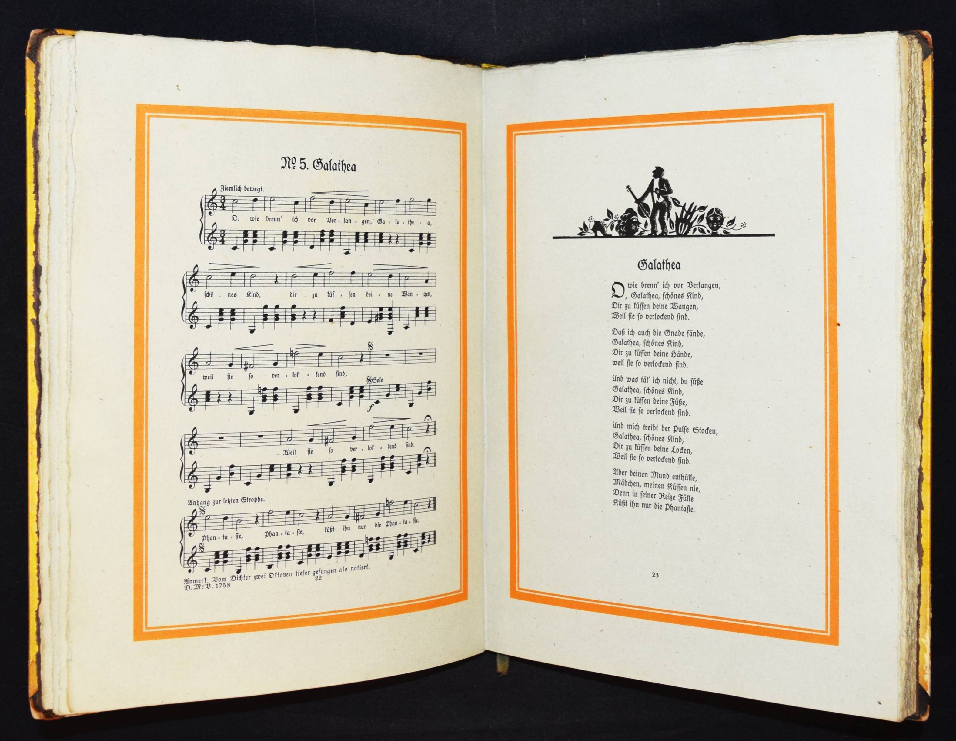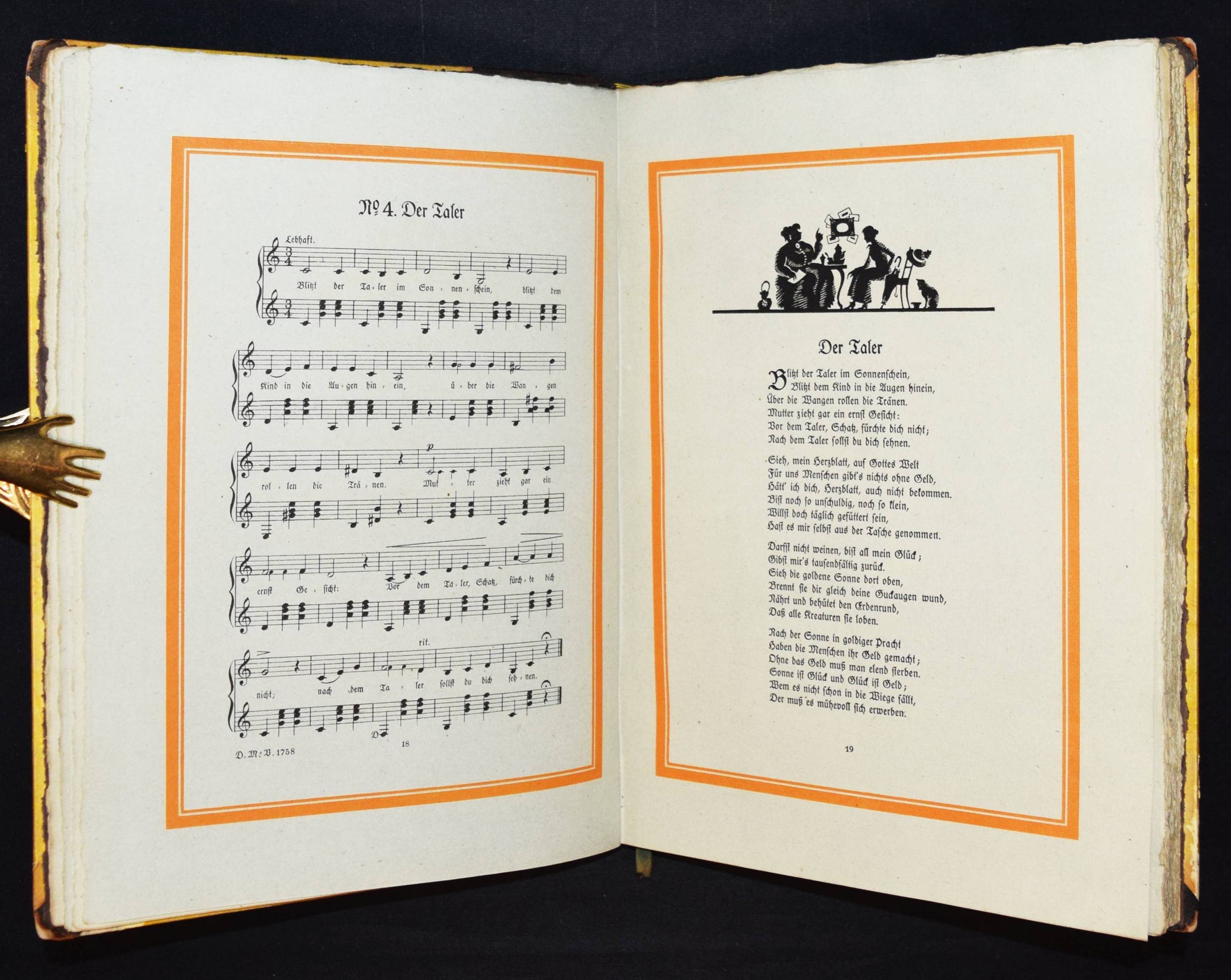 Wedekind, Frank Lautenlieder. 53 Lieder mit eigenen und fremden Melodien. München, Drei Masken-Verlag 1920. 4°. 173, (3) S. mit farbig illustriertem Titel und zahlreichen Vignetten von Emil Preetorius. OHldr. mit goldgepr. Rückentitel. Ohr 26. Rodenberg 387. Schauer II, 56. – Erste Ausgabe, eines von 300 num. Exemplaren. Im Druckvermerk von Emil Preetorius signiert. – Jede Seite des breitrandigen Drucks auf handgeschöpftem Bütten mit orangefarbener Texteinfassung, die Texte alle mit einer Scherenschnitt-Kopfvignette. Nach eigener Einschätzung des Künstlers „seine letzte größere illustrative Arbeit“ (nach G. Ohr). – Rücken unauffällig restauriert, gutes sauberes Exemplar.