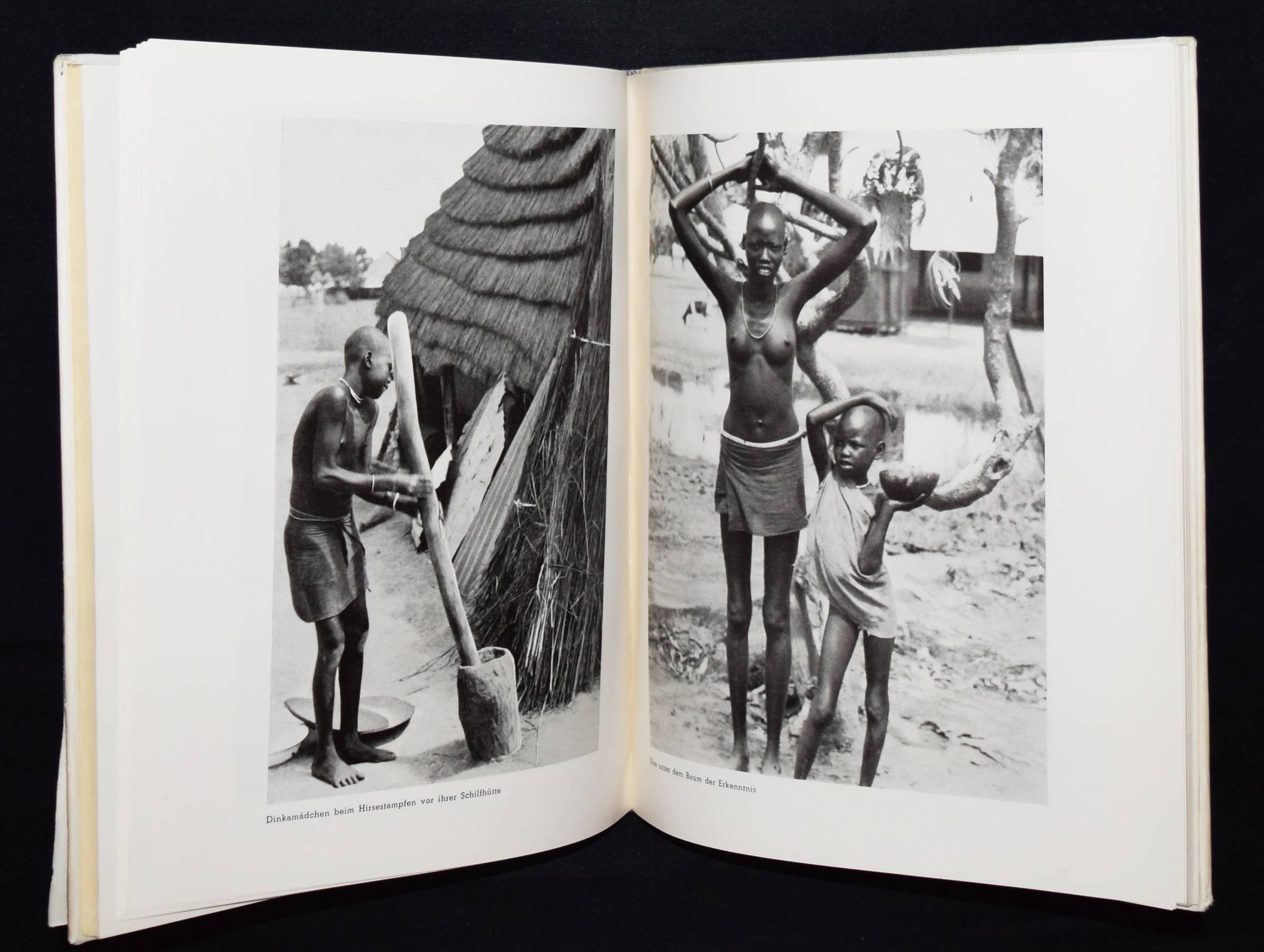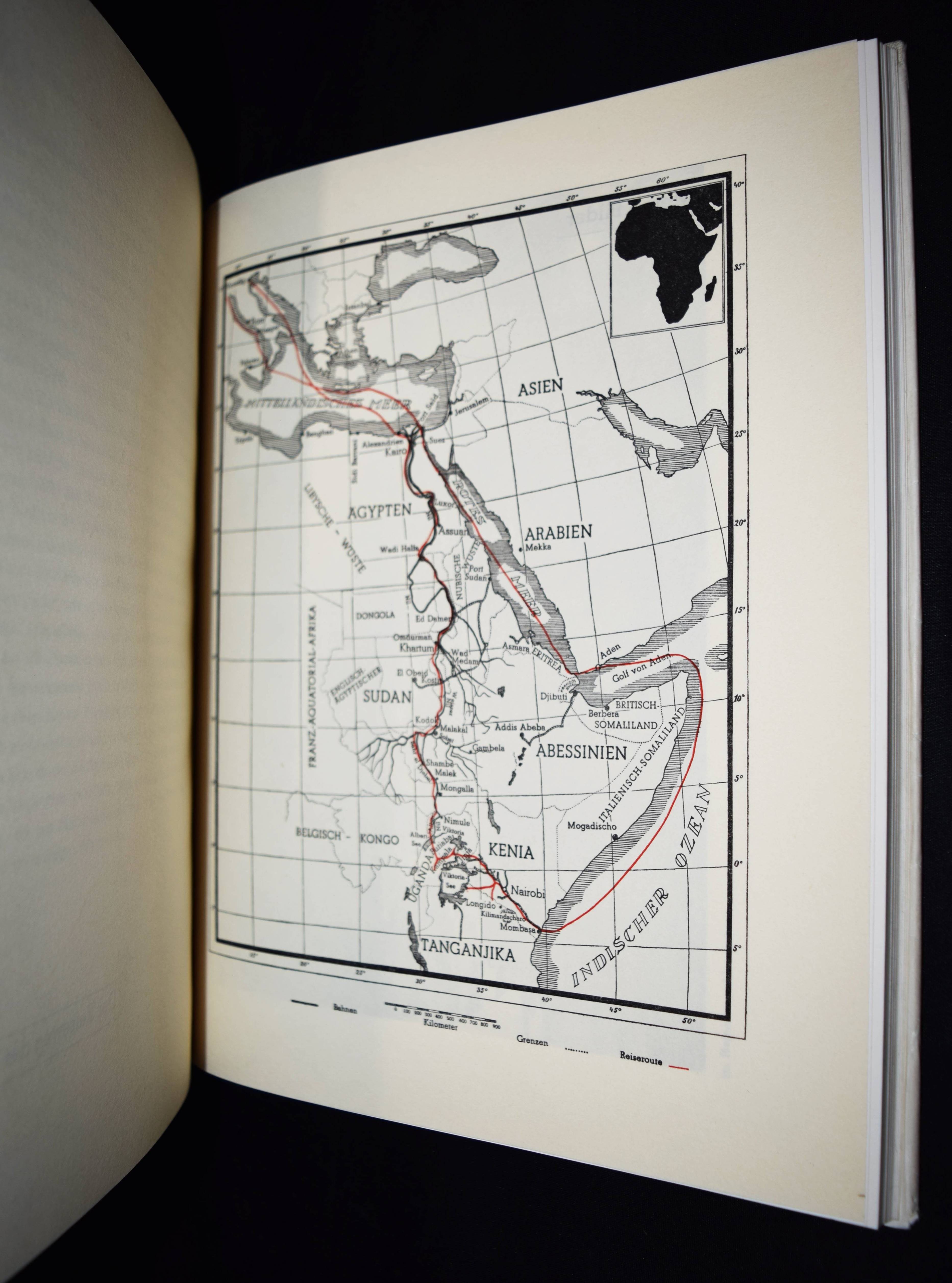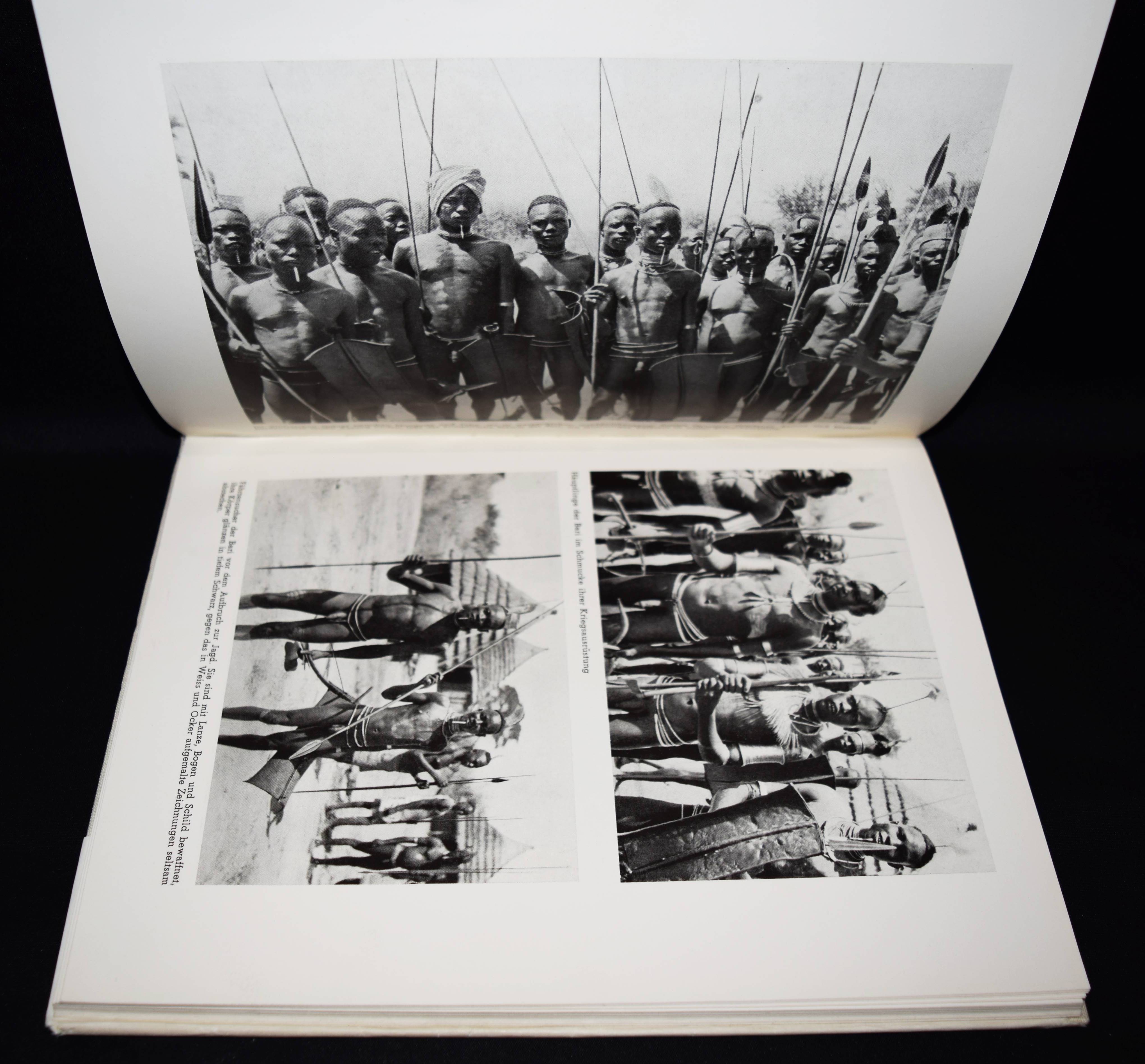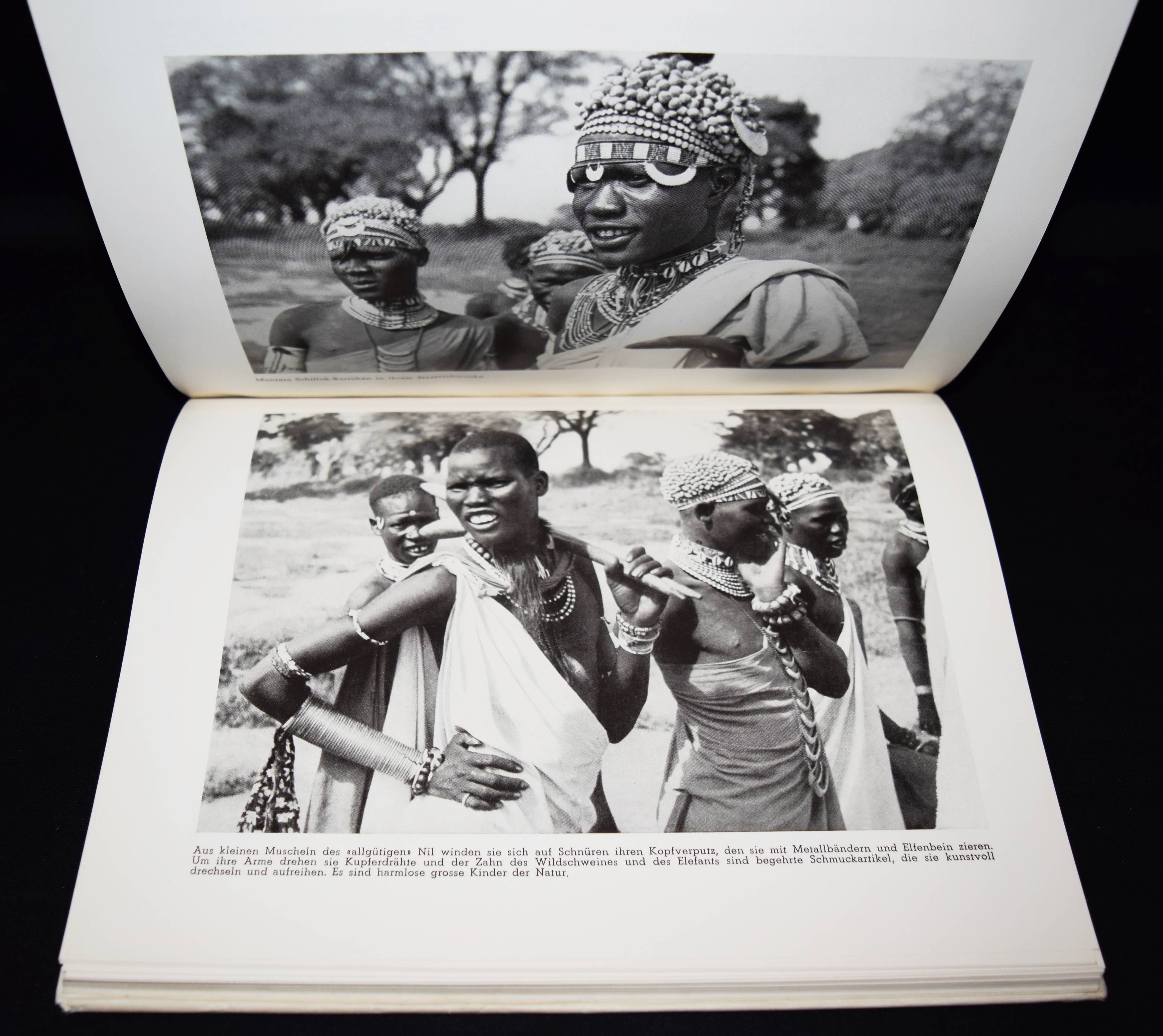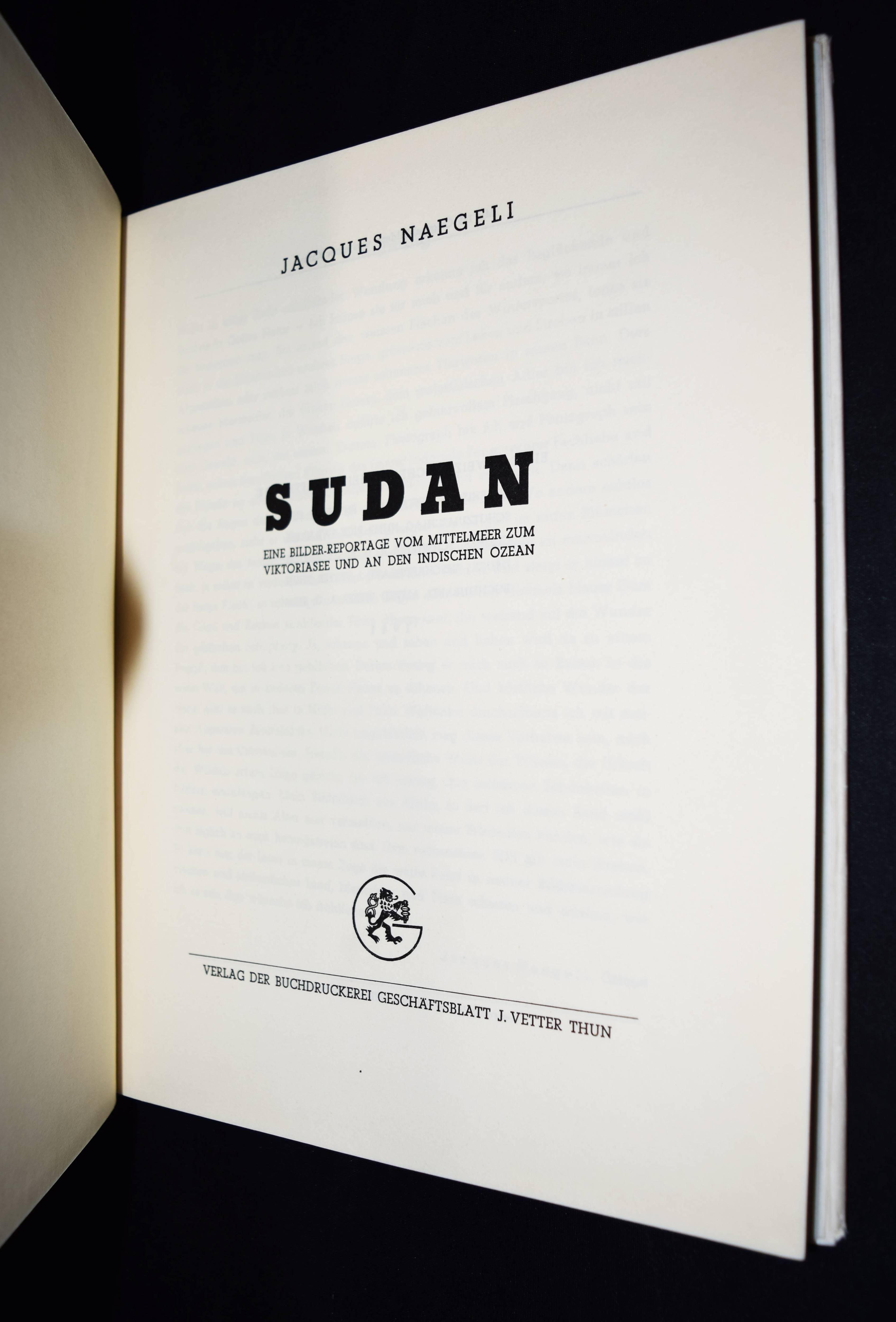 Naegeli, Jacques. Sudan. Eine Bilder-Reportage vom Mittelmeer zum Viktoriasee und an den Indischen Ozean. Thun, Buchdruckerei Geschäftsblatt J. Vetter (1941). 4°. 73 S. u. 175 Abb. auf 74 teils doppelblattgr. Tafeln u. 1 Karte. OLn. mit illustr. OU. Auer 288. Nicht bei Heidtmann u. Heiting/Jaeger. – Einzige Ausgabe, selten. – „1941 publiziert Naegeli sein erstes Buch mit dem Titel „Sudan, …“. 1943 arbeitet er an einem zweiten Buch: „Mein Saanenland“. Dieses geht aber nie in Druck. Durch das Sudan-Buch wird der Zoologiestudent Charles Albert Walter Guggisberg auf Naegeli aufmerksam. Er kommt nach Gstaad ins Geschäft, um ihn persönlich kennenzulernen. Ab 1947 betreibt Guggisberg am Medical Research Laboratory in Nairobi Studien über die Krankheitsübertragung durch Insekten. Zusammen mit ihm unternimmt Naegeli drei weitere Afrika-Reisen in den Jahren 1949, 1951 und 1954. In dieser Zeit entstehen auch die Filme „Auf Safari zum Naivashasee“ und „Beim Grosswild in Afrika“ (C. Högl, Welt & Gstaad. Photo Jaques Naegeli 1885-1971). – „Photograph bin ich und Photograph sein heisst, neben beruflichem Können das immer lodernde Feuer wahrer Fachliebe und die Freude an allen Naturschönheiten zu pflegen und zu hegen. Dann schärfen sich die Augen des Beobachters, es weitet sich sein Horizont“ (J. Naegeli im Vorwort). – Schutzumschlag am Kapital mit geringen Randläsuren, gutes Exemplar.