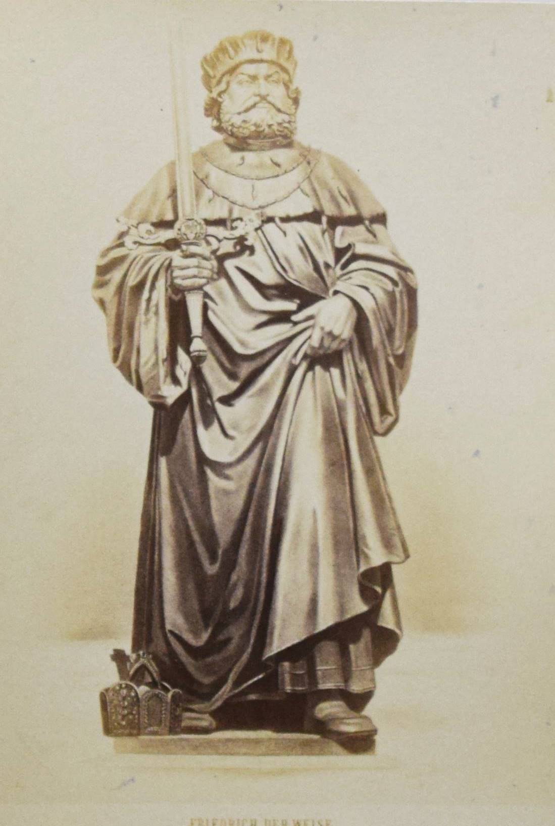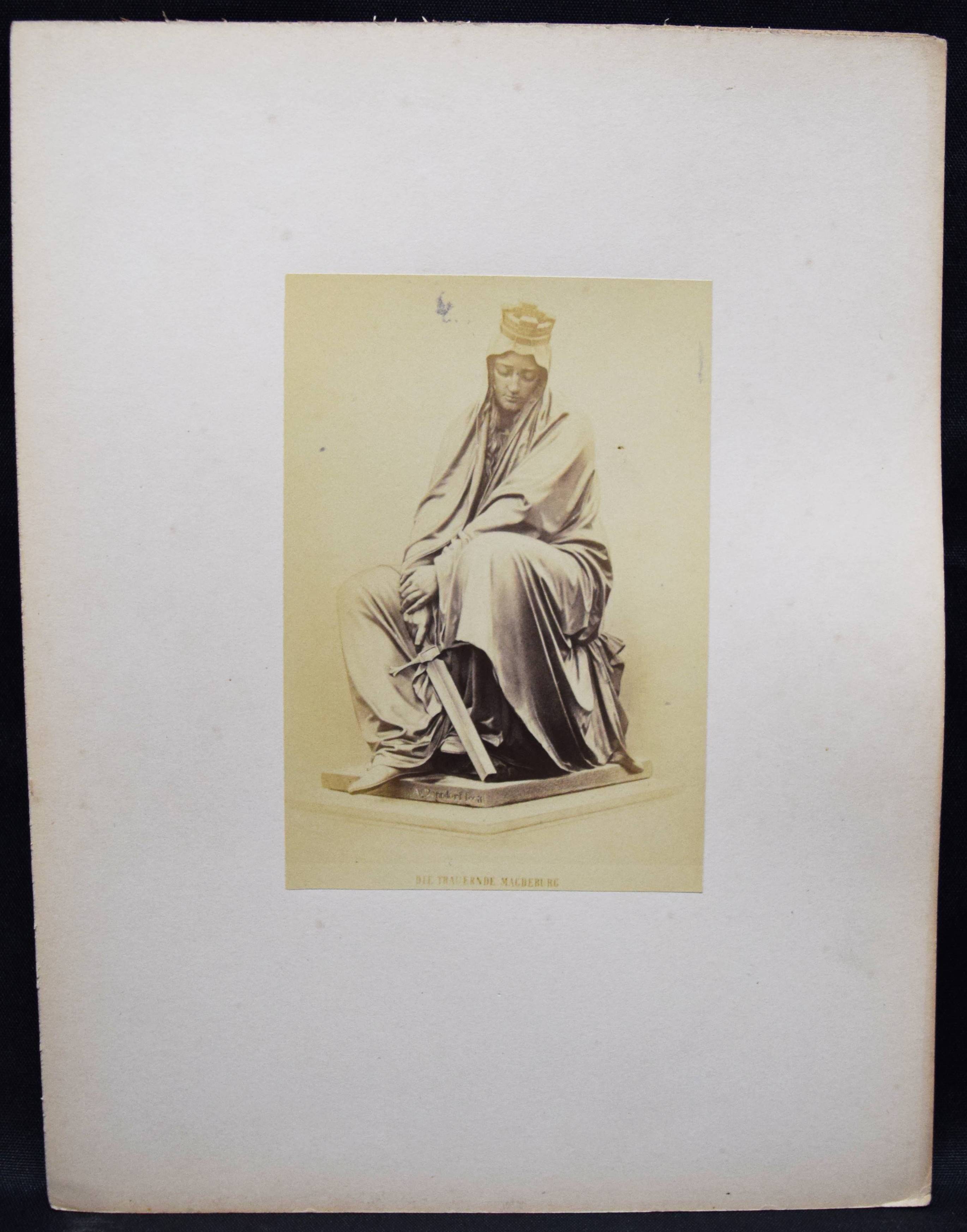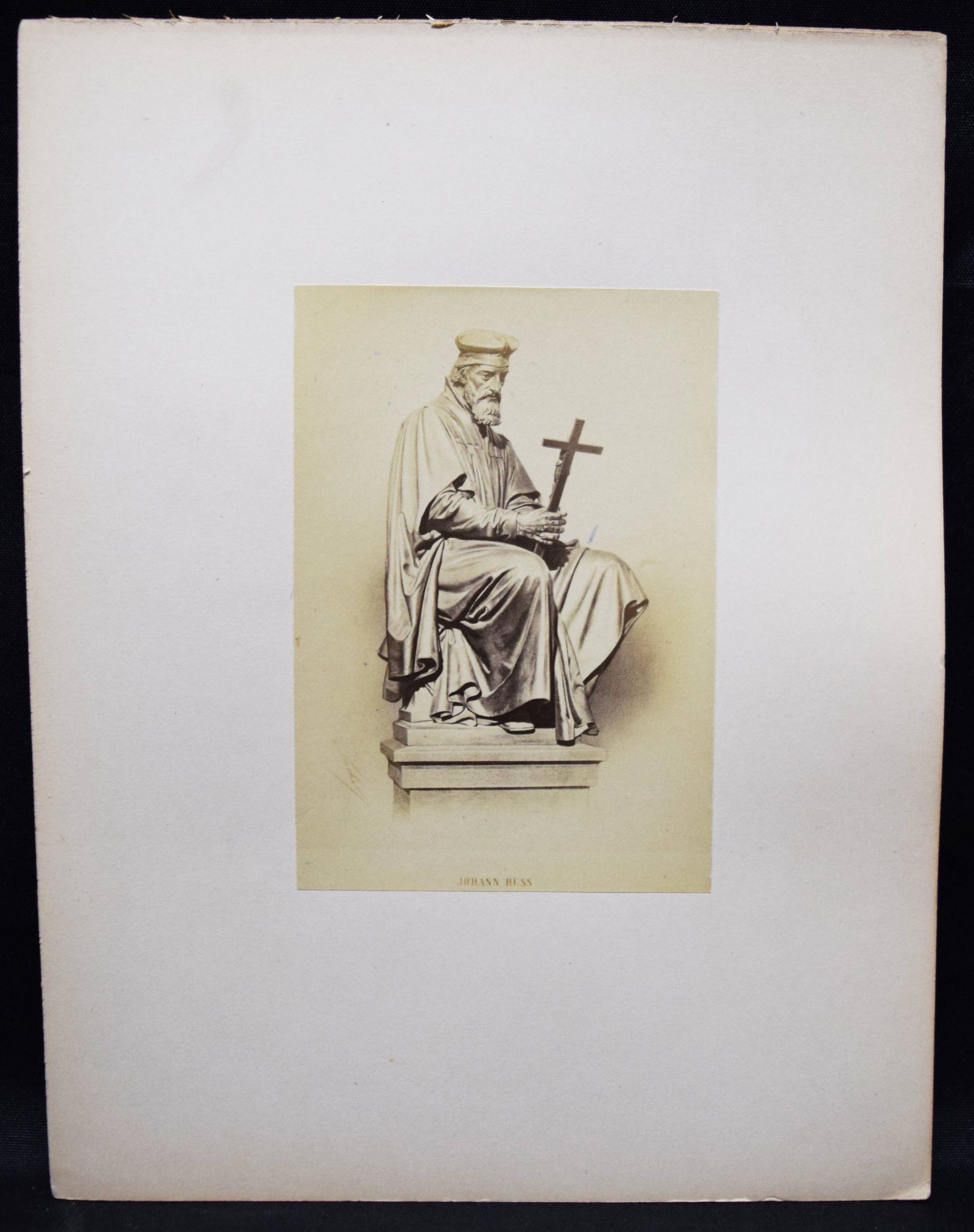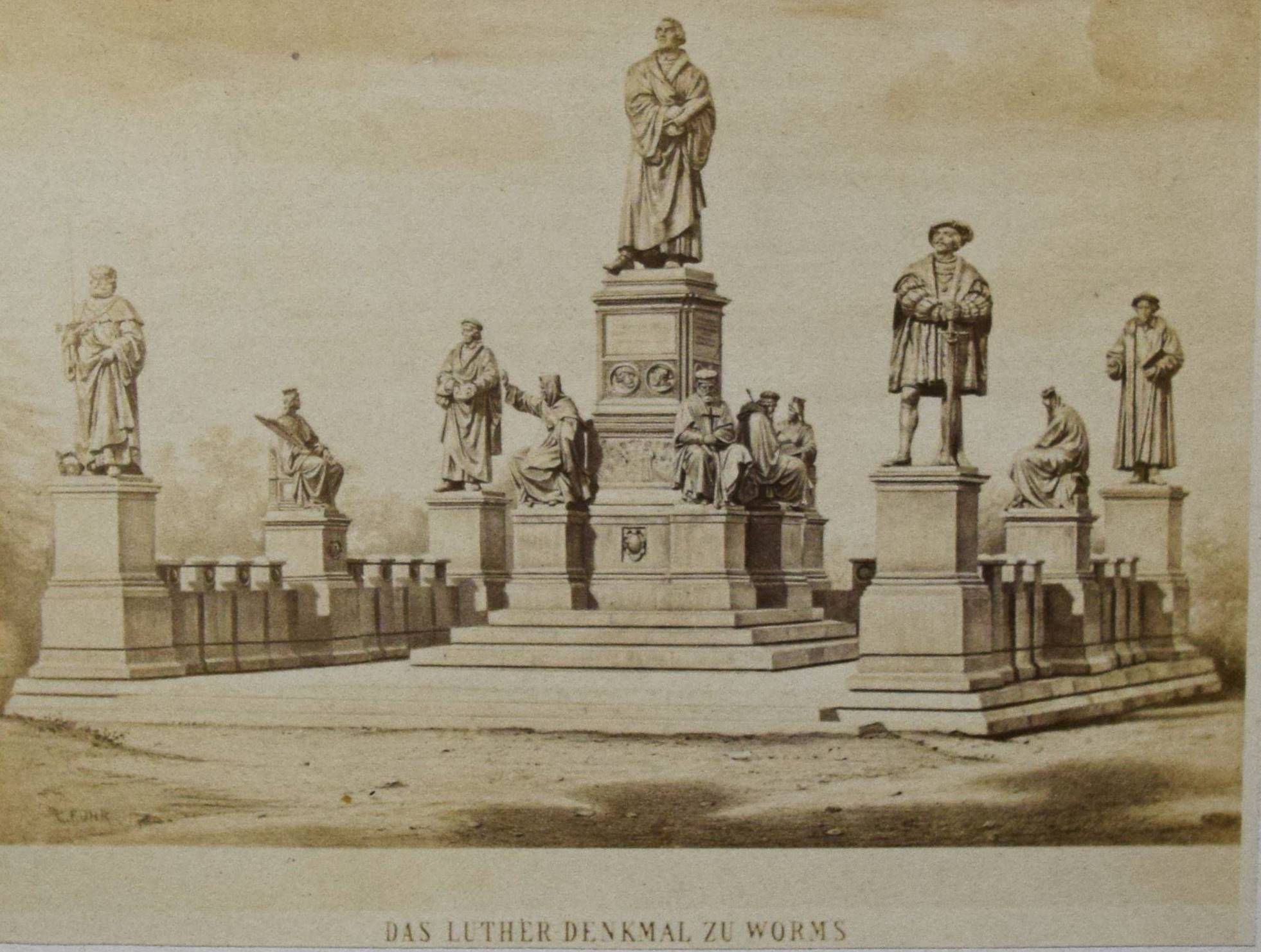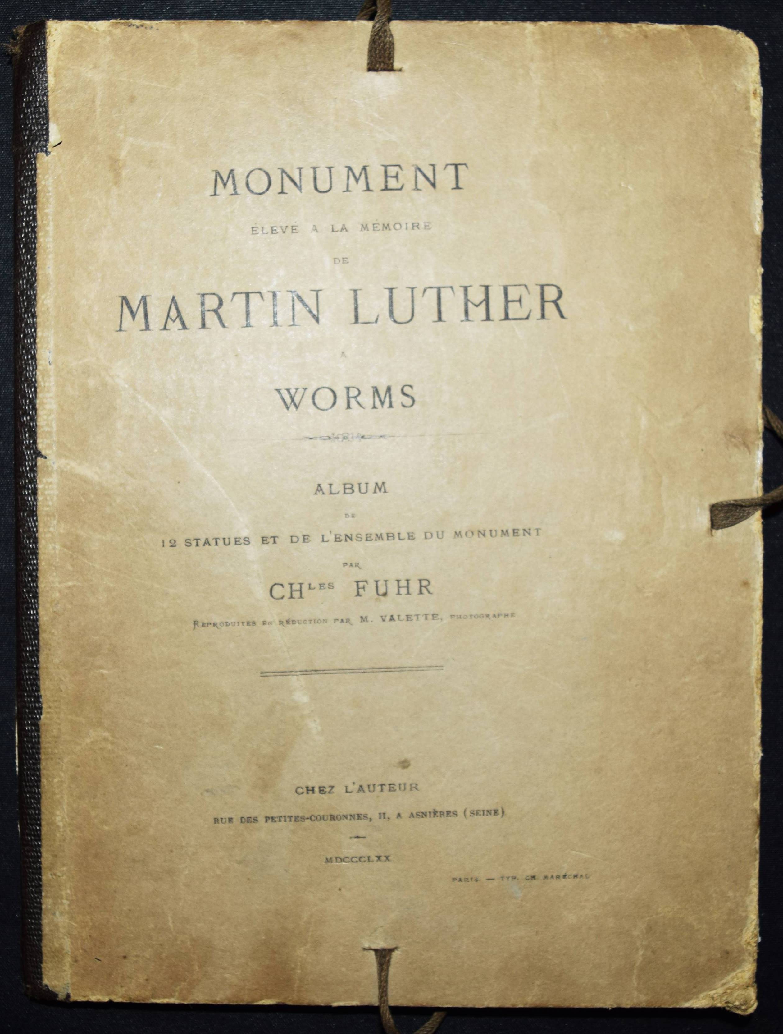 Fuhr, Charles (Jérémie). Monument élevé à la mémoire de Martin Luther à Worms. Album de 12 (douze) statues et de l’ensemble du monument. Reproduites en réduction, par M. Val(l)ette, photographe. Asnières (Seine), chez l’auteur 1870. 8°. 13 mont. Orig.-Photographien mit einbelichteten Titeln im unteren Rand (Albumin-Abzüge, 10 x 7,5 cm.) auf Karton. Orig-Hln.-Mappe. Von uns nicht bibliographisch nachweisbar. – Die erste Tafel mit der Gesamtaufnahme rückseitig mit dem Atelierstempel von Vallette. – Das von Ernst Rietschel (Gesamtentwurf sowie die Statuen Luthers und Wyclifs) entworfene Lutherdenkmal in Worms (12 Statuen) wurde am 25. Juni 1868 enthüllt und gilt neben dem internationalen Reformationsdenkmal in Genf als weltweit größtes Reformationsdenkmal. – C. J. Fuhr (1832-1875) ist nur als Lithograph nachweisbar. Fuhr schuf Portraits meist nach Fotografien und war 1861 bis 1874 Teilnehmer des Salon de Paris und Mitarbeiter von Le Panthéon des illustrations françaises. – Deckel etwas berieben und angestaubt, Trägerkarton der Gesamtaufnahme etwas angestaubt, sonst gut erhalten.