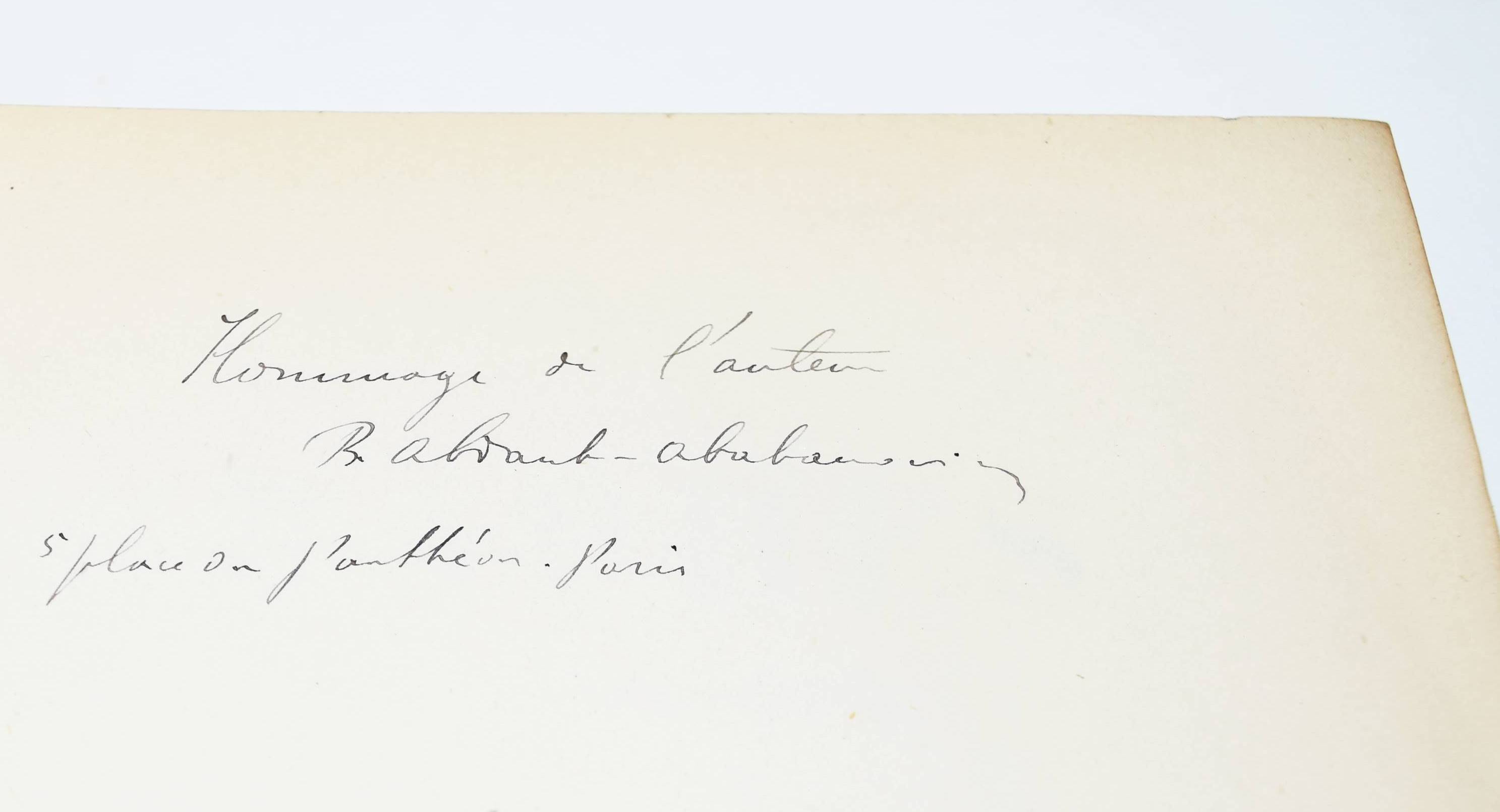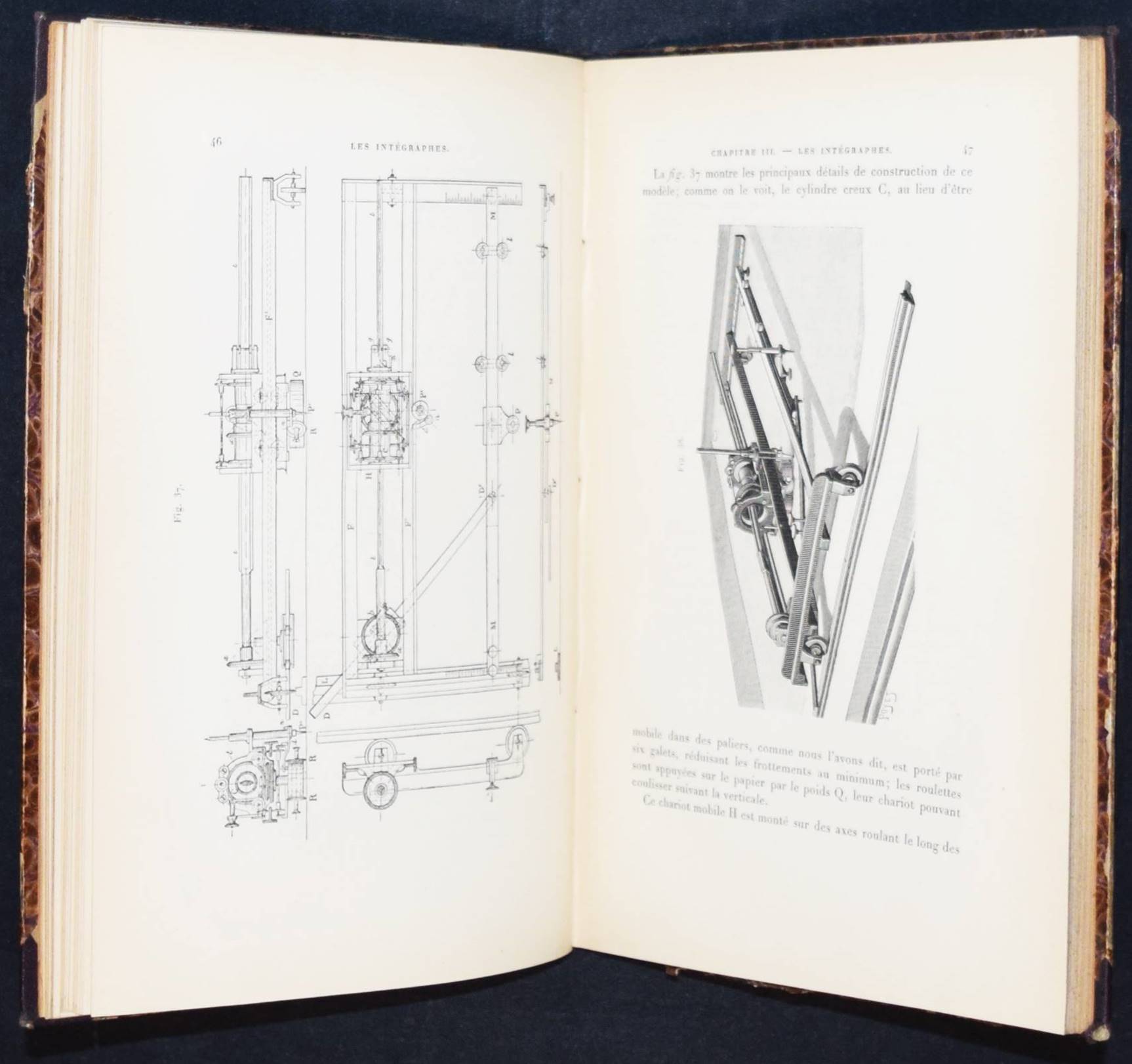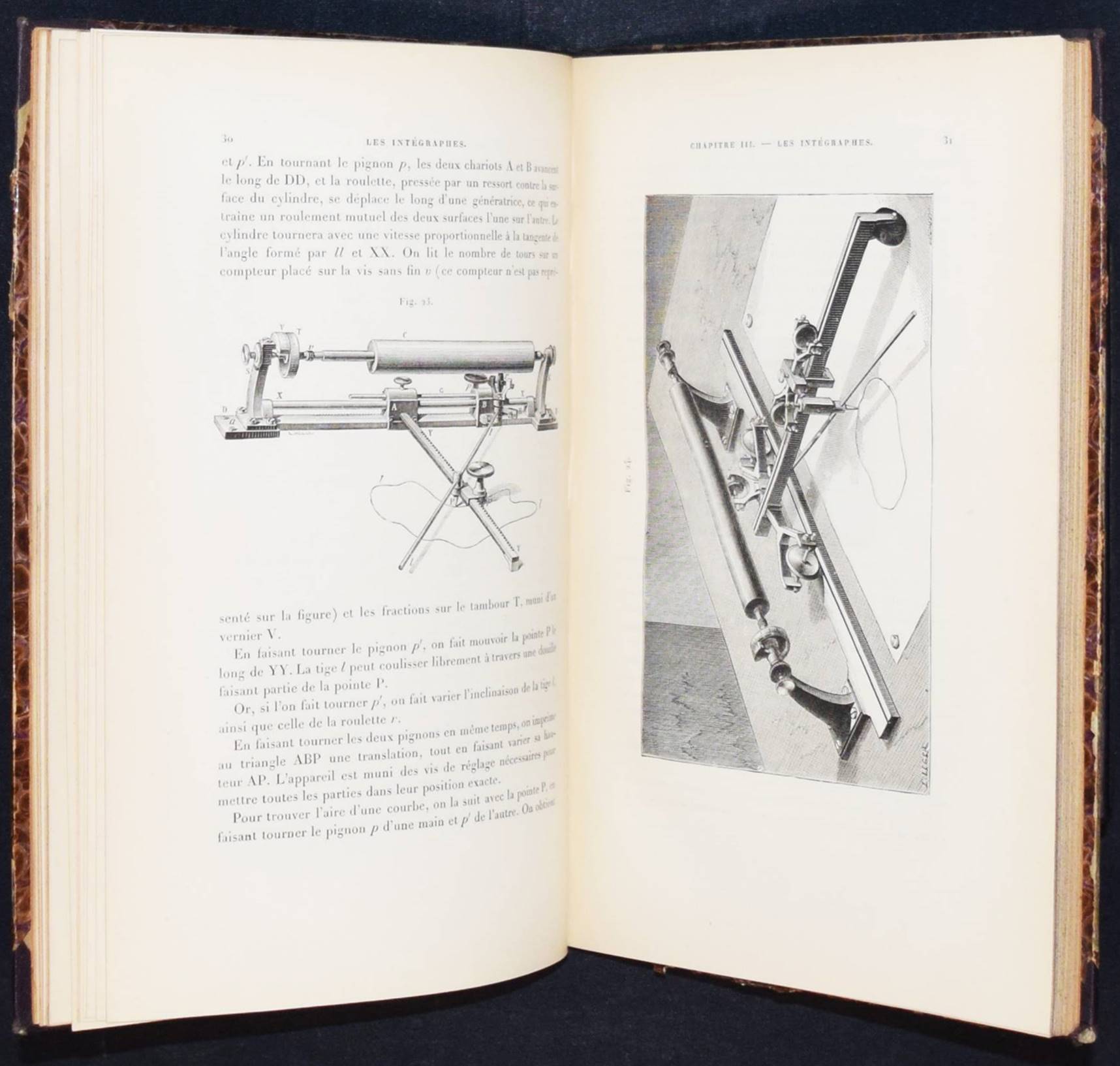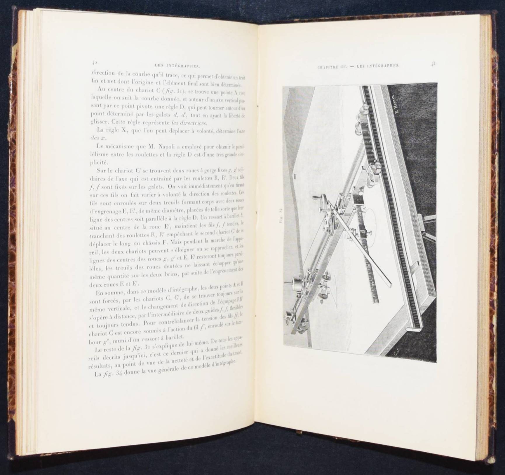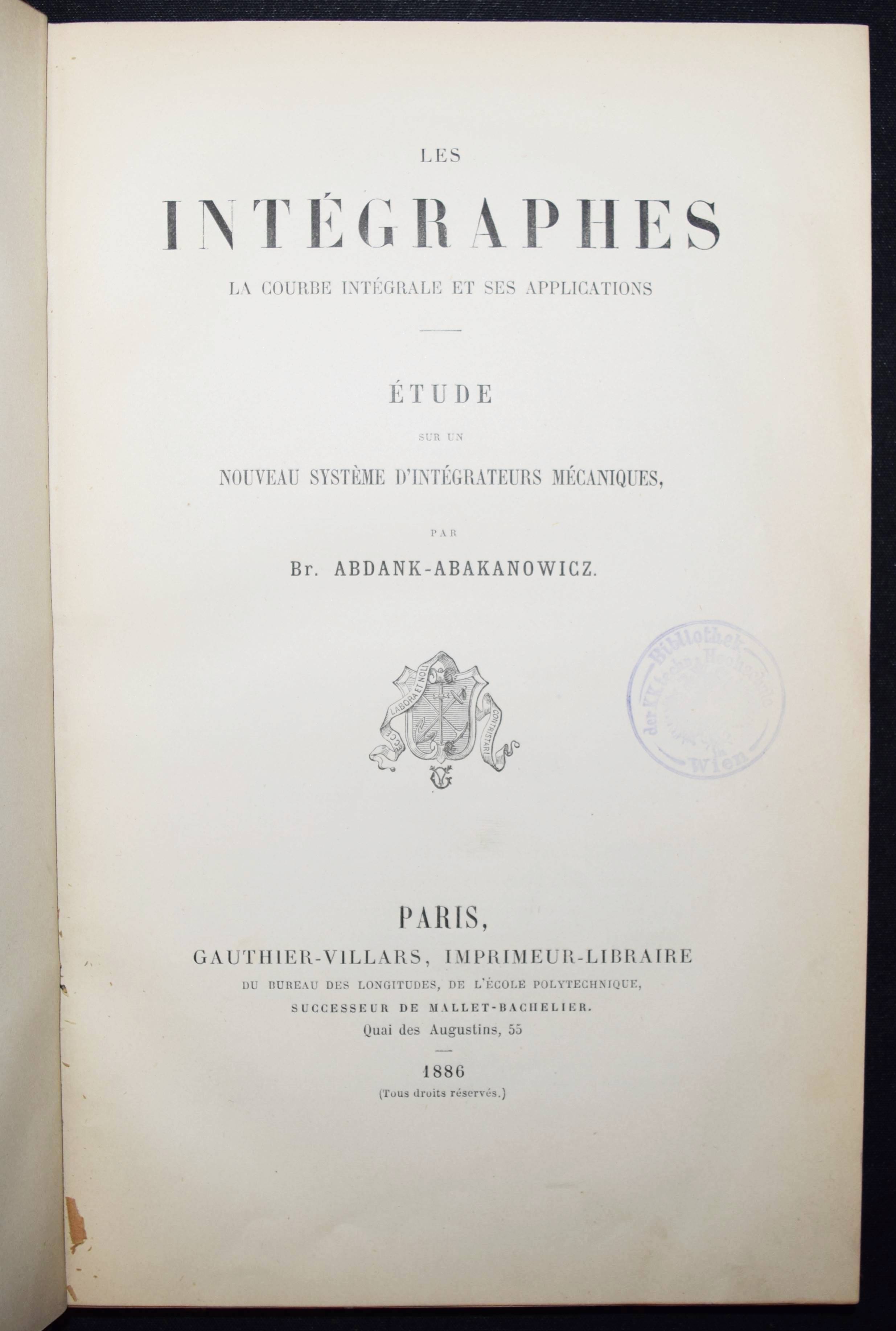 Abdank-Abakanowicz, Br(uno). Les intégraphes. La courbe intégrale et ses applications. Étude sur un nouveau système d’intégrateurs mécaniques. Paris, Gauthier-Villars 1886. Gr.-8°. X, 156 S. 94 Holzstichen im Text. OHln. mit goldgepr. Rückentitel (vord. Orig.-Umschlag beigebunden). Polski Slownik Biograficzny I, 1 f. Thomash/Williams A 1. – Erste Ausgabe. – Mit eigenhändiger Widmung von (inscribed by) B. Abdank-Abakanowicz „Hommage de l’autheur B. abdank-abakanowicz 5 place du Panthéon Paris“. – Eine deutsche Übersetzung von Emil Bitterli erschien 1889 in Leipzig. – „The integraph is a noteworthy development in the history of calculating instruments. While the principle on which it is based was introduced by Coriolis in 1836, it was in 1878 that Abdank-Abakanowitz first developed a practical working model. The integraph is an elaboration and extension of the planimeter, an earlier, simpler instrument used to measure area. It is a mechanical instrument capable of deriving the integral curve corresponding to a given curve. Hence, it is capable of solving graphically a simple differential equation. Sets of partial differential equations are commonly encountered in mathematical physics. Most branches of physics such as aerodynamics, electricity, acoustics, plasma physics, electron-physics and nuclear energy involve complex flows, motions and rates of change which maybe described mathematically by partial differential equations. A well-established example from electromagnetics is the set of partial differential equations known as Maxwell’s equations. In practice, differential equations can be difficult to integrate, that is to solve. The integraph is capable of solving only simple differential equations. The need to handle sets of more complex non-linear differential equations, led Vannevar Bush to develop the Differential Analyzer at MIT in the early 1930s. In turn, limitations in speed, capacity and accuracy of the Bush Differential Analyzer provided the impetus for the development of the ENIAC during World War II. Abdank-Abakanowicz’s instrument could produce solutions to a commonly encountered class of simple differential equations of the form dy/dx = F(x) so that y = ò F(x)dx. The basic approach was to draw a graph of the function F and then use the pointer on the device to trace the contour of the function. The value of the integral could then be read from the dials. The concept of the instrument was taken up and soon put into production by such well known instrument makers as the Swiss firm of Coradi in Zurich“ (E. Tomash). – Der polnische Mathematiker und Elektrotechniker B. Abdank-Abakanowicz (1852-1900) war nach seinem Ingenieur-Studium am Polytechnikum Riga Dozent für Mechanik in Lemberg. „Dort begann er seine Studien zur Planimetrie, die zum Bau des sog. Integrators führten, das zur zahlenmäßigen Darstellung von Infinitesimalrechnungen dient. Eine Beschreibung dieses mathematischen Instruments veröffentlichte Bruno Abakanowicz 1880 in „Rozprawy i Sprawozdania Wydzialu matematyczno-przyrodniczego Akademii Umiejetnosci w Krakowie“ sowie in der Warschauer Zeitschrift „Inzynierya i Budownictwo“. … Um 1880 erfanden er und der britische Physiker Sir Charles Vernon Boys unabhängig voneinander den Integraphen. 1881 siedelte Bruno Abakanowicz nach Paris um, wo er eine elektrotechnische Werkstatt errichtete. 1882 wurden schließlich noch drei Abhandlungen hierzu in den „Comptes rendus“ an der Pariser Akademie der Wissenschaften veröffentlicht. Kurze Zeit später wurde er zum Direktor der Betriebe der Compagnie française du procédé Thompson-Houston berufen. In diese Zeit fällt der Bau einer elektromagnetischen Klingel für Eisenbahnsignalanlagen sowie ein neuer Typ von elektrischen Lampen. Im Jahre 1889 übertrug ihm die französische Regierung die Leitung der Verhandlungen mit den USA bezüglich ihrer Teilnahme an der Weltausstellung Paris 1889. In demselben Jahr wurde ihm das Kreuz der Ehrenlegion verliehen“ (Wikipedia). – Rücken u. Kanten etwas berieben, mehrfach gestempelt (TH Wien, „Ausgeschieden“), das erste Bl. etwas gelockert, sehr gutes Exemplar. – The Polish mathematician and electrical engineer B. Abdank-Abakanowicz (1852-1900) was a lecturer in mechanics in Lviv after studying engineering at Riga Polytechnic. “There he began his studies on planimetry, which led to the construction of the so-called integrator, which is used for the numerical representation of infinitesimal calculations. Bruno Abakanowicz published a description of this mathematical instrument in 1880 in “Rozprawy i Sprawozdania Wydzialu matematyczno-przyrodniczego Akademii Umiejetnosci w Krakowie” and in the Warsaw journal “Inzynierya i Budownictwo”. … Around 1880, he and the British physicist Sir Charles Vernon Boys independently invented the integraph. In 1881 Bruno Abakanowicz moved to Paris, where he set up an electrotechnical workshop. In 1882, three papers on the subject were published in the “Comptes rendus” of the Paris Academy of Sciences. A short time later, he was appointed director of the operations of the Compagnie française du procédé Thompson-Houston. During this time, he built an electromagnetic bell for railroad signaling systems and a new type of electric lamp. In 1889, the French government put him in charge of negotiations with the USA regarding their participation in the 1889 Paris World’s Fair. In the same year, he was awarded the Cross of the Legion of Honor” (Wikipedia). – Spine and edges somewhat rubbed, stamped several times (TH Wien, “Ausgeschieden”), otherwise well preserved.