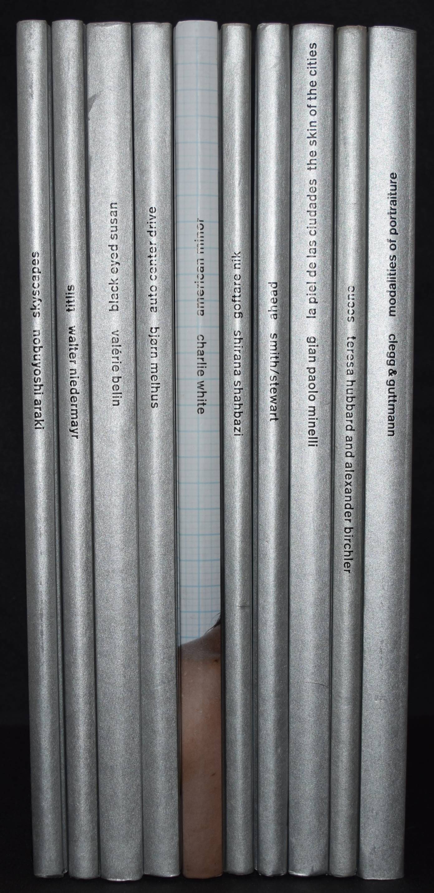 Codax-Fotobücher. 10 Bände der Reihe. Zürich, Codax Publisher 1998-2013. 4°. Mit zahlr. farb. Abb. Silberne OPbde., teils mit farb. Deckelbildern. I. Hubbard, Teresa u. Alexander Birchler. Scene. Zürich 1998. 84 S. – II. Araki, Nobuyoshi. Skyscapes. Zürich 1999. 96 S. – III. Smith, Stephanie u. Edward Stuart. Ahead. Zürich 2000. 96 S. – IV. Shahbazi, Shirana. Goftare nik. Zürich 2001. 88 S. – V. Niedermayr, Walter. Titlis. Zürich 2003. 96 S. – VI. Melhus, Björn. Auto Center Drive. Zürich 2005. 132 S. – VII. White, Charlie. American minor. Zürich 2009. 144 S. – VIII. Minelli, Gian Paolo. La piel de las ciudades – The skin of the cities. Zürich 2010. 156 S. – IX. Belin, Valerie u. Tobia Bezzola. Black Eyed Susan. Zürich 2011. 156 S. – X. Clegg, Michael u. Martin Guttmann. Modalities of Portraiture. Zürich 2013. 148 S. – Von geringfügigen Gebrauchsspuren abgesehen, alle Bände sehr gut erhalten.