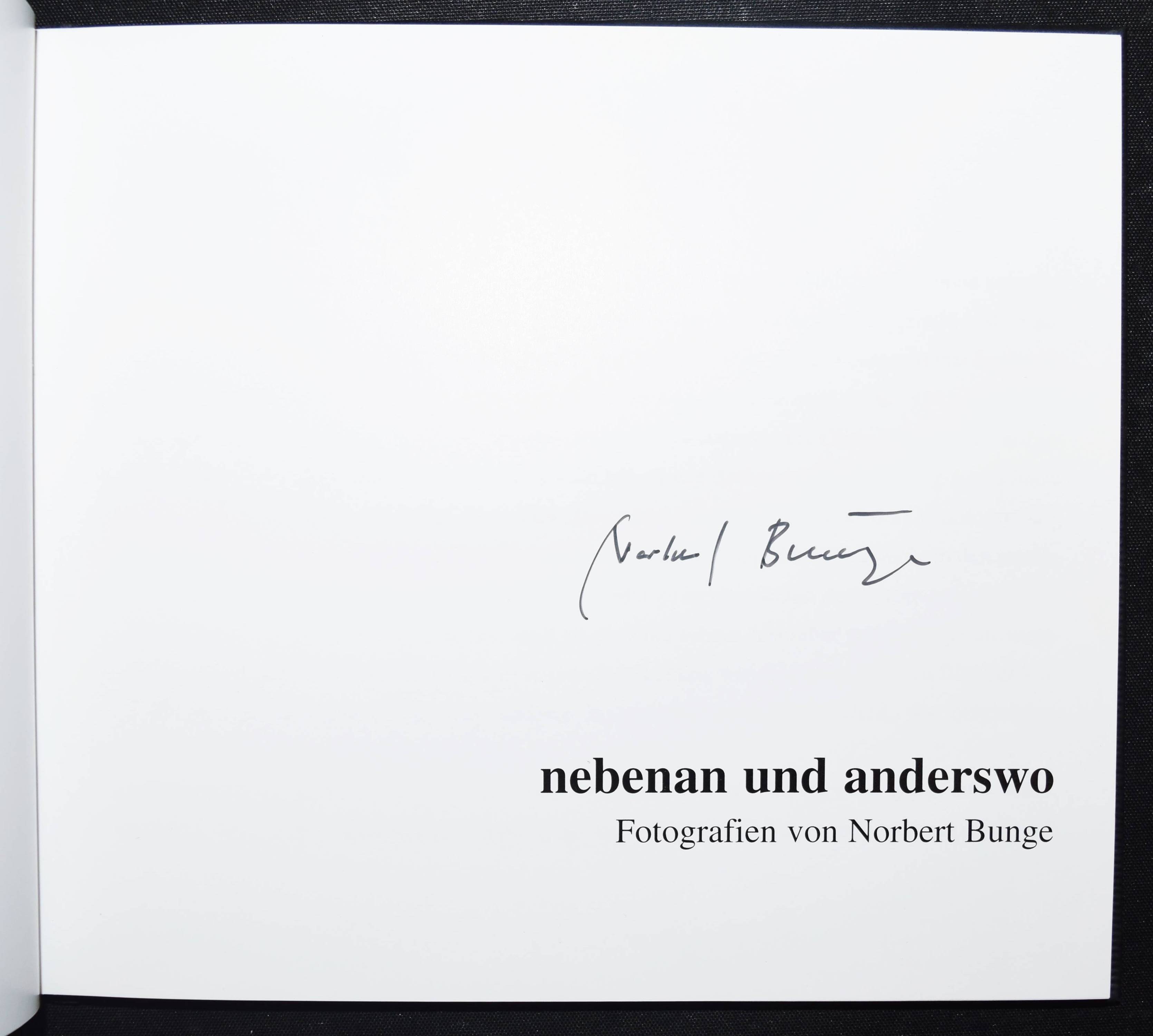 Bunge, Norbert. Nebenan und anderswo. Fotografien. (Einleitung Hans-Jörg Rother, Herausgeber Marlies Krause. Berlin, Otto-Nagel-Galerie 2006. Quer-8°. [70] S. mit 60 Tafeln. OPbd. Erste Ausgabe. – Von N. Bunge auf dem Titelblatt signiert. – Eines von 300 Exemplaren. – Der Filmemacher, Kameramann und Fotograf N. Bunge (geb. 1941) betrieb 1996 bis 2022 die Galerie Argus Fotokunst in Berlin. – „Bekannt geworden ist Norbert Bunge als Kameramann, als Filmdokumentarist und als der Galerist, der 1995 mit der Gründung seiner Galerie argus fotokunst der klassischen Schwarzweiß-Fotografie in Berlin mit inzwischen weit über 100 Ausstellungen neues Gewicht verliehen hat. Dass er seit bald fünf Jahrzehnten selbst fotografiert und seine Bilder auch jahrelang in renommierten Journalen wie Karl Paweks Publik visuell, Quick, Merian und im Spiegel publizierte, schien fast vergessen“ (M. Betram). – Tadellos.