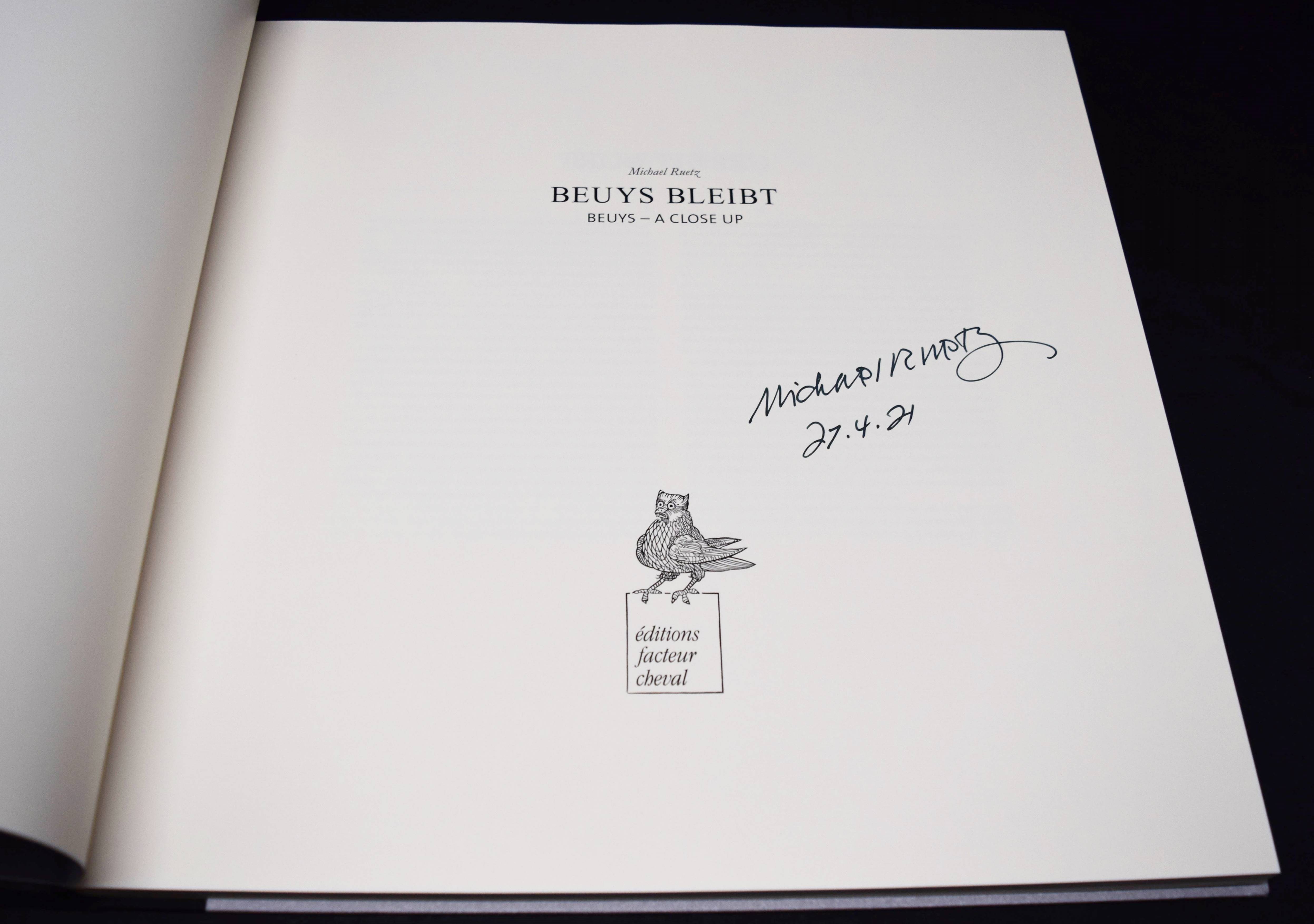 Ruetz, Michael. Beuys bleibt. Beuys – a close up. (Mit einem Text von Michael Ruetz und einem Vorwort von Werner Heegewaldt in Deutsch und Englisch). Köln, Berlin, éditions facteur cheval (2021). Folio (37 x 37 cm.). 89 S. mit 75 Duotone-Tafeln. OHln. mit silbergepr. Rückentitel u. Deckelbild. Vgl. Koetzle 383 f. – Erste Ausgabe. – Eines von 777 nicht für den Handel bestimmten Exemplaren. – Von M. Ruetz auf dem Titelblatt signiert und datiert. – Eindrucksvolle Hommage zum 100sten Geburtstag des Fluxus-Künstlers. – Der Berliner Fotograf M. Ruetz (geb. 1940) porträtierte Josef Beuys in der Zeit von 1971 bis 1973 in der Düsseldorfer Akademie, auf der documenta 5 und beim Boxkampf „für direkte Demokratie“ gegen Abraham David Christian, zu Hause und beim Aufbau einer Installation. – „Photographie als bloße Kunstfertigkeit oder Selbstzweck hat mich nie wirklich interessiert. Infolgedessen bin ich nie ein versierter Fachmann, ein richtiger „Profi“ geworden. Letztlich interessieren mich Wort und Sprache mehr. Die Lebenslinie der Rigaschen Ruetz, schreibenden Journalisten, setzt sich fort. Meine Sprachstudien haben mich nachhaltiger geformt als die wenig inspirierten Diskussionen in beispielweise der Gesellschaft Deutscher Lichtbildner – obwohl Otto Steinert meinen tiefsten Respekt genießt und ich allen Grund zum Dank habe. Es mag zwar auch zutreffen, dass ein Bild mehr als tausend Worte sage. Dennoch: das richtige Wort sagt mehr als der Tsunami von Fotos, der uns täglich überschwemmt. Ich ziehe daraus meine Schlüsse“ (M. Ruetz). – Tadellos.
