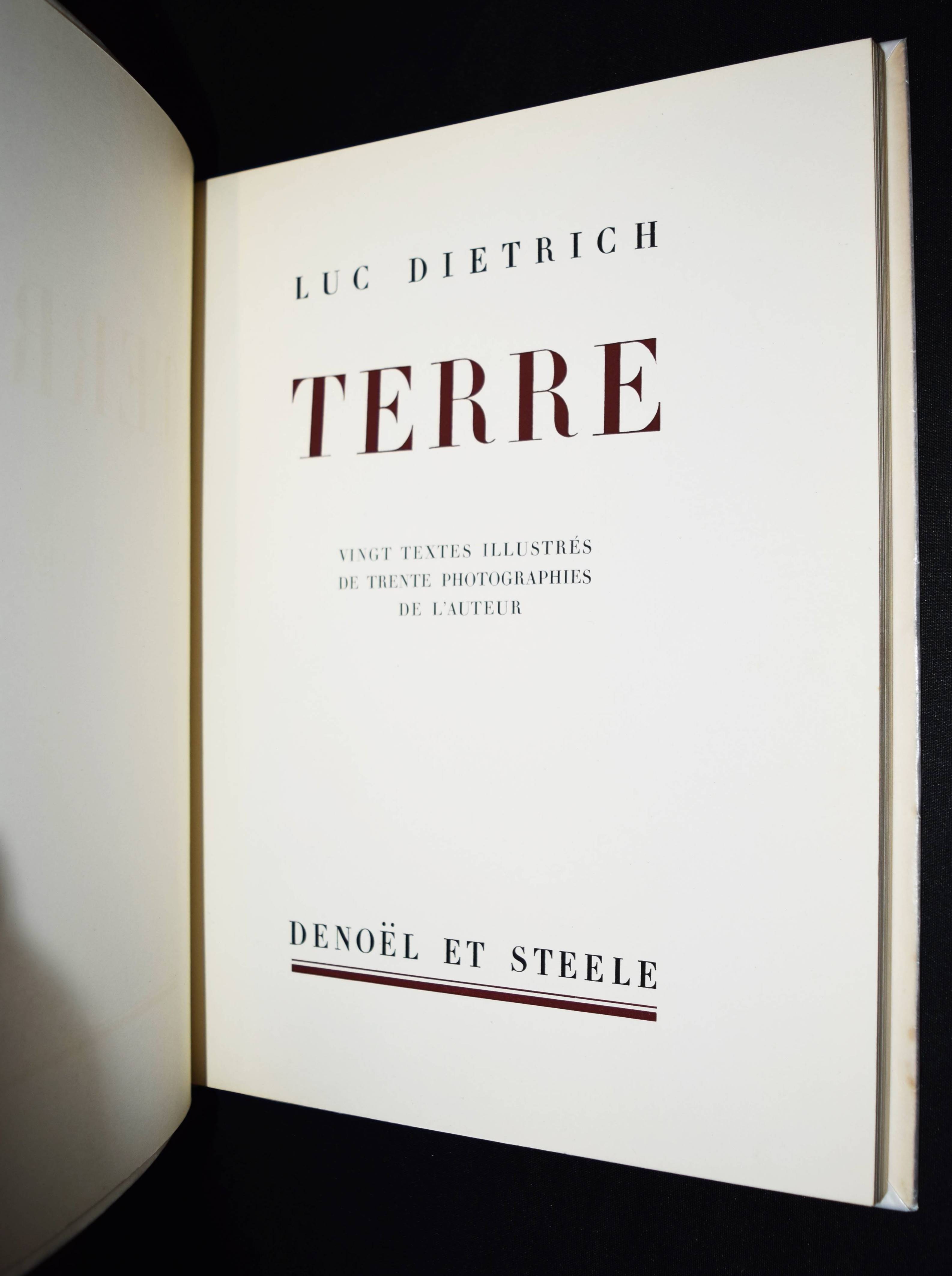 Dietrich, Luc. Terre. Vingt textes illustrés de trente photographies de l’auteur. Paris, Denoël et Steele s. d. (1936). 4°. [48] Bl. mit 20 Abb. in Kupfertiefdruck. Illustr. OKart. mit Japanpapier-Schutzumschlag. Einzige Ausgabe. – Der franz. Schriftsteller und Fotograf Luc Dietrich (1913-1944) lernte 1932 in Paris den Philosophen und Dichter Lanza del Vasto (1901-1981) kennen und war mit diesem lebenslang eng befreundet. Vasto und der Schriftsteller René Daumal (1908-1944) unterstützten den Autor Dietrich. L. Dietrich starb 1944 nachdem er bei einem Bombenangriff verwundet worden war. Er ist heute besonders durch seinen zweiten halbautobiografischen Roman „Le Bonheur des tristes“ von 1935 bekannt. – Sehr schönes Exemplar.