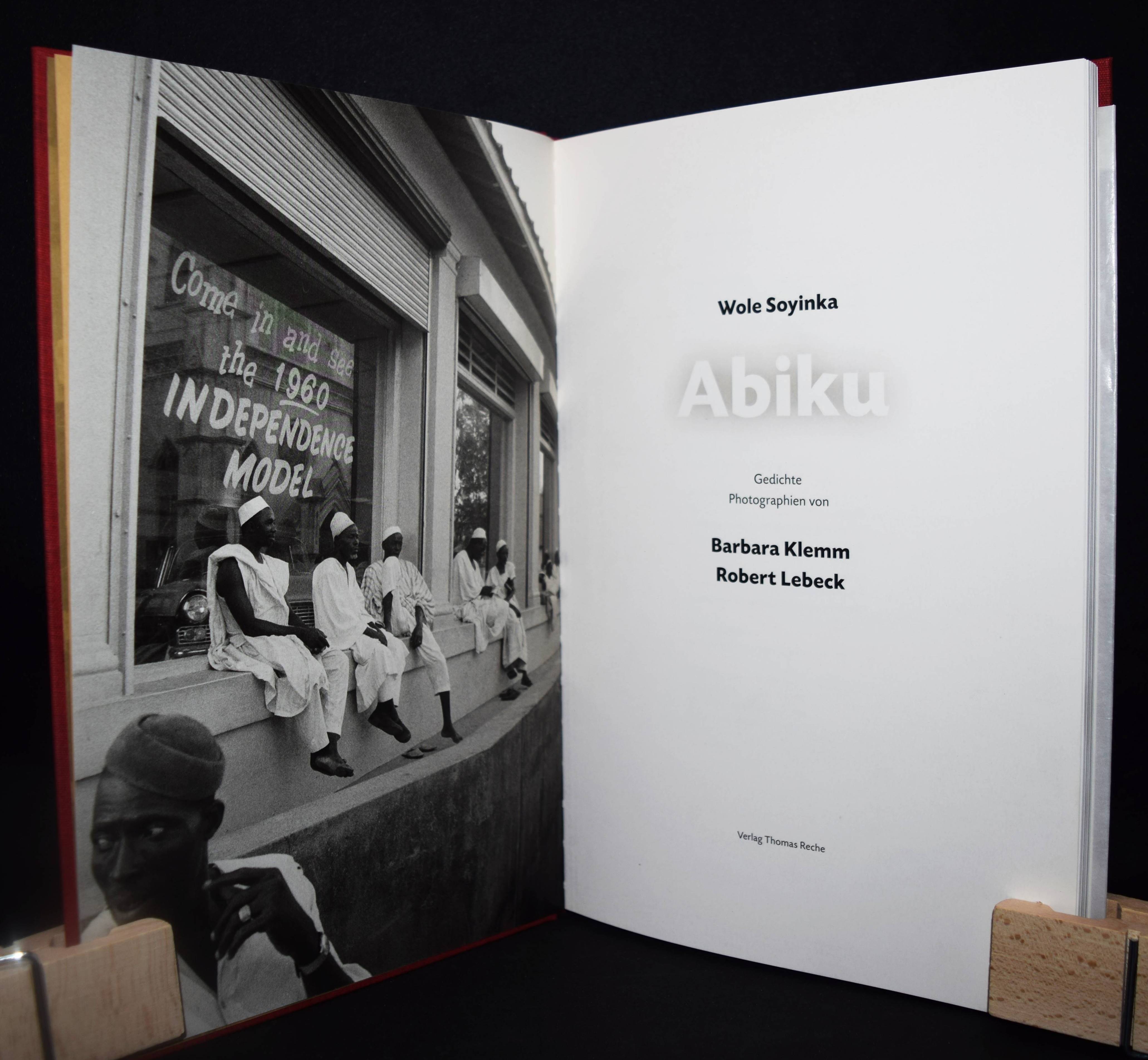 Klemm u. Lebeck – Soyinka, Wole. Abiku. Gedichte und Photographien von Barbara Klemm (und) Robert Lebeck. Neumarkt in der Oberpfalz, Verlag Thomas Reche (2012). 103, (1) S. mit 48 Duotone-Tafeln u. 4 Orig.-Photographien (Silbergelatine, 28 x 19 cm. rückseitig von R. Lebeck u. B. Klemm signiert u. num.). Orig.-Leinenband. (Reihe Ligaturen, Band 4). Vgl. Koetzle 233 u. 252 f. – Nr. XXI von 35 röm. num. Exemplaren der Vorzugsausgabe A; von B. Klemm, R. Lebeck und W. Soyinka signiert und jeweils zwei, verso signierte Silbergelatine-Abzüge von B. Klemm und R. Lebeck (GA 535 Exemplare). – „Der Band ‚Abiku‘ erscheint als zweisprachige Ausgabe in der Übersetzung von Julia Rotte und Hans Dieter Schäfer …“ – „Je mehr man sich in die Bilder versenkt, desto mehr wird bewusst, wie sehr Barbara Klemm an einem Epochenbild gemalt hat, Augenblick für Augenblick zusammenfügend, Facette für Facette beleuchtend, scheinbar dem Zufall der Haupt- und Staatsereignisse folgend, in Wahrheit aber zäh und diskret ein Ziel im Auge behaltend; die Geschichte ihrer Zeit als Geschichte unserer Zeit zu erzählen, als gemeinschaftliches Handeln von Menschen“ (C. Stölzl in Koetzle). – „Fotografie, auch journalistische Fotografie, kann pathetisch sein, brutal, obszön, sentimental. Lebecks Fotografie ist nichts von alledem. Sie ist auf irretierende Weise nüchtern. Seine Bilder haben immer etwas von dem sezierenden Blick eines Chirurgen. Manchmal mag dies als Kälte erscheinen, und in der Tat wirkt seine emotionlose Art, Dinge und Menschen zu sehen, zuweilen provozierend. Doch gerade das Kühle, Unbeteiligte, die innere Distanz zum Objekt und zum Vorgang (was etwas anderes ist als Gleichgültigkeit) machen die Wirkung von Lebecks Arbeiten aus“ (H. Jaenecke in Koetzle). – Der nigerianische Schriftsteller Akinwande Oluwole Soyinka (geb. 1934) erhielt 1986 den Literatur-Nobelpreis als erster Vertreter der afrikanischen Literatur. Seit 1994 ist Soyinka auch Goodwill-Botschafter der UNESCO. – Tadellos.