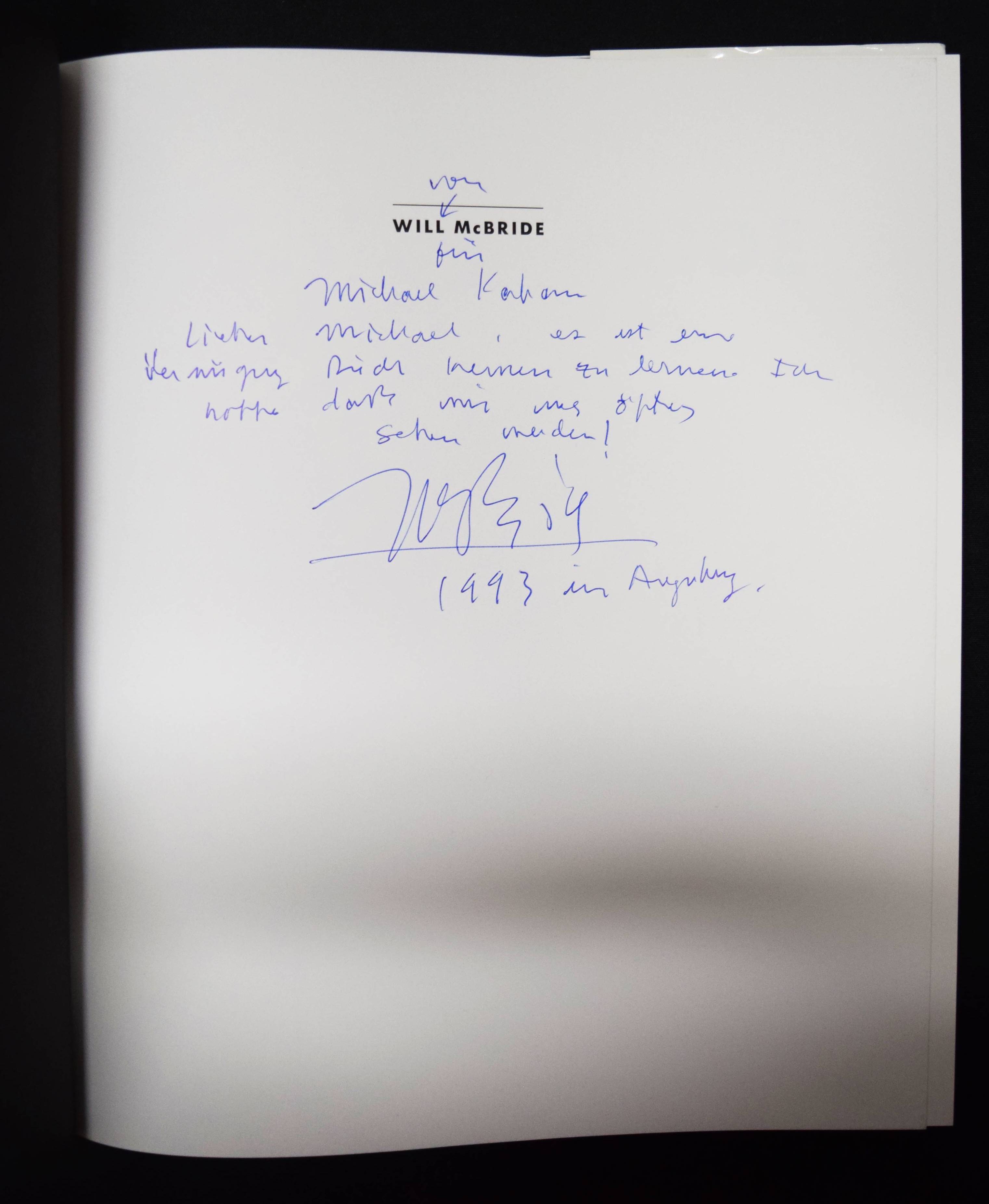 McBride, Will. 40 Jahre Fotografie. Herausgegeben von Peter Weiermair mit Texten von Peter Weiermair, Klaus Honnef, Michael Koetzle und Thilo Koenig. Schaffhausen, Edition Stemmle (1992). 4°. 192 S. mit zahlr. Tafeln u. Abb. OPbd. mit illustr. OU. Mit eigenhändiger Widmung von W. McBride „für Michael Kahan, Lieber Michael, es ist ein Vergnügen Dich kennen zu lernen. Ich hoffe daß wir uns öfter sehen werden! Will McBride 1993 im August“. – Retrospektive von W. McBride, der seit 1961 als freischaffender Fotograf arbeitete. – “Seine Bilder zeigen Berlin als einen gezeichneten Ort, in dem sich die neuere Geschichte in besonderer Weise spiegelt. Und als ein Terrain, das ihm und den Freunden, die er hier gefunden hat, unerhörte Freiräume eröffnete. Erkennbar wird ein ganz und gar eigenständiger Fotograf, ein Zeitgenosse, der fraglos in die erste Reihe fotografierender Künstler gehört“ (H.-M. Koetzle zur Ausstellung „Berlin im Aufbruch“ 2013). – Tadellos.