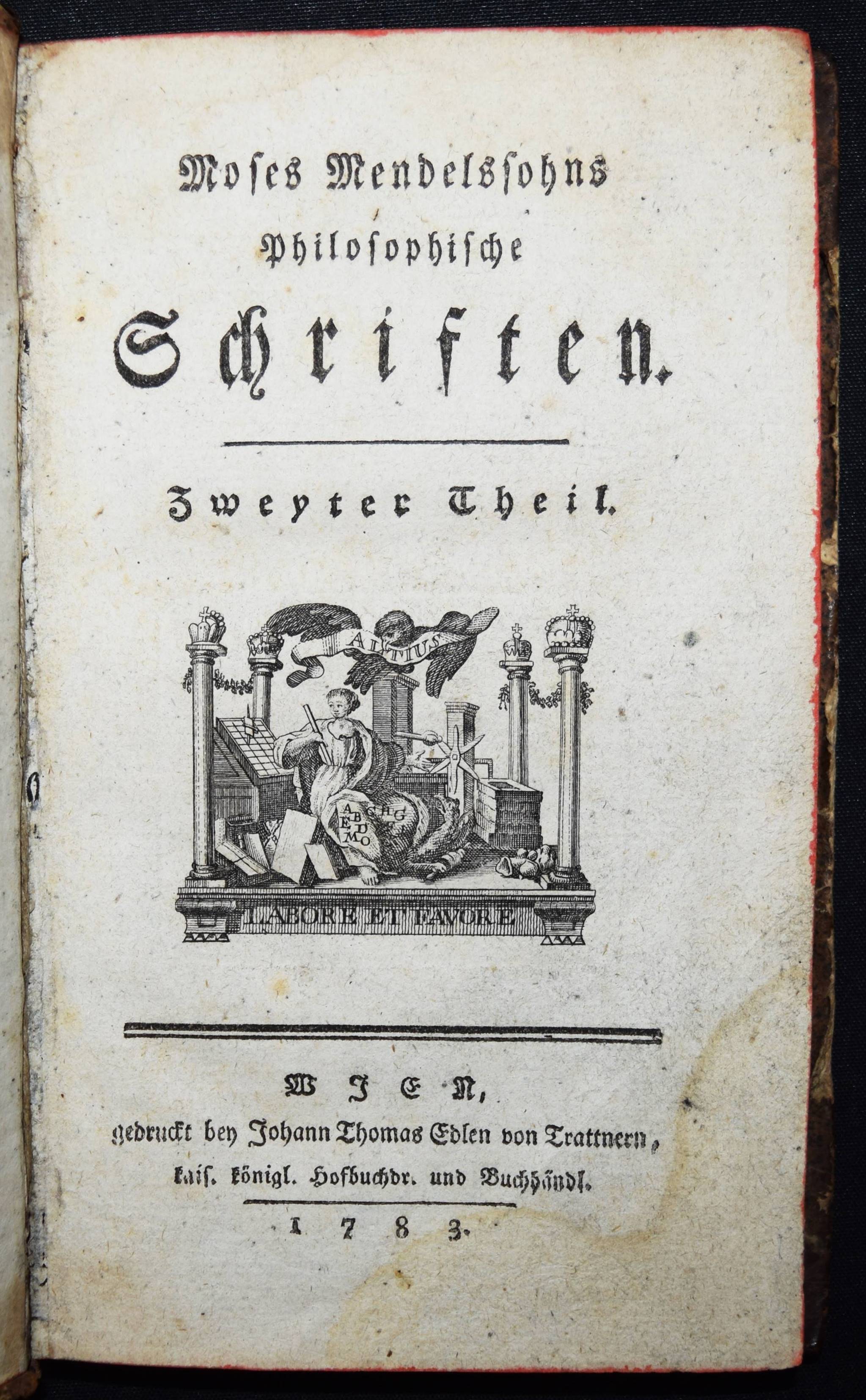 Mendelssohn, Moses. Philosophische Schriften. Zweyter Theil (von 2). Wien, Trattner 1783. 8°. 237 S. mit gestoch. Titelvignette. Hldr. d. Zt. Vgl. Goed. IV,1, 488, 6, Fürst II, 362 u. Meyer 114. – Zuerst 1761 in Berlin erschienen. – Enthält: I. Rhapsodie, oder Zusätze zu den Briefen über die Empfindungen. – II. Ueber die Hauptgrundsätze der Schönen Künste und Wissenschaften. – III. Ueber das Erhabene und Naive in den schönen Wissenschaften. – IV. Ueber die Wahrscheinlichkeit. – Deckel berieben, vord. freier Vorsatz fehlt, im Rand etwas braunfleckig, gutes Exemplar.