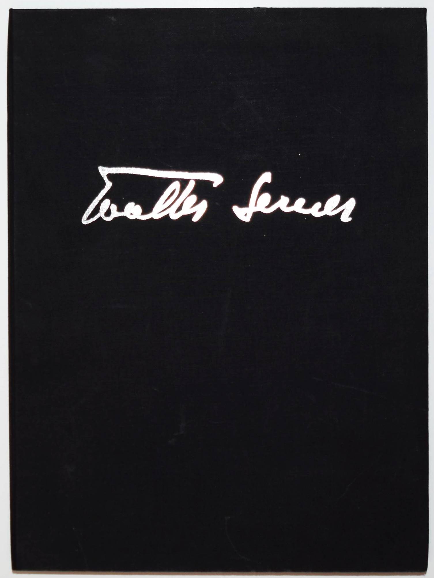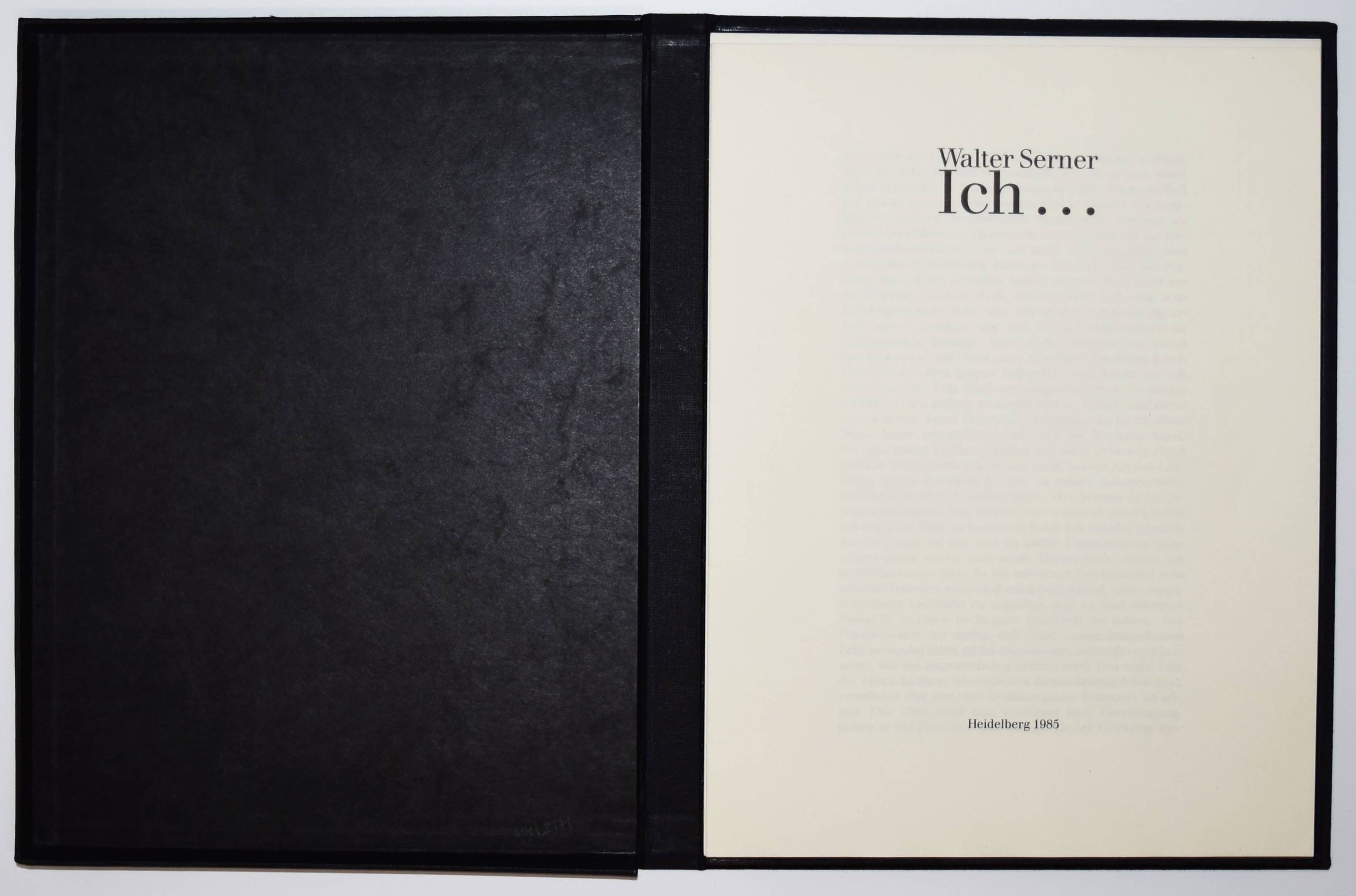 Serner, Walter. „Ich …“. (Herausgegeben von Thomas Milch und Handjörg Möbius). Heidelberg Walter-Serner-Archiv 1985. 4°. [4] Bl. u. 11 mont. Orig.-Photographien (Silbergelatine, 23 x 17 cm.) „nach den historischen Vorlagen auf Bristolkarton kaschiert“. Orig.-Leinen-Buchkassette mit silbergepr. Deckelsignatur. Eines von 99 num. Exemplaren. – Mit der 1925 zuerst veröffentlichten Selbstbiographie Serners und 11 Handabzügen nach historischen Vorlagen. – „Obwohl S. schon früh enge Beziehungen zu Zürcher Dadaisten wie Hugo Ball und Tristan Tzara unterhielt, beteiligte er sich erst seit 1918 an dieser Kunstbewegung. Seine Schrift „Letzte Lockerung manifest dada“ (1918 verfaßt, 1920 vollständig publiziert) gilt als eines der wichtigsten literarischen Dada-Dokumente. … Höhepunkt ist S.s Roman „Die Tigerin“ (1925), in dem ein Pariser Gaunerpaar die Liebe zur Hochstapelei rechtfertigt, um nicht Opfer eines existentiellen „Leerlaufens“ zu werden. Alfred Döblin nannte den Roman ein „ausgezeichnetes Kunstwerk“. Bis heute kaum beachtet blieb die Qualität von S.s erotischen Schilderungen, die mit denen Georges Batailles und Pierre Klossowskis zu vergleichen sind. S.s Werke wurden von den Nationalsozialisten verboten. S. zog sich nach dem „Anschluß“ Österreichs mit seiner Frau nach Prag zurück, von wo aus er im Aug. 1942 in das Ghetto Theresienstadt überstellt wurde. Noch im selben Monat erfolgte die Deportation in den Osten, wo S. vermutlich in einer mobilen Gaskammer ermordet wurde“ (A. Puff-Trojan in NDB XXIV, 270 f.). – Kassette etwas berieben.