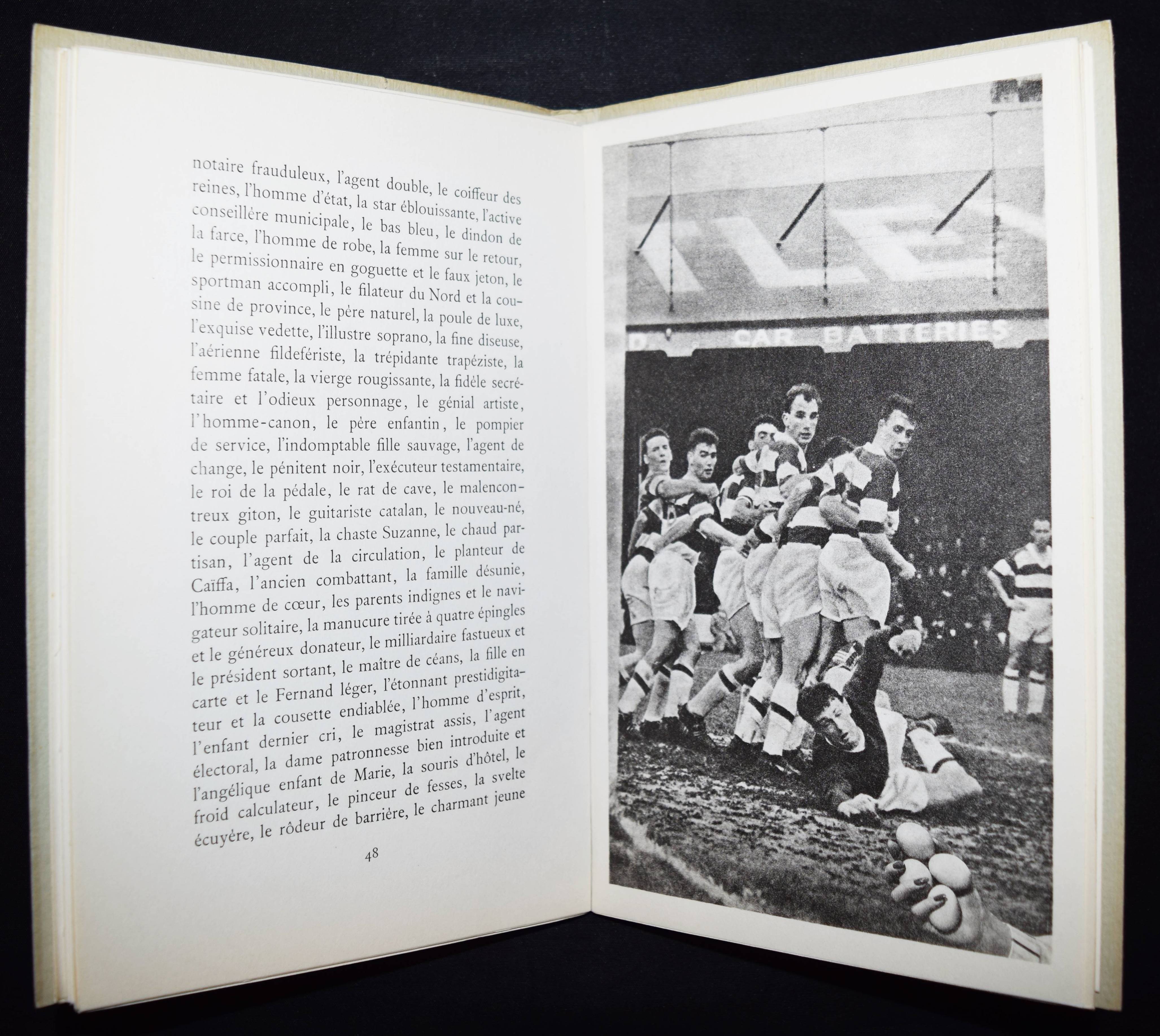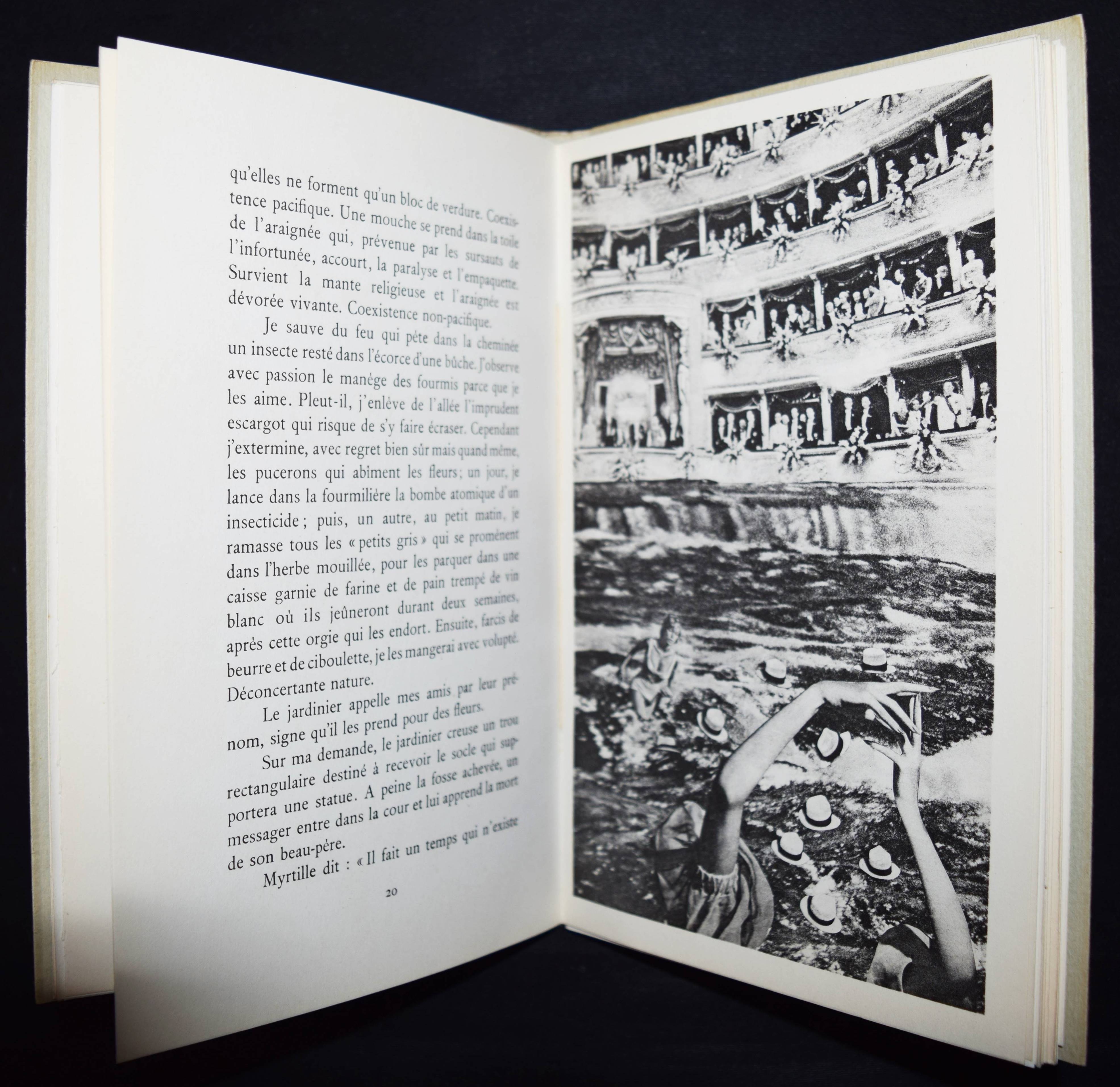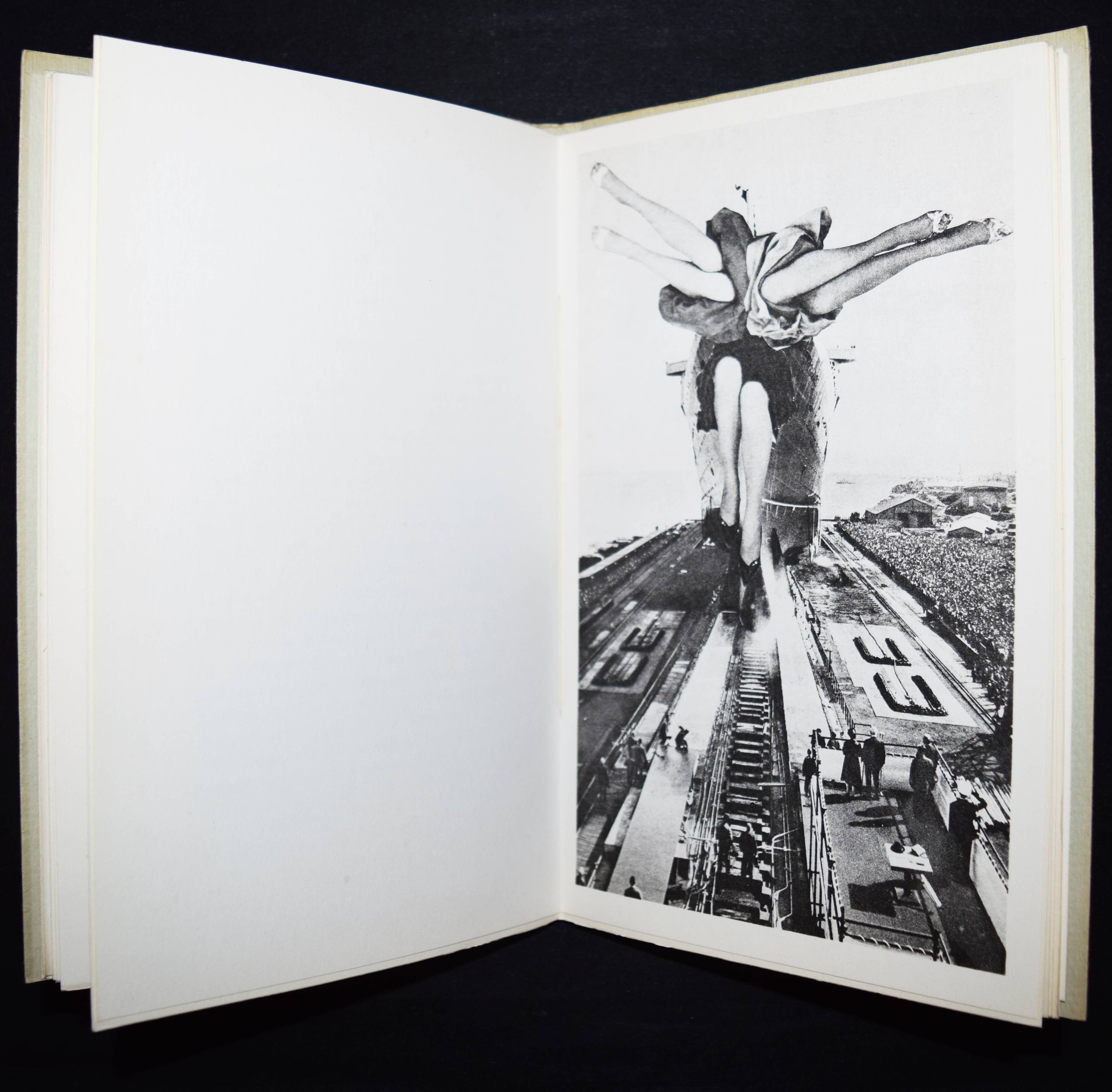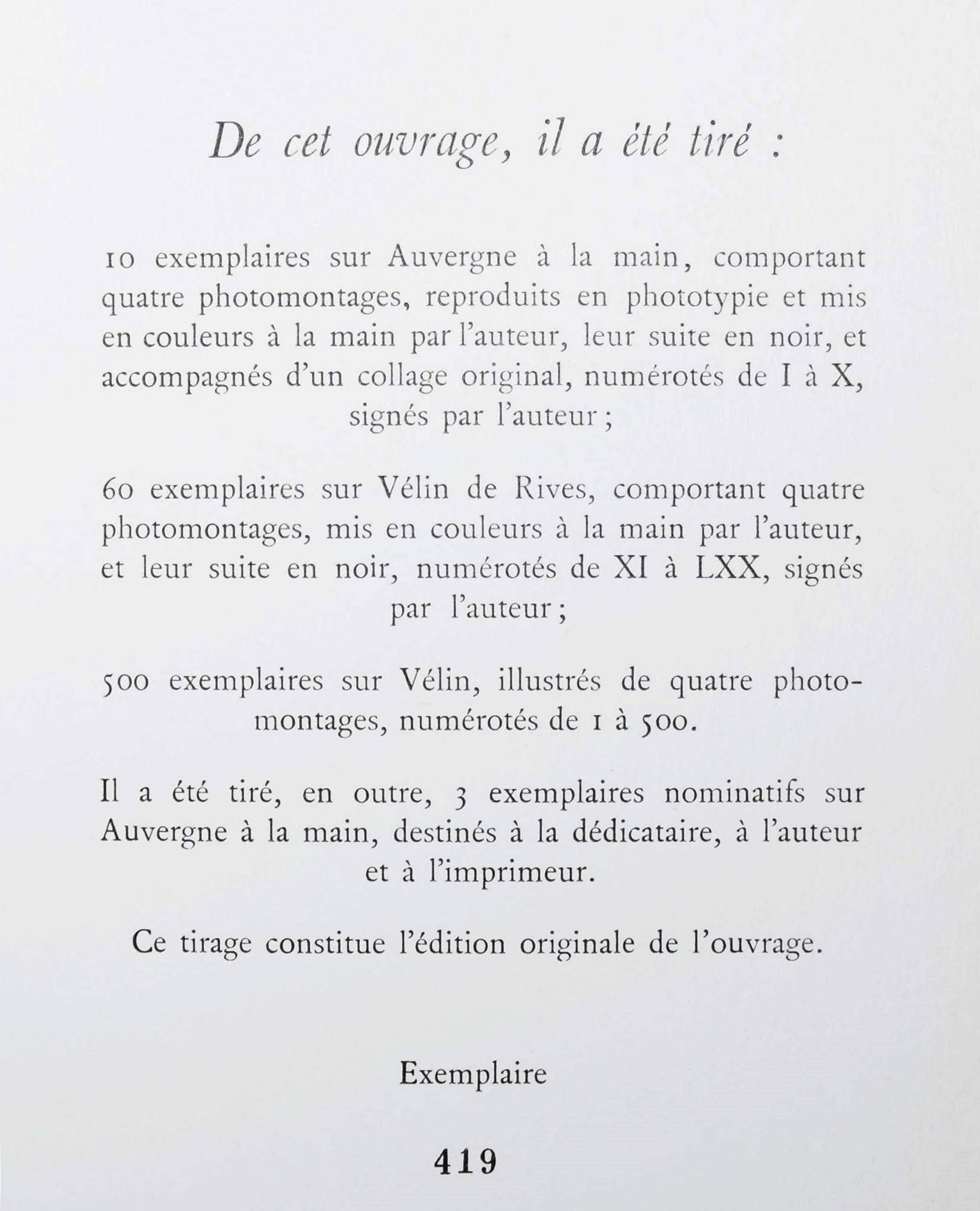 Hugnet, Georges. 1961. Illustré de quatre photomontages. Paris, chez l’auteur (1961). 8°. 60 S., [5] Bl. mit 4 Tafeln. OKart. mit OU. Koetzle 213 f. – Erste Ausgabe. – Eines von 500 num. Exemplaren auf Vélin. – G. Hugnet (1906-1974), „führender Vetreter des Surrealismus um 1930“ (H.-M. Koetzle), „als großer Liebhaber der Malerei, der mit Picasso, Dominguez, Duchamp und Dali persönlich befreundet war ließ Hugnet … es sich nicht nehmen, auch in den Bereich der bildenden Künste vorzustoßen, und zwar mit Collagen, auf denen er Fotografien mit verschiedenartigen Materialien verbindet“ (E. Jaguer in Koetzle). – „Georges Hugnet est depuis 1936 un membre très actif du groupe surréaliste. Si l’on excepte Schwitters, Rodchenko et surtout Heartfield, il sera l’un des premiers à découper des images dans des magazines, notamment de femmes légères, tel Paris-Magazine, et à les utiliser dans des collages“ (C. Bouqueret zu „La Septième Face du dé“, Paris 1936). – Sehr gutes unbeschnittenes Exemplar.