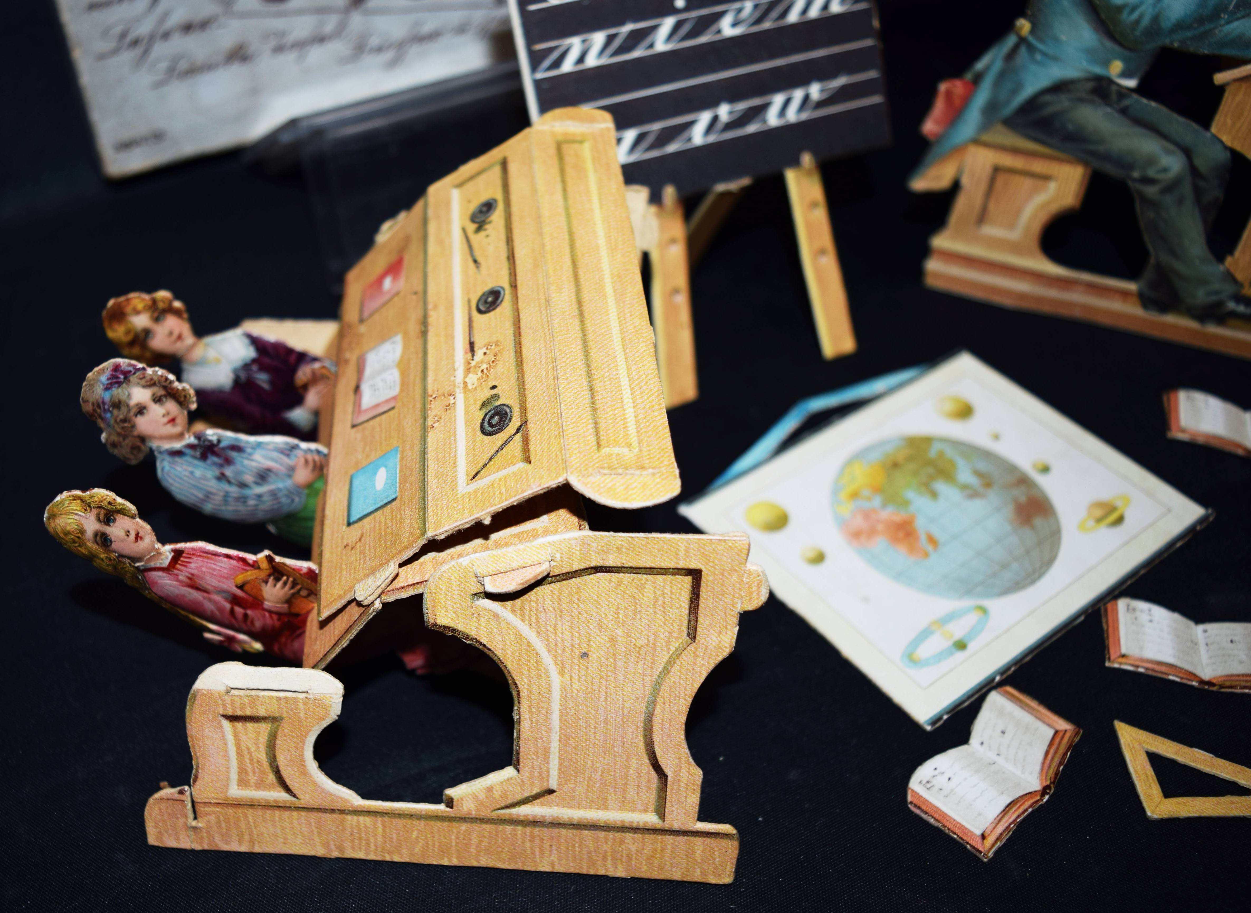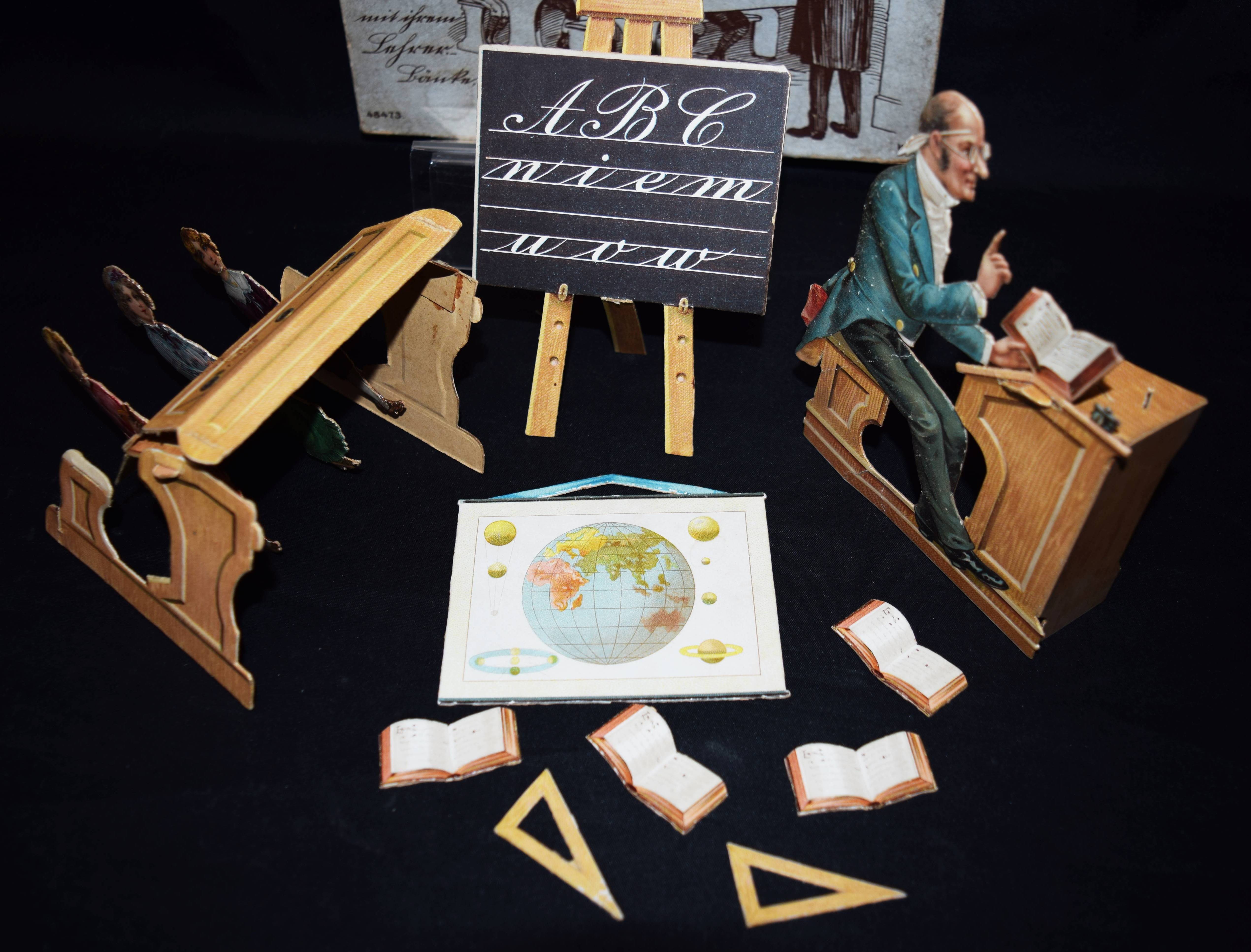 Spiele – Die fleißigen Kinder in der Schule. Sieben Kinder mit ihrem Lehrer. – Bänke, Tafel, Bücher u. s. w. O. O., Dr. u. J. (Nürnberg ?) WH um 1900. 4 (statt 8) Figuren (3 Kinder, ca. 10 x 4 cm. u. Lehrer an seinem Pult mit einem Buch, ca. 14 x 14 cm.), vierteilige Schulbank, Schultafel, Weltkarte, 4 aufgeschlagene Bücher und 2 Geo-Dreiecke, alles in Chromolithographie auf Karton. Illustr. Orig.-Pappkassette (15,5 x 24 cm.). Seltenes Schul-Spiel. Die Möbel können zusammengefaltet und aufgestellt werden, die drei Kinder können nebeneinander auf die Schulbank gesetzt werden. – Deckel der Kassette an einer Ecke eingerissen, eventuell fehlen vier Kinder und eine weitere Schulbank, die Schulbank mit kl. Fehlstelle, sonst von Gebrauchsspuren abgesehen gut erhalten.