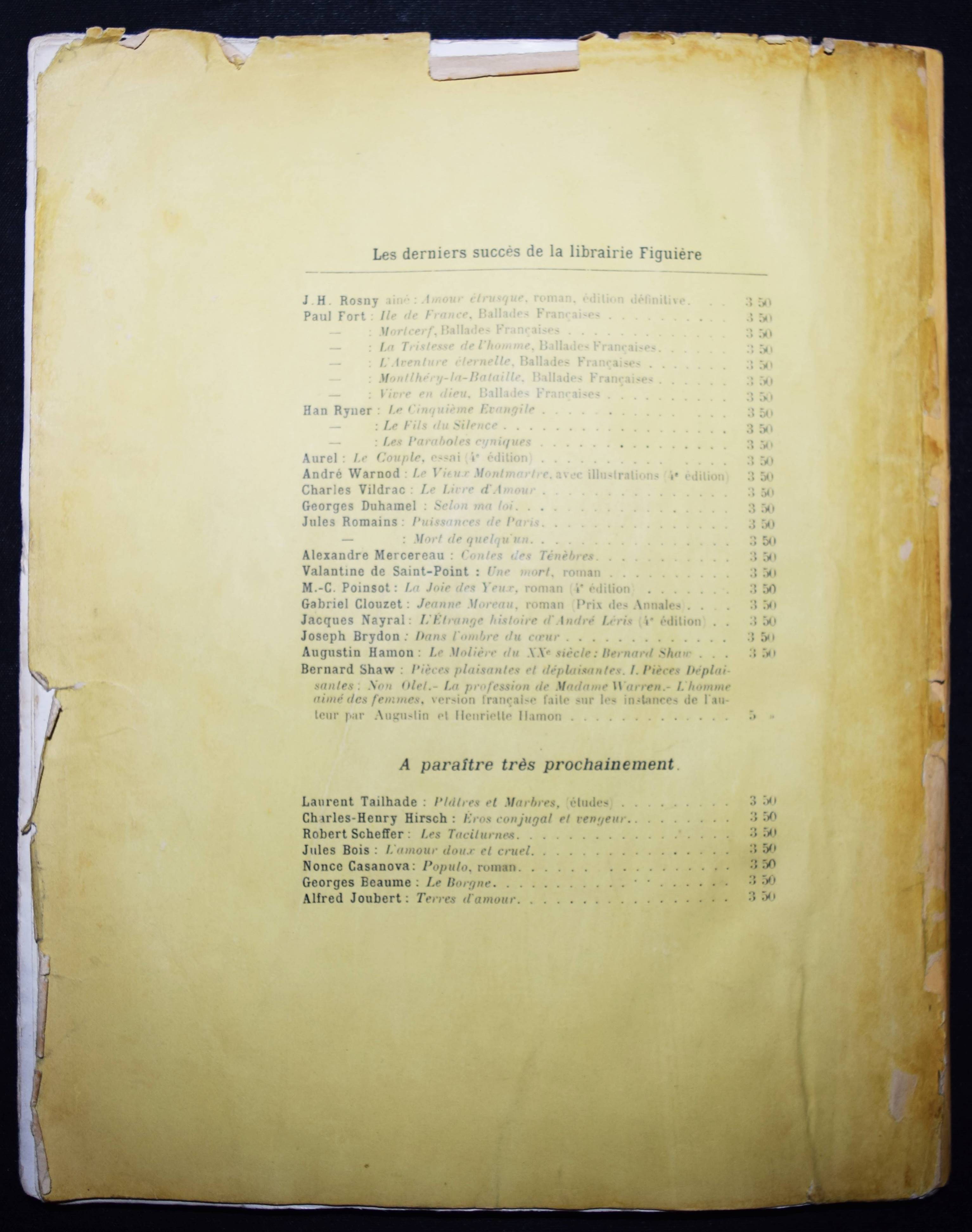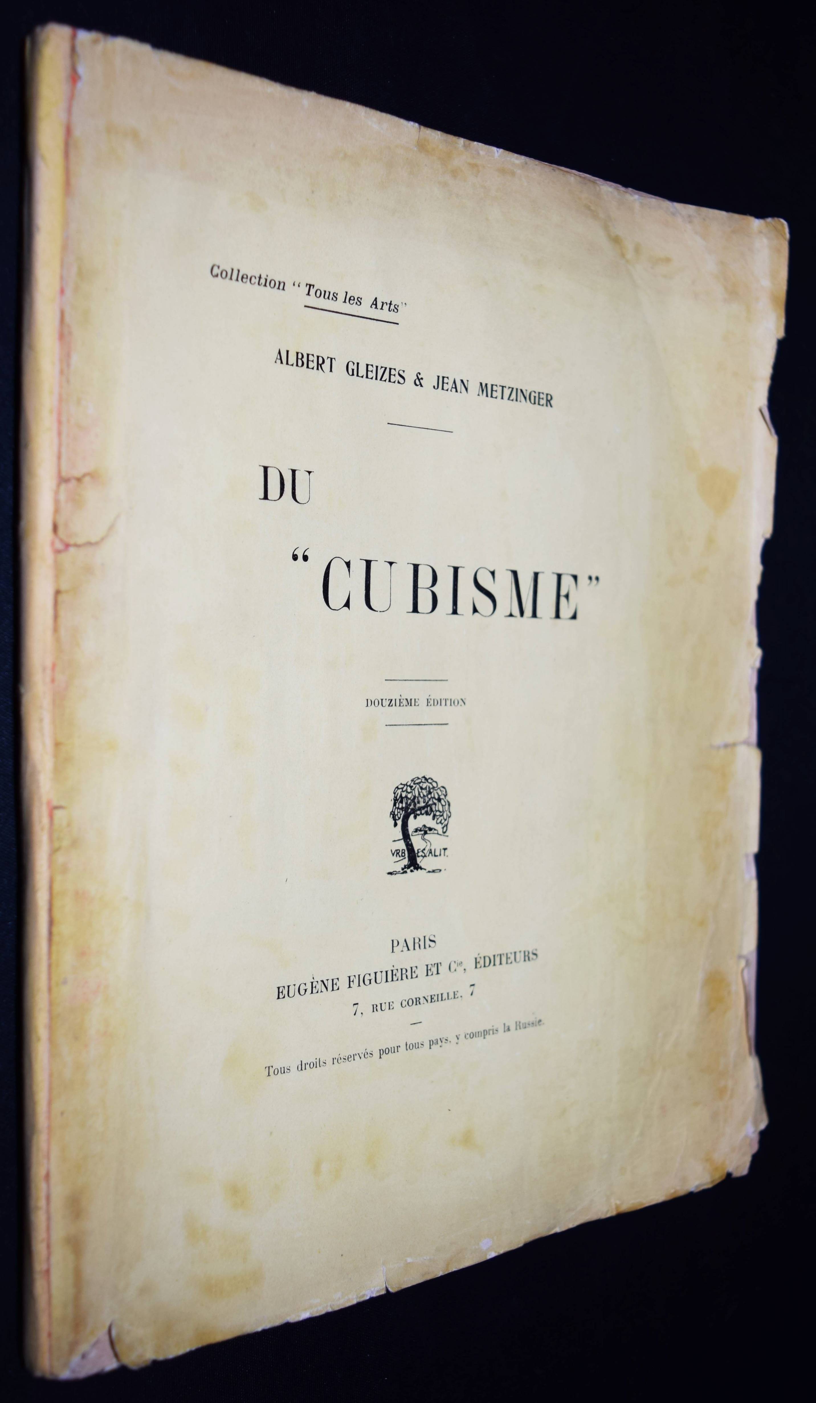 Gleizes, Albert et Jean Metzinger. Du „Cubisme“. Douzième édition (fictive). Paris, Eugeène Figuière et Cie. (27. 12. 1912). 8°. 44 S., [38] Bl. mit 26 Tafeln. Gelber typogr. Orig.-Broschur-Umschlag. (Collection „Tous les Arts“). The Artist & the Book 1860-1960, 89. Johnson & Stein, Artists’ Books in the Modern Era 122. Stein, Libri cubisti 15. – Erste Ausgabe der ersten Schrift über den Kubismus, noch vor dem 1913 erschienenen „Les Peintres Cubistes“ von G. Apollinaire. Veröffentlicht mit verschiedenen fiktiven Auflagenbezeichnungen, laut Impressum: „Achevé d’imprimer le 27 Décembre 1912“. Das Buch war bereits im März 1912 in der Revue d’Europe et d’Amérique“ angekündigt worden, außerdem anlässlich des Salon des Indépendants in der Gazette des beaux-arts und im Paris-Journal vom 26. Oktober 1912. – Die Tafeln mit Werken von Paul Cézanne, Pablo Picasso, André Derain, Georges Braque, Jean Metzinger, Marie Laurencin, Albert Gleizes, Fernand Léger, Marcel Duchamp, Juan Gris und Francis Picabia. – 1947 erschien eine Neuausgabe mit Originalgraphik. – „Mention fictive d’édition sur la couverture et le titre, comme quasiment toujours. Essai théorique fondateur sur le mouvement cubiste, le premier en date, par deux de ses acteurs. L’association des peintres Albert Gleizes (1881-1953) et Jean Metzinger (1883-1956) avait pris corps au cours du Salon d’automne de 1910, où les deux artistes frondeurs firent bande à part. Peu après, la publication d’une Note sur la peinture due au seul Metzinger devait introduire l’idée de ‘perspective mobile‘ et d’‘image totale’, et présenter au public les deux principaux artistes représentant la nouvelle tendance : Braque et Picasso. À la fin de l’année 1912, quelques semaines après l’exposition cubiste de la Section d’Or, paraît enfin Du cubisme, ouvrage capital dans lequel les réflexions des deux auteurs sur la tradition picturale réinterprétée à la lumière des théories scientifiques – géométrie non-euclidienne, Poincaré, Einstein – fondent enfin la véritable doctrine cubiste: “Aux libertés partielles conquises par Courbet, Manet, Cézanne et les impressionnistes, le cubisme substitue une liberté indéfinie. Désormais, la connaissance objective tenue enfin pour chimérique, et prouvé que tout ce que la foule entend pour forme naturelle est convention, le peintre ne saura d’autres lois que celles du Goût. L’éditeur Eugène Figuière (1882-1944) joua un rôle de premier plan dans la diffusion de la modernité au début du XXe siècle. “Auteur lui-même, il est avant tout l’éditeur des auteurs et des revues qui se battent pour l’éclosion des forces d’après le symbolisme” (Raymond Josué Seckel).“ (Sotheby’s et Drouot, Paris, „La Bibliotheque de Pierre Bergé“). – Rücken unauffällig erneuert, Umschlag angestaubt und mit Randläsuren, eine Tafel im rechten w. Rand mit Ausriss, sonst gut erhalten.