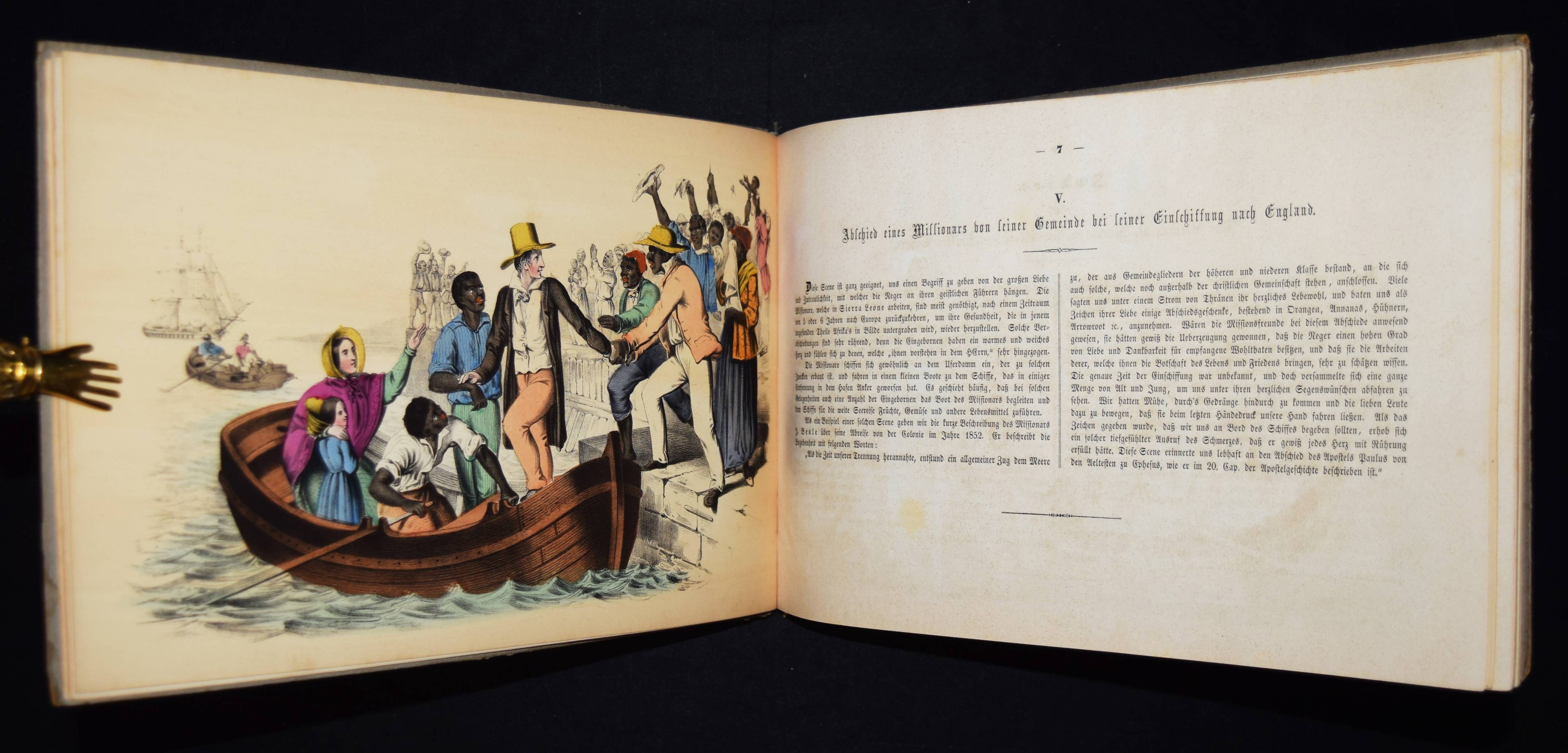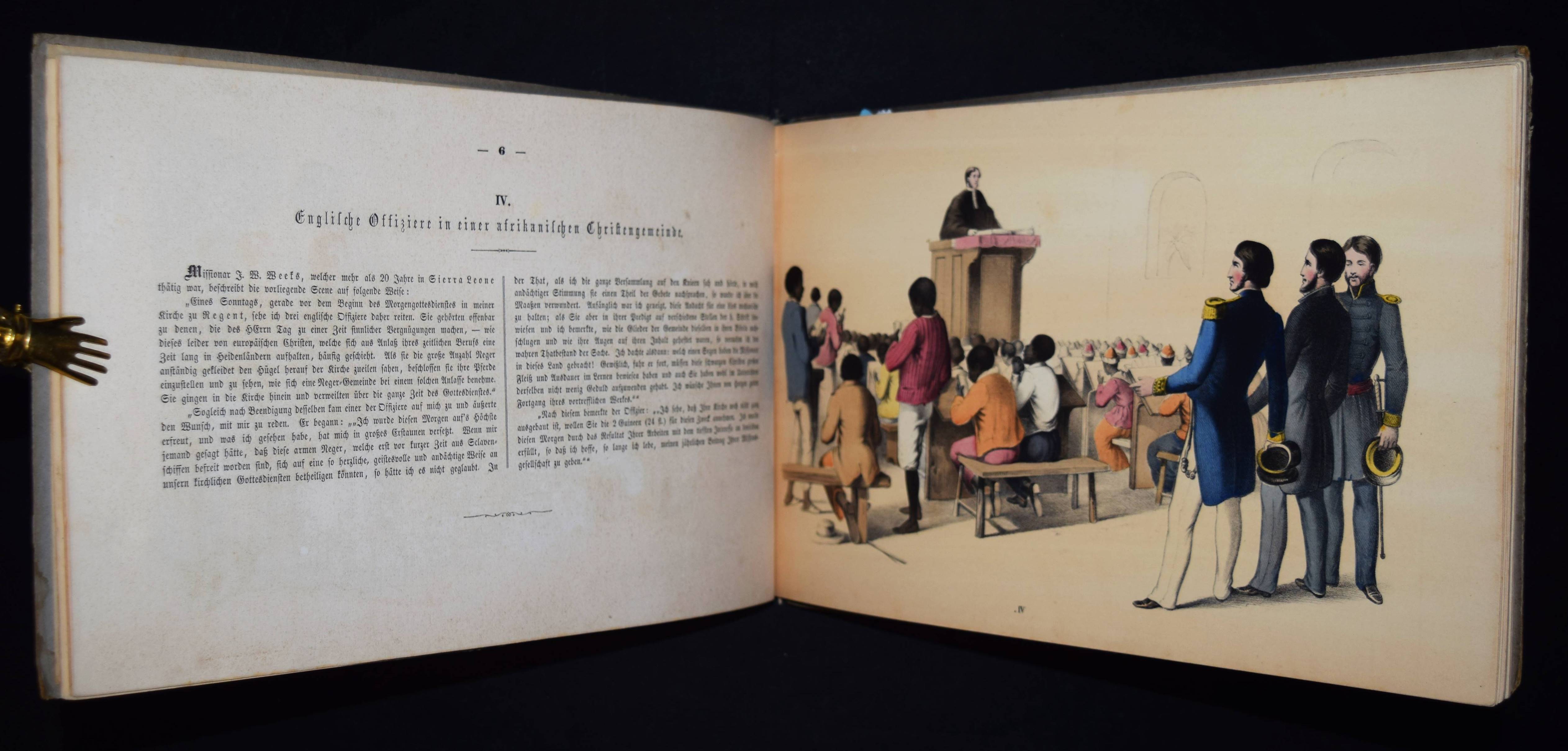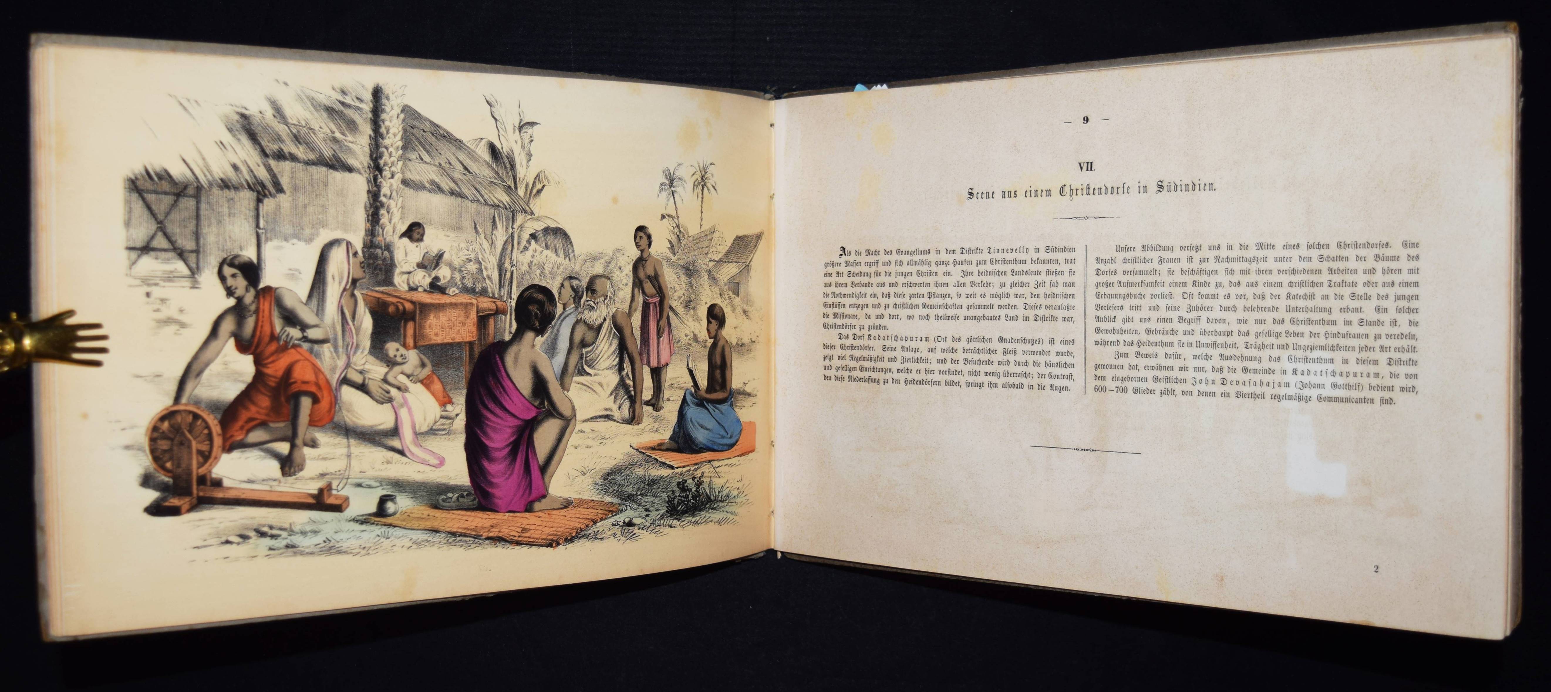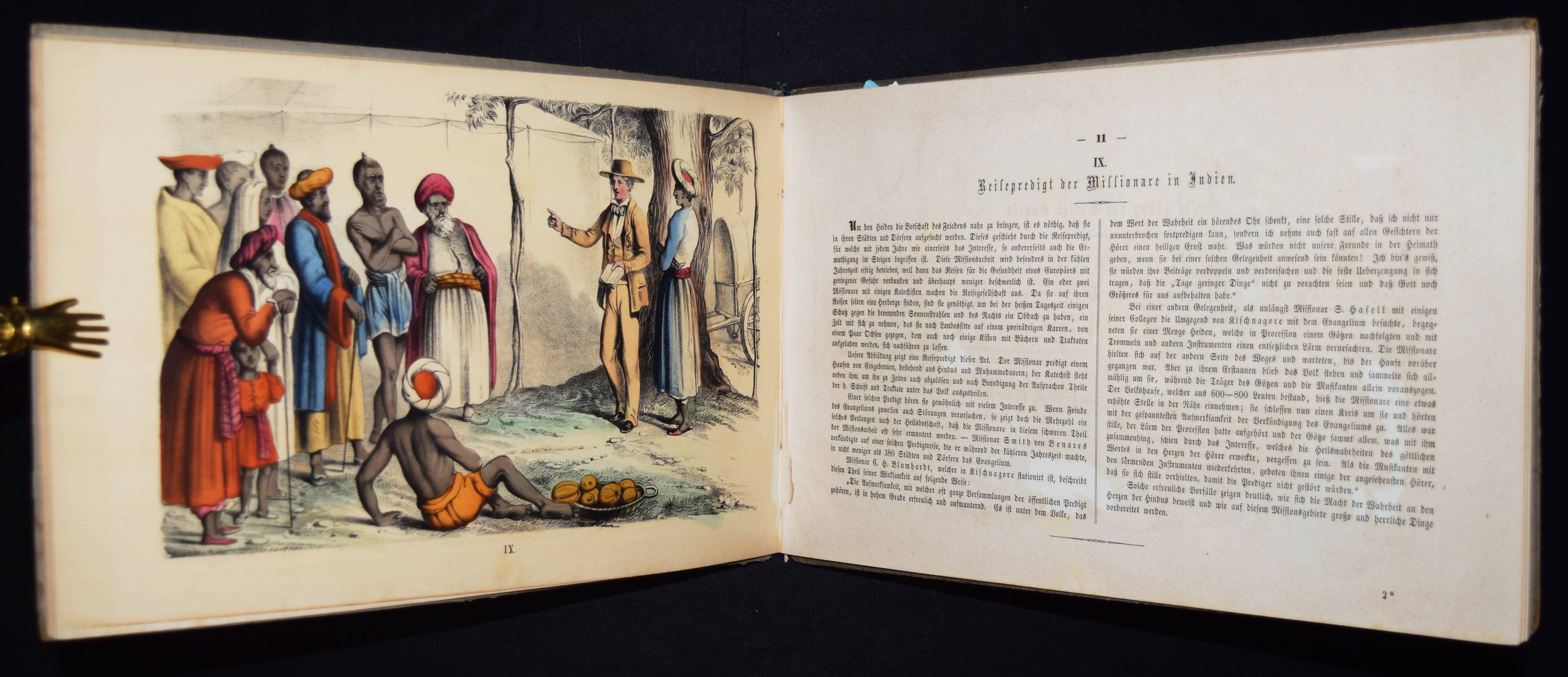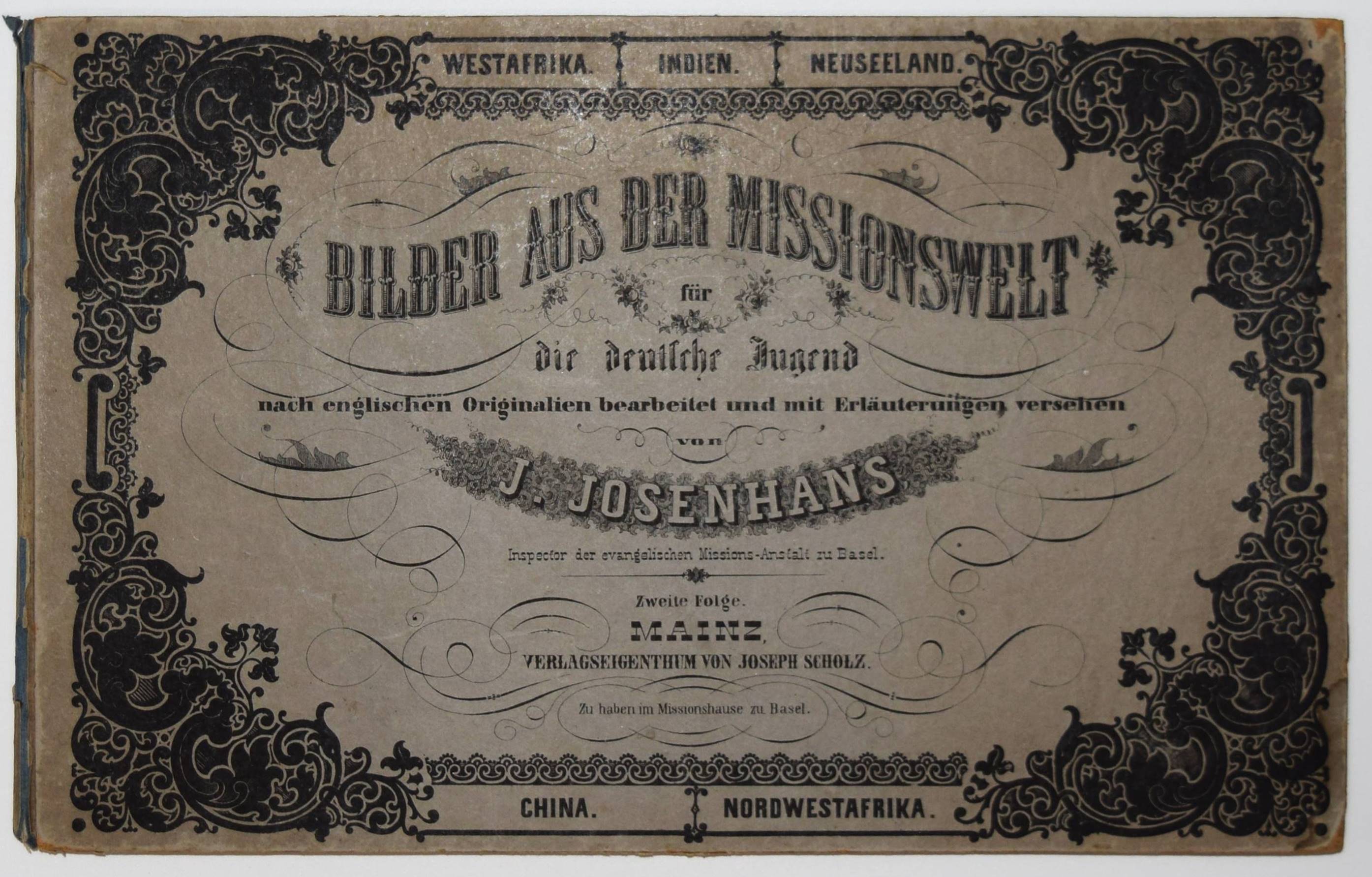 Josenhans, J(oseph). Bilder aus der Missionswelt. Für die deutsche Jugend nach englischen Originalien bearbeitet und mit kurzen Erklärungen versehen. Zweite Folge (von 2). Mainz, Joseph Scholz o. J. (1858). Quer-4°. 22 S. u. 20 handkol. lithogr. Tafeln. Typogr. OPbd. NDB X, 612. Seebaß I, 997 u. 998 (Teil I von 1856). – Einzige Ausgabe des zweiten Teils des sehr seltenen Bilderbuchs. – „Wegen der prächtigen, vorzüglich kolorierten großen Lithographien gesuchtes Werk: Sehr eindrucksvolle Szenen aus dem Leben der Eingeborenen in Afrika, Indien, Neuseeland, China… – Hervorragendes Bilderbuch mit Darstellungen aus dem Volks- und Missionsleben Westafrikas, Indien und China … Dieses prachtvoll illustrierte Kinderbuch ist sehr selten geworden“ (A. Seebaß). Die schönen Tafeln im vorliegenden zweiten Teil zeigen Kinder in einer Mädchenschule in Sierra Leone, Hindus am Ufer des Ganges, eine „Schlangenanbetung“, Kriegsschiffe in Neuseeland, Indianer in Nordamerika u.v.m. – J. Josenhans (1812-1884) war von 1849 bis 1879 Inspektor der Basler Mission. „Erfahrungen einer Visitationsreise durch die ostind. Missionsgebiete und seine zielbewußte Treue befähigten ihn, die Arbeit auf den Missionsfeldern sowie im Heimathaus und in der gesamten Missionsarbeit umfassend zentralistisch und erfolgreich zu ordnen und zu gestalten, entsprechend der damaligen Erfordernisse. J. war der Organisator der Basler Mission und der Erzieher ihrer Missionare für eine Generation“ (H. Hohlwein in NDB). – Gelenke mit kl. Fehlstellen am Bezug, Ecken etwas bestoßen, stellenweise schwach braunfleckig und etwas gebräunt, sehr gutes Exemplar im seltenen Originaleinband.
