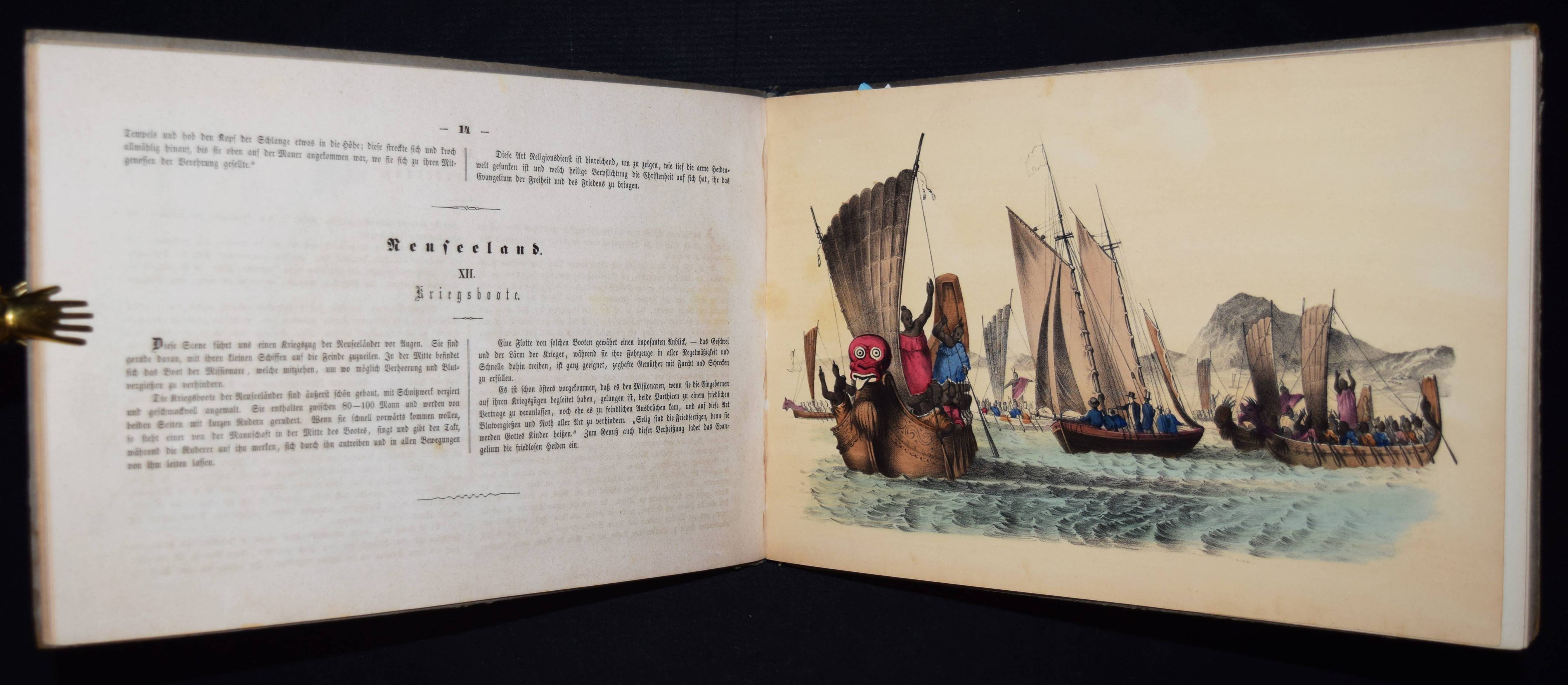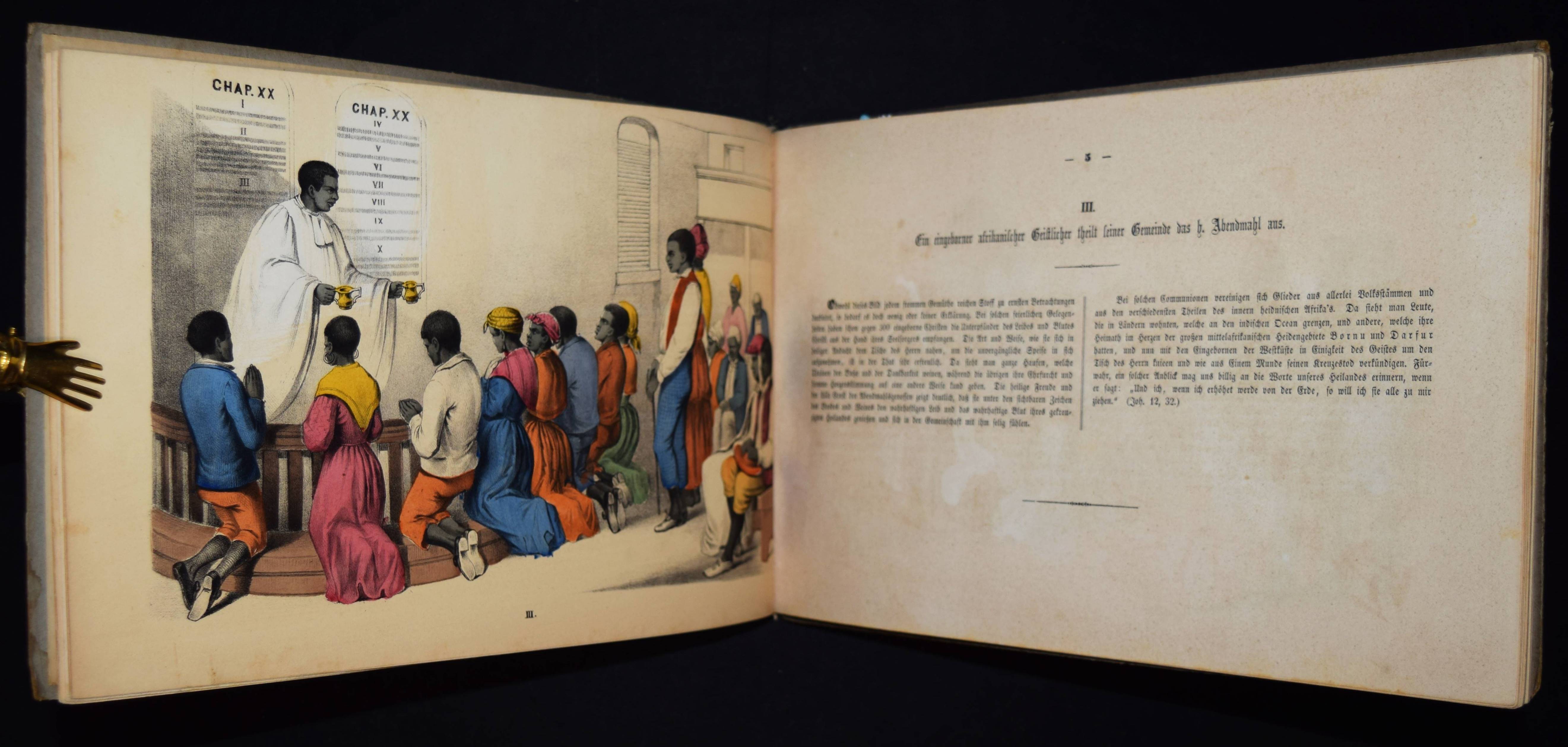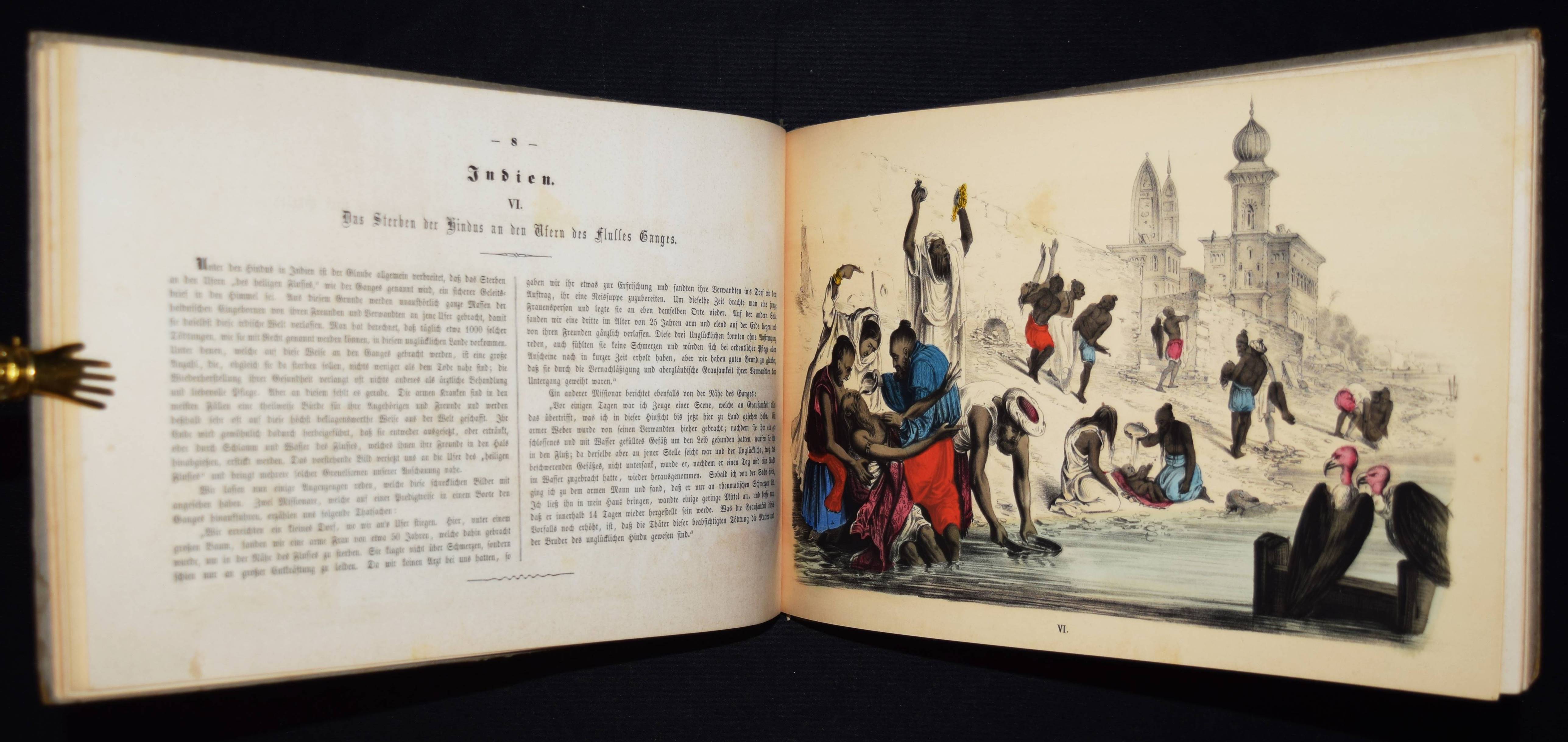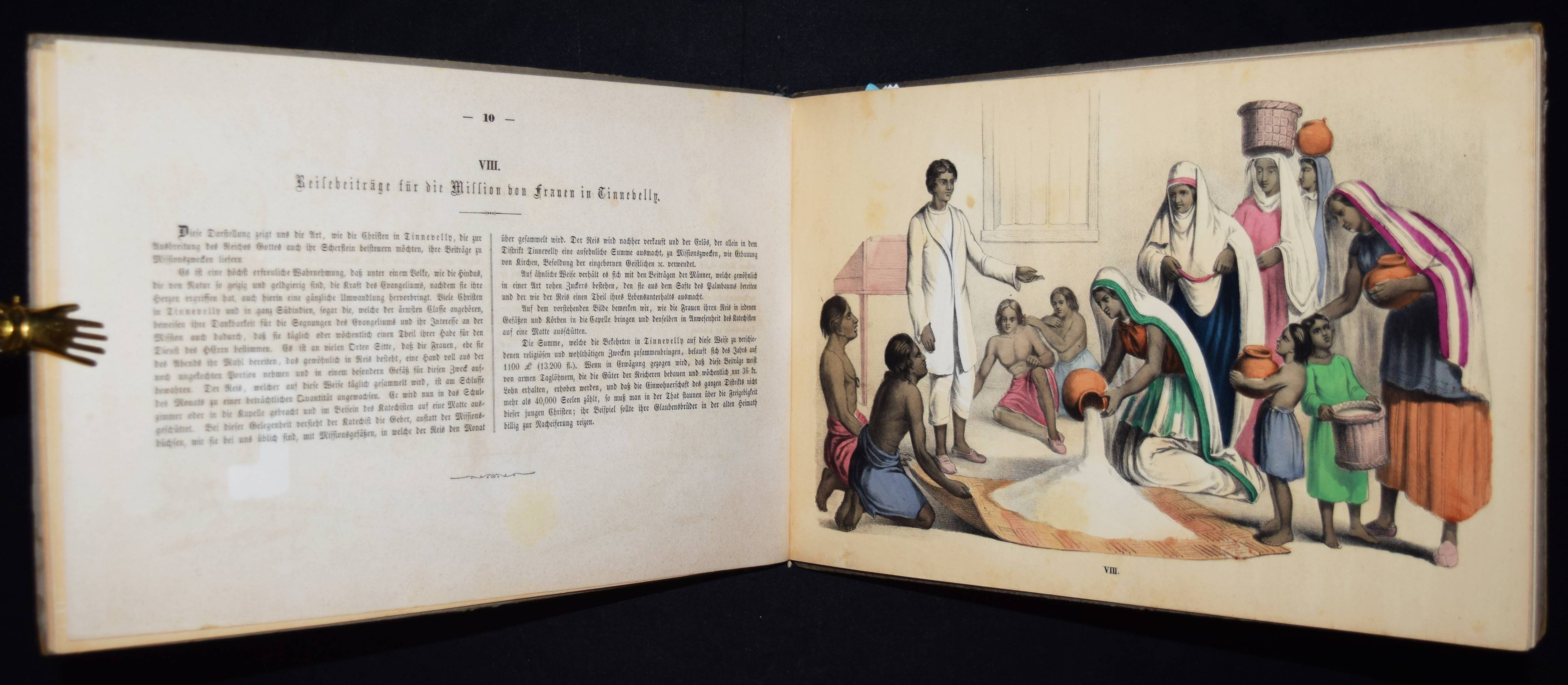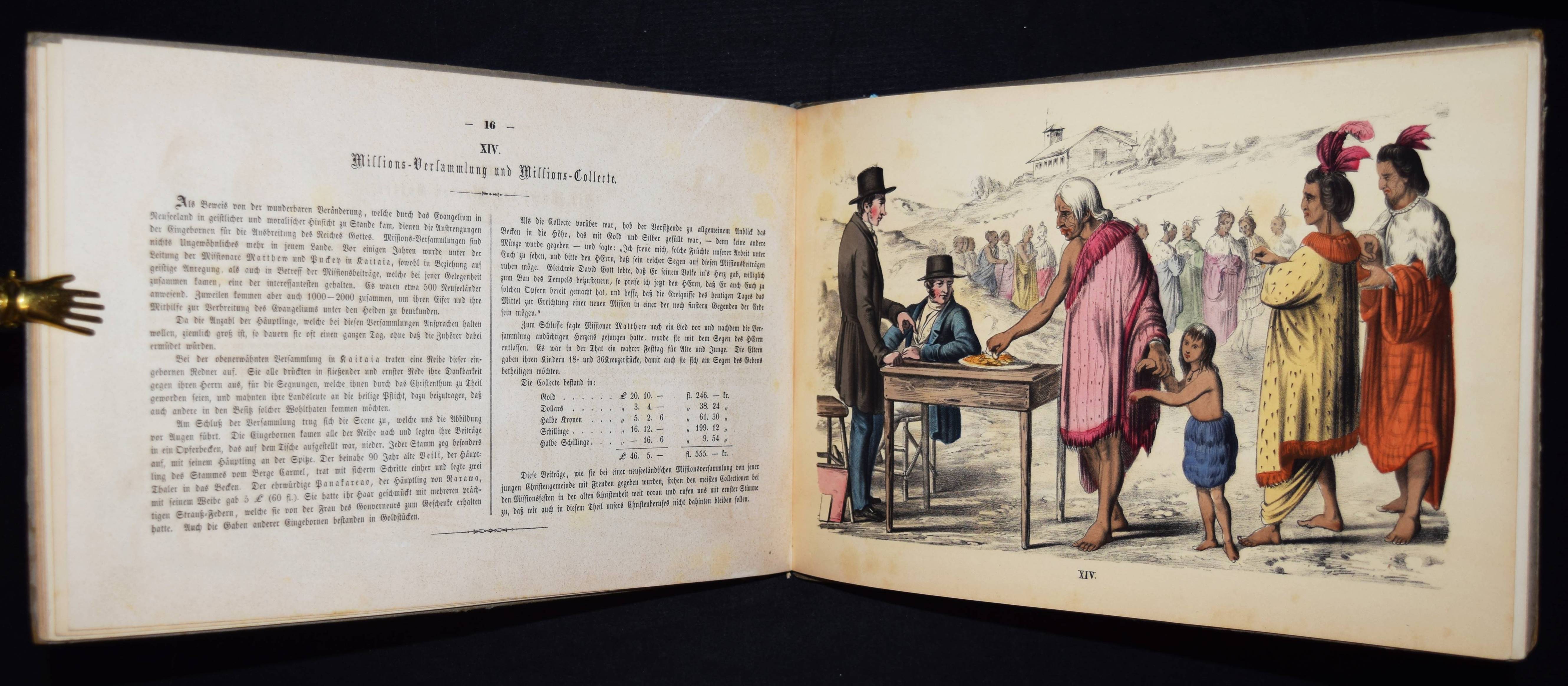 Josenhans, J(oseph). Bilder aus der Missionswelt. Für die deutsche Jugend nach englischen Originalien bearbeitet und mit kurzen Erklärungen versehen. Zweite Folge (von 2). Mainz, Joseph Scholz o. J. (1858). Quer-4°. 22 S. u. 20 handkol. lithogr. Tafeln. Typogr. OPbd. NDB X, 612. Seebaß I, 997 u. 998 (Teil I von 1856). – Einzige Ausgabe des zweiten Teils des sehr seltenen Bilderbuchs. – „Wegen der prächtigen, vorzüglich kolorierten großen Lithographien gesuchtes Werk: Sehr eindrucksvolle Szenen aus dem Leben der Eingeborenen in Afrika, Indien, Neuseeland, China… – Hervorragendes Bilderbuch mit Darstellungen aus dem Volks- und Missionsleben Westafrikas, Indien und China … Dieses prachtvoll illustrierte Kinderbuch ist sehr selten geworden“ (A. Seebaß). Die schönen Tafeln im vorliegenden zweiten Teil zeigen Kinder in einer Mädchenschule in Sierra Leone, Hindus am Ufer des Ganges, eine „Schlangenanbetung“, Kriegsschiffe in Neuseeland, Indianer in Nordamerika u.v.m. – J. Josenhans (1812-1884) war von 1849 bis 1879 Inspektor der Basler Mission. „Erfahrungen einer Visitationsreise durch die ostind. Missionsgebiete und seine zielbewußte Treue befähigten ihn, die Arbeit auf den Missionsfeldern sowie im Heimathaus und in der gesamten Missionsarbeit umfassend zentralistisch und erfolgreich zu ordnen und zu gestalten, entsprechend der damaligen Erfordernisse. J. war der Organisator der Basler Mission und der Erzieher ihrer Missionare für eine Generation“ (H. Hohlwein in NDB). – Gelenke mit kl. Fehlstellen am Bezug, Ecken etwas bestoßen, stellenweise schwach braunfleckig und etwas gebräunt, sehr gutes Exemplar im seltenen Originaleinband.