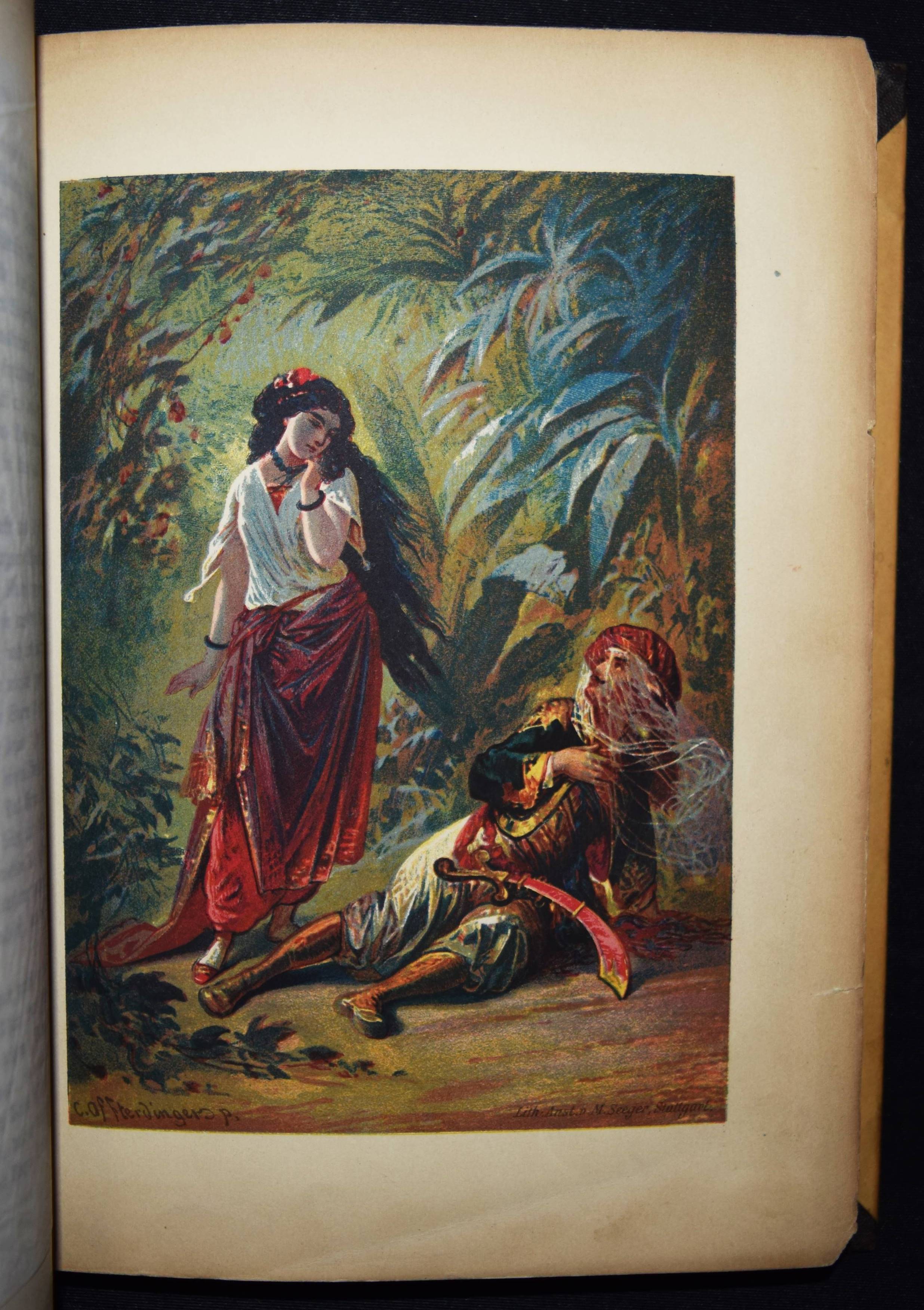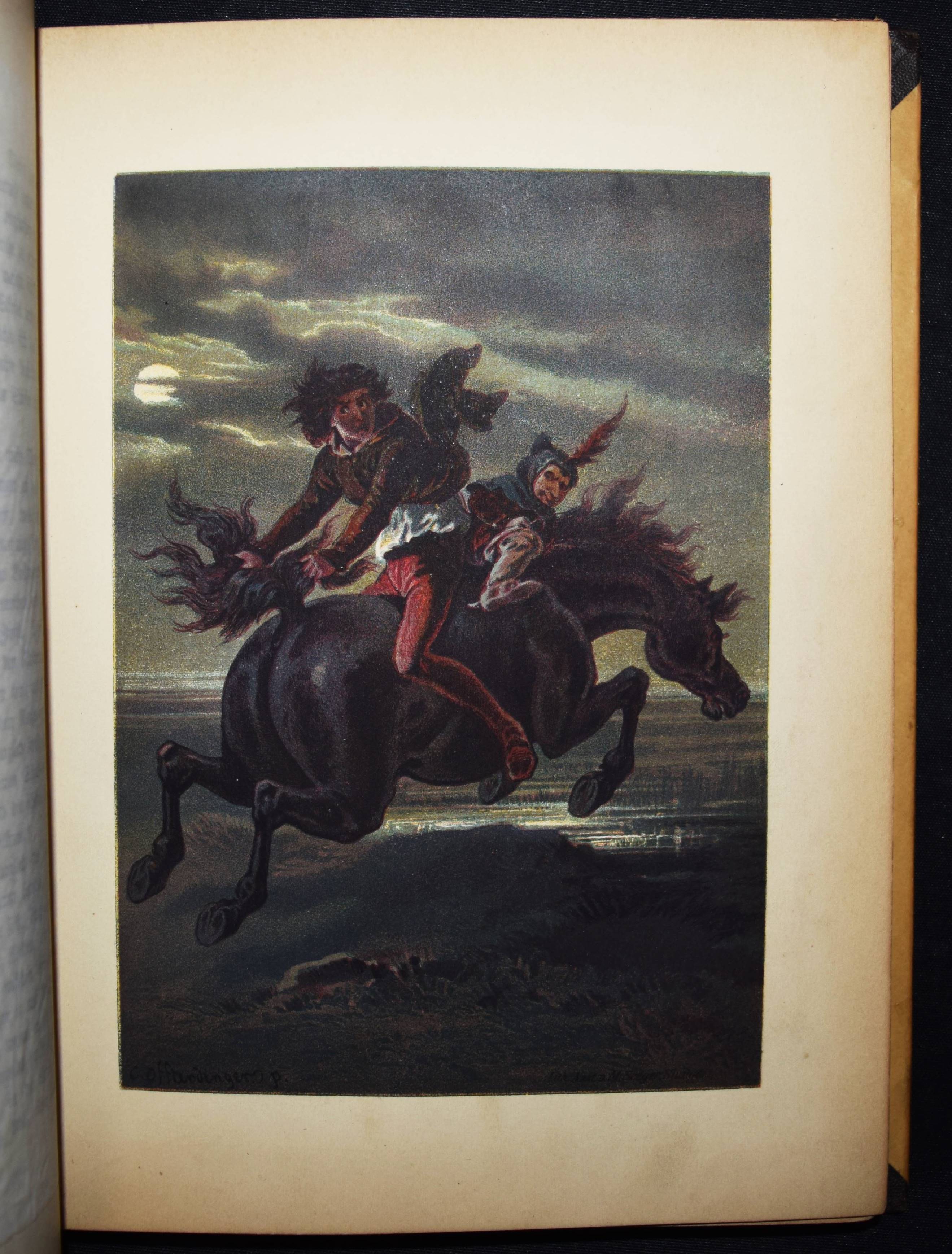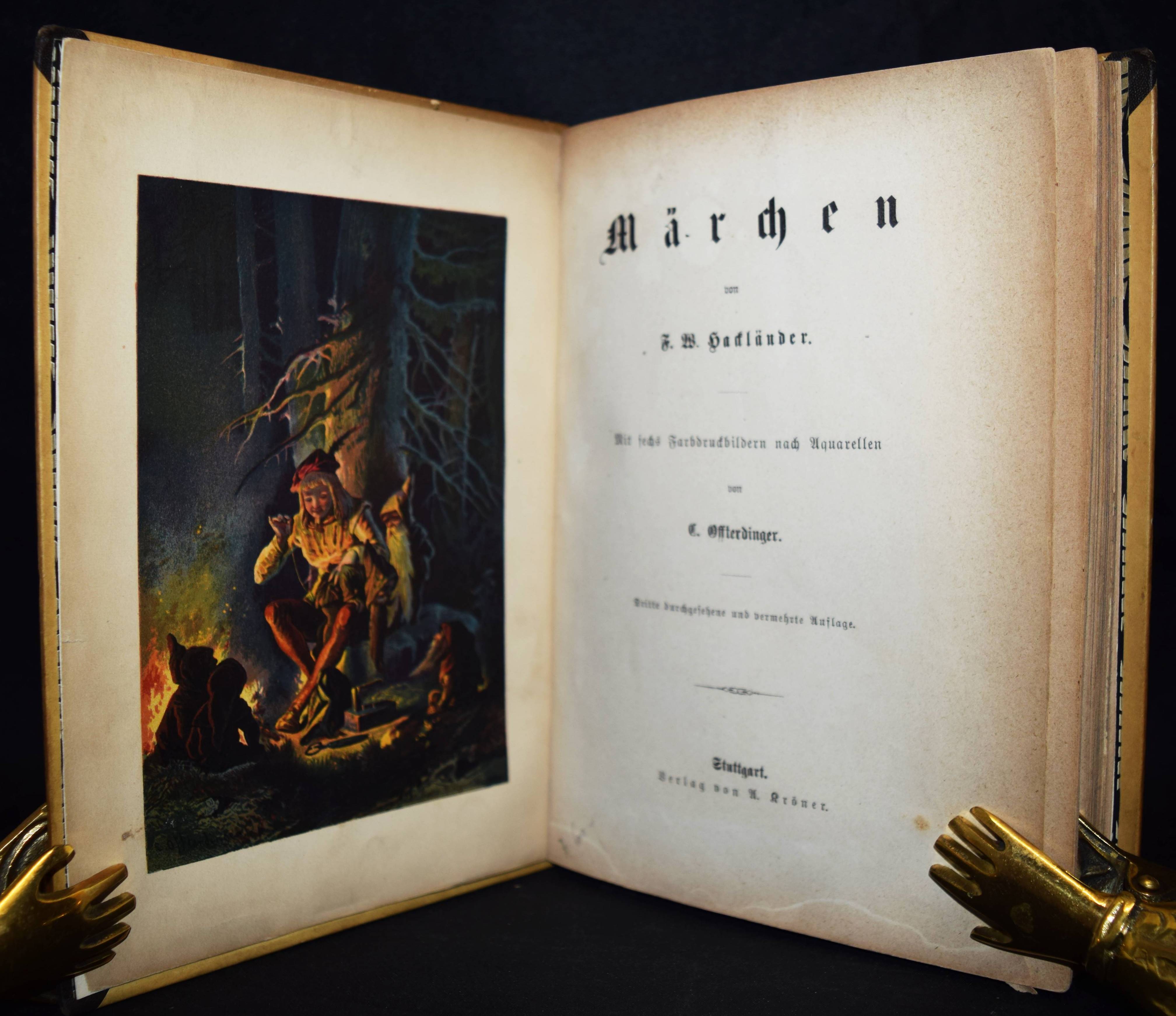 Hackländer, F(riedrich) W(ilhelm) (Ritter v.). Märchen. (Illustrierte Ausgabe für die Jugend). 3. durchgeshene u. verm. Aufl. Stuttgart, A. Kröner o. J. (1880). 8°. [2] Bl., 223, (1) S. mit 6 chromollithogr. Tafeln von C(arl) Ofterdinger. OHln. mit reicher Rückenverg. u. farblithogr. Deckelornamentik. Ries 753, 42. Wegehaupt II, 1157. – Erste Ausgabe mit diesen Illustrationen. – Die erste illustrierte Ausgabe erschien bereits 1843 mit Illustrationen von J. B. Zwecker. – Im Blattrand etwas gebräunt, gutes Exemplar im dekorativen Verlagseinband.