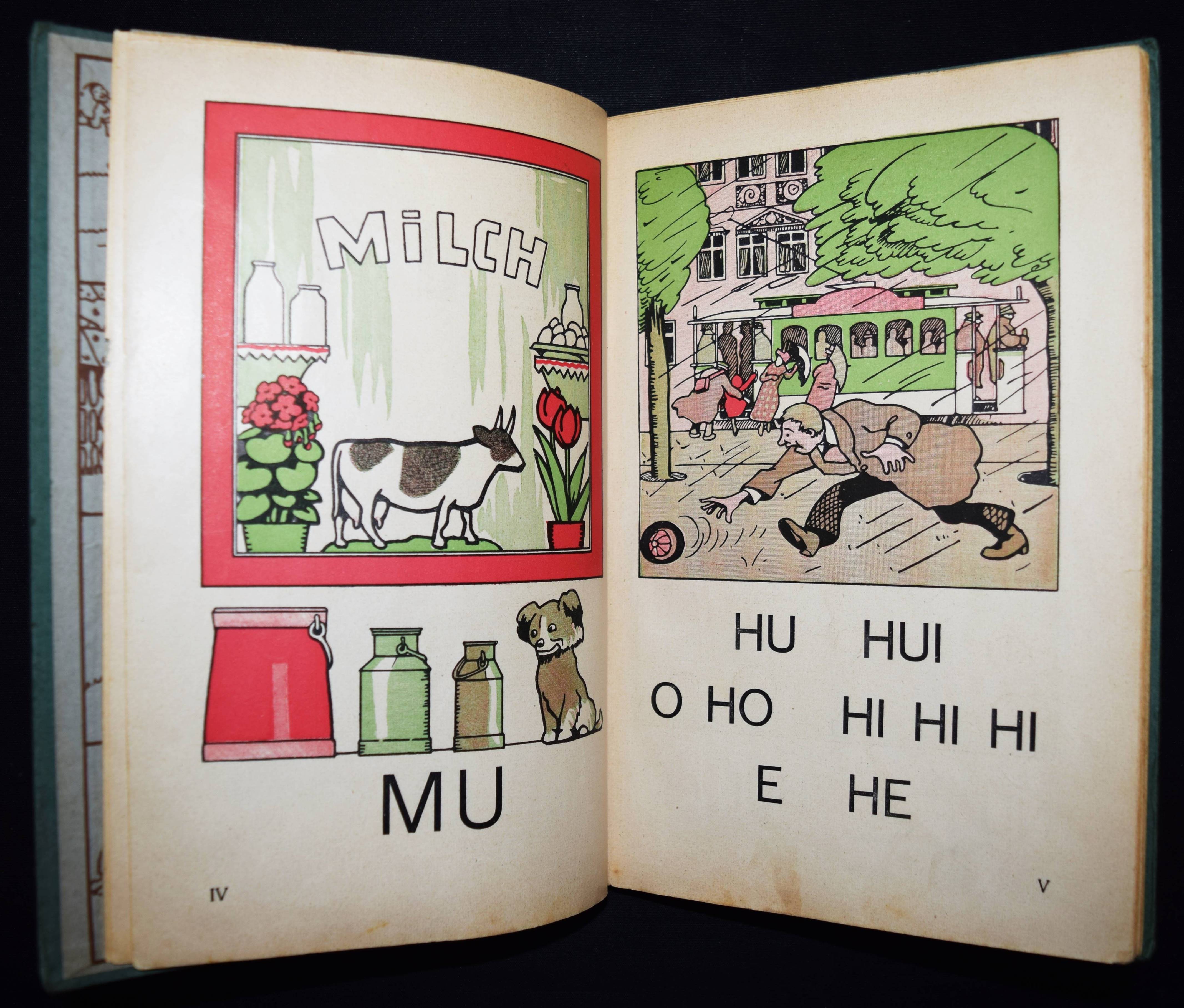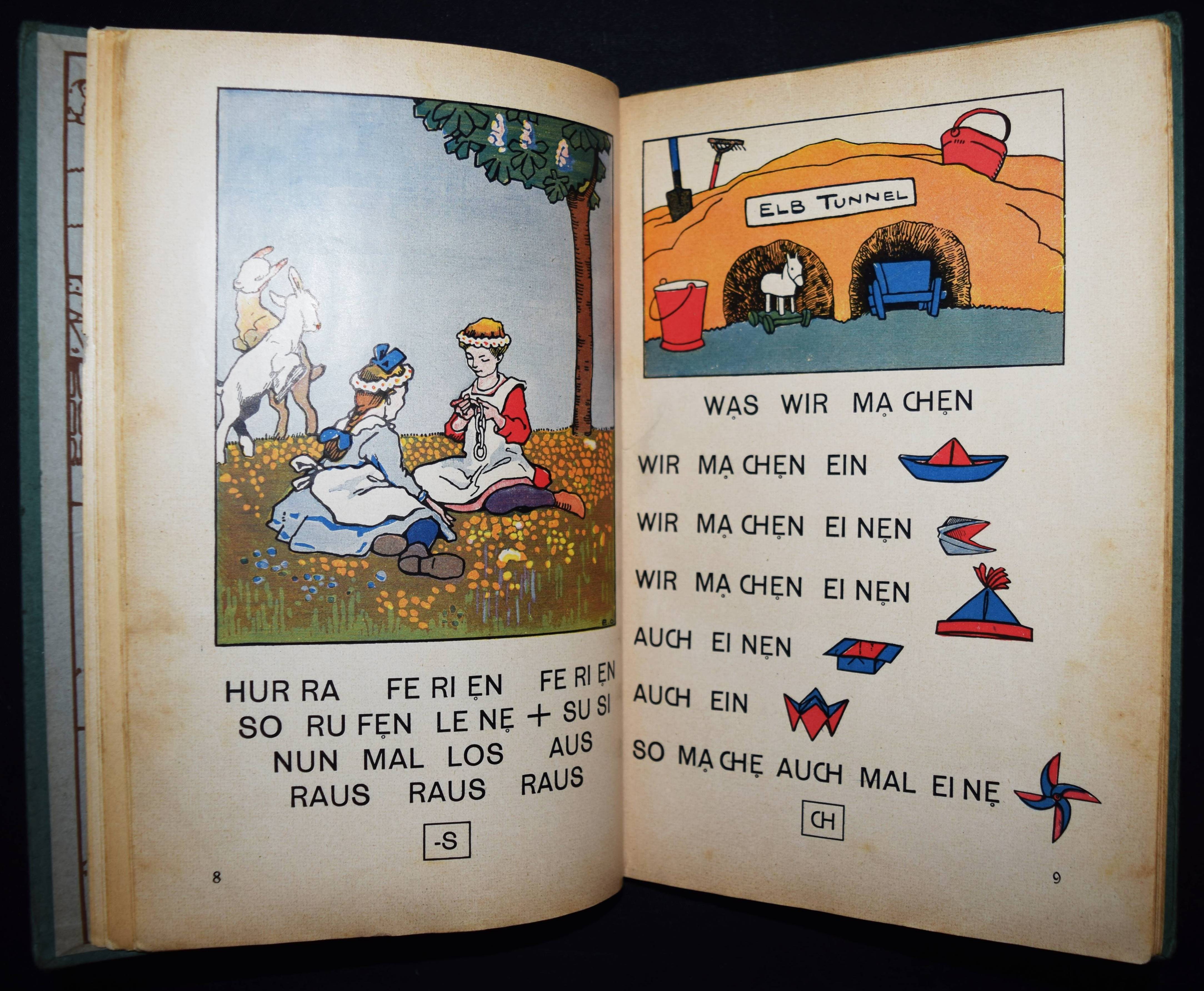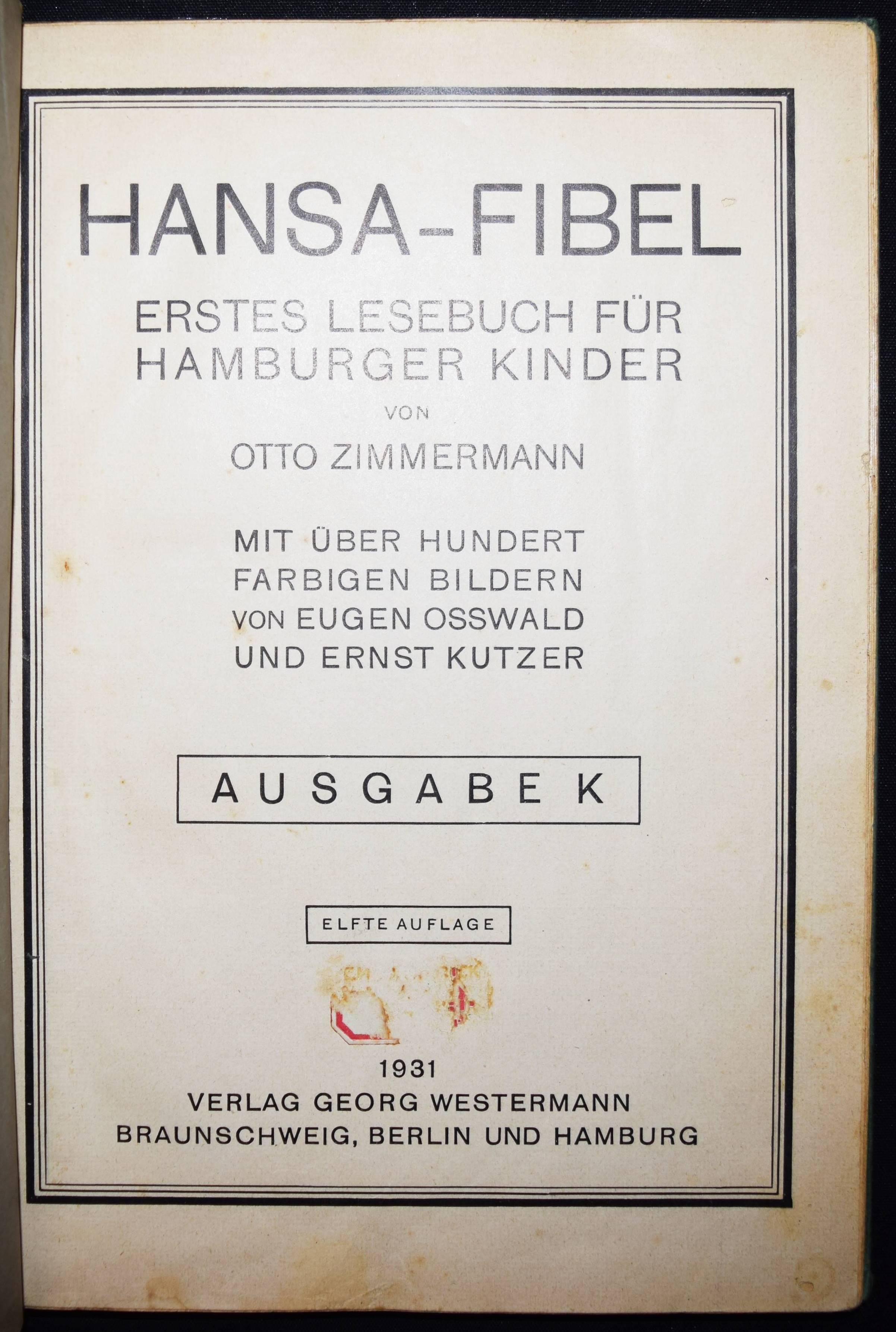 Fibel – Zimmermann, Otto. Hansa-Fibel. Erstes Lesebuch für Hamburger Kinder. Ausgabe K. 11. Aufl. Braunschweig, Berlin u. Hamburg, Westermann 1931. 8°. Titel, VIII, 104 S. mit zahlr. farb. Illustrationen von Eugen Osswald. Illustr. OHln. Vgl. Bilderwelt 1962. May-Schweitzer 103 (mit 3 Abb.). Müller 82. Ries 762, 24. Waldschmidt 90 (mit Abb. S. 51). – „Die „Hansa-Fibel“ ist ein Meilenstein deutscher Fibelgeschichte. Sie ist Vorbild für eine Vielzahl anderer Fibeln geworden. Sie hat Figuren, Typen, Motive und Szenen geschaffen, die immer wieder aufgegriffen und variiert worden sind. Die Fibel spiegelt die aufgeklärte und psychologisch bewußte und geschulte Pädagogik der zwanziger Jahre wieder. Ursprünglich für die Hamburger Schulen konzipiert fand sie in ganz Deutschland Verbreitung und Nachahmung“ (May-Schweitzer). – „Nach Zimmermann soll die Fibel sowohl für den Synthetiker als auch den Analytiker zu gebrauchen sein. Der letzte möge die ersten Seiten überschlagen… Daß die Bilder nicht nur der Lautvermittlung dienen sollen, sondern auch den Kindern Spaß und Freude machen werden, sieht man ihnen an“ (Havekost-Klattenhoff C-22). – Eine Seite mit Tintenkritzelei, wenige kl. Bleistiftanmerungen im Rand, Heftung etwas gelockert, gutes Exemplar der berühmten Fibel.