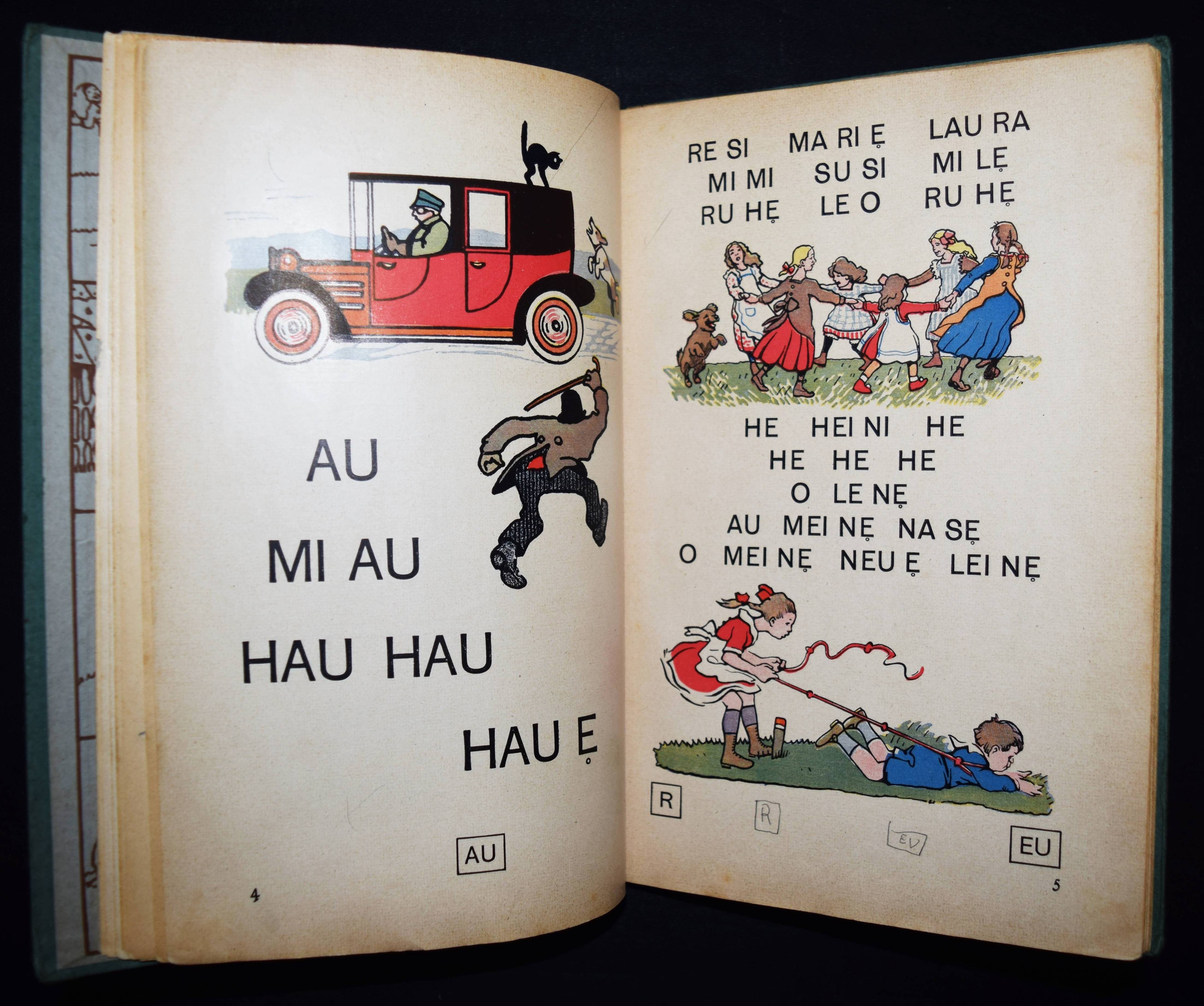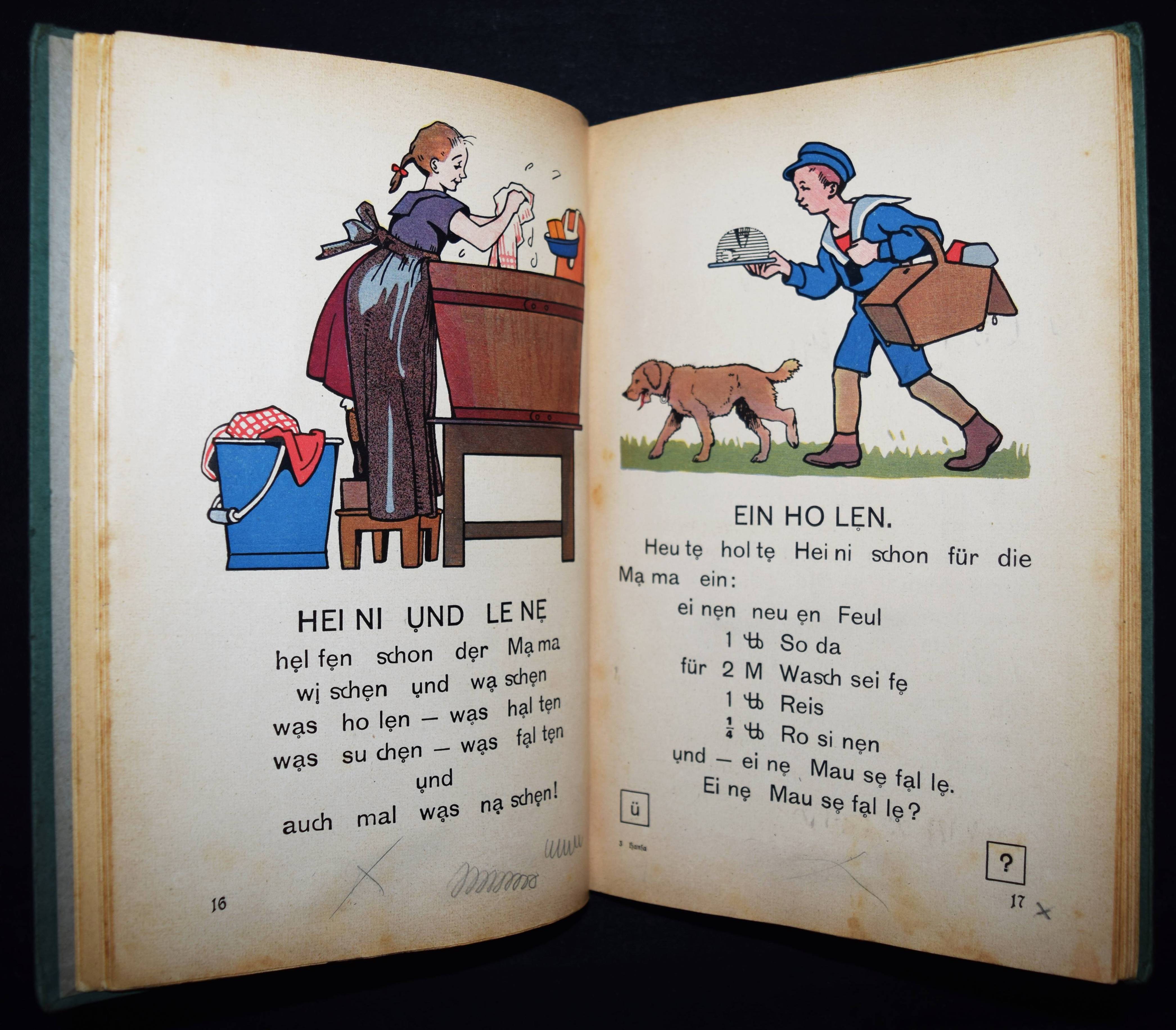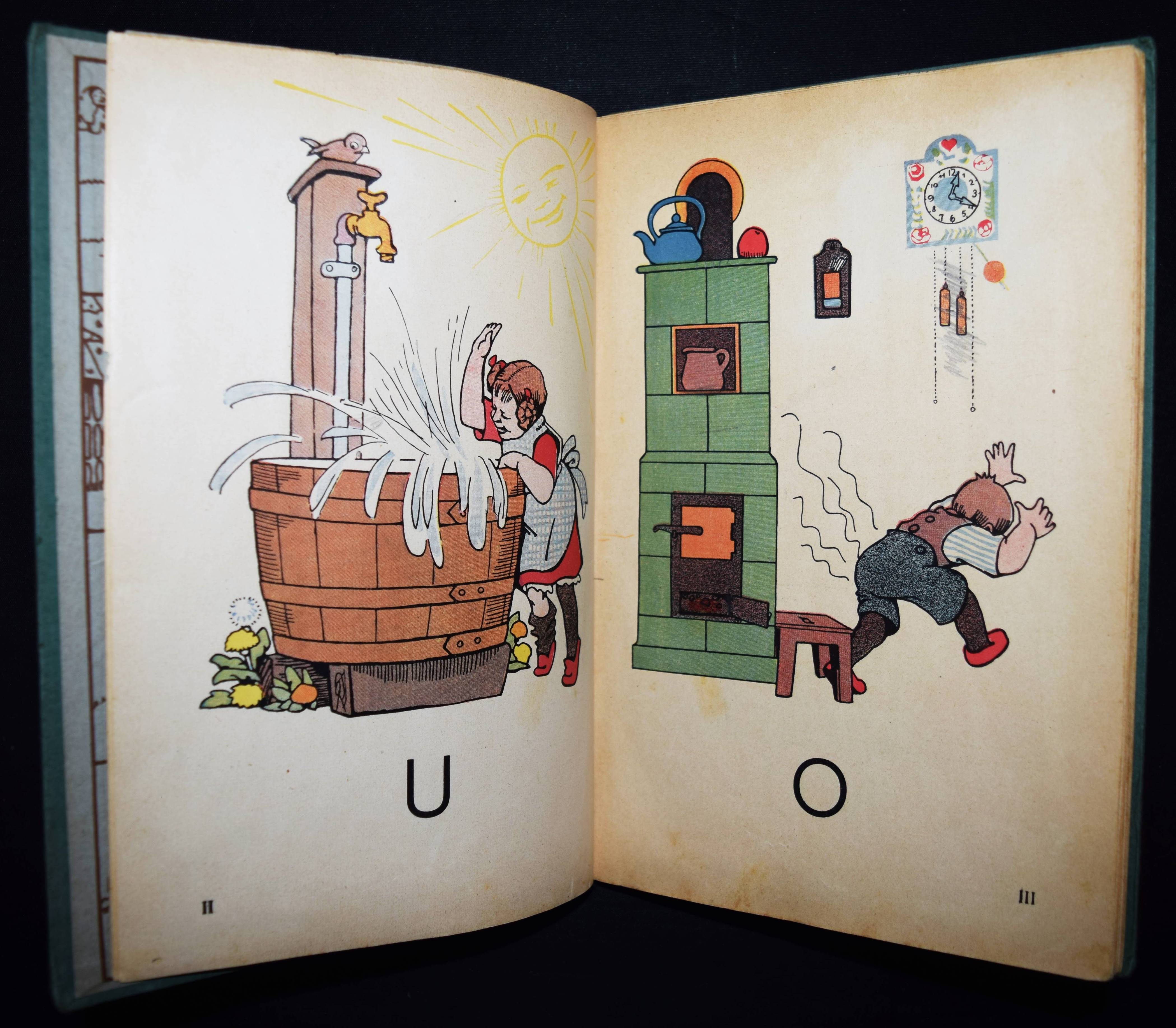 Fibel – Zimmermann, Otto. Hansa-Fibel. Erstes Lesebuch für Hamburger Kinder. Ausgabe K. 11. Aufl. Braunschweig, Berlin u. Hamburg, Westermann 1931. 8°. Titel, VIII, 104 S. mit zahlr. farb. Illustrationen von Eugen Osswald. Illustr. OHln. Vgl. Bilderwelt 1962. May-Schweitzer 103 (mit 3 Abb.). Müller 82. Ries 762, 24. Waldschmidt 90 (mit Abb. S. 51). – „Die „Hansa-Fibel“ ist ein Meilenstein deutscher Fibelgeschichte. Sie ist Vorbild für eine Vielzahl anderer Fibeln geworden. Sie hat Figuren, Typen, Motive und Szenen geschaffen, die immer wieder aufgegriffen und variiert worden sind. Die Fibel spiegelt die aufgeklärte und psychologisch bewußte und geschulte Pädagogik der zwanziger Jahre wieder. Ursprünglich für die Hamburger Schulen konzipiert fand sie in ganz Deutschland Verbreitung und Nachahmung“ (May-Schweitzer). – „Nach Zimmermann soll die Fibel sowohl für den Synthetiker als auch den Analytiker zu gebrauchen sein. Der letzte möge die ersten Seiten überschlagen… Daß die Bilder nicht nur der Lautvermittlung dienen sollen, sondern auch den Kindern Spaß und Freude machen werden, sieht man ihnen an“ (Havekost-Klattenhoff C-22). – Eine Seite mit Tintenkritzelei, wenige kl. Bleistiftanmerungen im Rand, Heftung etwas gelockert, gutes Exemplar der berühmten Fibel.