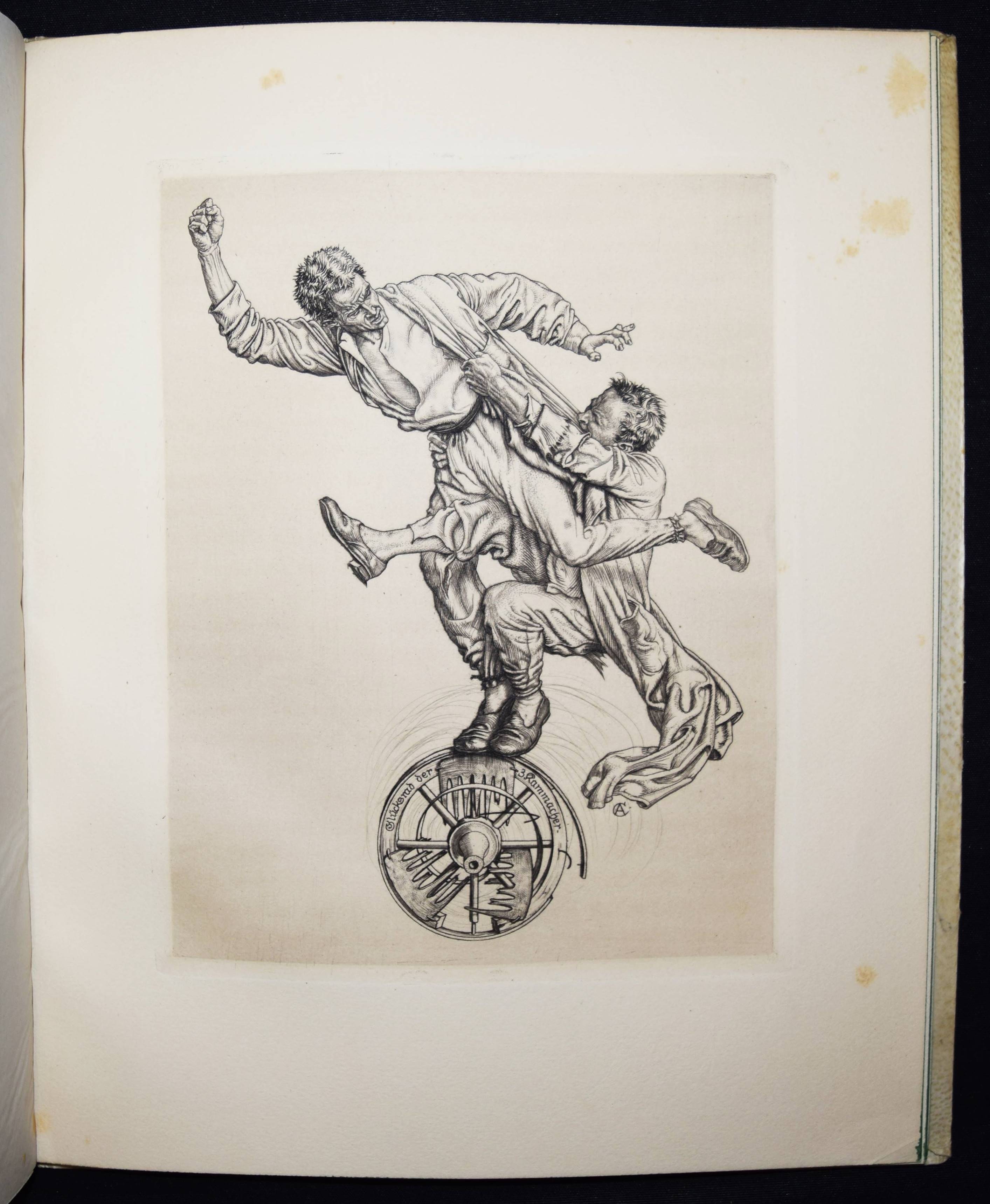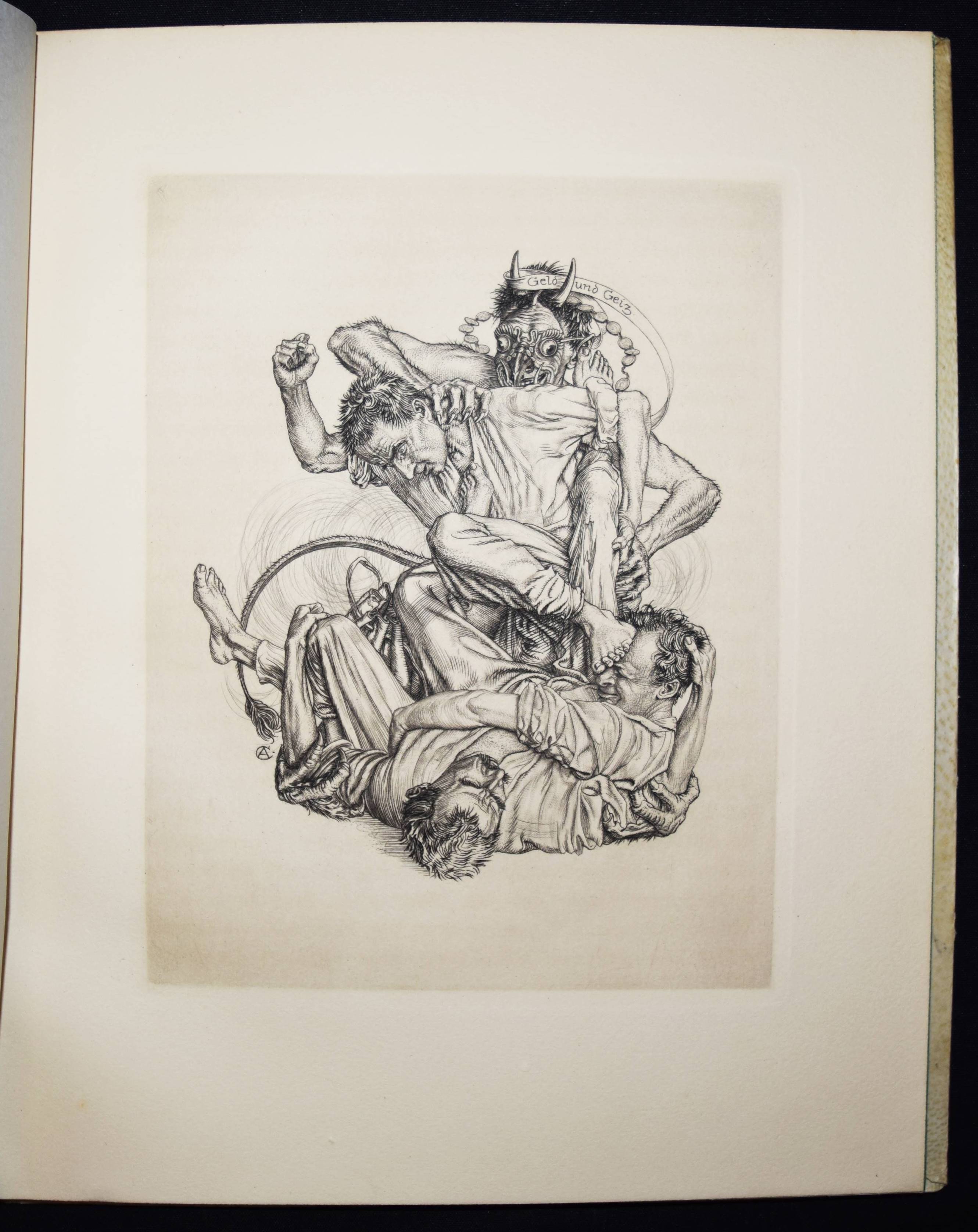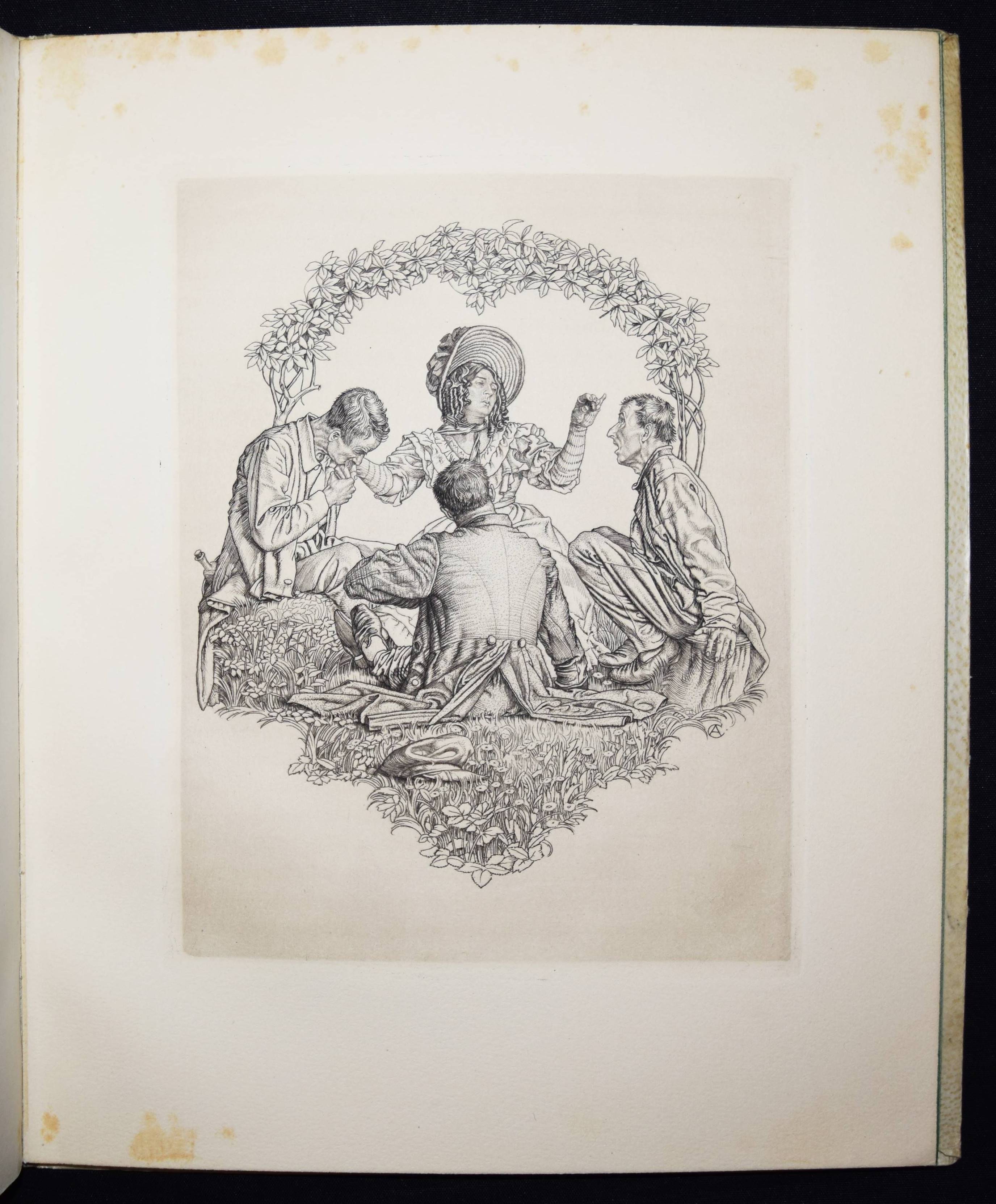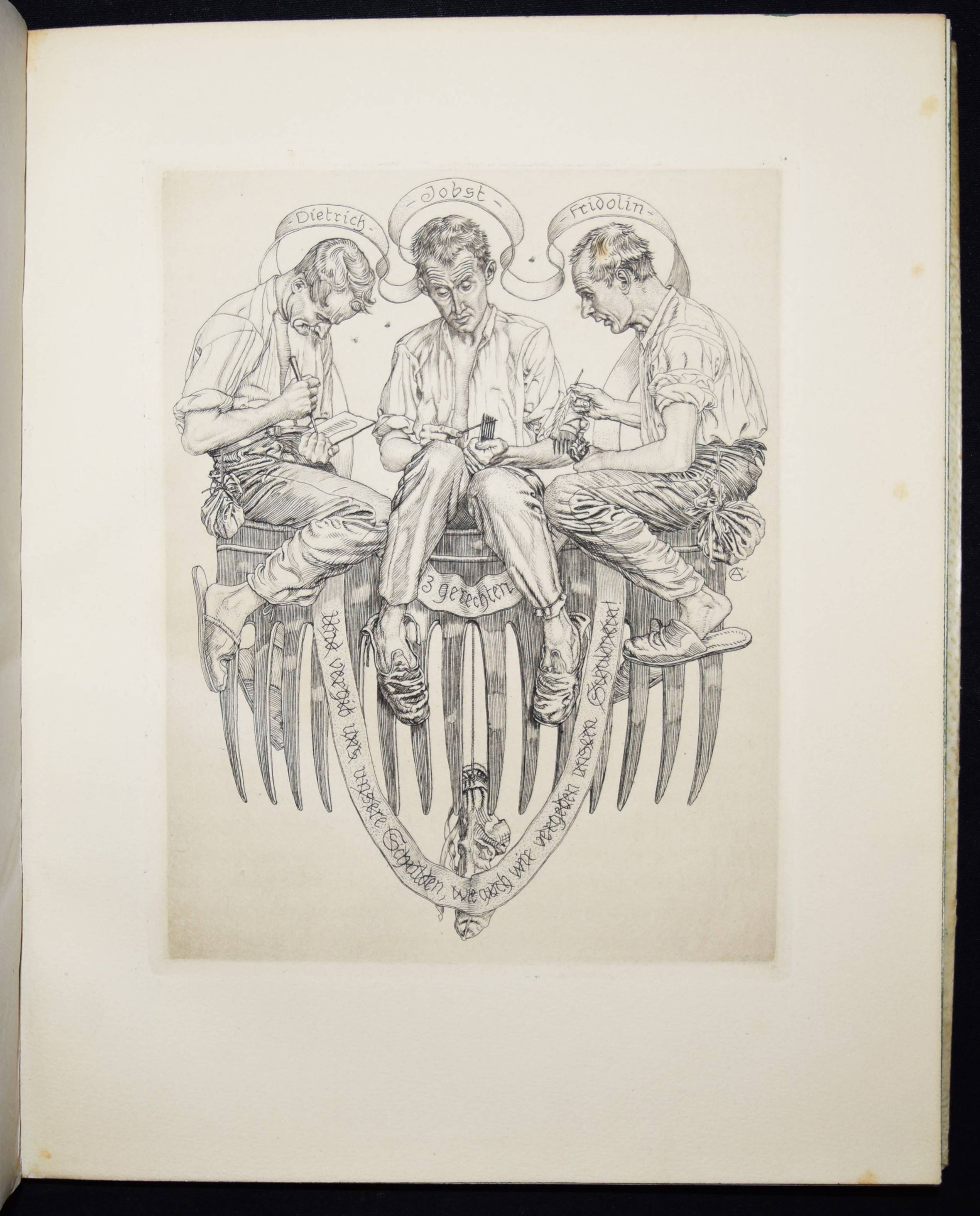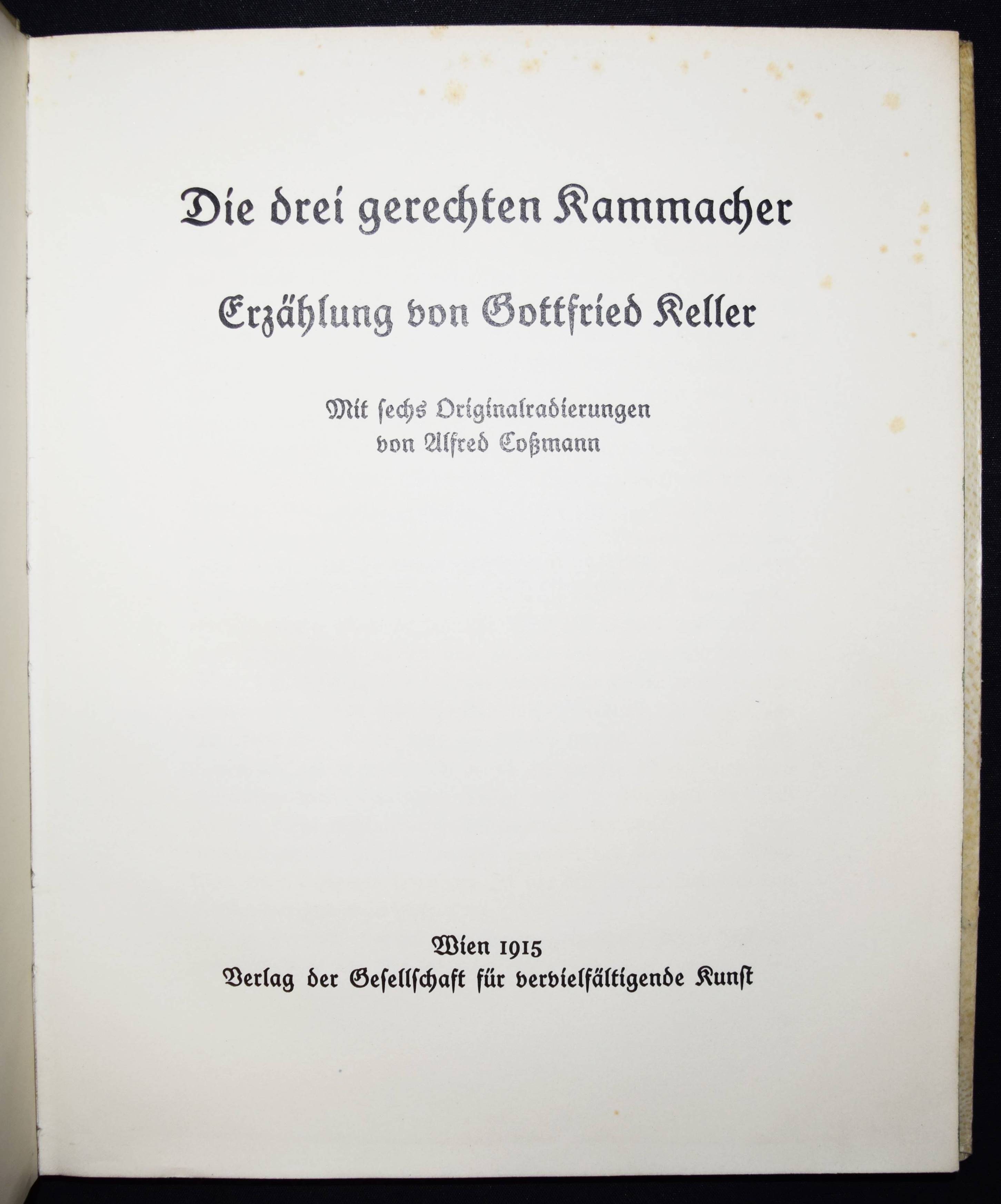 Keller, Gottfried. Die drei gerechten Kammacher. Erzählung. Mit sechs Originalradierungen von Alfred Coßmann. Wien, Verlag der Gesellschaft für vervielfältigende Kunst 1915. 4°. 54 S. mit 6 Orig.-Radierungen. Prgt. d. Zt. mit Deckelillustration u. kalligr. Deckeltitel (Einband: Grieb u. Leuenberger, Burgdorf). Erste Ausgabe mit diesen Illustrationen. „Druck der k. k. Hof- und Staatsdruckerei in Wien“. – Schöner Handeinband der Schweizer Buchbinderei. – Vereinzelt geringf. braunfleckig, schönes Exemplar.