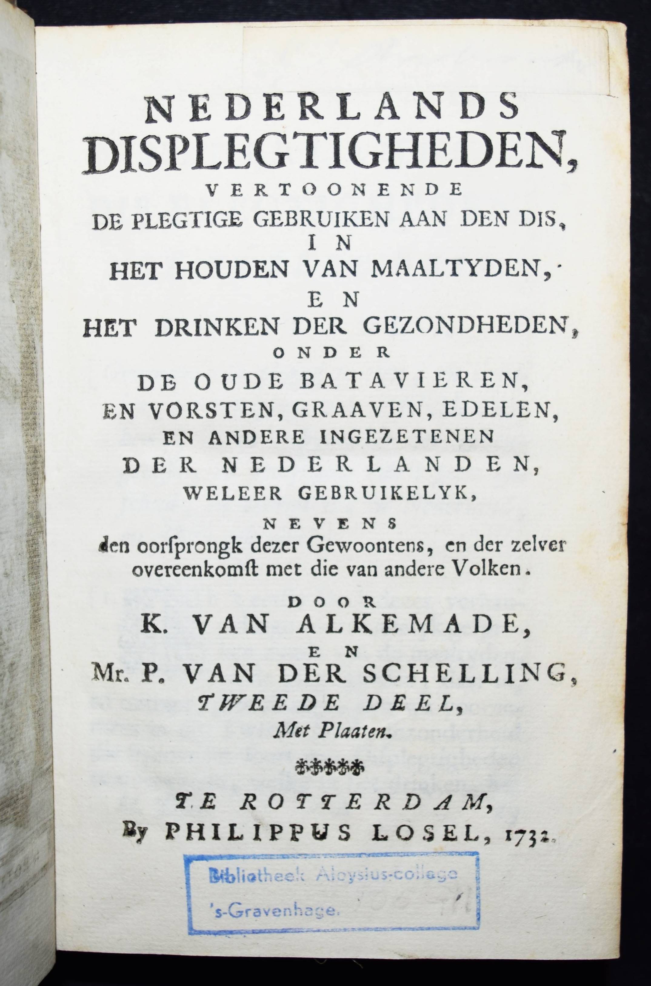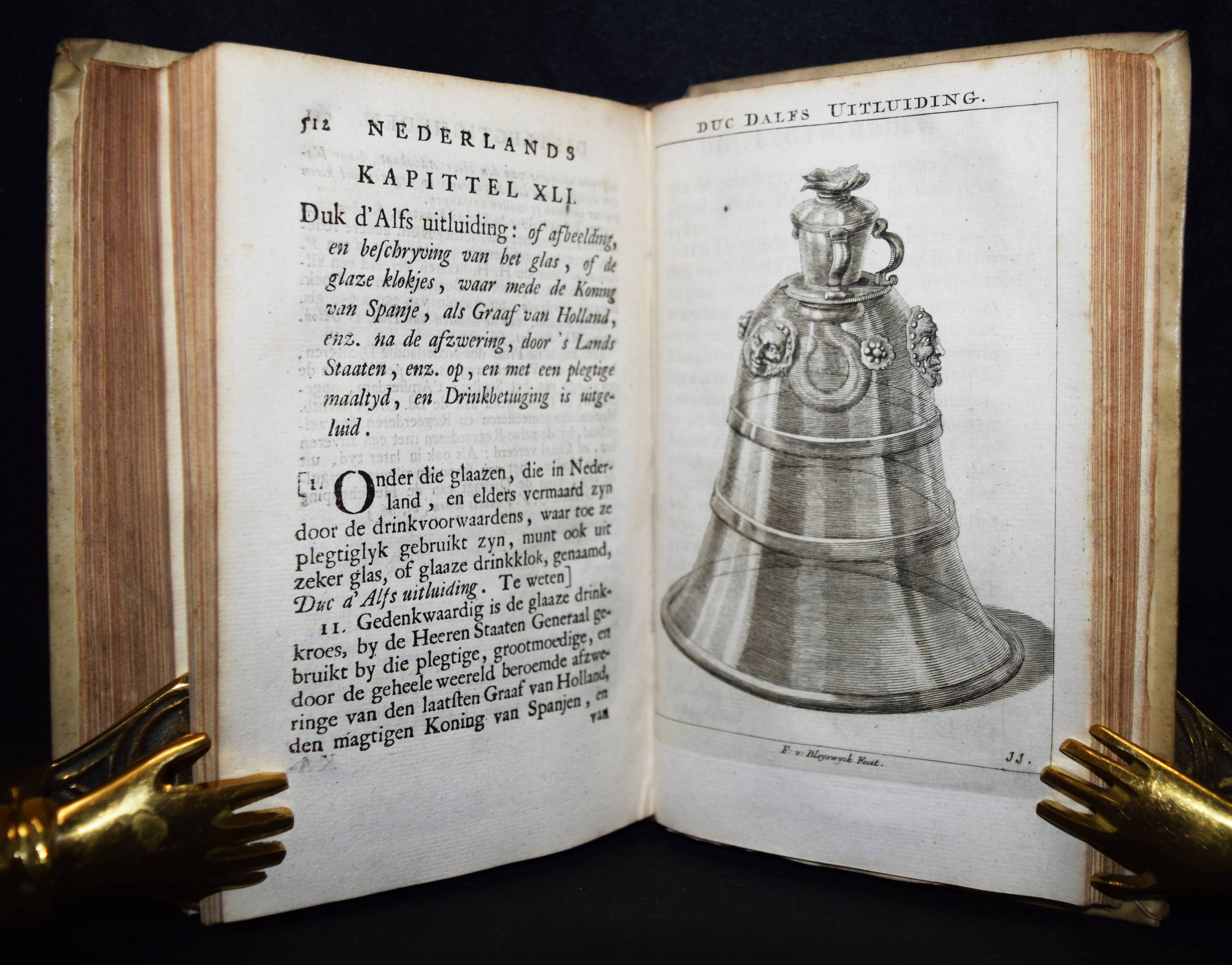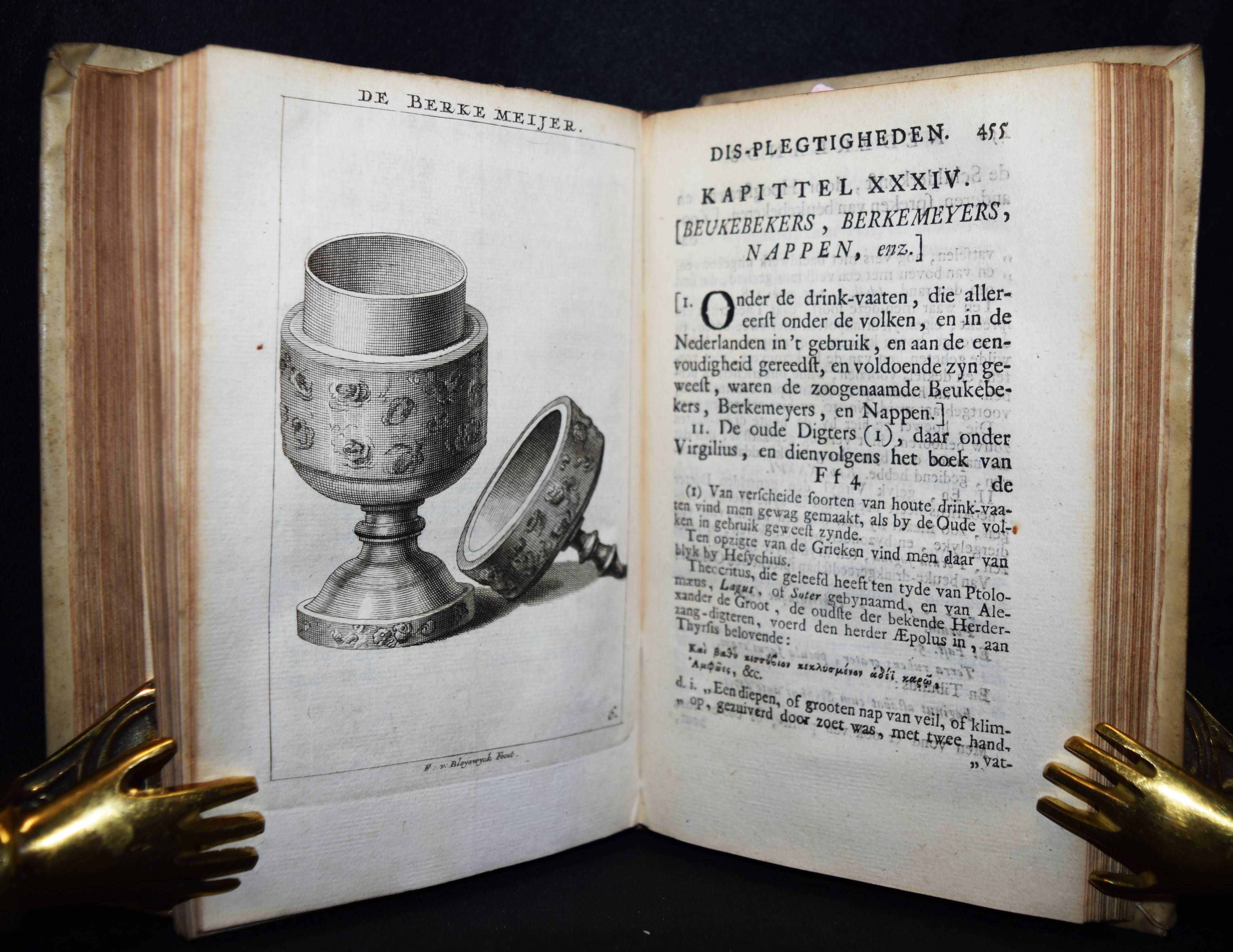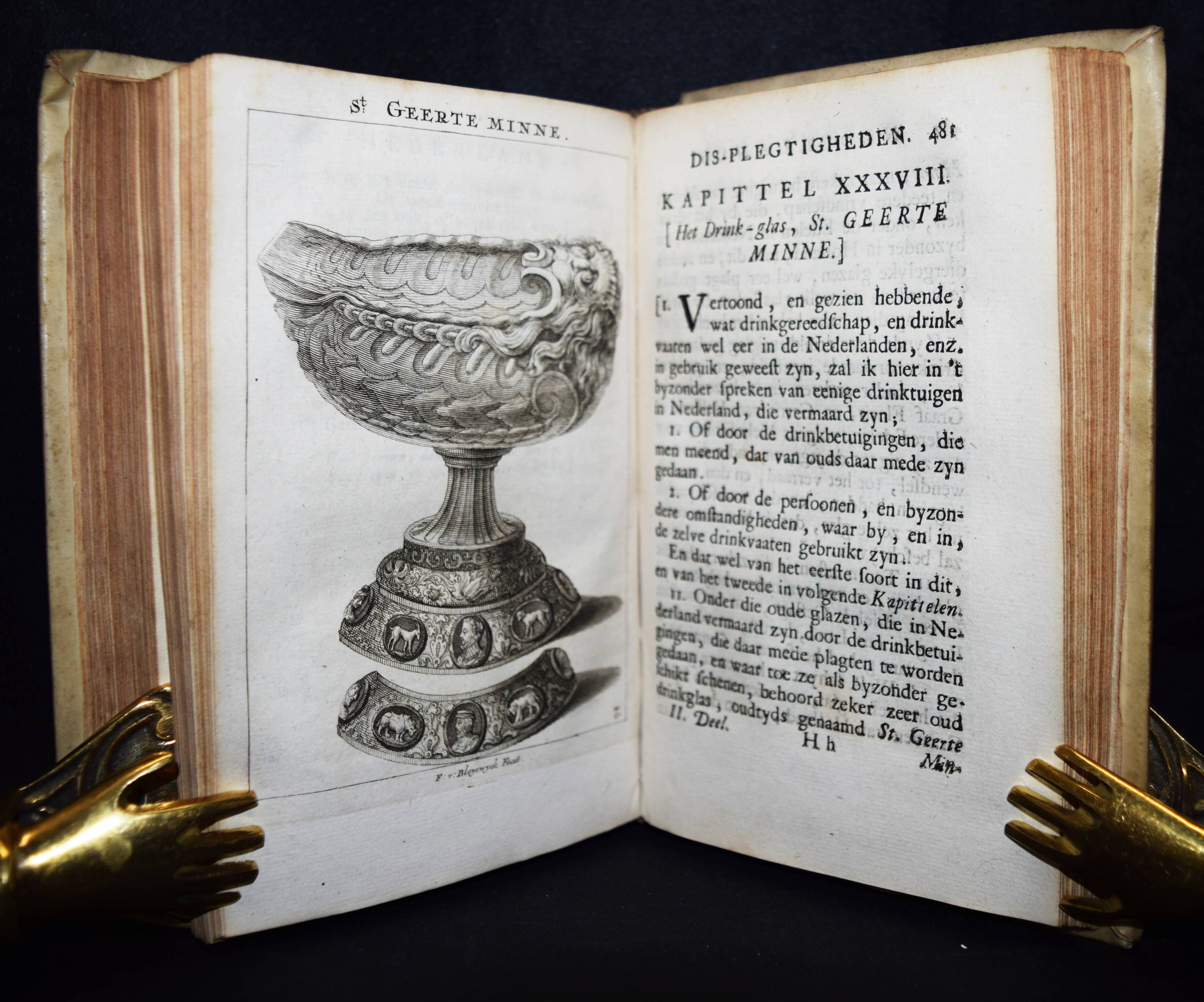 Alkemade, K(ornelis) van u. P(ieter) van der Schelling Nederlands displegtigheden. Vertoonende de plegtige gebruiken aan den dis, in het houden van maaltyden, en het drinken der gezondheden, onder de oude Batavieren, en vorsten, graaven, edelen, en andere ingezetenen der Nederlanden, weleer gebruikelyk, nevens den oorsprongk dezer gewoontens, en der zelver overeenkomst met die van andere volken. Door K. van Alkemade, en Mr. P. van der Schelling. 3 Bände. Rotterdam, Philippus Losel 1732-1735. 8°. [68] Bl., 562 S.; Titel, 557, (61) S.; [46] Bl., 612 S., [27] Bl. mit 2 gestoch. Frontisp. u. 15 (5 gefalt.) Kupfertafeln von F. v. Bleyswyck. Prgt. d. Zt. mit handschr. Rückentitel. Cagle 1075. Graesse I, 78. Oberlé, Fastes 485. Muller 418. Waller 45. Nicht bei Bitting, Simon u. Vicaire. – Erste Ausgabe. – Wichtiges Werk über die Trinksitten in den Niederlanden. Die schönen Kupfer zeigen Trinkgefässe (Trinkhörner, Krüge etc.). – St.a.T., eine Tafel im äußeren Rand knapp beschnitten (geringer Bildverlust), sonst sehr gutes sauberes Exemplar. – Eerste druk. – Belangrijk werk over drinkgewoonten in Nederland. De prachtige gravures tonen drinkgerei (drinkhoorns, kruiken etc.). – St.a.T., één plaat iets bijgesneden in buitenmarge (klein verlies van afbeelding), verder zeer goed net exemplaar.
