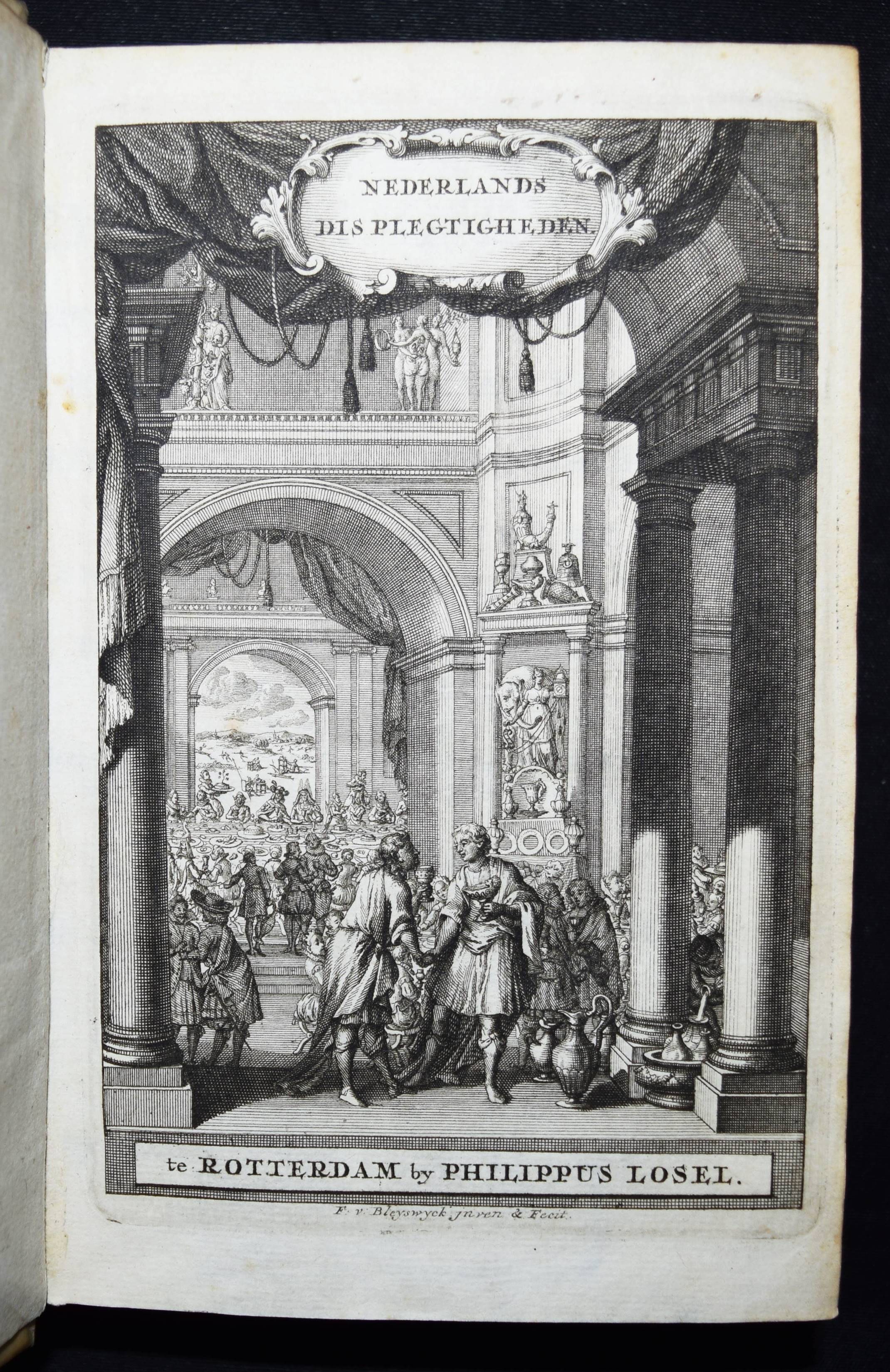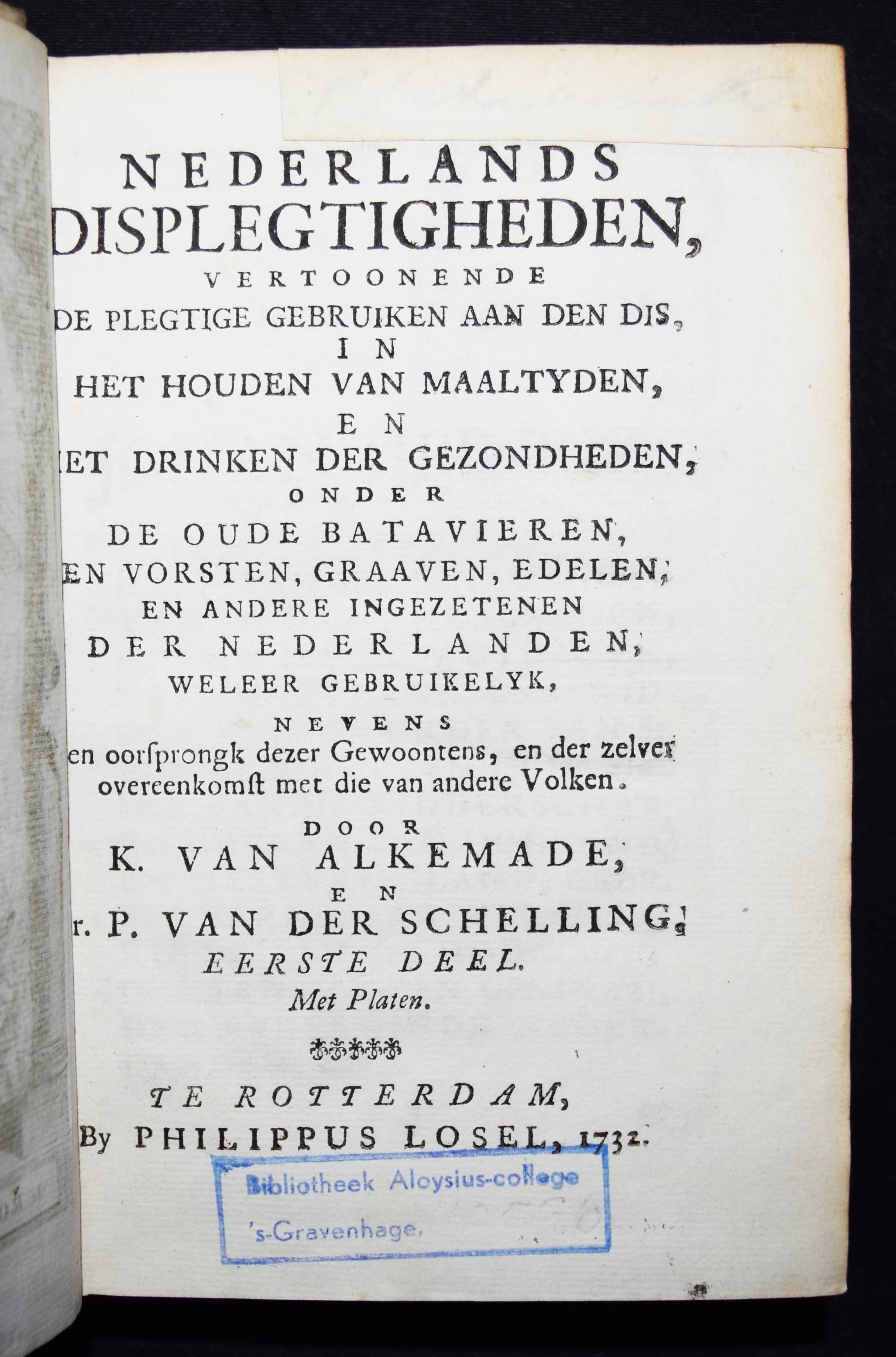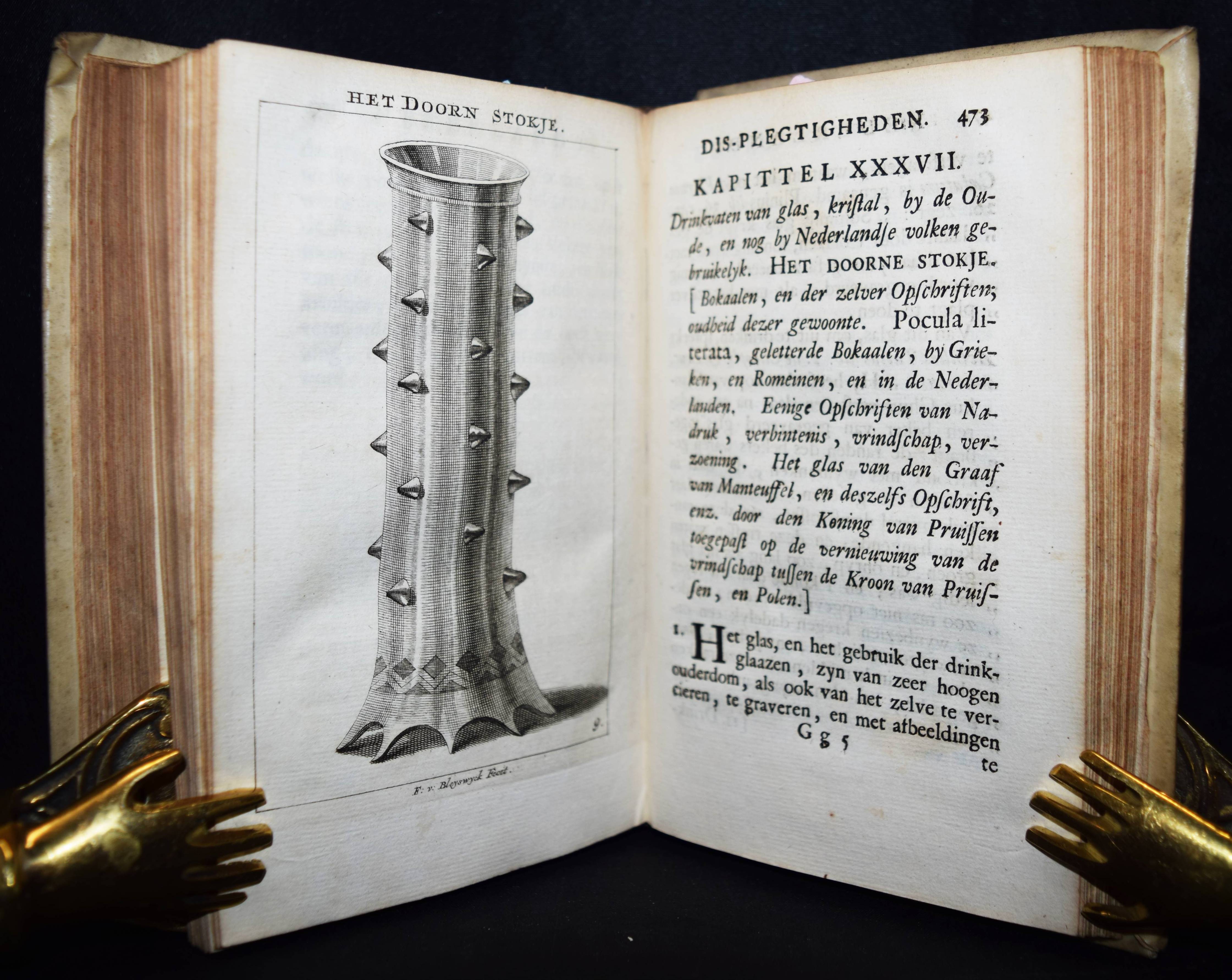Alkemade, K(ornelis) van u. P(ieter) van der Schelling Nederlands displegtigheden. Vertoonende de plegtige gebruiken aan den dis, in het houden van maaltyden, en het drinken der gezondheden, onder de oude Batavieren, en vorsten, graaven, edelen, en andere ingezetenen der Nederlanden, weleer gebruikelyk, nevens den oorsprongk dezer gewoontens, en der zelver overeenkomst met die van andere volken. Door K. van Alkemade, en Mr. P. van der Schelling. 3 Bände. Rotterdam, Philippus Losel 1732-1735. 8°. [68] Bl., 562 S.; Titel, 557, (61) S.; [46] Bl., 612 S., [27] Bl. mit 2 gestoch. Frontisp. u. 15 (5 gefalt.) Kupfertafeln von F. v. Bleyswyck. Prgt. d. Zt. mit handschr. Rückentitel. Cagle 1075. Graesse I, 78. Oberlé, Fastes 485. Muller 418. Waller 45. Nicht bei Bitting, Simon u. Vicaire. – Erste Ausgabe. – Wichtiges Werk über die Trinksitten in den Niederlanden. Die schönen Kupfer zeigen Trinkgefässe (Trinkhörner, Krüge etc.). – St.a.T., eine Tafel im äußeren Rand knapp beschnitten (geringer Bildverlust), sonst sehr gutes sauberes Exemplar. – Eerste druk. – Belangrijk werk over drinkgewoonten in Nederland. De prachtige gravures tonen drinkgerei (drinkhoorns, kruiken etc.). – St.a.T., één plaat iets bijgesneden in buitenmarge (klein verlies van afbeelding), verder zeer goed net exemplaar.