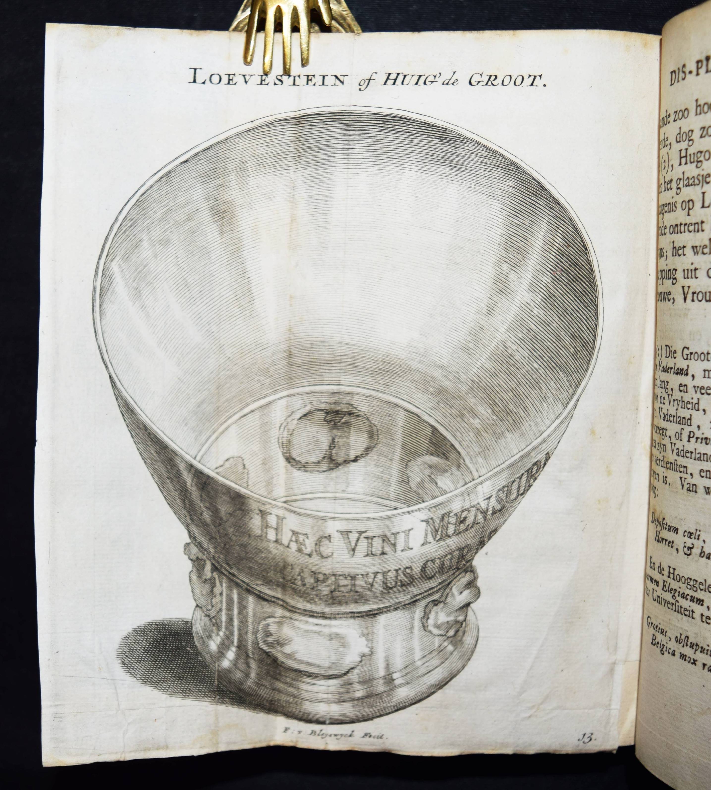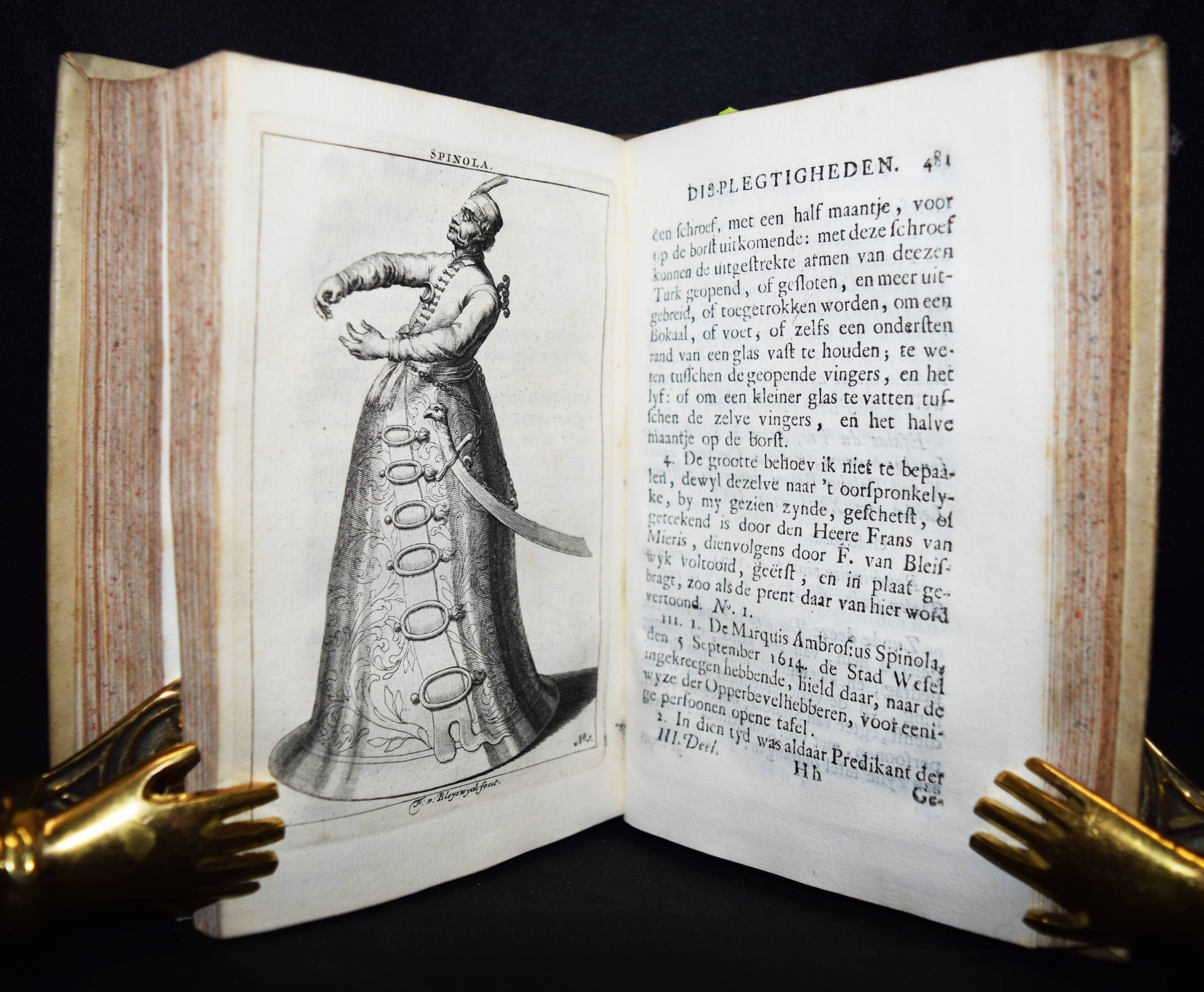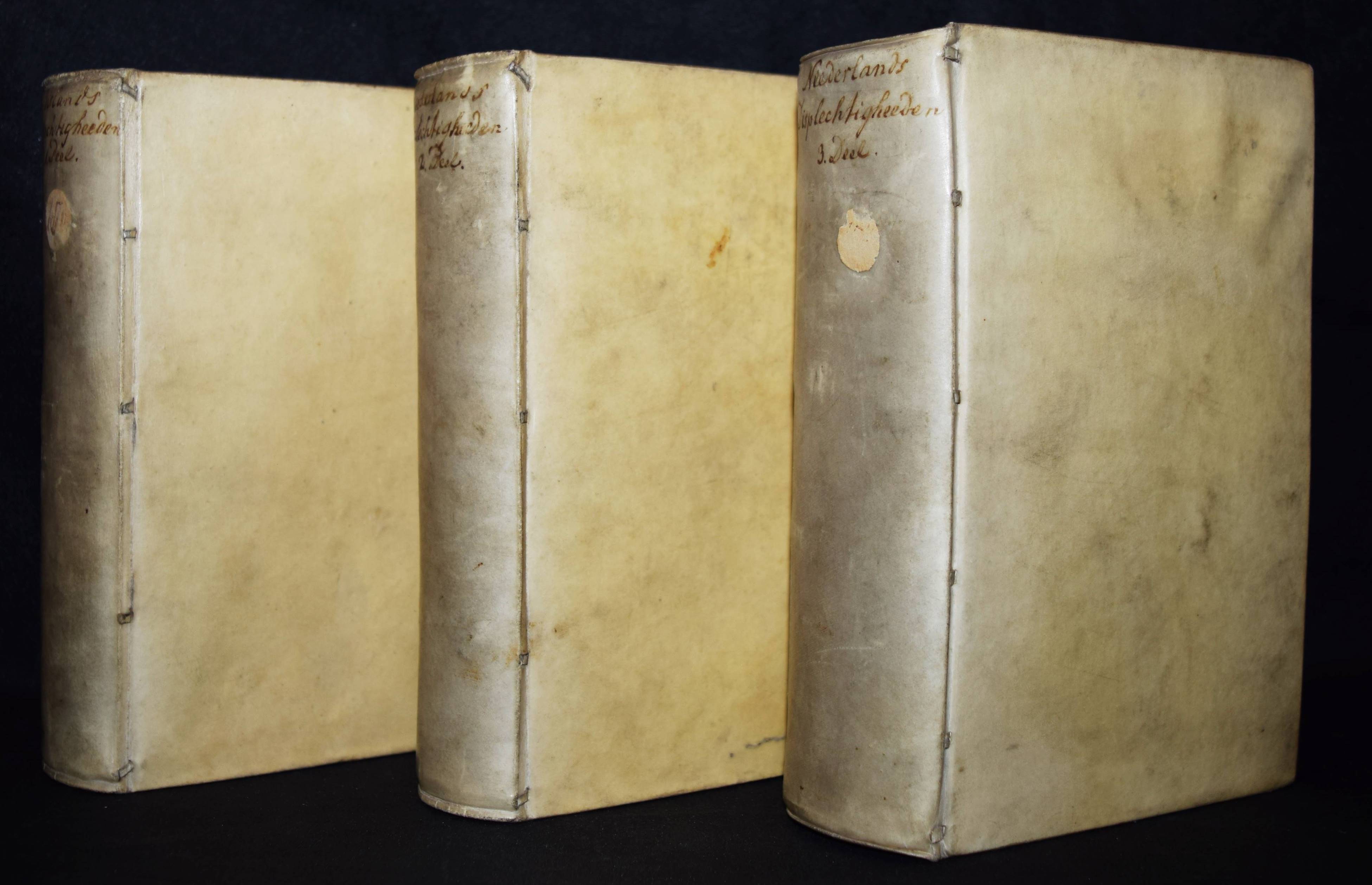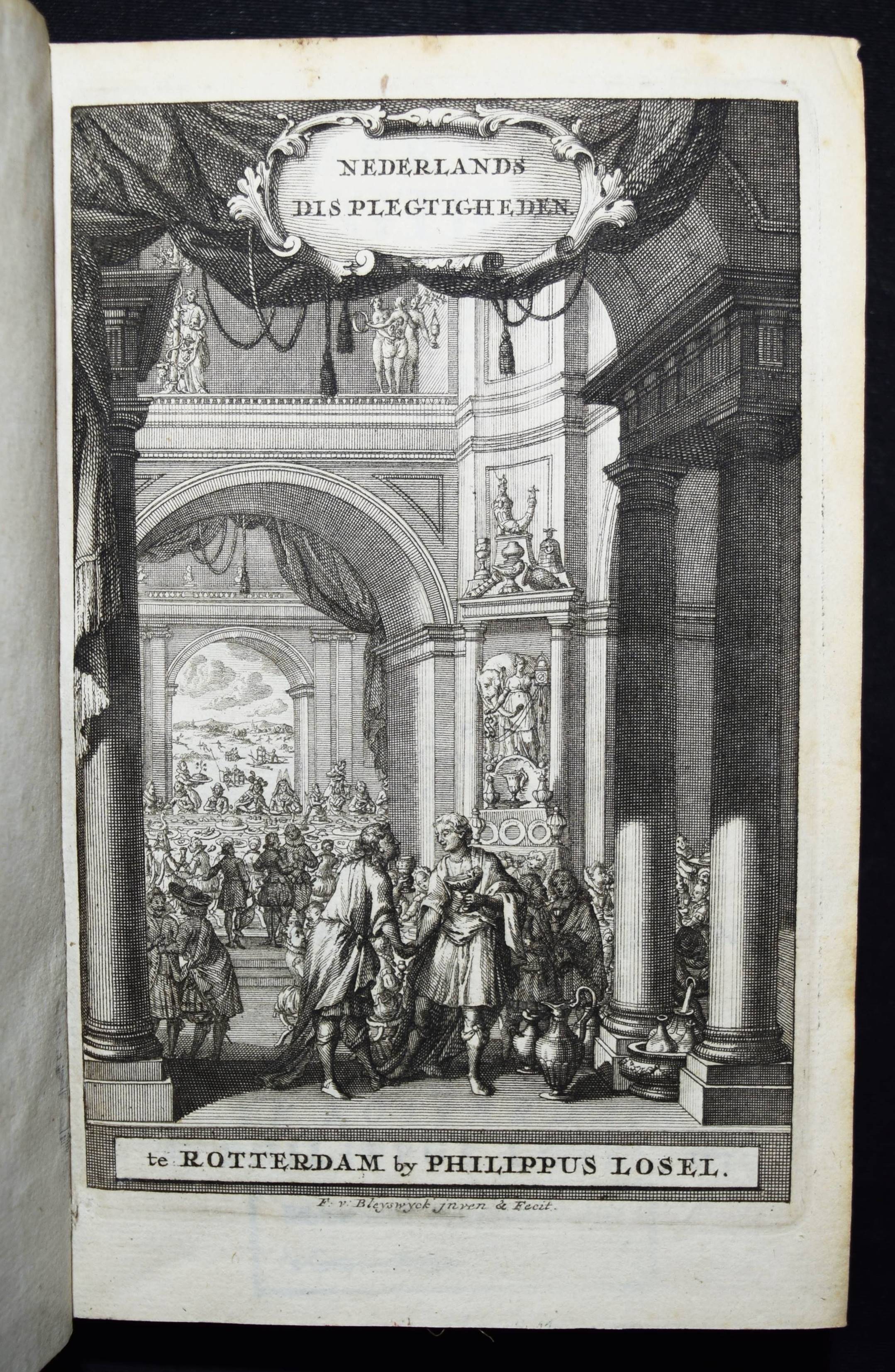 Alkemade, K(ornelis) van u. P(ieter) van der Schelling Nederlands displegtigheden. Vertoonende de plegtige gebruiken aan den dis, in het houden van maaltyden, en het drinken der gezondheden, onder de oude Batavieren, en vorsten, graaven, edelen, en andere ingezetenen der Nederlanden, weleer gebruikelyk, nevens den oorsprongk dezer gewoontens, en der zelver overeenkomst met die van andere volken. Door K. van Alkemade, en Mr. P. van der Schelling. 3 Bände. Rotterdam, Philippus Losel 1732-1735. 8°. [68] Bl., 562 S.; Titel, 557, (61) S.; [46] Bl., 612 S., [27] Bl. mit 2 gestoch. Frontisp. u. 15 (5 gefalt.) Kupfertafeln von F. v. Bleyswyck. Prgt. d. Zt. mit handschr. Rückentitel. Cagle 1075. Graesse I, 78. Oberlé, Fastes 485. Muller 418. Waller 45. Nicht bei Bitting, Simon u. Vicaire. – Erste Ausgabe. – Wichtiges Werk über die Trinksitten in den Niederlanden. Die schönen Kupfer zeigen Trinkgefässe (Trinkhörner, Krüge etc.). – St.a.T., eine Tafel im äußeren Rand knapp beschnitten (geringer Bildverlust), sonst sehr gutes sauberes Exemplar. – Eerste druk. – Belangrijk werk over drinkgewoonten in Nederland. De prachtige gravures tonen drinkgerei (drinkhoorns, kruiken etc.). – St.a.T., één plaat iets bijgesneden in buitenmarge (klein verlies van afbeelding), verder zeer goed net exemplaar.