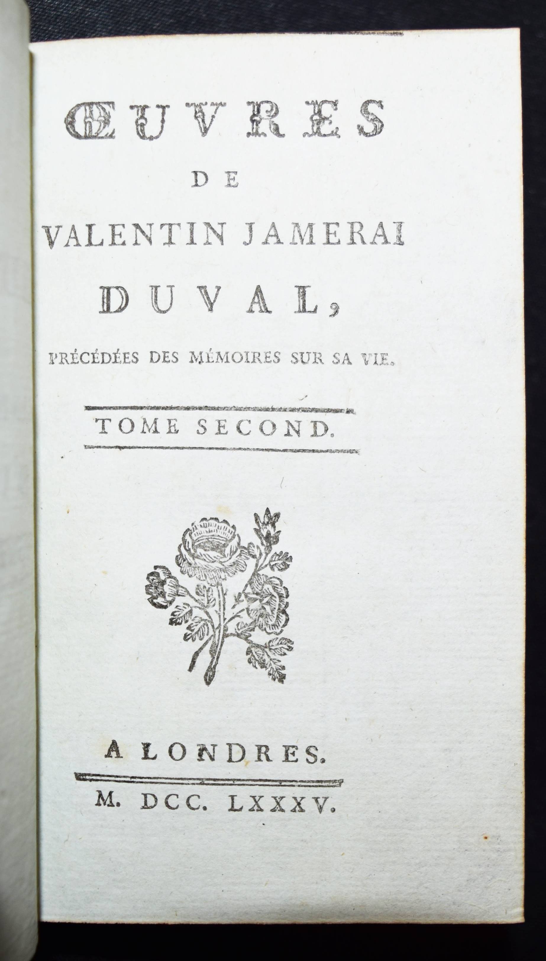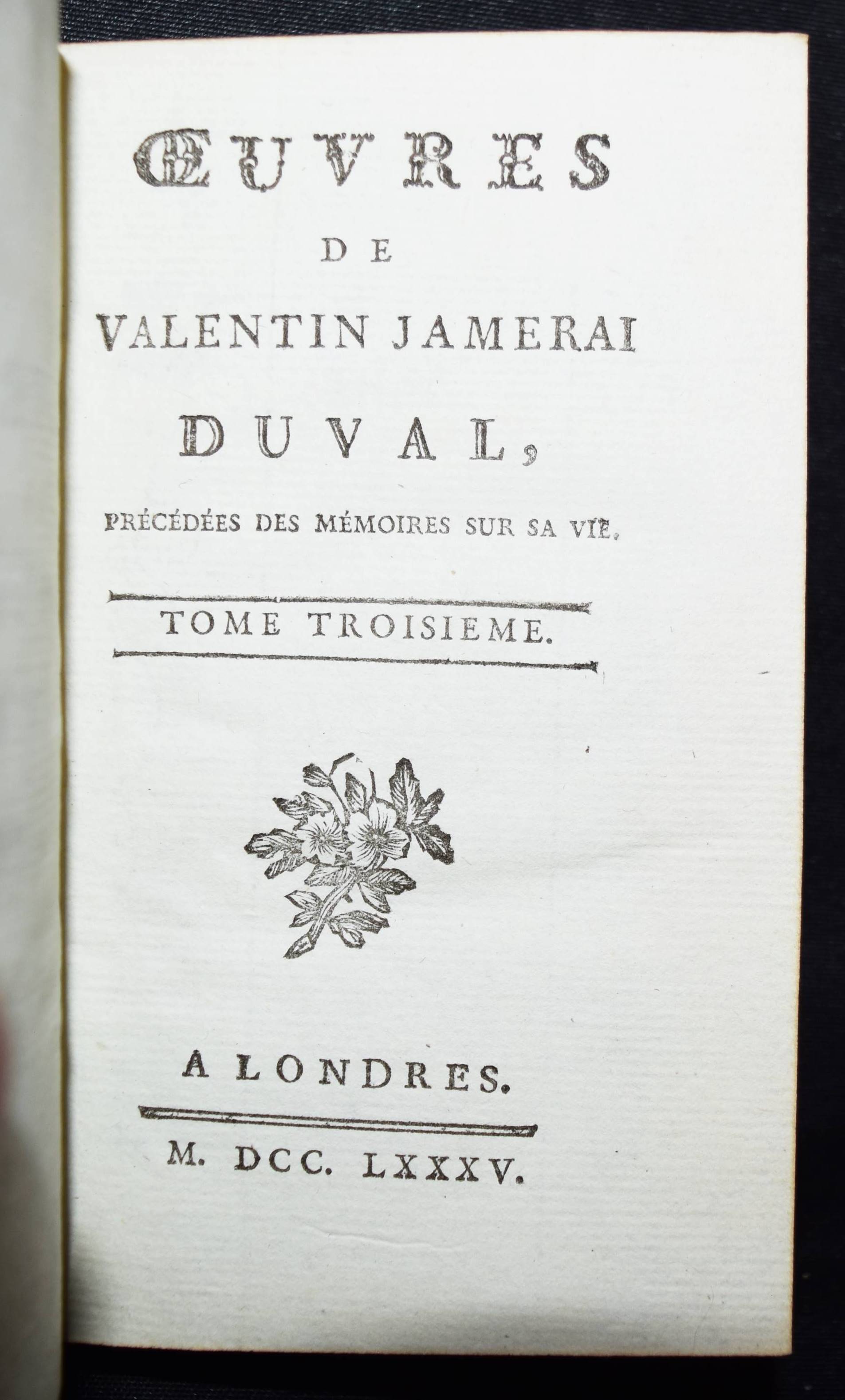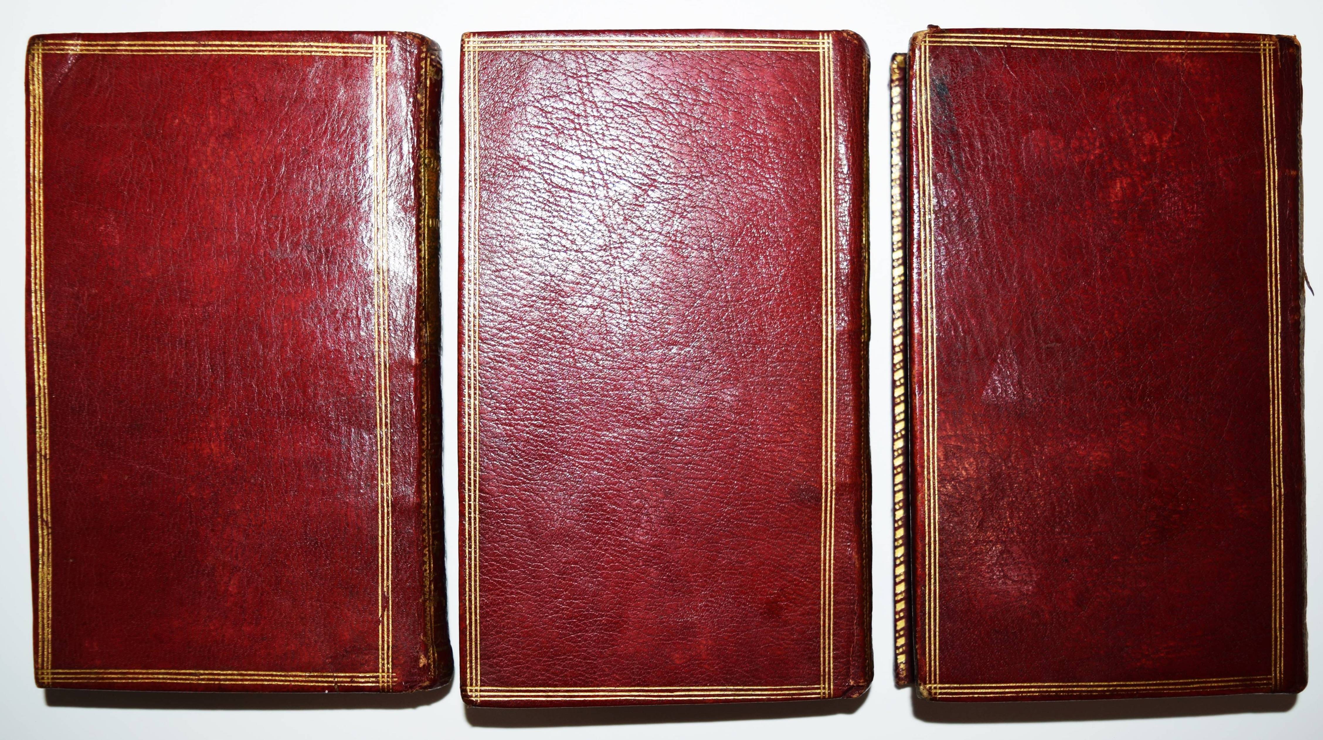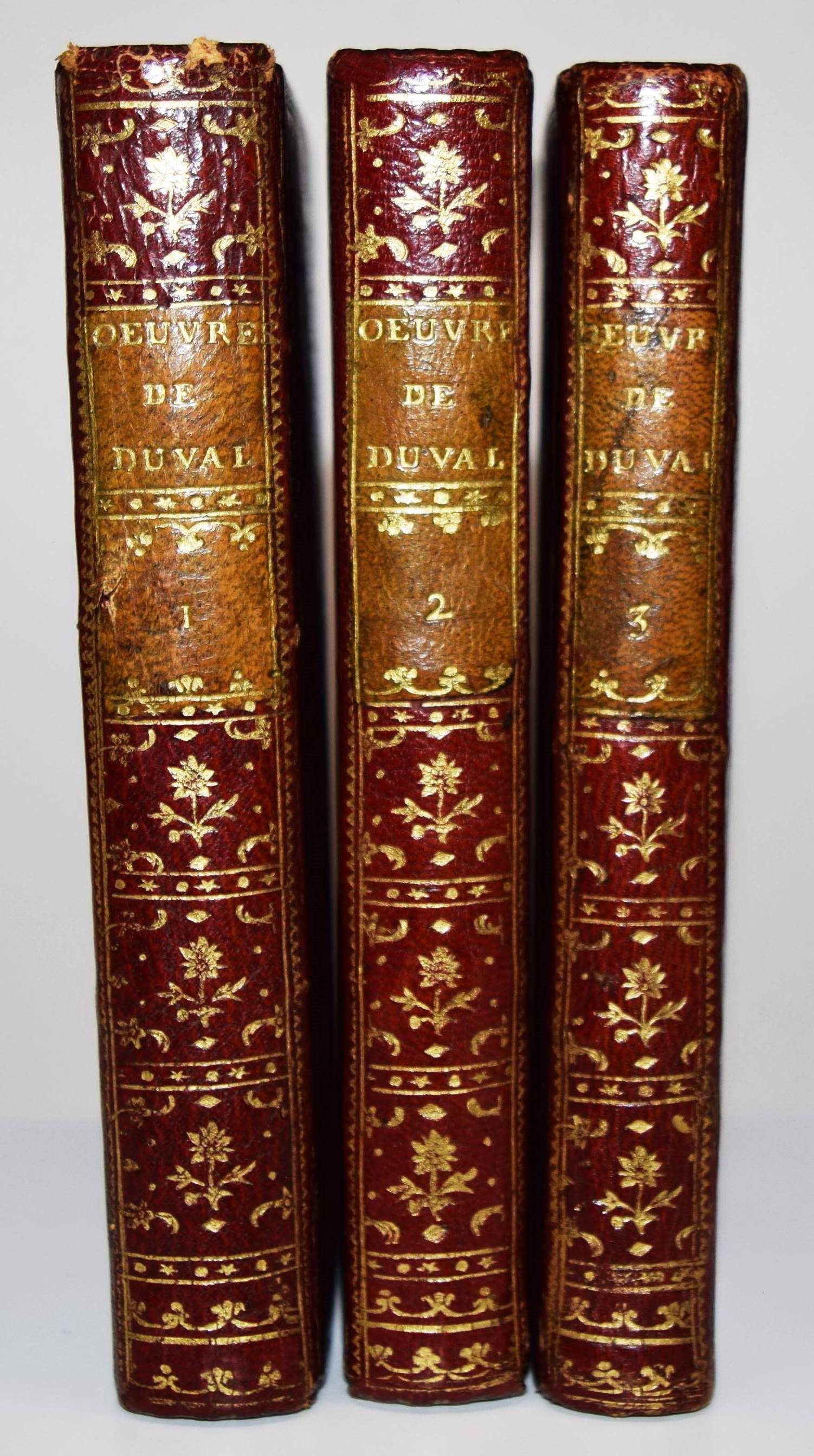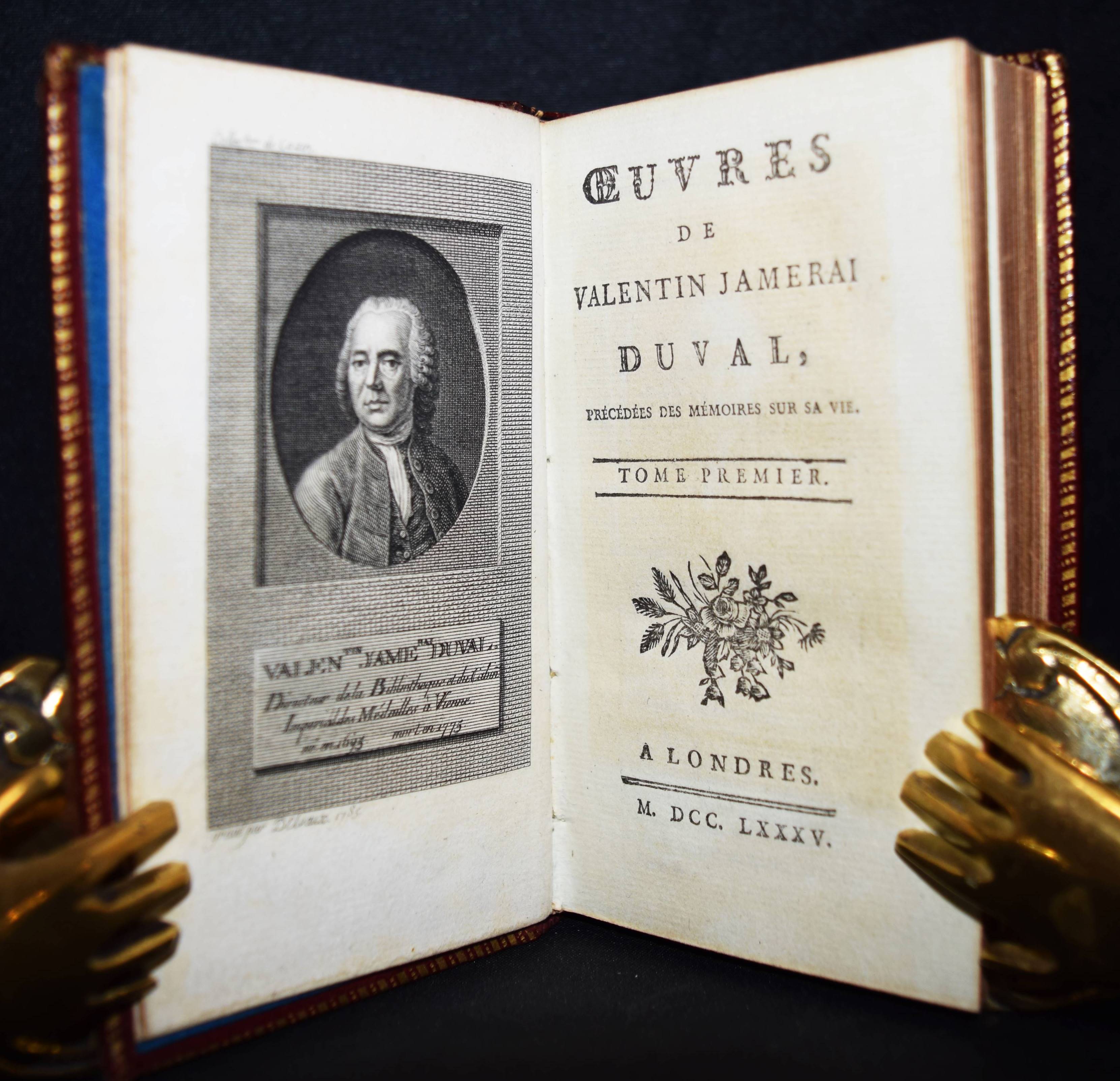 Duval, Valentin Jameray. Oeuvres. Précédées des mémoires sur sa vie. 3 Bände. Londres (eig. Paris), o. Dr. 1785. 12° (12,5 x 7,5 cm.). [2] Bl., 278 S.; [2] Bl., 247 S.; [2] Bl., 227 S. mit gestoch. Frontispiz von Delvaux. Weinrote Maroquin-Lederbände d. Zt. mit goldgepr. Rückensch., reicher floraler Rückenverg., Deckelfiletten, Innenkantenverg. u. Goldschnitt. ADB V, 499 f. – Zweite Gesamtausgabe; die erste Ausgabe erschien 1784 bei Treuttel in Straßburg und St. Petersburg. – Biographie und Gesamtausgabe der Werke des franz. Numismatikers V. J. Duval (1695-1775). – „Mit großem Interesse wandte sich D. der Geschichte und ihren Hülfswissenschaften zu. In Begleitung des Prinzen Franz von Lothringen, späteren Gemahls der Kaiserin Maria Theresia, machte er 1718 Reisen nach Paris, Belgien und Holland und wurde 1719 zum Oberbibliothekar und Professor der Geschichte an der Hochschule in Luneville ernannt. Seine Vorträge, anregend und geistvoll, fanden großen Beifall und zwei später berühmte Engländer, Chattam und Pitt, wurden seine Schüler. … Als Lothringen (1738) in den Besitz des Königs Stanislaus überging, folgte D. dem Herzoge Franz nach Florenz und 1743 nach Wien, wo ihm der Kaiser, sein alter Gönner, 1748 die Stelle eines Directors des kaiserlichen Münz- und Antikencabinets übertrug. Hier fiel ihm zuerst die Aufgabe zu, die von Heräus vereinigten kaiserlichen Sammlungen mit den zwei gelehrten Numismatikern Frölich und Kell zu ordnen und zu beschreiben, … Unter seinen Zeitgenossen erregten das größte Interesse sein eigenartiger Charakter und seine Lebensschicksale, über welche letztere er Aufzeichnungen hinterließ auf deren Grundlage nach seinem Tode in deutscher und französischer Sprache Biographien erschienen“ (K. Weiß in ADB). – Sehr schönes prachtvoll gebundenes Exemplar.