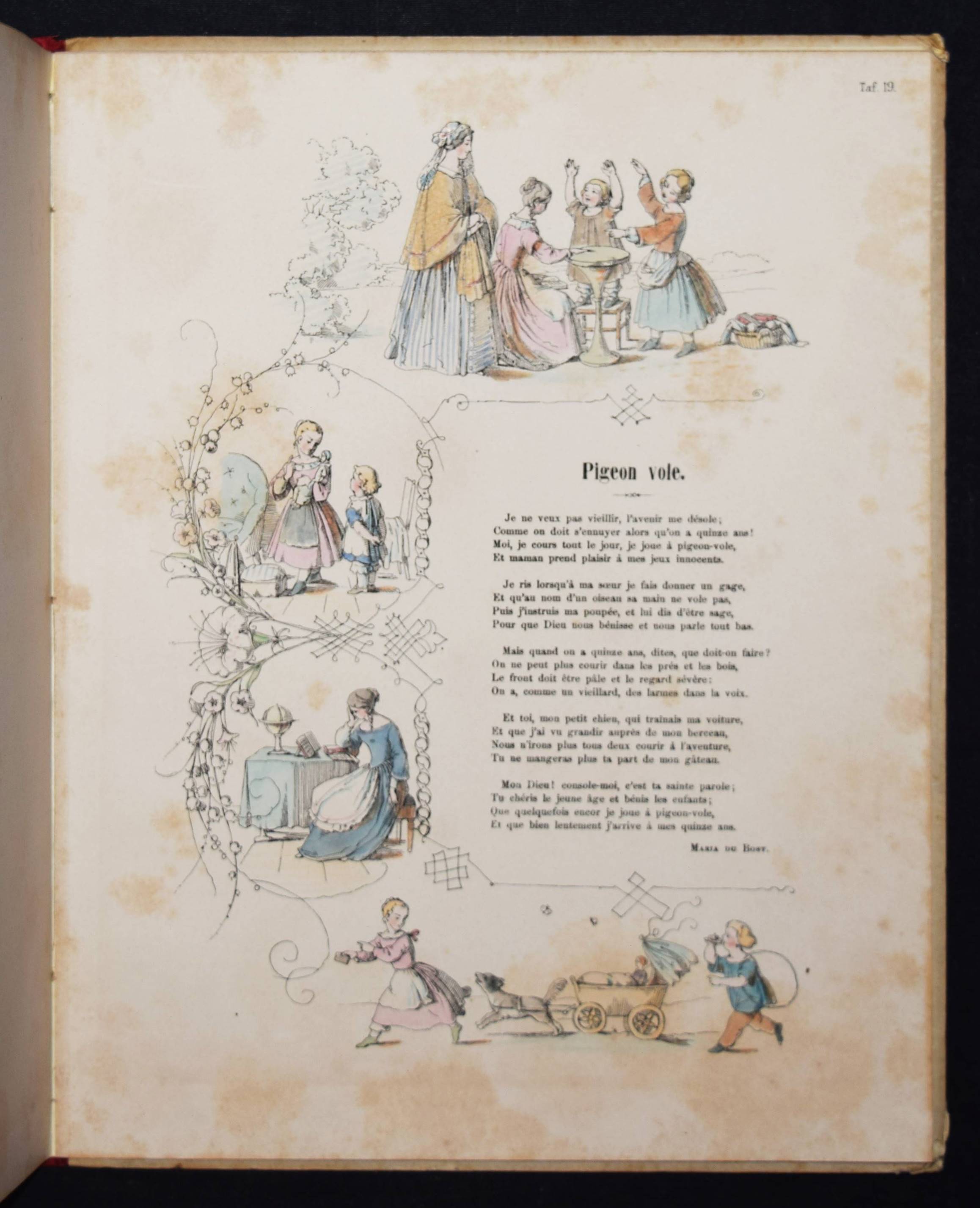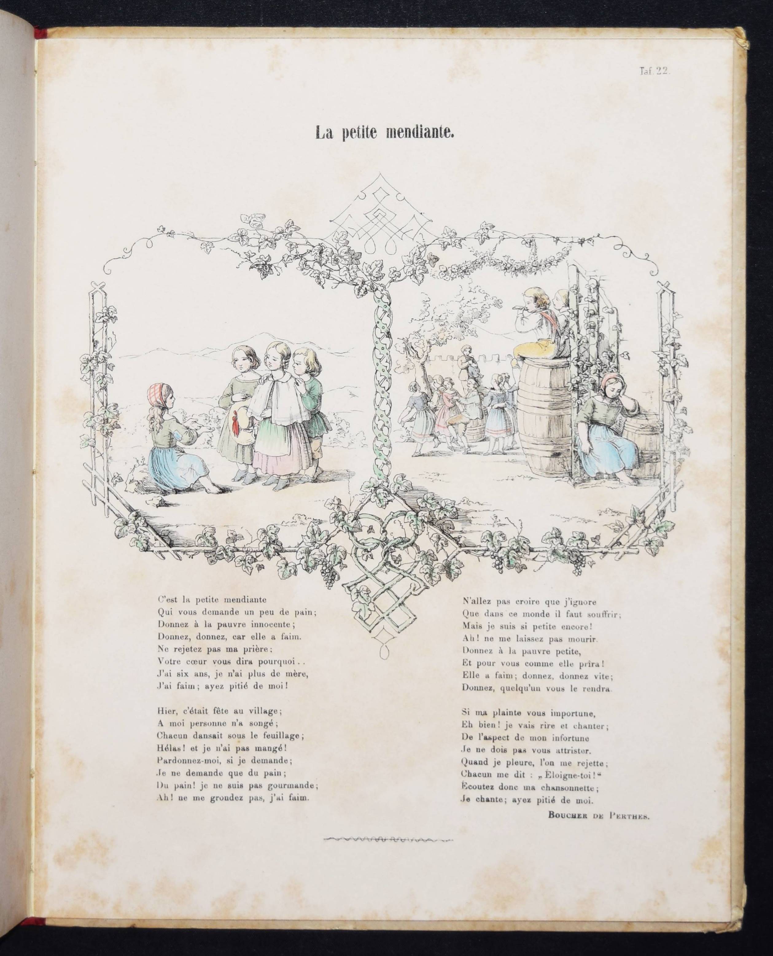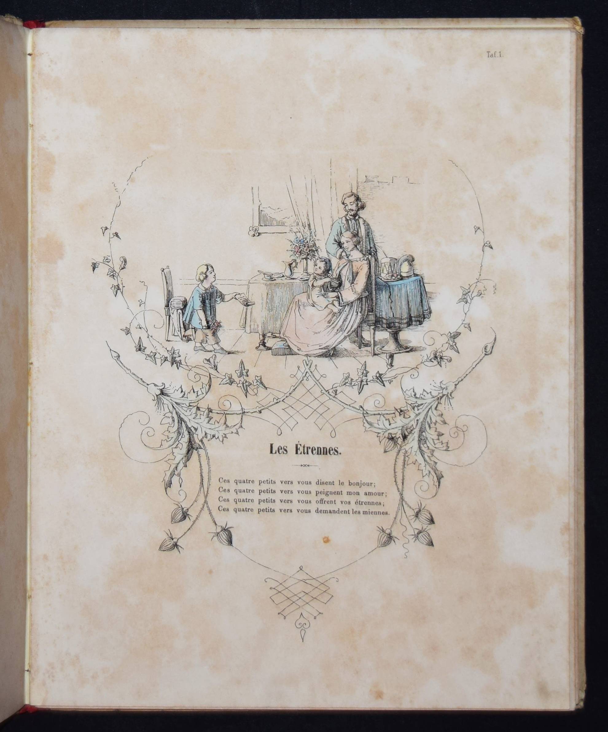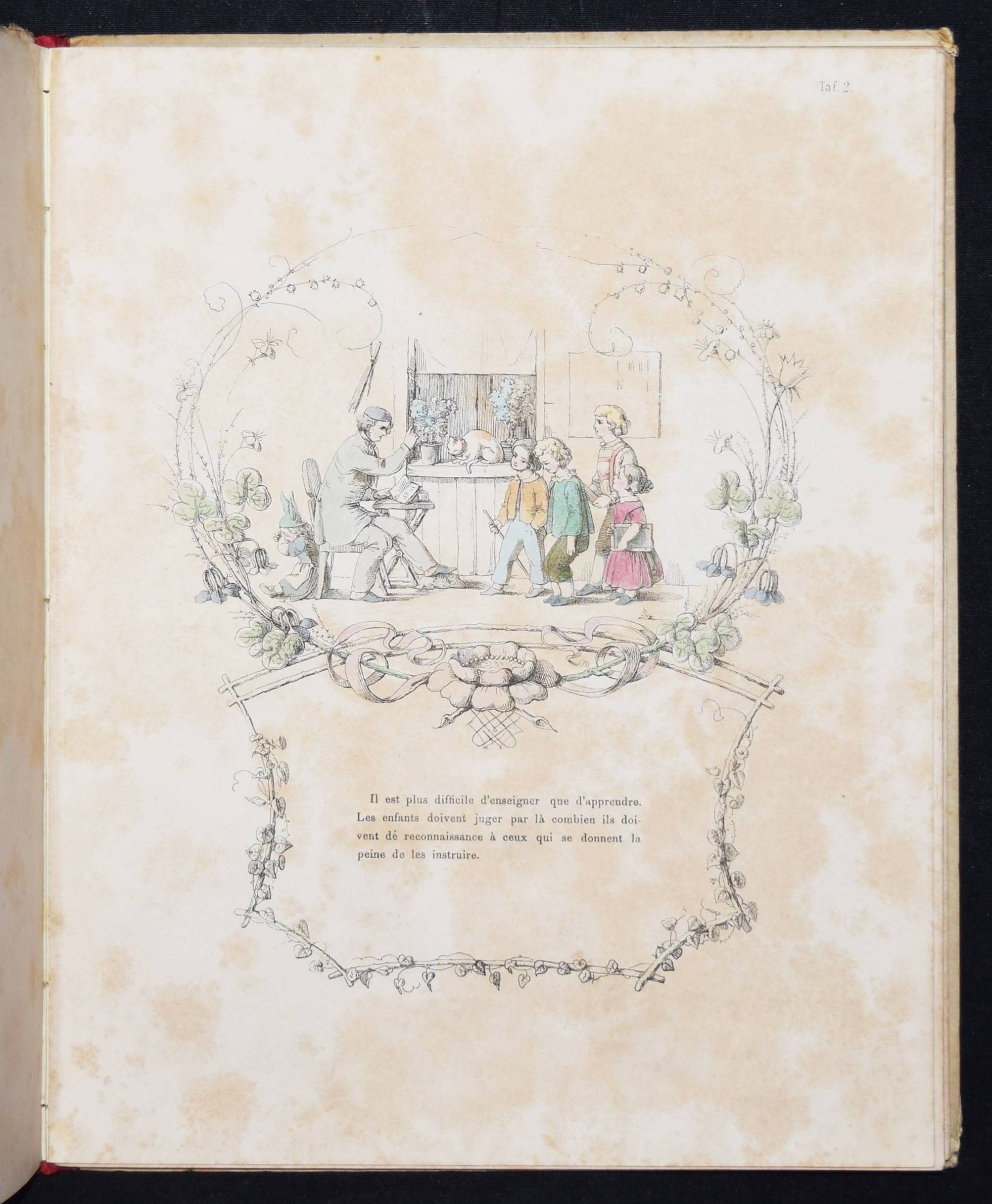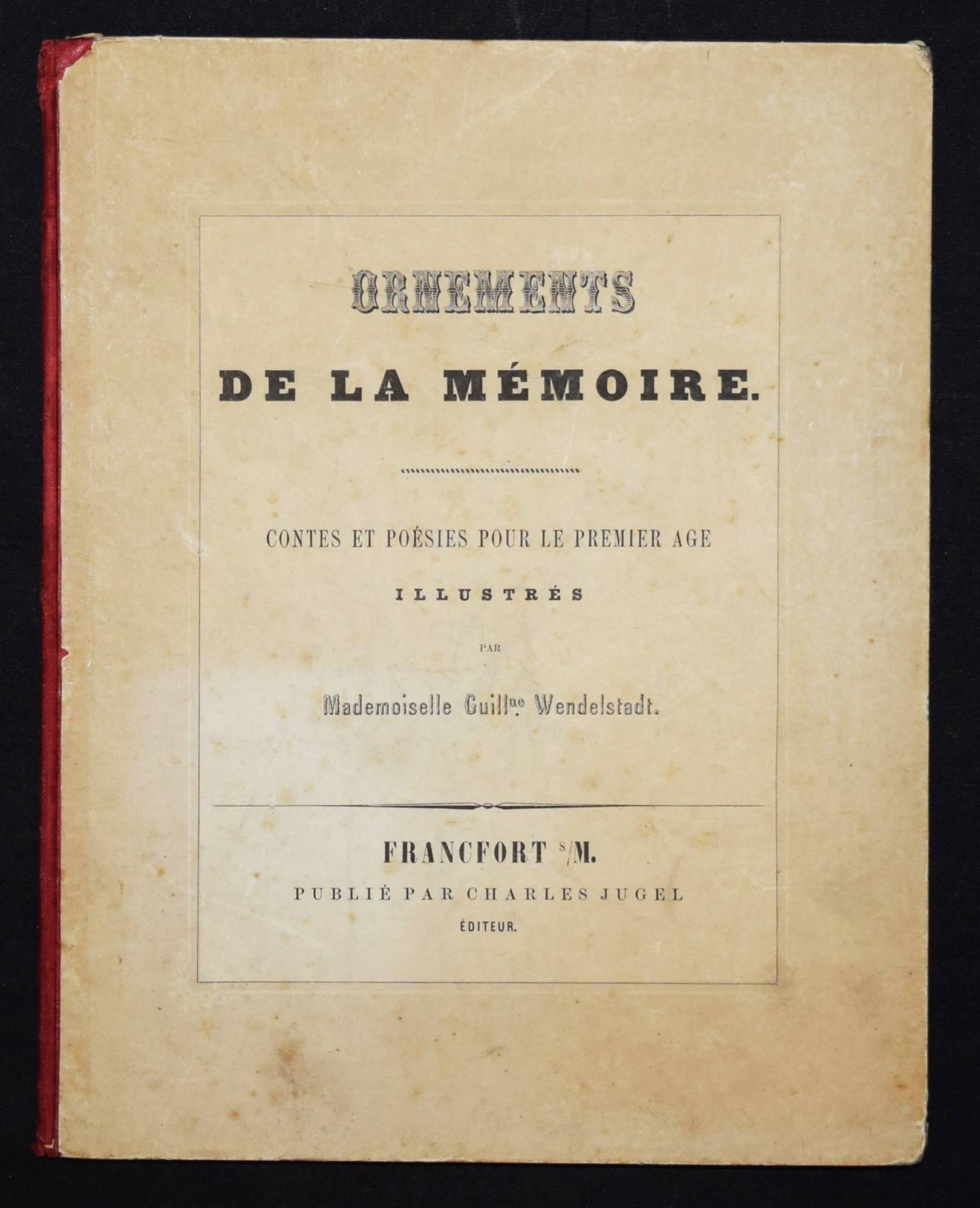 Wendelstadt, (Johanna Wilhelme). Ornements de la mémoire. Contes et poésies pour le premier âge illustrés. Frankfurt am Main, Karl Jügel o. J. (1856). 4°. [25] eins. bedr. Bl. mit handkol. illustr. Titel u. 24 handkol. lithogr. Illustrationen. OHln. Nicht bei Ries und in anderen wichtigen Kinderbuch-Bibliographien. – Erste Ausgabe, selten. – Die zeittypischen Illustrationen im Stil des Struwwelpeters mit eingedruckten Versen von Jenny Angelet, Francois de Neufchateau, Gaudy, Louise Eugénie Bally, Marie du Bost, Vitalis, Parny u. a. – Die Frankfurter Malerin J. W. Wendelstadt (1824-1902) war die Tochter des Historienmalers Karl Friedrich Wendelstadt (1785-1840). – Rückenbezug am Kapital und Fuß mit kl. Fehlstellen, Deckel etwas angestaubt und fleckig, Widmung a. V. (dat. Weihnachten 1857), durchgehend etwas braunfleckig, sonst gut erhalten.