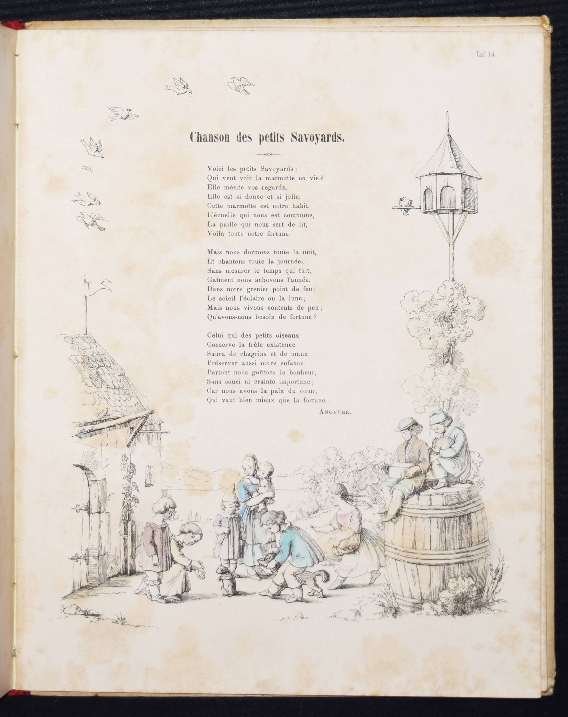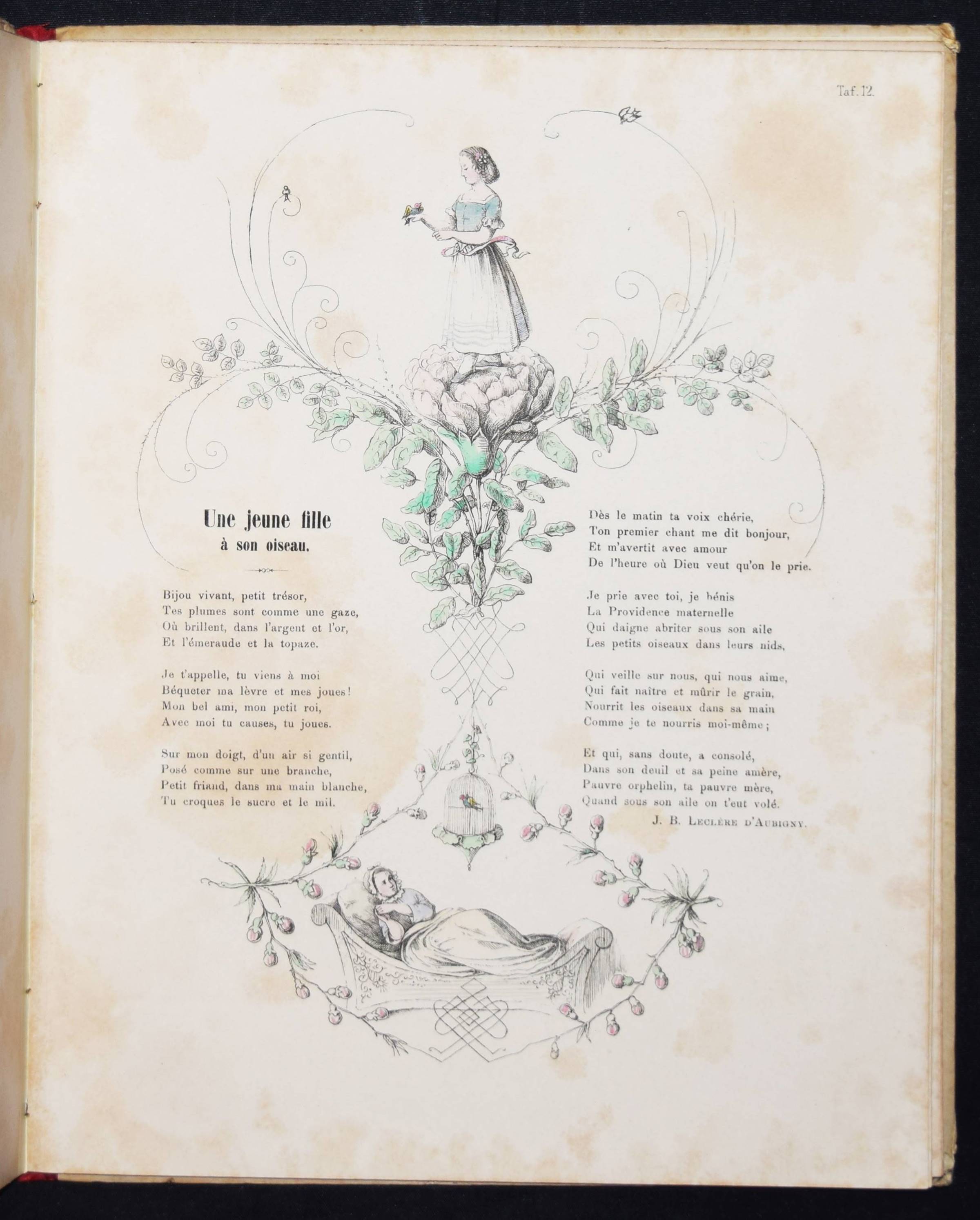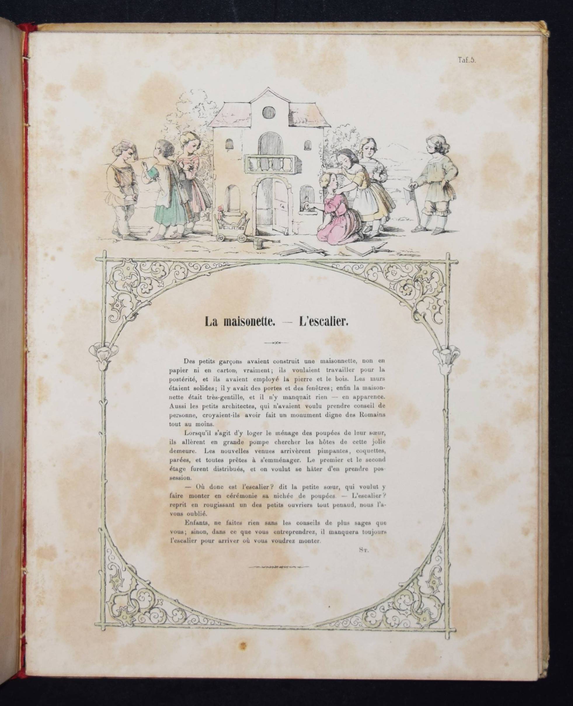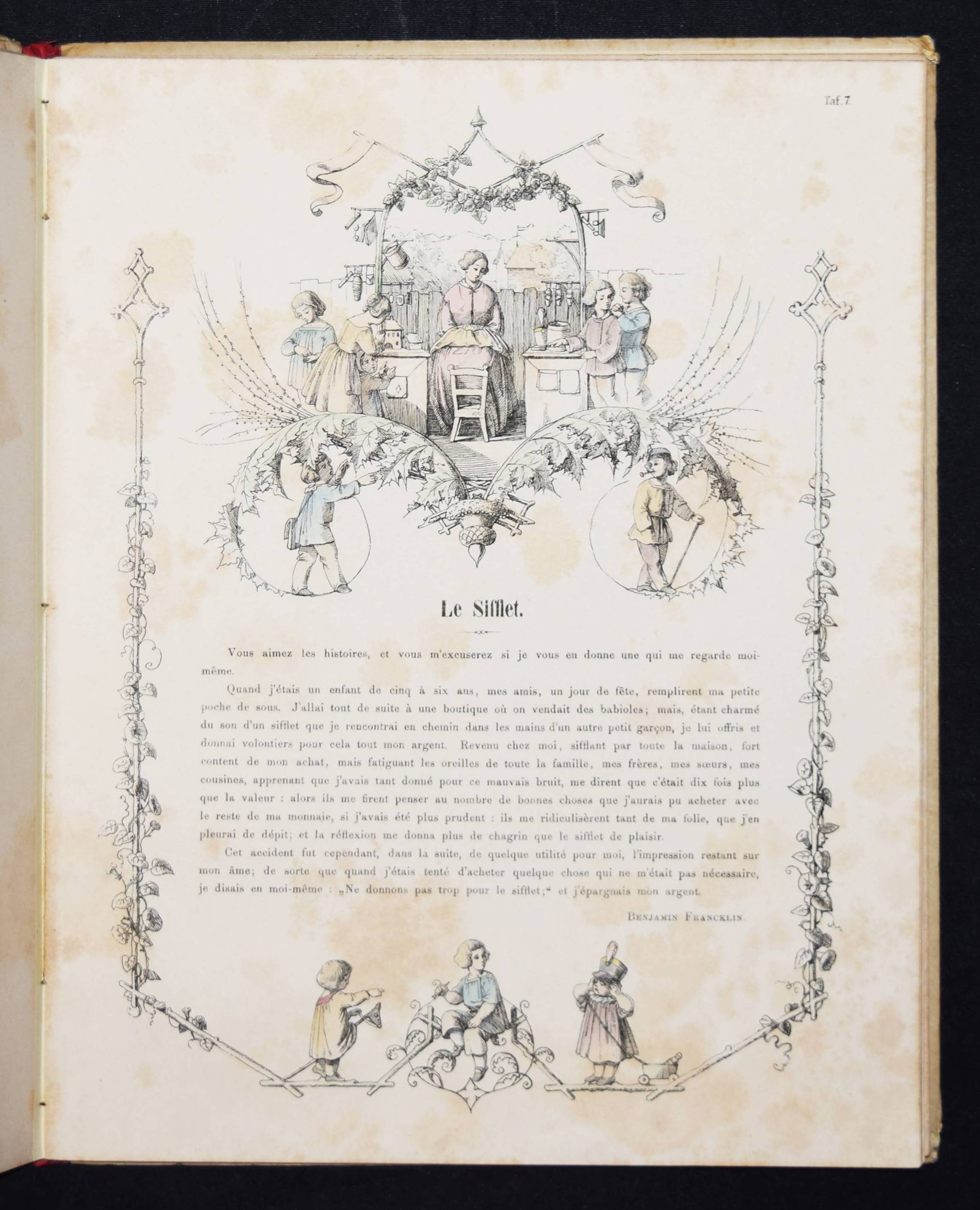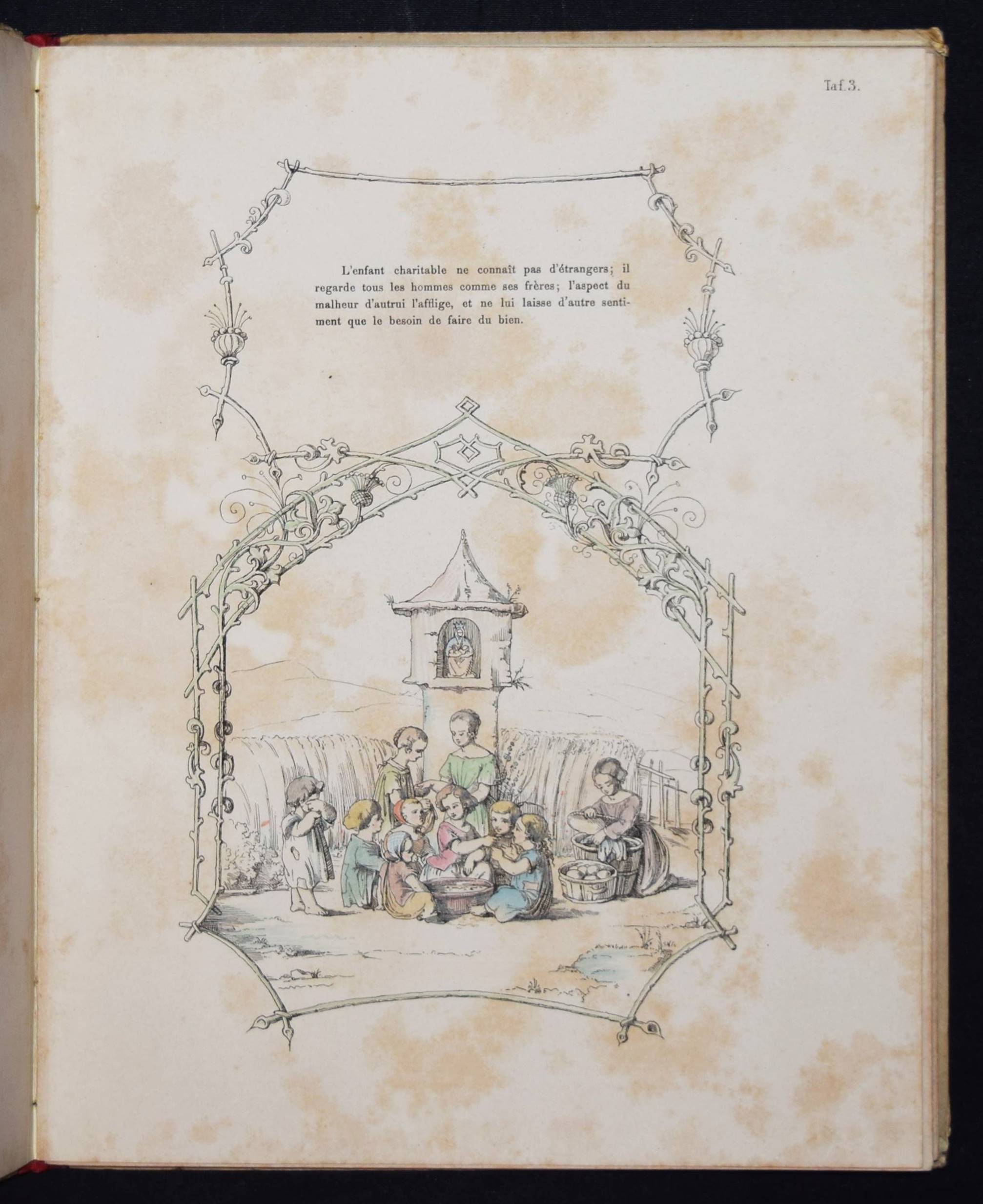 Wendelstadt, (Johanna Wilhelme). Ornements de la mémoire. Contes et poésies pour le premier âge illustrés. Frankfurt am Main, Karl Jügel o. J. (1856). 4°. [25] eins. bedr. Bl. mit handkol. illustr. Titel u. 24 handkol. lithogr. Illustrationen. OHln. Nicht bei Ries und in anderen wichtigen Kinderbuch-Bibliographien. – Erste Ausgabe, selten. – Die zeittypischen Illustrationen im Stil des Struwwelpeters mit eingedruckten Versen von Jenny Angelet, Francois de Neufchateau, Gaudy, Louise Eugénie Bally, Marie du Bost, Vitalis, Parny u. a. – Die Frankfurter Malerin J. W. Wendelstadt (1824-1902) war die Tochter des Historienmalers Karl Friedrich Wendelstadt (1785-1840). – Rückenbezug am Kapital und Fuß mit kl. Fehlstellen, Deckel etwas angestaubt und fleckig, Widmung a. V. (dat. Weihnachten 1857), durchgehend etwas braunfleckig, sonst gut erhalten.