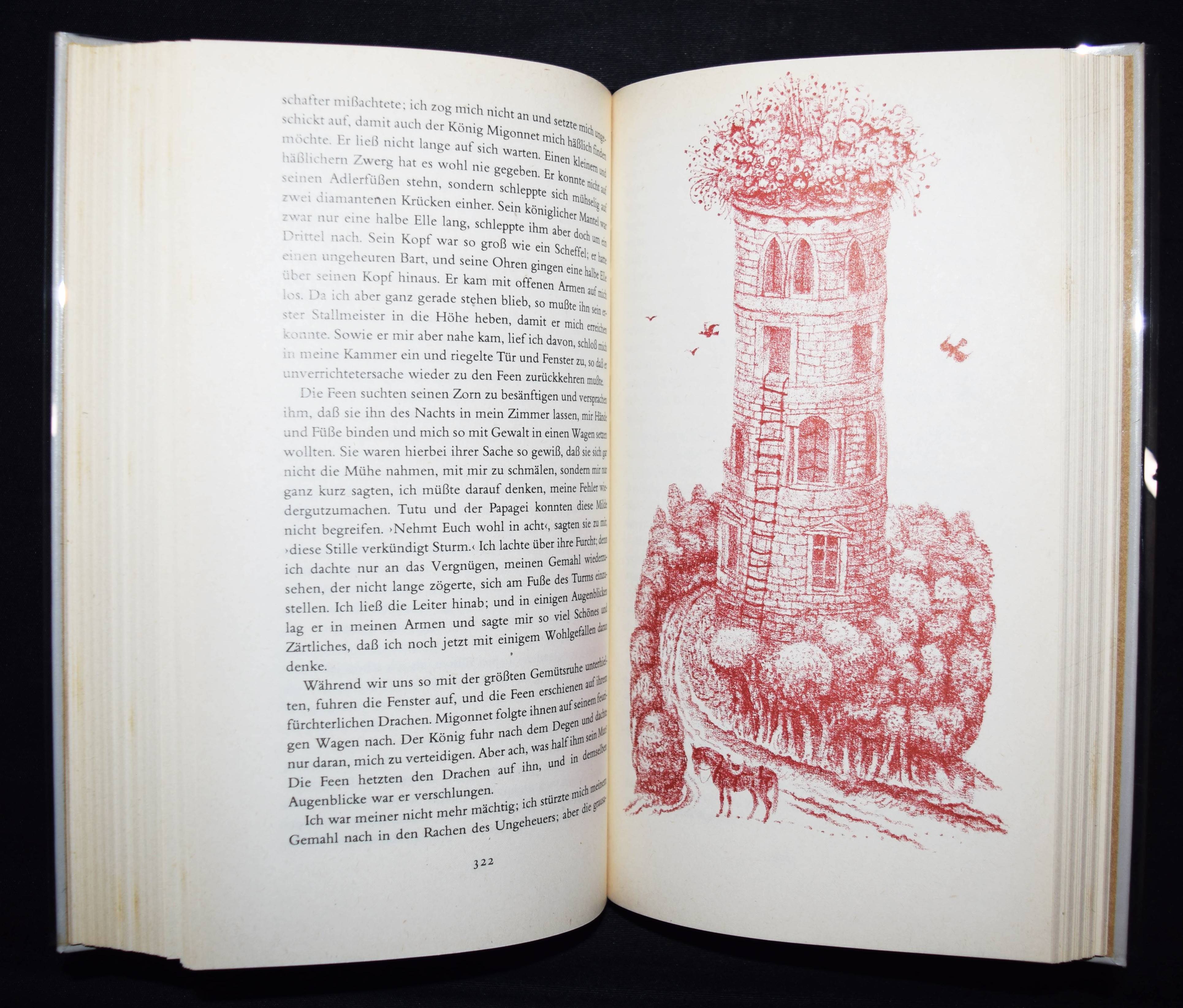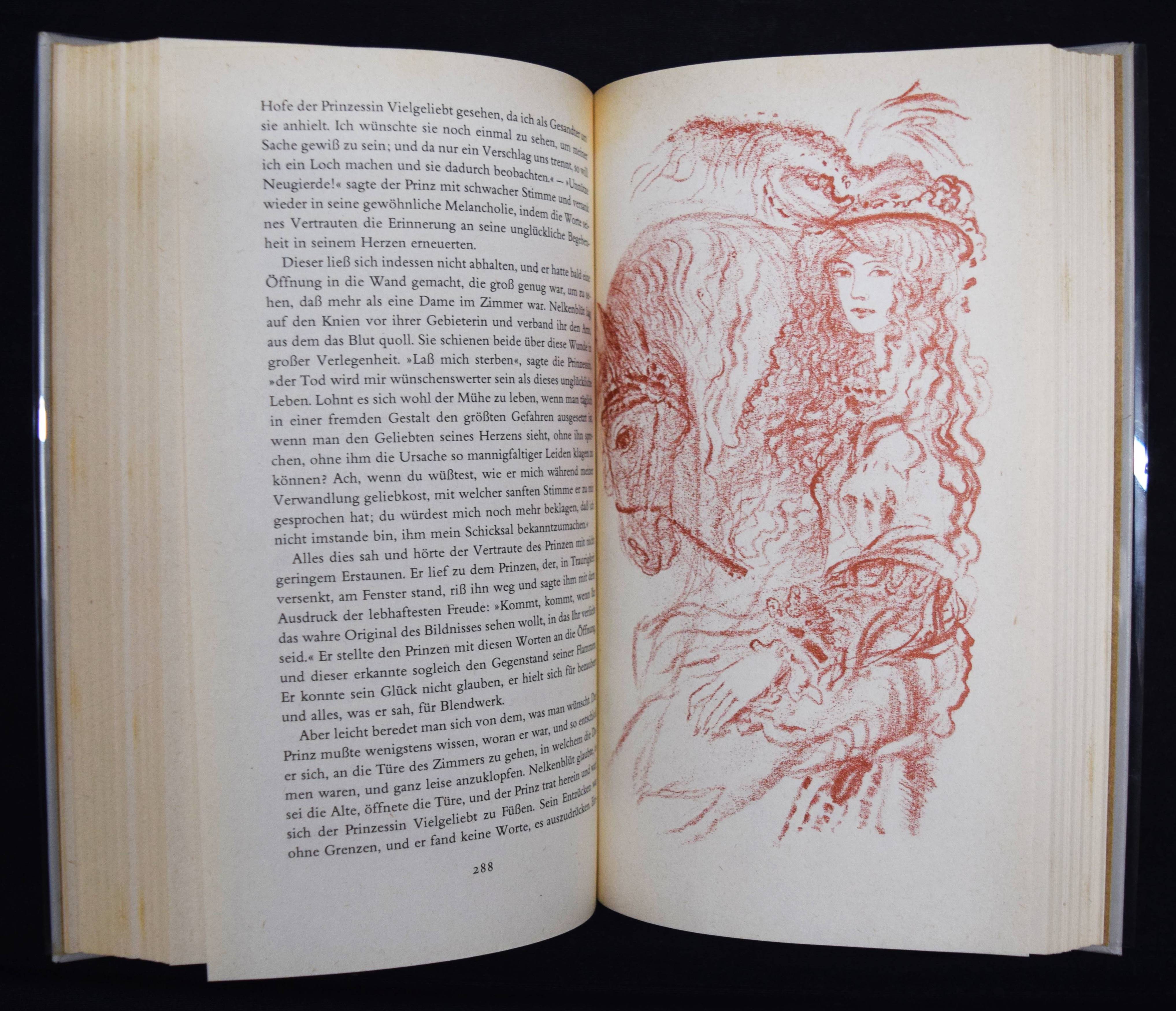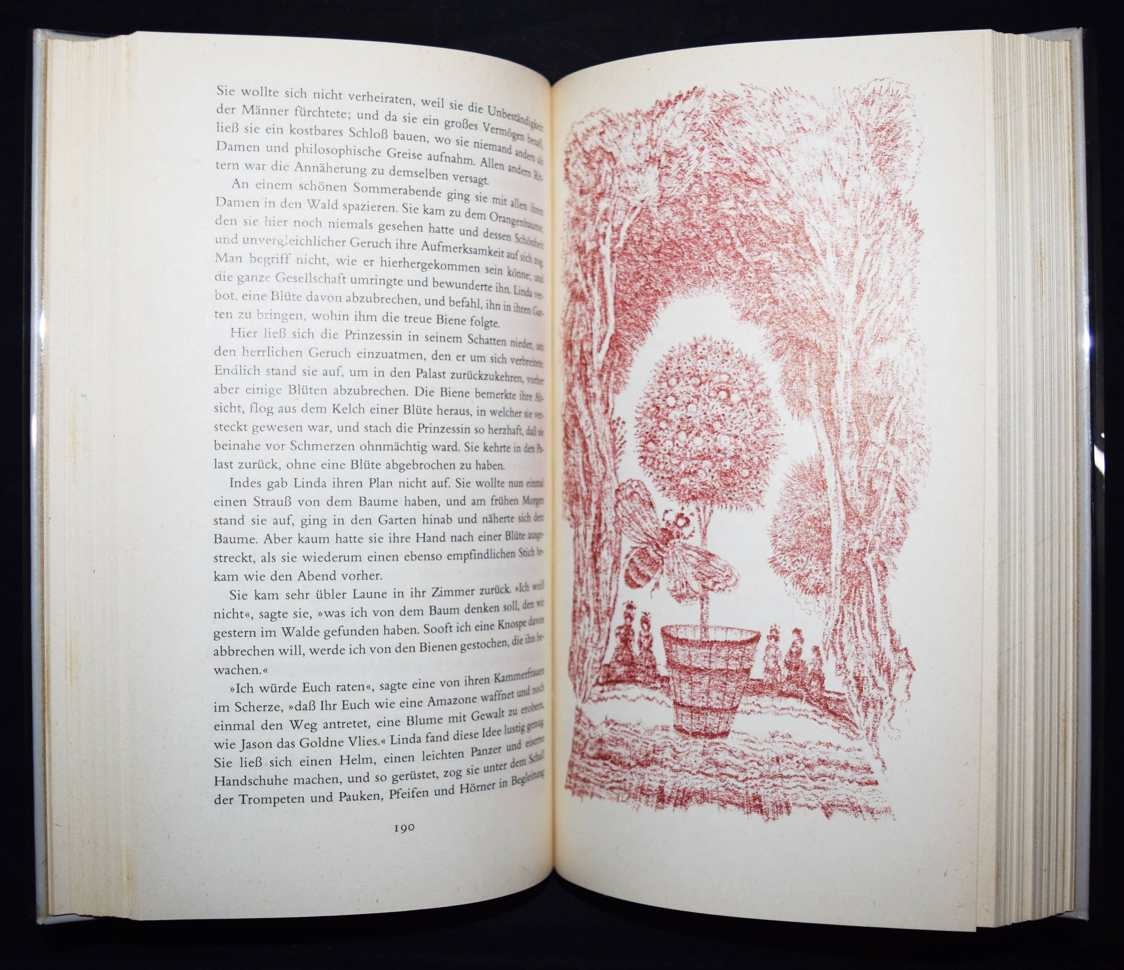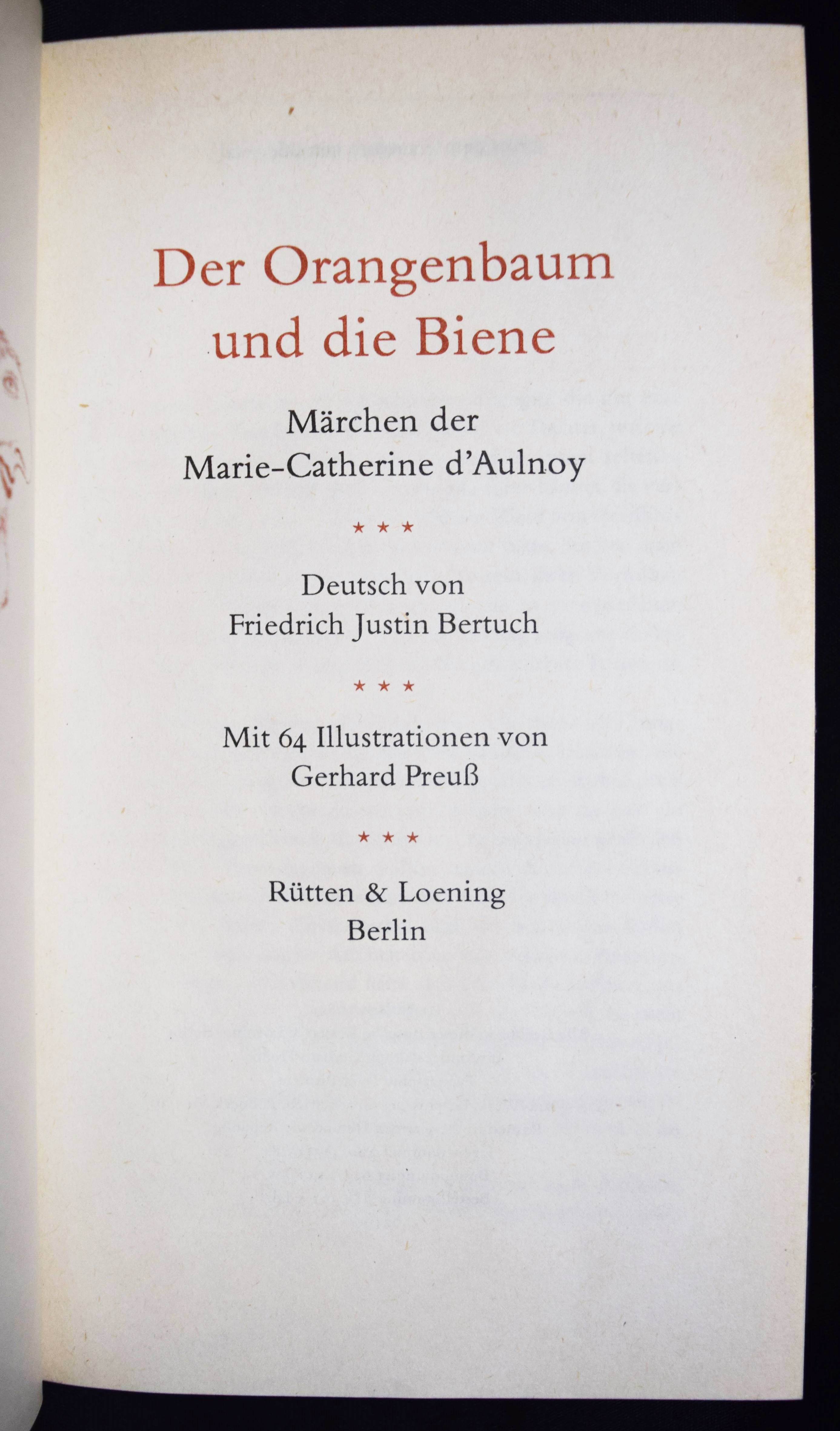 Aulnoy, Marie Catherine (le Jumel de Barneville de). Der Orangenbaum und die Biene. Märchen. Deutsch von Friedrich Justin Bertuch. Mit 64 Illustrationen von Gerhard Preuß. Berlin, Rütten und Loening (1984). 8°. 478 S. mit 64 Illustrationen in Röteldruck. Hellgrauer OLdr. mit goldgepr. Rückentitel u. Deckelvignette u. Klarsicht-Schutzumschlag. Sehr gutes Exemplar der schönen Ganzlederausgabe.