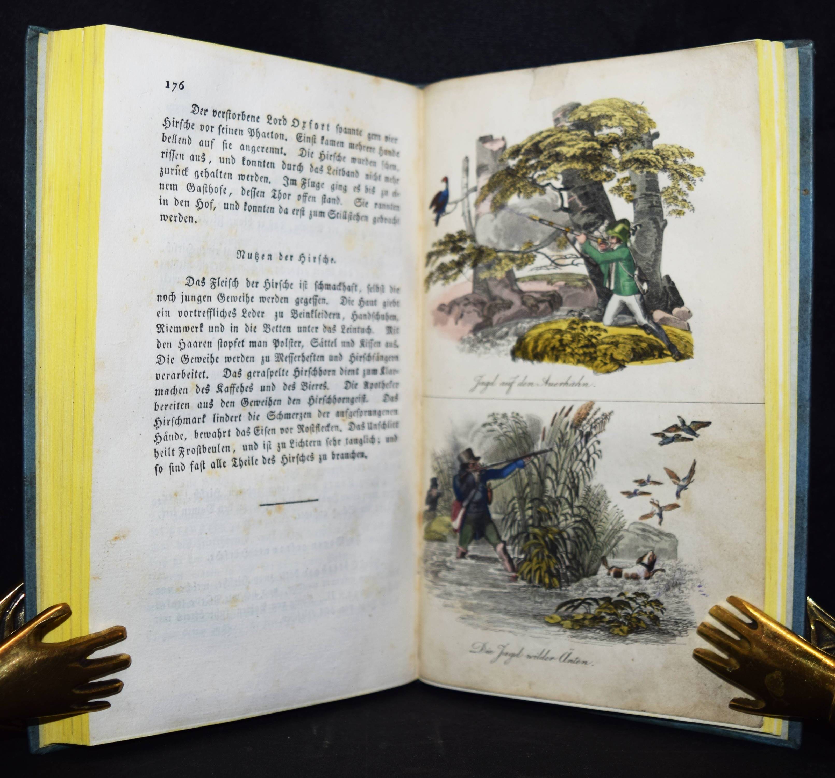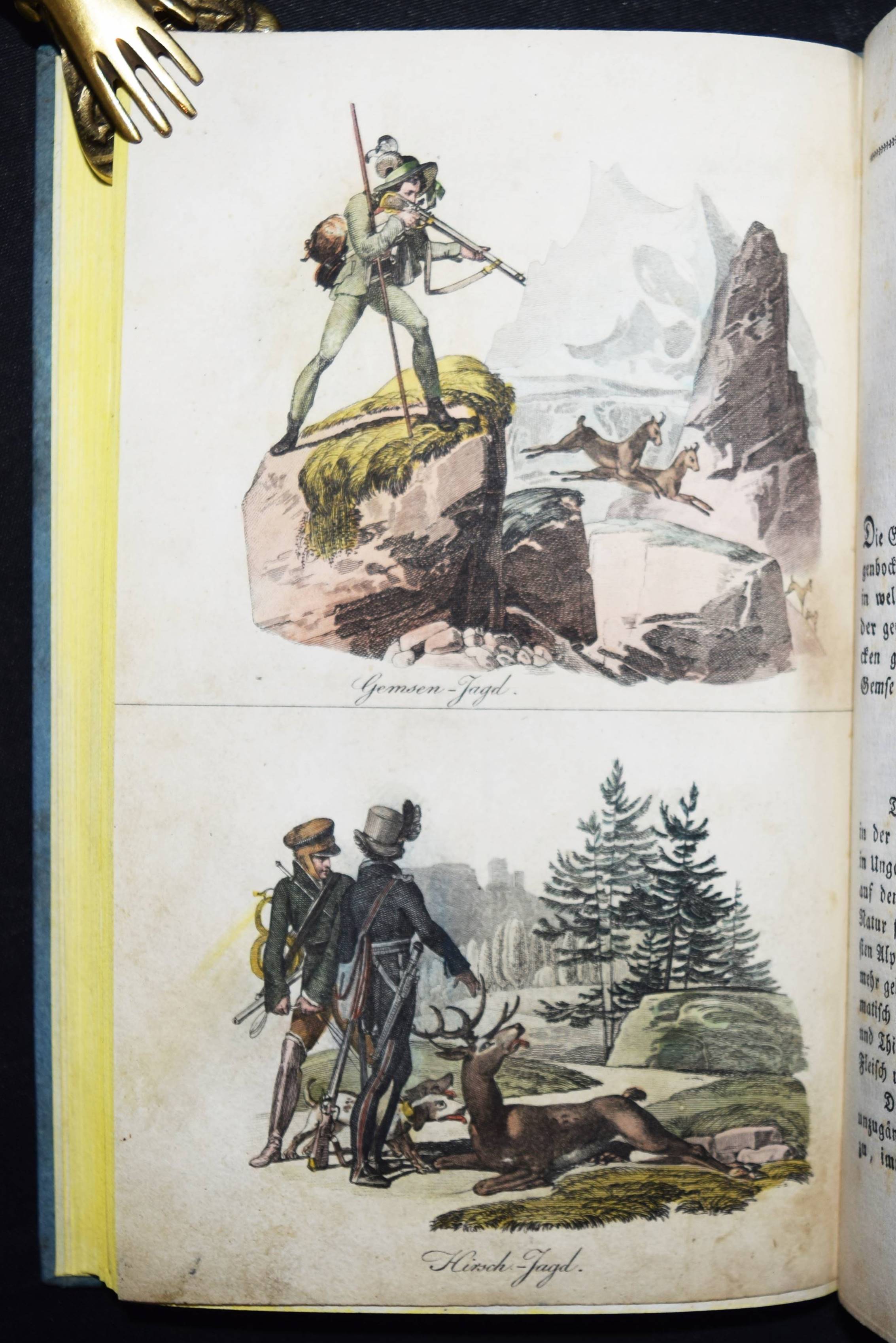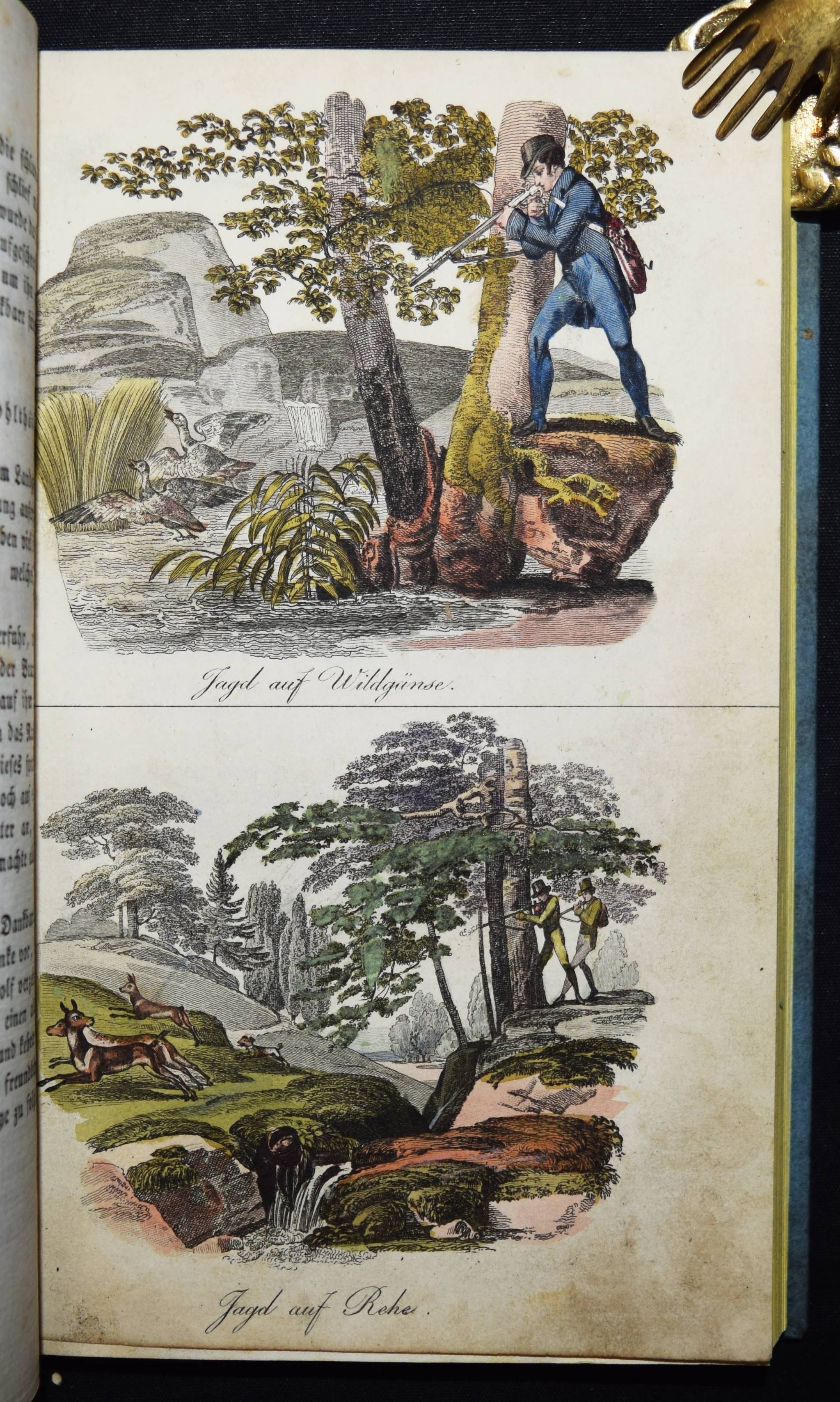 Chimani, Leopold. Die Jagdlust. Ein unterhaltendes Bilderbuch für die Jugend, enthaltend die Art und Weise das vorzüglichste inländische Wild zu jagen und zu fangen, nebst vielen kurzweiligen Jagd-Anekdoten. (Mit 12 colorirten Darstellungen von Jagden). Wien, H. F. Müller o. J. (1820 oder 1821). 8°. [2] Bl., 213, (1) S., [2] Bl. mit 12 Abb. auf 6 handkol. gestoch. Tafeln. Illustr. OPbd. Goed. VI, 562, 31. Hauswedell 295 (mit Abb. auf Tafel 16). LKJ IV, 116. Lindner 11.0339.01. Monschein 150. Rümann, Kinderbücher 77. Schwerdt I, 111. Wegehaupt IV, 344 (unvollst.). – Einzige Ausgabe, selten. – „Man hat die Jagdthiere und besonders die Jagd sehr verschrien, man könnte mir zur Last legen, daß ich Jagdlust bey der Jugend anregen wollte. Wenn die Jagd in jenen Gränzen gehalten wird, wie es in unserem Vaterlande durch Landesgesetze geschieht, so fällt der Nachtheil derselben leicht weg, und es bleibt nur der Nutzen zurück, welchen die Verminderung und Ausrottung der wilden Raubthiere, und den alle jagdbaren Thiere in Hinsicht auf Nahrung und Kleidung den Menschen bringen. Hoch muß man den Gewinnn anschlagen, den der Adel und Bürgerstand aus dem Jagdvergnügen, welches sie zur Erhohlung wählen, in Hinsicht auf Gesundheit und Erheiterung des Geistes nach anstrengenden Geschäften ziehen. Sollten diese Gründe meine Arbeit nicht rechtfertigen, so glaube ich doch ein unterhaltendes Lesebuch der Jugend geschrieben zu haben, mit welchem sie manche leere Stunde nützlich ausfüllen kann, und welches geeignet ist, Vorliebe zur Naturgeschichte bey derselben zu erregen. Da der Verleger meine Arbeit mit sehr schönen Bildern und einer netten Ausgabe unterstützt hat, so glaube ich, daß der Jugend dieses Geschenk willkommen seyn wird“ (L. Chimani im Vorwort). – Einband unter Verwendung des Originalmaterials fachgerecht erneuert, nur vereinzelt im Blattrand etwas braunfleckig, schönes Exemplar.