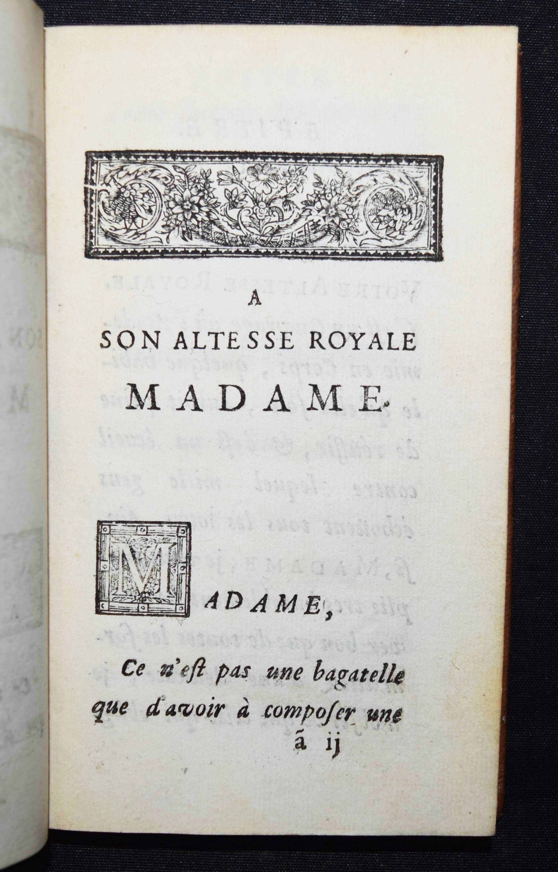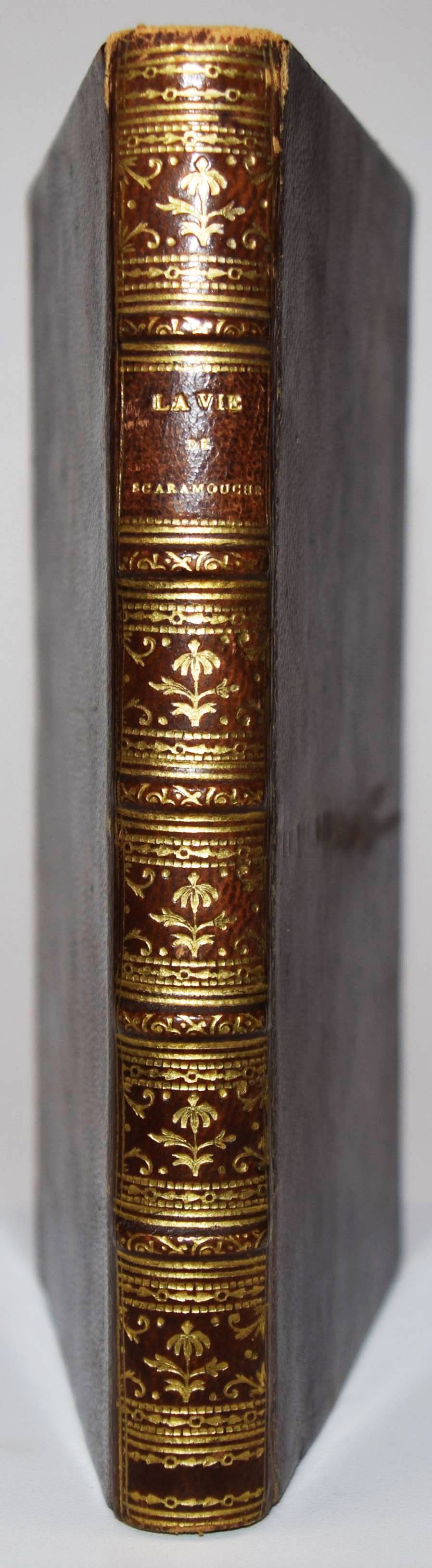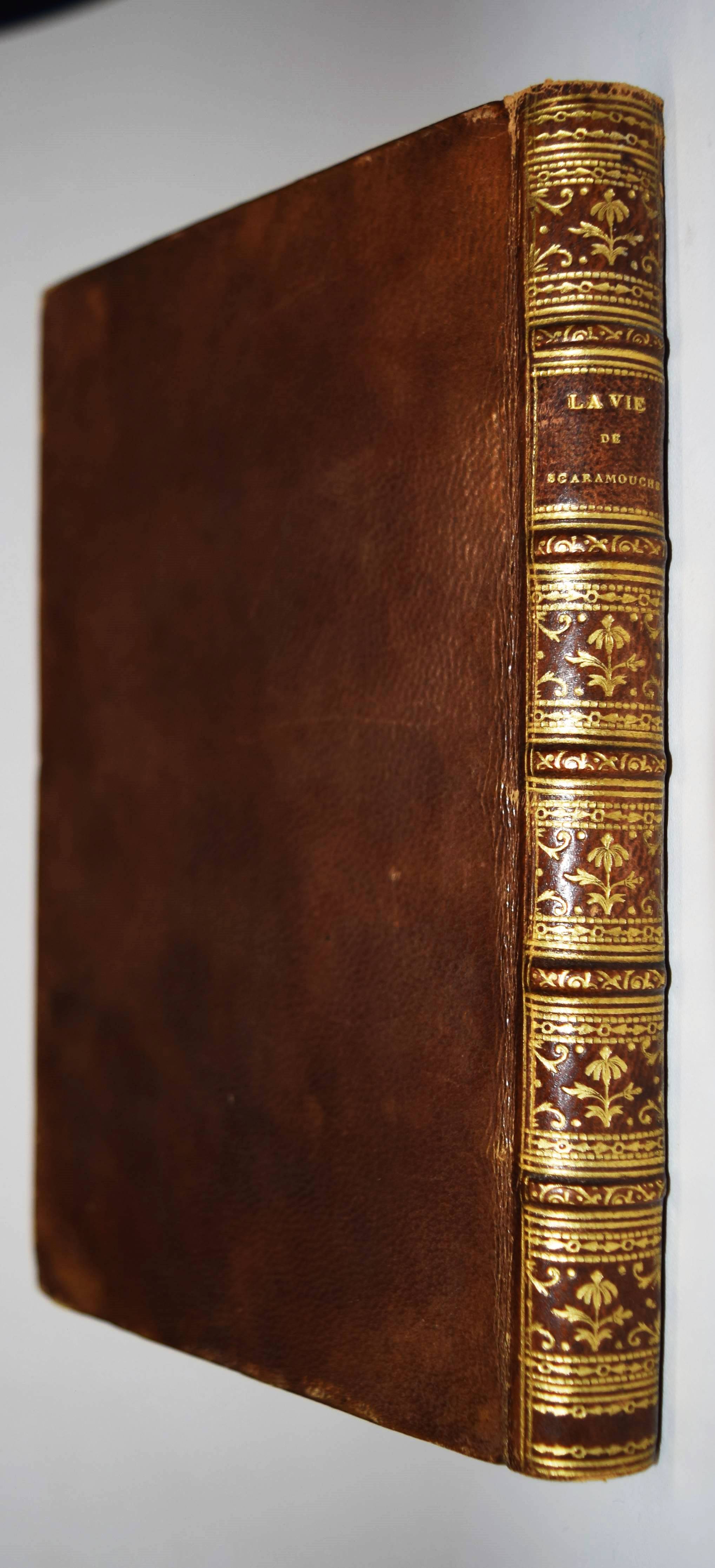 Costantini, Angelo. La vie de Scaramouche. Paris, à l’Hôtel de Bourgogne et chez C. Barbin 1695. Kl-8°. [14] Bl., 246 S., [1] Bl. Ldr. d. 19. Jahrhunderts mit goldgepr. Rückentitel u. reicher floraler Rückenverg. Conlon 7135. Goldsmith C 1419. – Erste Ausgabe. – Sehr seltene Beschreibung der berühmten, um 1640 von Tiberio Fiorillo geschaffenen Gestalt der Commedia dell’Arte. Der Verfasser war unter den Namen Mézétin „Comedien Ordinaire du Roy dans sa Troupe Italienne“. – Fiorillo war Schauspieler beim Herzog von Mantua, später Hofschauspieler Ludwig XIV., über 50 Jahre spielte er noch zu Zeiten Corneilles und Molières, der von ihm beeinflußt wurde. – Ohne das Frontispiz (liegt in Kopie bei), sonst sehr gutes dekorativ gebundenes Exemplar.