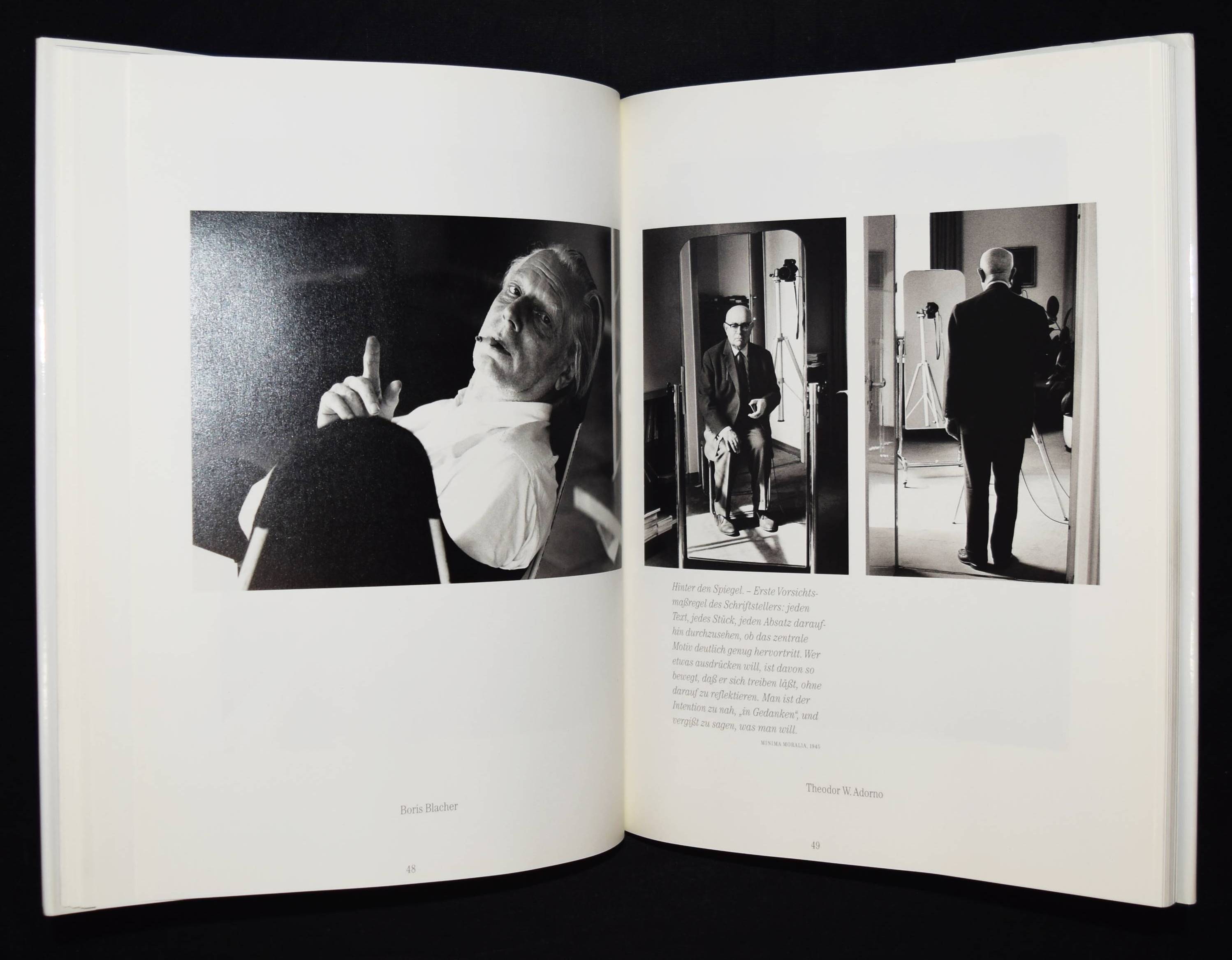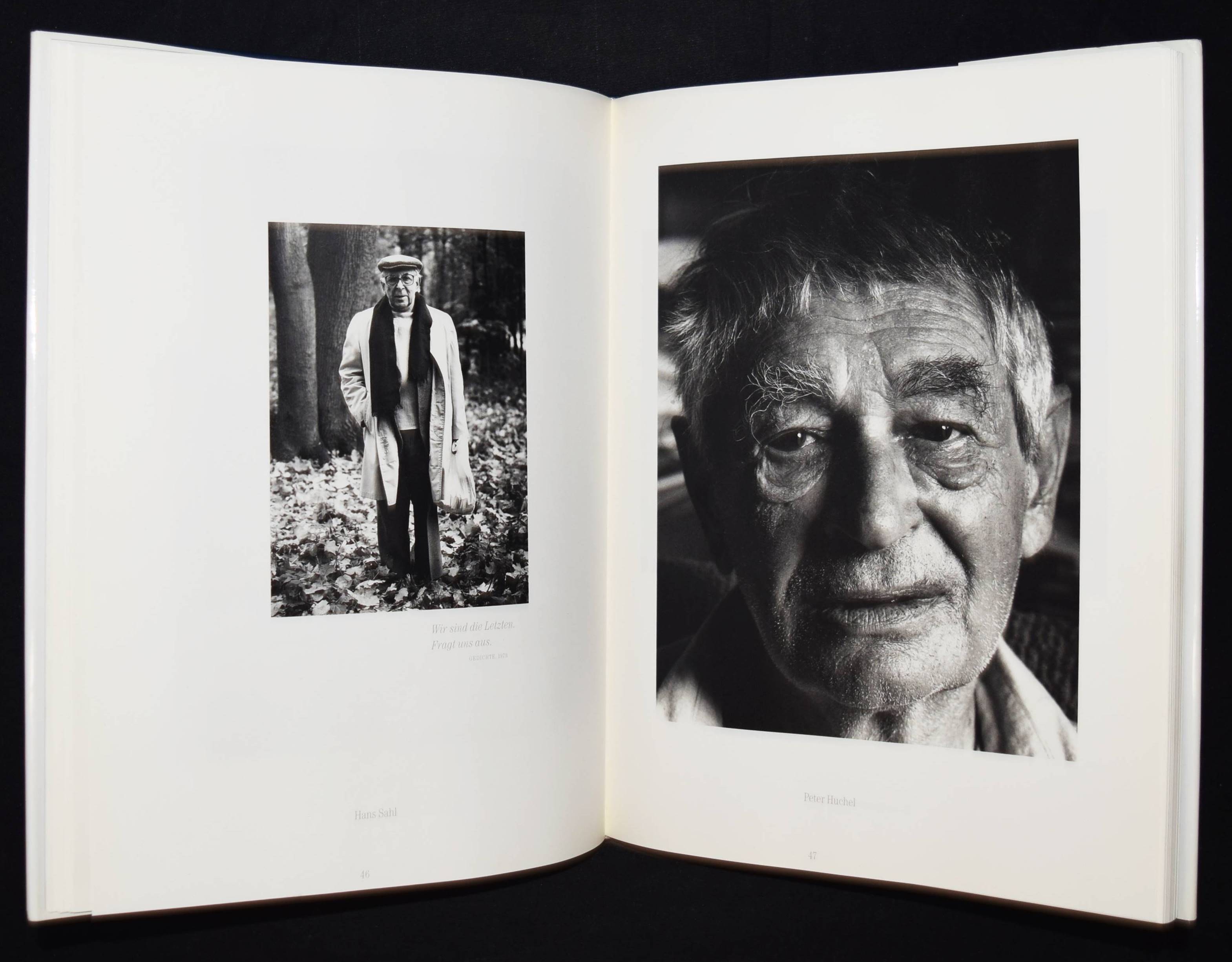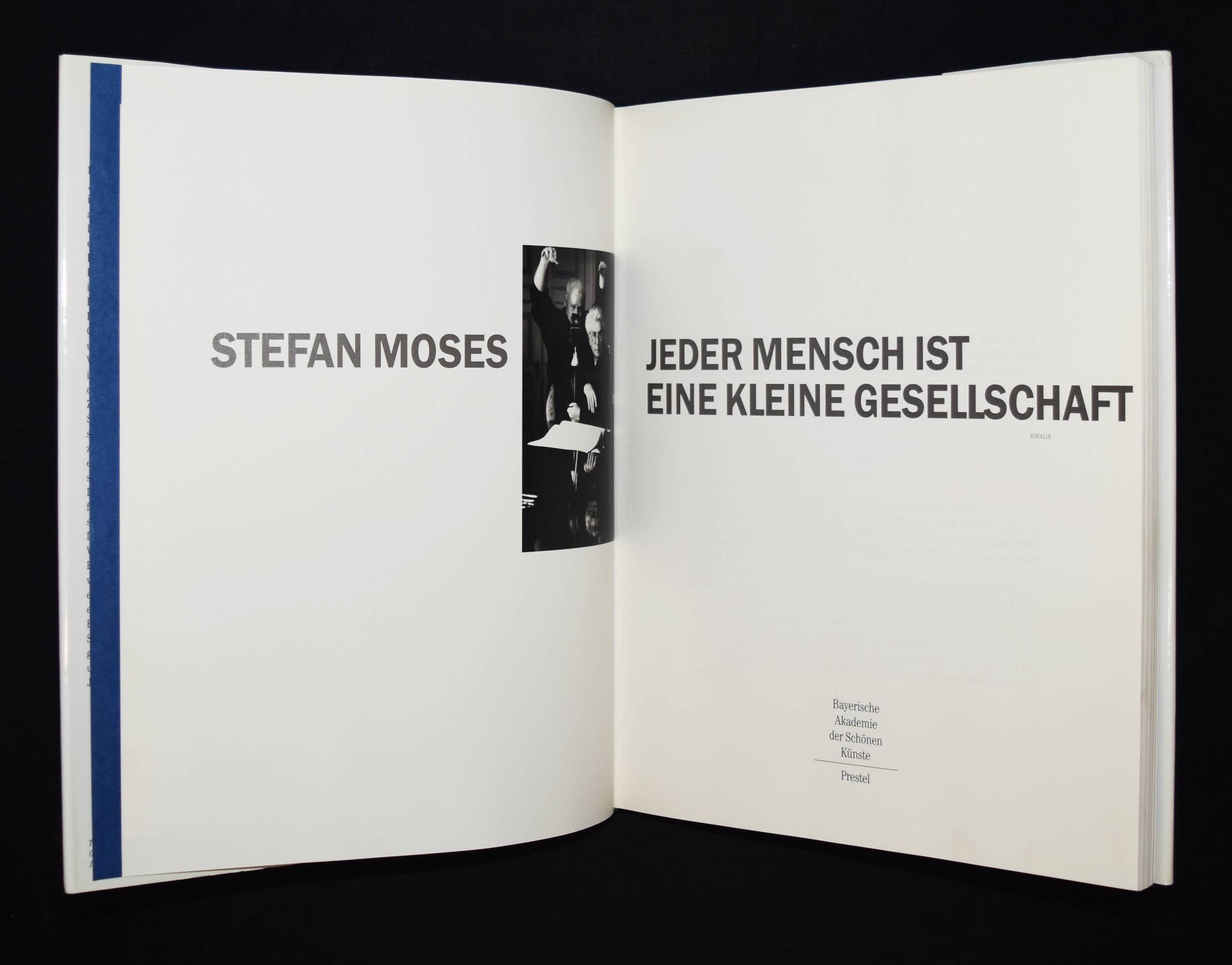 Moses, Stefan. Jeder Mensch ist eine kleine Gesellschaft. (Katalogbuch zur Ausstellung in der Bayerischen Akademie der Schönen Künste, München, vom 17. November 1998 bis 17. Januar 1999). München, Prestel (1998). 4°. 205 S. mit 59 Portraits und 1 sign. Orig.-Photographie (Silbergelatine, 28 x 22 cm. Kammerfisch WU, Flic-Flac, Wien, 1981. Orig.-Pappband mit Schutzumschlag. Koetzle 313. – Mit Texten von Wieland Schmied und J. A. Schmoll gen. Eisenwerth und Portraits der Schriftsteller, Wissenschaftler und Künstler H. Achternbusch, T. W. Adorno, I. Aichinger, H. Berggruen, H. Böll, E. Bloch, M. Croissant, H. Domin, H. M. Enzensberger, P. Flora, M. Frisch, G. Grass, W. Heisenberg, E. Jandl, K. Jaspers, E. Kästner, H. Lenz, G. u. T. Mann, A. Mitscherlich, E. W. Nay, M. Schmeling, M. Walser, P. Zadek u. a. – „Stefan Moses ist es gelungen, zahlreiche Persönlichkeiten aus Deutschland dazu zu bewegen, sich mit einem Spiegel oder im Spiegel oder gespiegelt fotografieren zu lassen. Die Porträtierten leisten sich in dieser originellen und überlegt konzipierten Porträtserie somit selbst Gesellschaft. Der Betrachter betrachtet die Personen, während sich diese selbst im Spiegel betrachten – Stefan Moses Porträts geben dank dieses Konzepts oftmals sehr erhellende Einsichten in die Persönlichkeit der Porträtierten“ (Prestel Verlag). – Sehr gutes Exemplar.