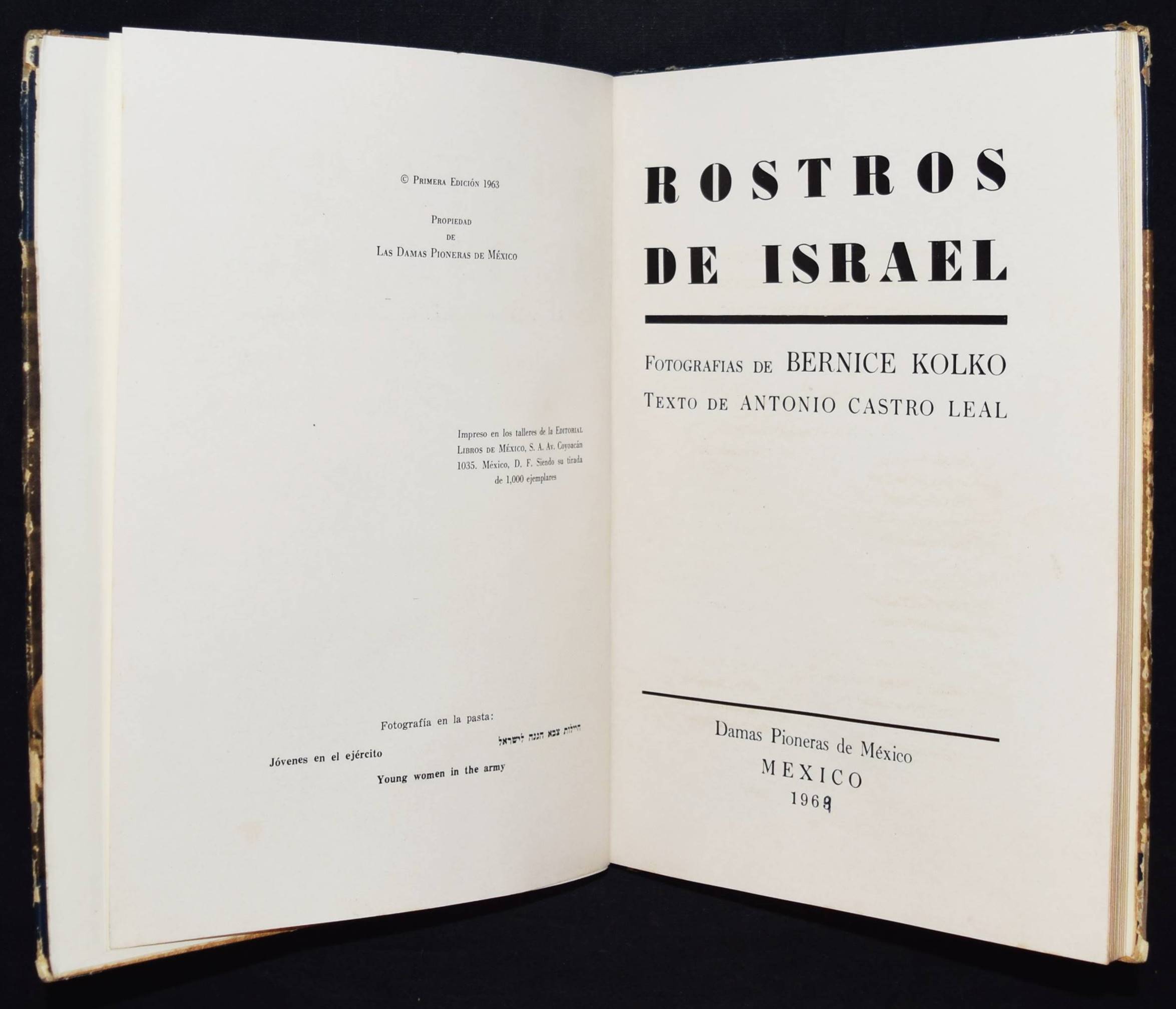 Kolko, Bernice. Rostros de Israel. Fotografias. Texto de Antonio Castro Leal. Mexico, Damas pioneras de Mexico 1963. 4°. XV, (1), 126 S., [1] Bl. mit 123 Tafeln. Illustr. Hln. mit goldgepr. Rückentitel. Erste Ausgabe, sehr selten. – Eines von 1000 Exemplaren. – Text in Spanisch und Hebräisch. – B. Kolko (1905-1970), geb. in Grajewo (Polen), zog nach dem Tod ihres Vaters mit ihrer Mutter 1920 in die Vereinigten Staaten. Kolko war vorher in Wien von Rudolf Koppitz ausgebildet worden. 1951 zog sie nach Mexiko, behielt aber ihre amerikanische Staatsbürgerschaft. In Chicago lernte sie 1953 Diego Rivera und Frida Kahlo kennen und besuchte das Paar häufig in Mexiko. 1955 war sie die erste Fotografin mit einer Einzelausstellung im Palacio de Bellas Artes in Mexico City. – „She uses a camera like a painter uses brushes and colors, and she takes pictures of objects of daily life, or human beings, in the same way that a painter copies a landscape or a still life. But Bernice uses the camera as a means of saying what she wants to say. To give her own speeches, to sing her own songs. Like the Cubist painters who ‚cut up‘ human beings and ’dismanteled“ objects, in order to reconstruct them later on according to their whim, in the same way Bernice kolko converts what surrounds her into building materials for her constructions“ (A. Rodriguez, A factury of dreams and fantasies, Maniana, October 20, 1951, p. 22 ff.). – Rücken und Vorsätze fachgerecht erneuert, Kanten berieben und bestossen, sonst gut erhalten.