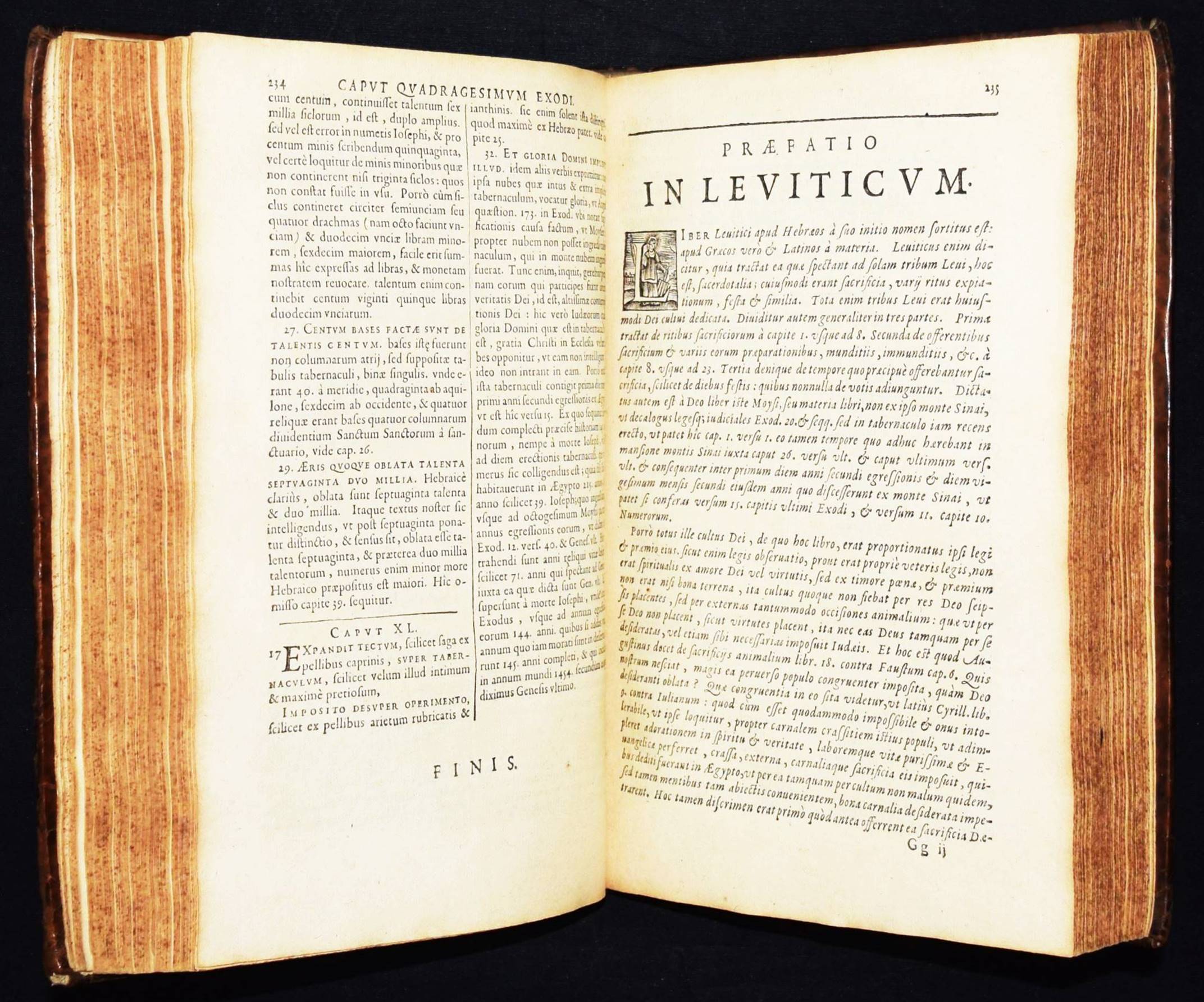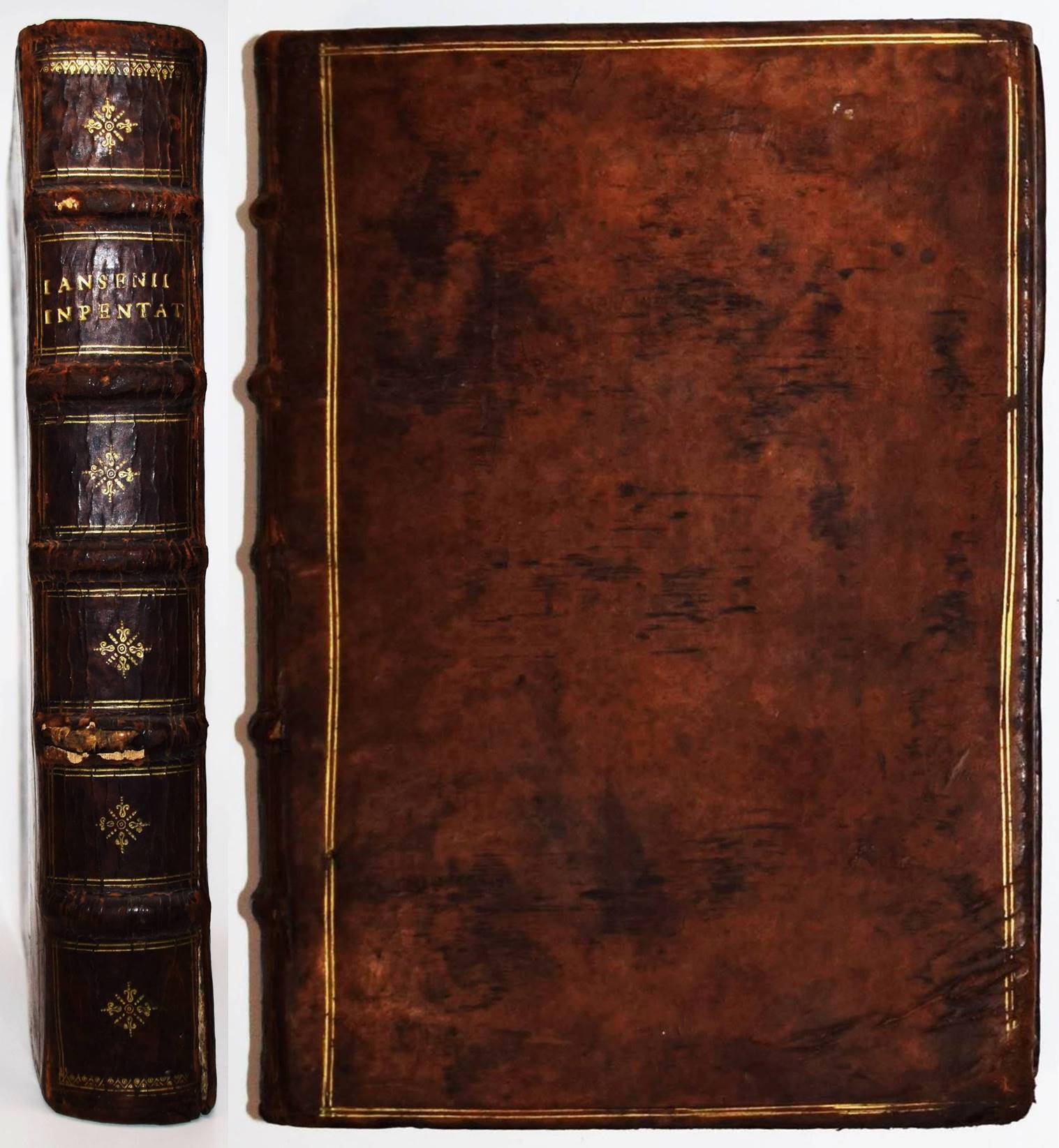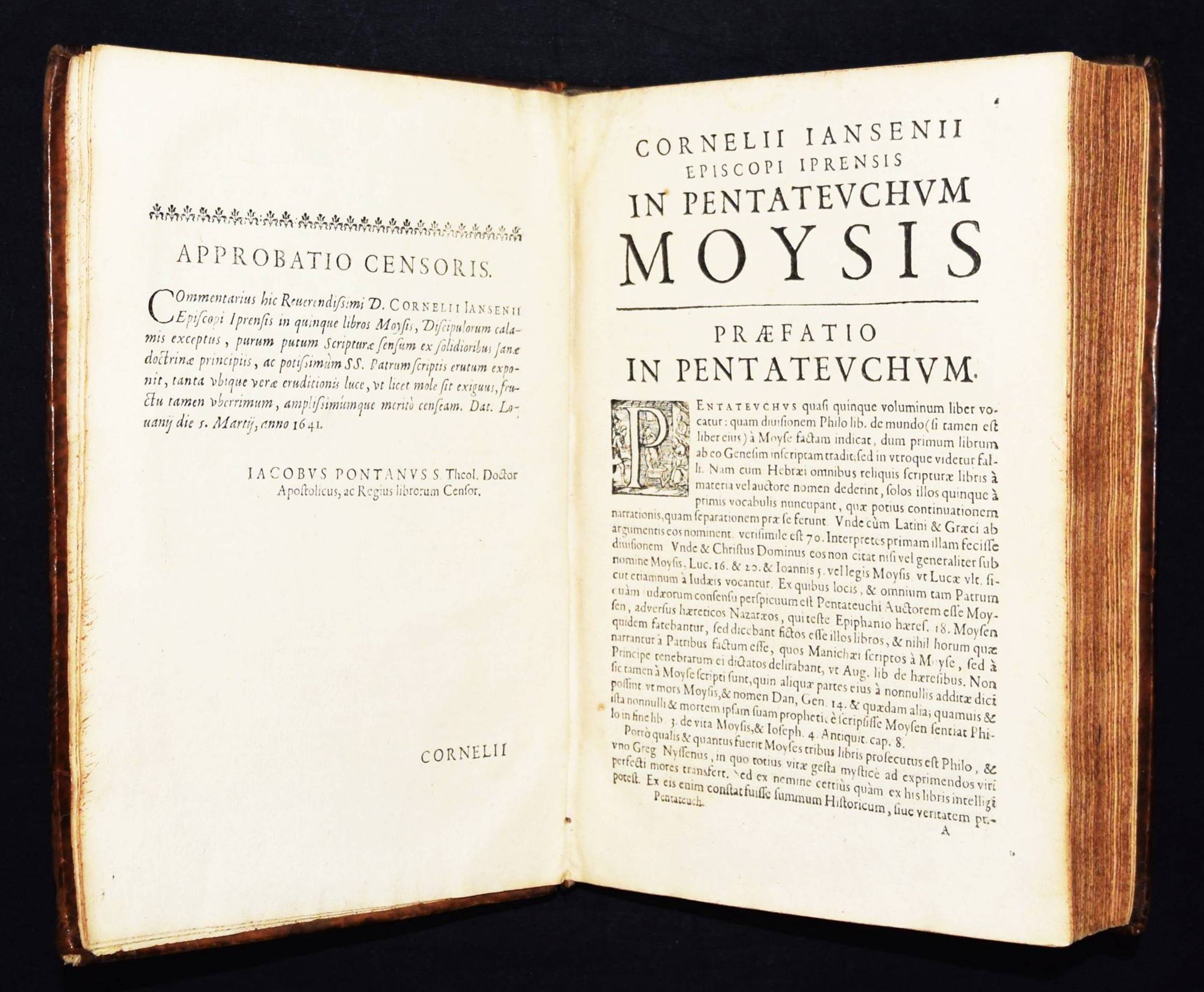 Jansenius, Cornelius. Pentateuchus sive commentarius in quinque libros Moysis. (Beigebunden): Analecta in proverbia, ecclesiasten, sapientiam, habacuc, sophoniam. 2 Teile in 1 Band. Paris, J. Jost 1649. 4° (25,5 x 18,5 cm.). [4] Bl., 408 S., [9] Bl.; 190 S., [8] Bl. mit Titel in Rot u. Schwarz u. Titelvignette in Holzschnitt. Ldr. d. Zt. mit goldgepr. Rückenschild, Rückenverg. u. Deckelfiletten. ADB XIII, 704 ff. BBKL II, Sp. 1551 f. – Der berühmte Thora-Kommentar des niederl. Theologen C. Jansen (1585-1638), des Begründers des Jansenismus. – „Seine Erklärung der alttestamentlichen Bücher zeichnete sich durch Scharfsinn aus“ (J. C. van Slee in ADB). – Vord. Gelenk stellenweise etwas angeplatzt, zeitgenöss. Besitzvermerk a. T., sehr gutes nahezu fleckenfreies und dekorativ gebundenes Exemplar.