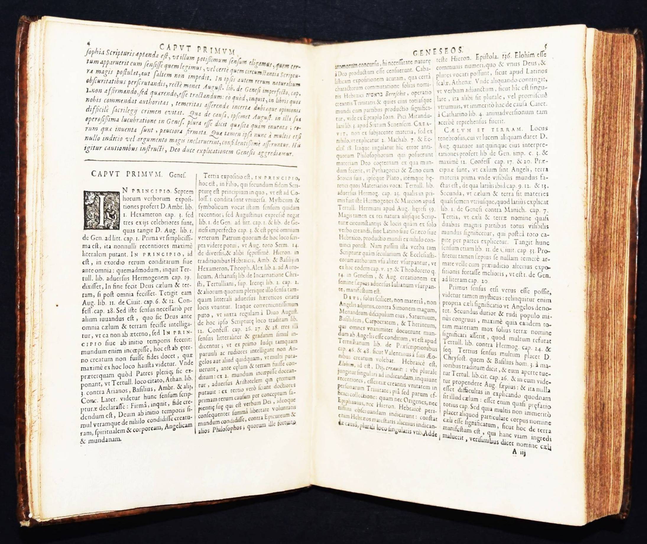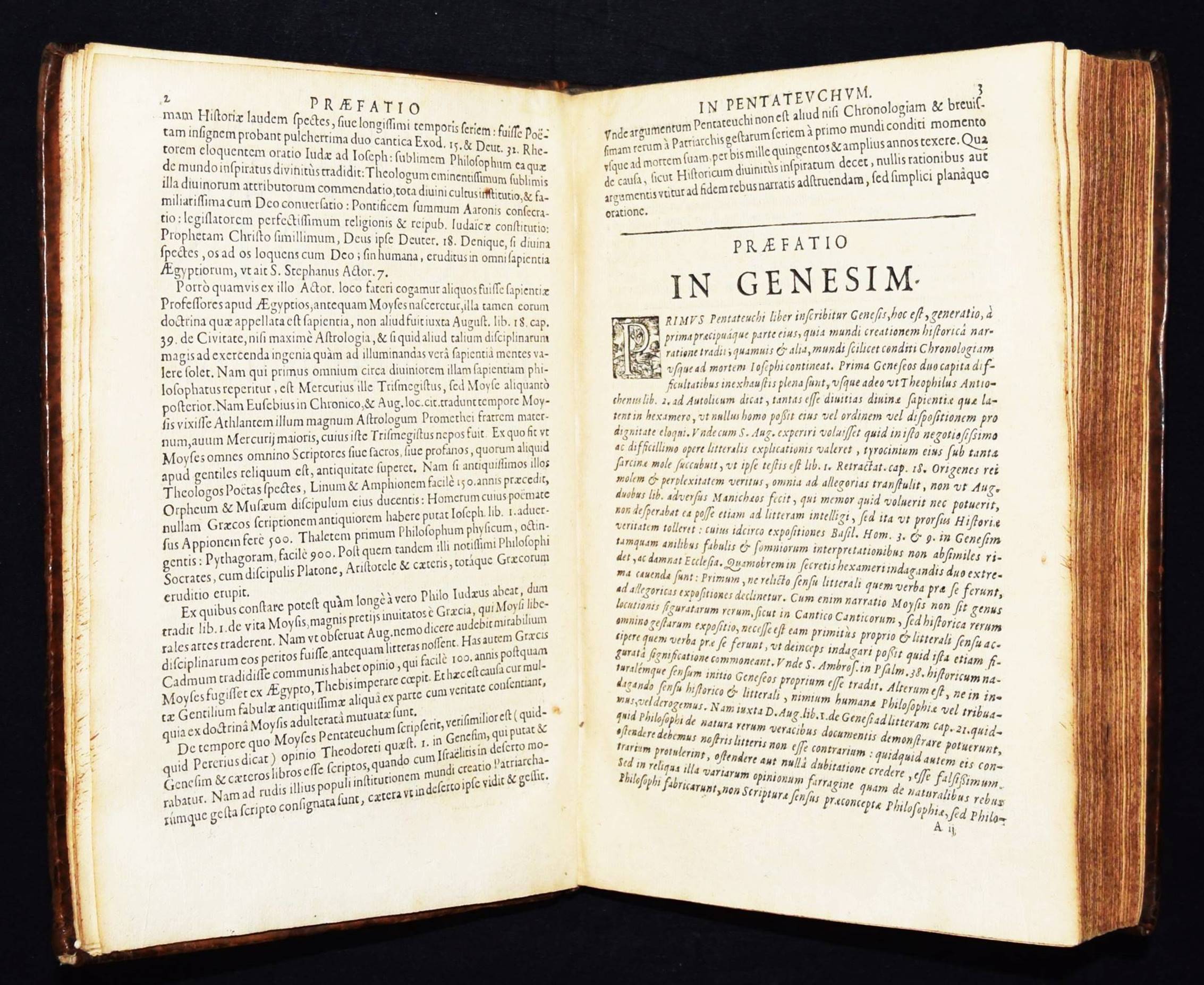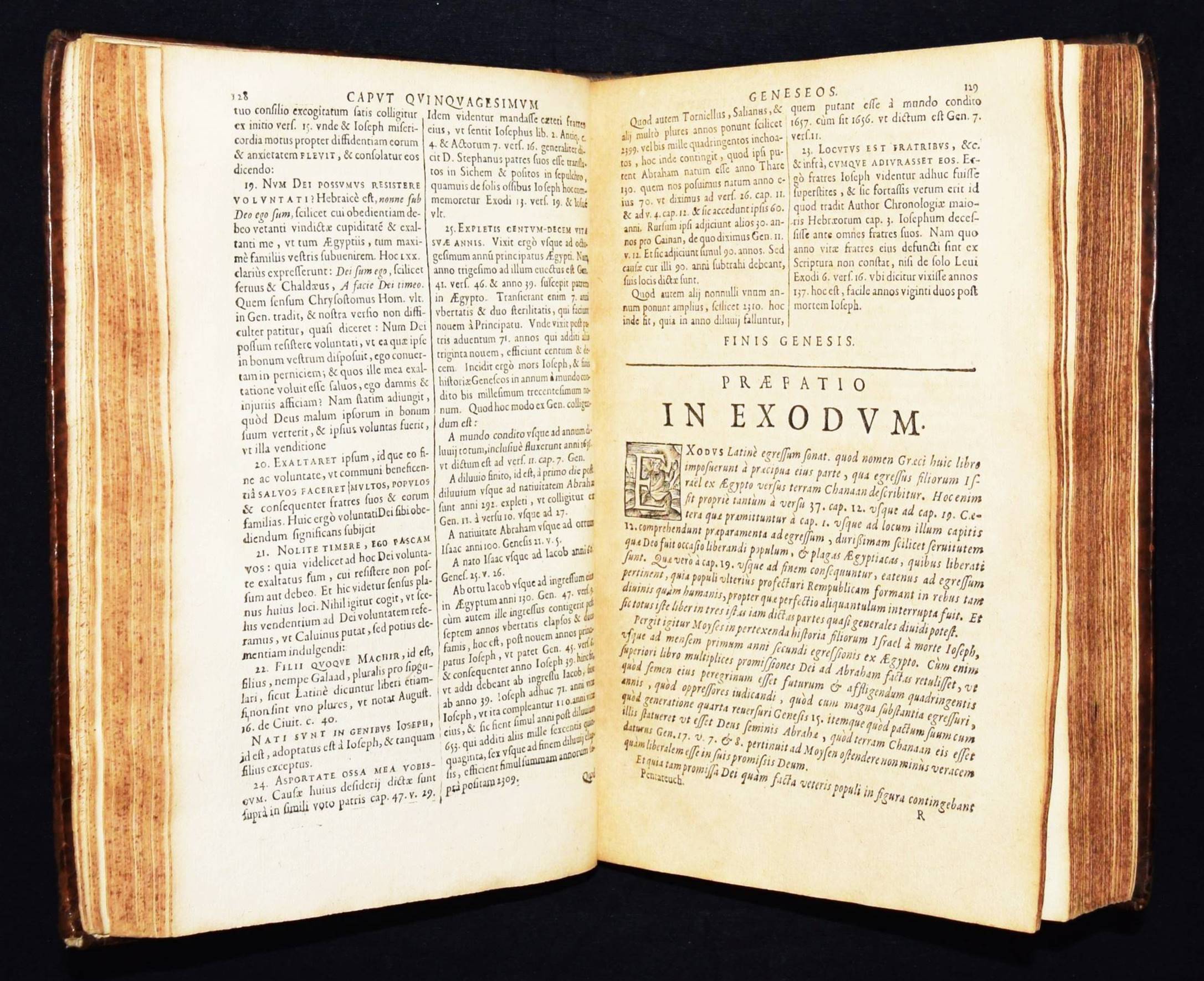 Jansenius, Cornelius. Pentateuchus sive commentarius in quinque libros Moysis. (Beigebunden): Analecta in proverbia, ecclesiasten, sapientiam, habacuc, sophoniam. 2 Teile in 1 Band. Paris, J. Jost 1649. 4° (25,5 x 18,5 cm.). [4] Bl., 408 S., [9] Bl.; 190 S., [8] Bl. mit Titel in Rot u. Schwarz u. Titelvignette in Holzschnitt. Ldr. d. Zt. mit goldgepr. Rückenschild, Rückenverg. u. Deckelfiletten. ADB XIII, 704 ff. BBKL II, Sp. 1551 f. – Der berühmte Thora-Kommentar des niederl. Theologen C. Jansen (1585-1638), des Begründers des Jansenismus. – „Seine Erklärung der alttestamentlichen Bücher zeichnete sich durch Scharfsinn aus“ (J. C. van Slee in ADB). – Vord. Gelenk stellenweise etwas angeplatzt, zeitgenöss. Besitzvermerk a. T., sehr gutes nahezu fleckenfreies und dekorativ gebundenes Exemplar.