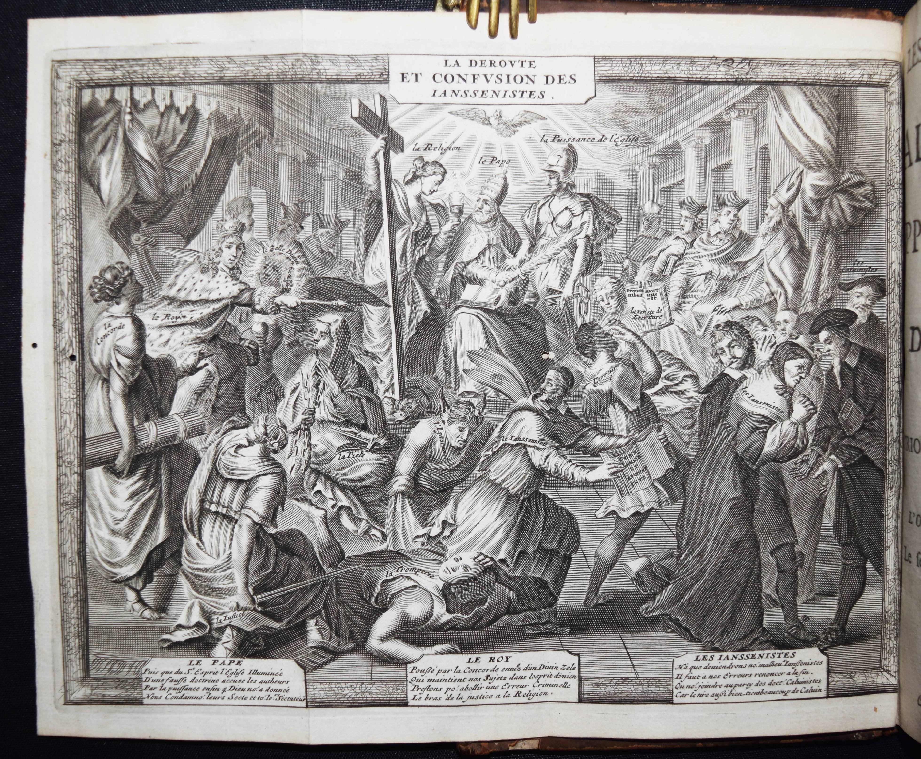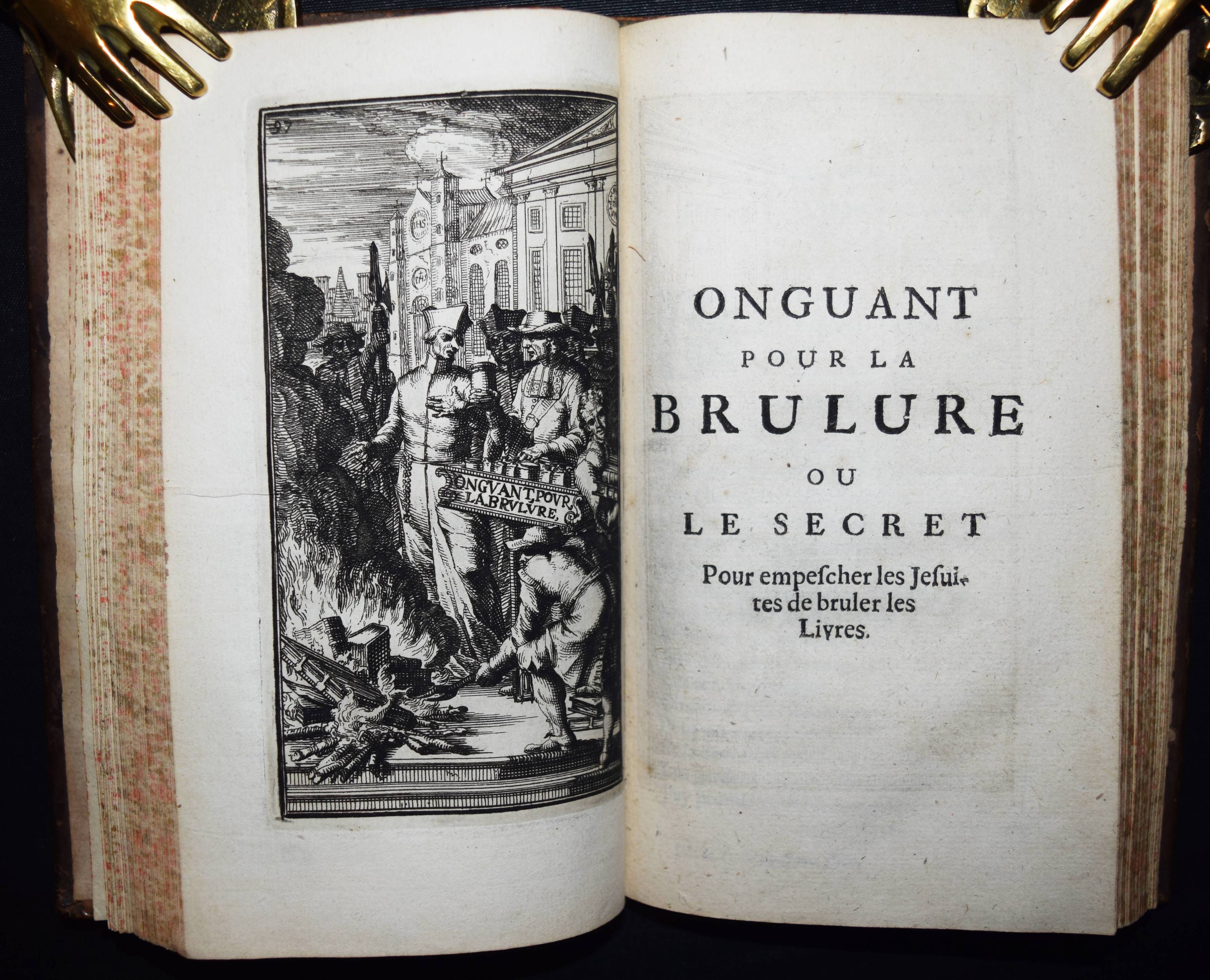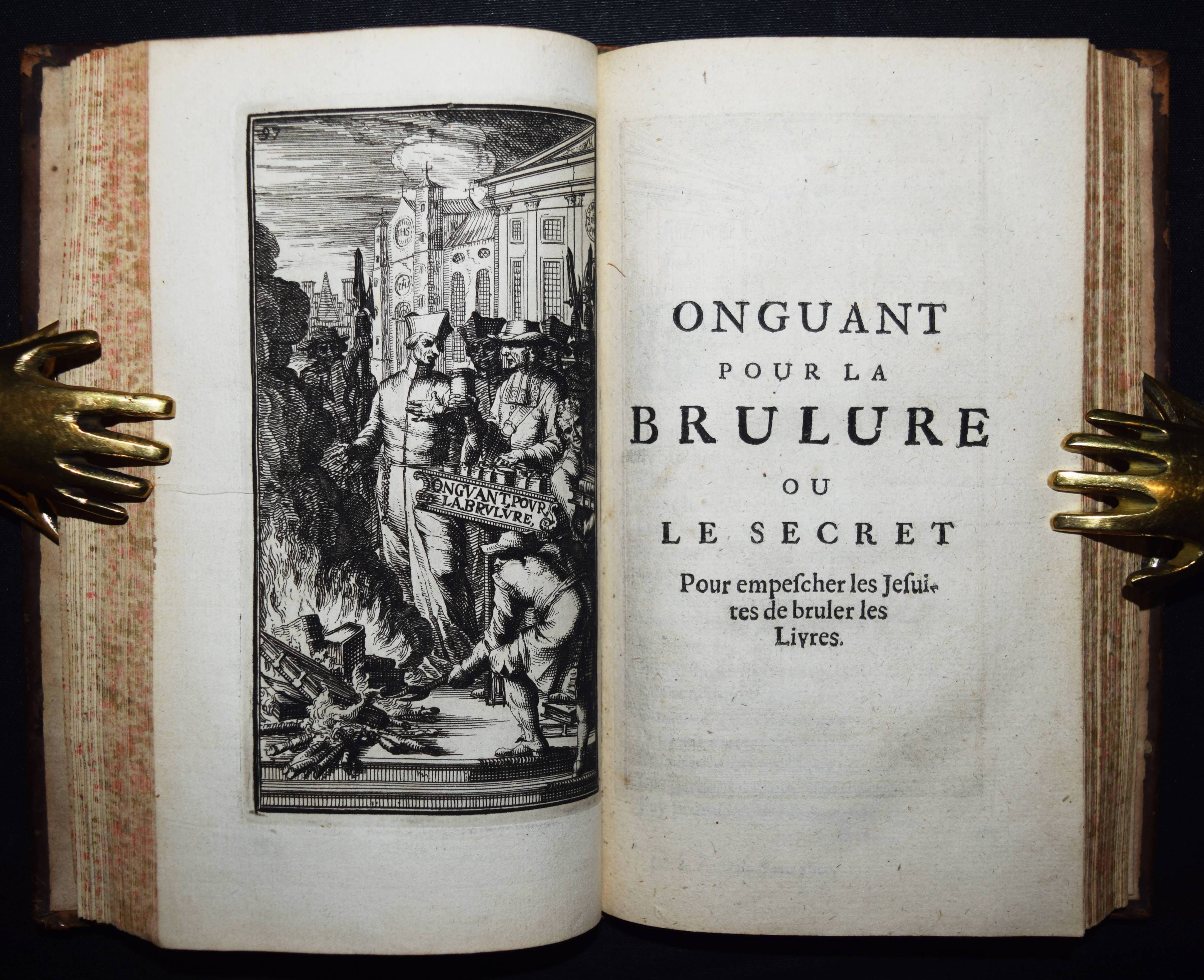 (Le Maistre de Sacy, Isaac-Louis). Les enluminures du fameux almanach des PP. Jésuites, intitulé, la deroute’ et la confusion des Jansenistes. Ou triomphe de Molina Jésuite sur S. Augustin. Avec l’onguant pour la brulure. Ou le secret d’empescher aux Jesuites de Bruler des Livres (par J. Barbier d’Aucour). 3 Teile in 1 Band. Liege (Lüttich), J. le Noir 1683. 8°. [14] Bl., 164, 112 S. mit gestoch. u. gefalt. Frontispiz u. 1 Kupfertafel. Ldr. d. Zt. mit goldgepr. Rückenschild, reicher Rückenverg. u. Kantenverg. Goldsmith J 99. Hoefer XXX, 569. – Erstmals 1654 erschienene Antwort des Zöglings von Port-Royal auf eine von den Jesuiten 1653 herausgegebene Streitschrift „La Déroute et la Confession des Jansénistes“. Lemaistre verteidigt Arnauld, offensichtlich in so gutem Französisch, daß der streng katholisch gesinnte Autor des Hoefer-Artikels ihn hörbar zähneknirschend loben muß: „Cet écrit, d’un goût détestable [der Tritt ans Schienbein], eut du succès dans le parti“ [so, jetzt ist aber Schluß; jetzt gibt er’s ihm kräftig:] „Les autres ouvrages poétiques de Lemaistre de Saci ne valent guère mieux. A peine parmi des milliers de vers en trouve-ton quelques uns de supportables.“ – Die im zweiten Teil enthaltene „Salbe für die Verbrennungen“ von Jean Barbier d’Aucour ist ebenfalls gegen die Jesuiten gerichtet und war erstmals 1664 in Paris erschienen (Hoefer IV, 449). – Die Kupfertafel zeigt eine Bücherverbrennung. – Sehr gutes dekorativ gebundenes Exemplar.