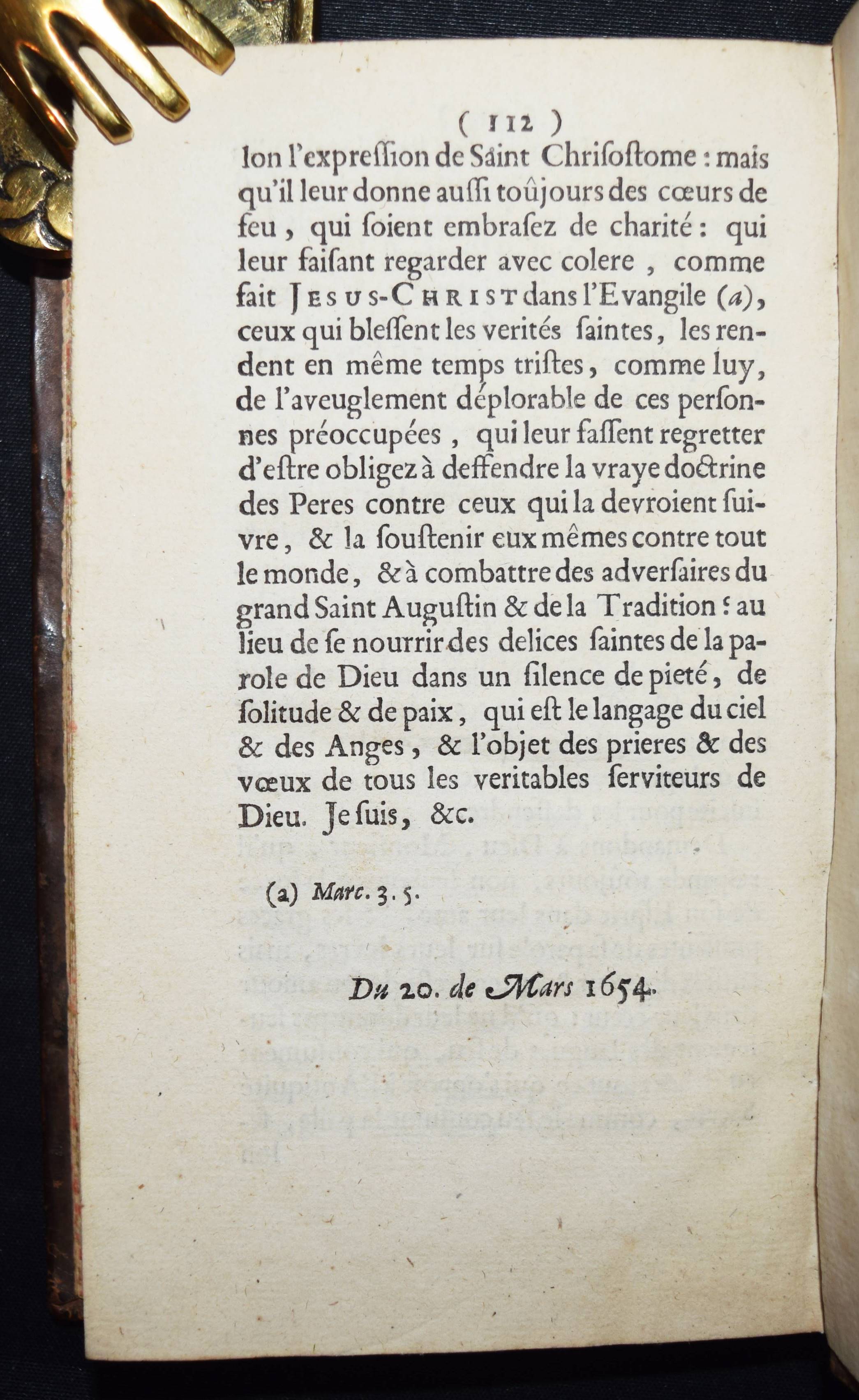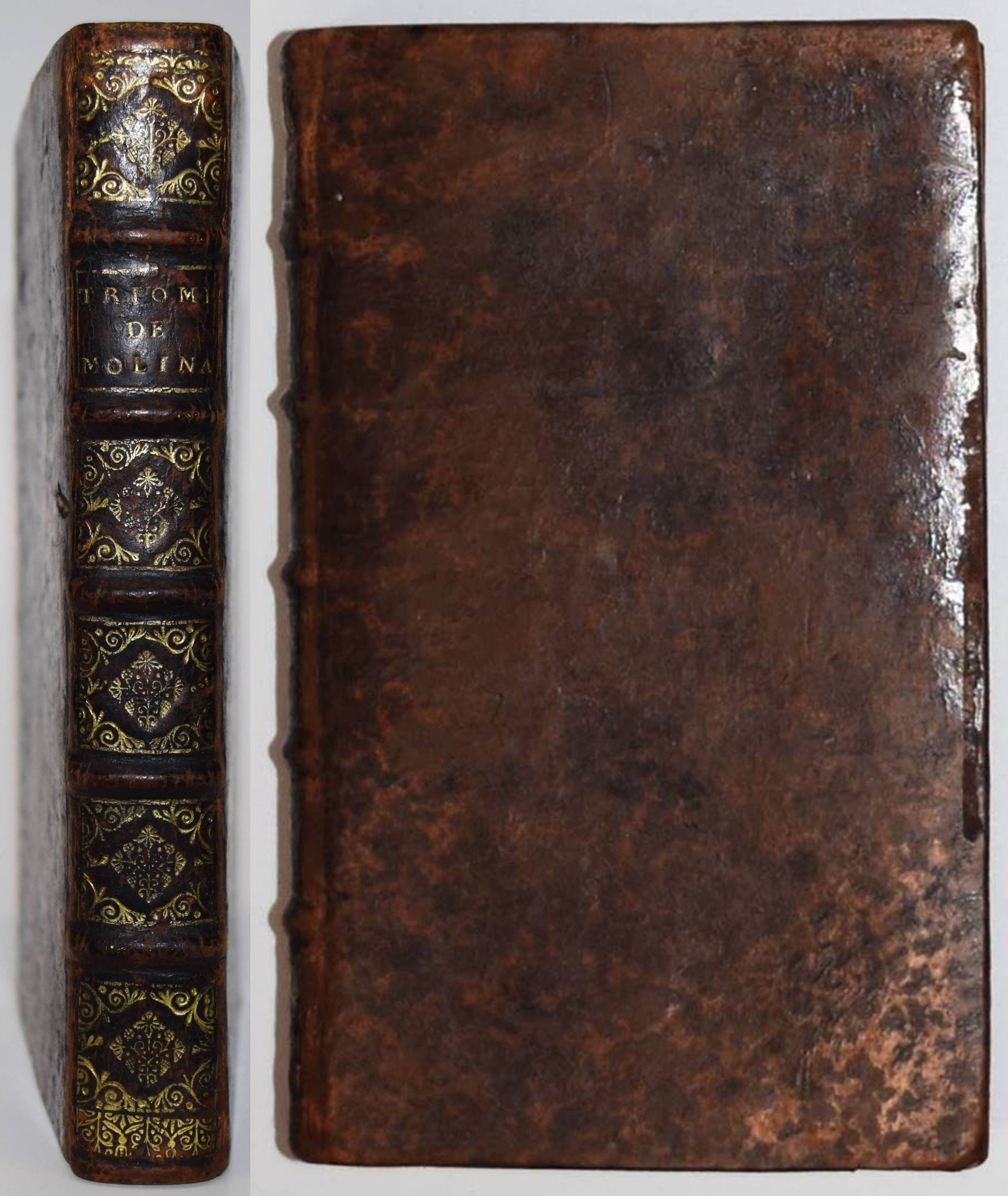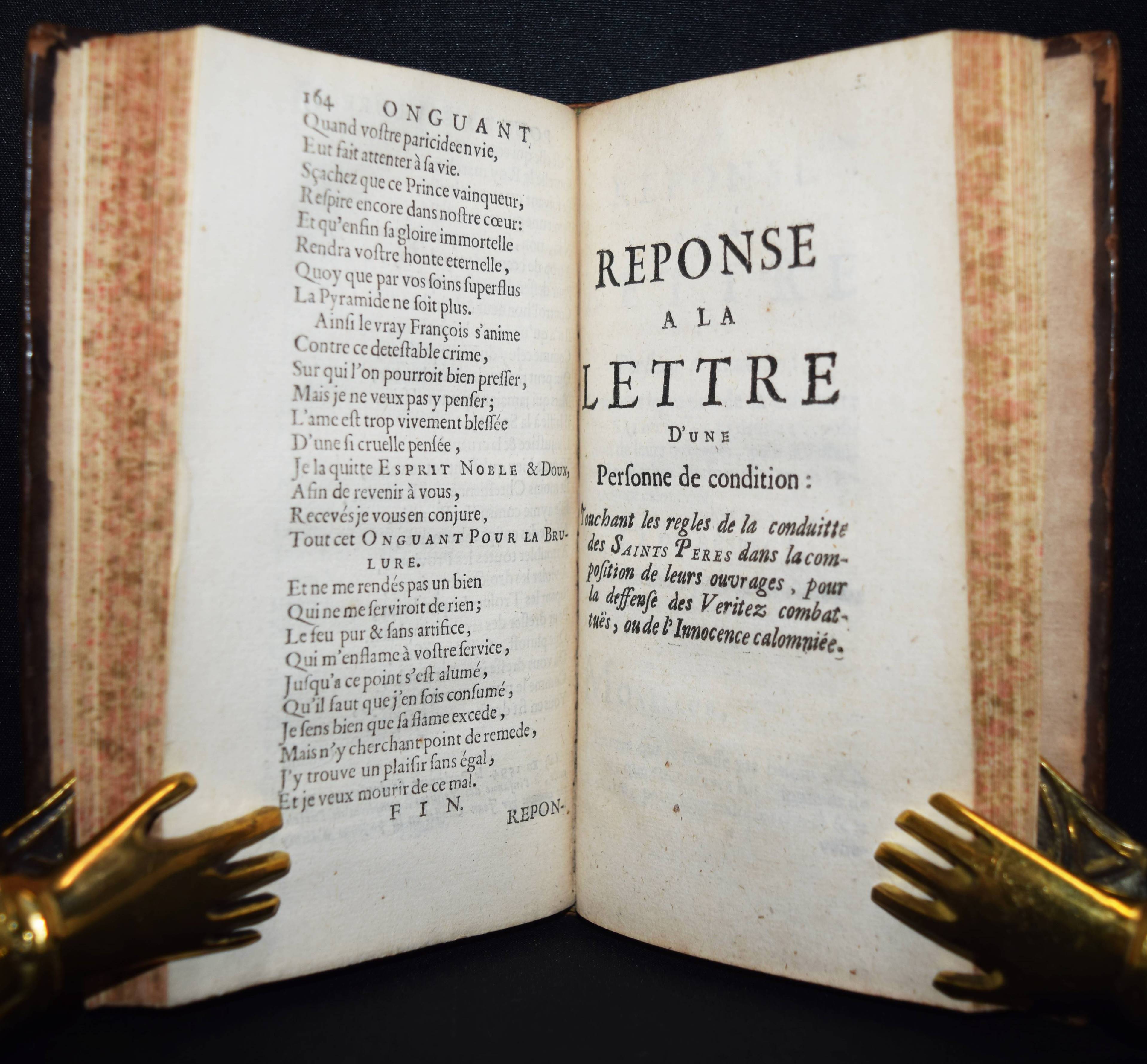 (Le Maistre de Sacy, Isaac-Louis). Les enluminures du fameux almanach des PP. Jésuites, intitulé, la deroute’ et la confusion des Jansenistes. Ou triomphe de Molina Jésuite sur S. Augustin. Avec l’onguant pour la brulure. Ou le secret d’empescher aux Jesuites de Bruler des Livres (par J. Barbier d’Aucour). 3 Teile in 1 Band. Liege (Lüttich), J. le Noir 1683. 8°. [14] Bl., 164, 112 S. mit gestoch. u. gefalt. Frontispiz u. 1 Kupfertafel. Ldr. d. Zt. mit goldgepr. Rückenschild, reicher Rückenverg. u. Kantenverg. Goldsmith J 99. Hoefer XXX, 569. – Erstmals 1654 erschienene Antwort des Zöglings von Port-Royal auf eine von den Jesuiten 1653 herausgegebene Streitschrift „La Déroute et la Confession des Jansénistes“. Lemaistre verteidigt Arnauld, offensichtlich in so gutem Französisch, daß der streng katholisch gesinnte Autor des Hoefer-Artikels ihn hörbar zähneknirschend loben muß: „Cet écrit, d’un goût détestable [der Tritt ans Schienbein], eut du succès dans le parti“ [so, jetzt ist aber Schluß; jetzt gibt er’s ihm kräftig:] „Les autres ouvrages poétiques de Lemaistre de Saci ne valent guère mieux. A peine parmi des milliers de vers en trouve-ton quelques uns de supportables.“ – Die im zweiten Teil enthaltene „Salbe für die Verbrennungen“ von Jean Barbier d’Aucour ist ebenfalls gegen die Jesuiten gerichtet und war erstmals 1664 in Paris erschienen (Hoefer IV, 449). – Die Kupfertafel zeigt eine Bücherverbrennung. – Sehr gutes dekorativ gebundenes Exemplar.