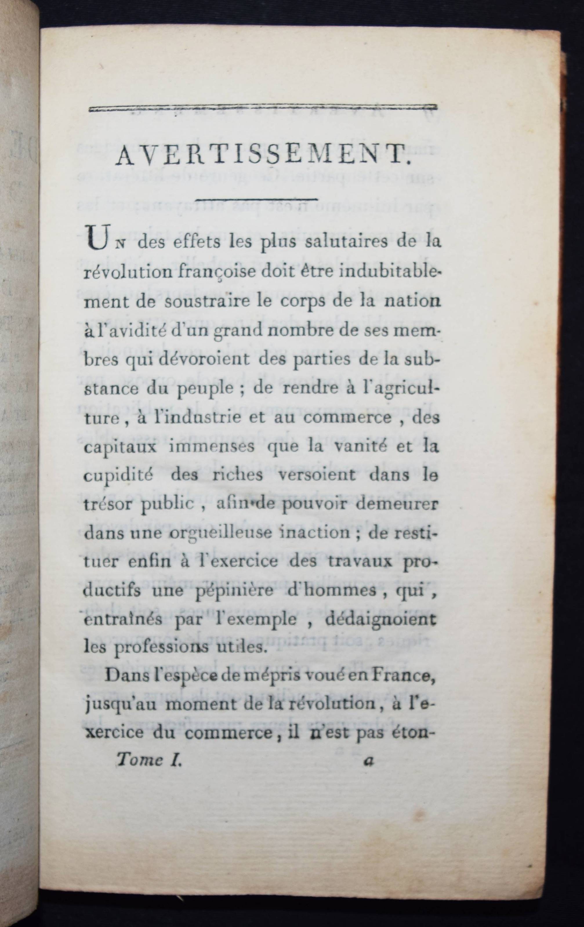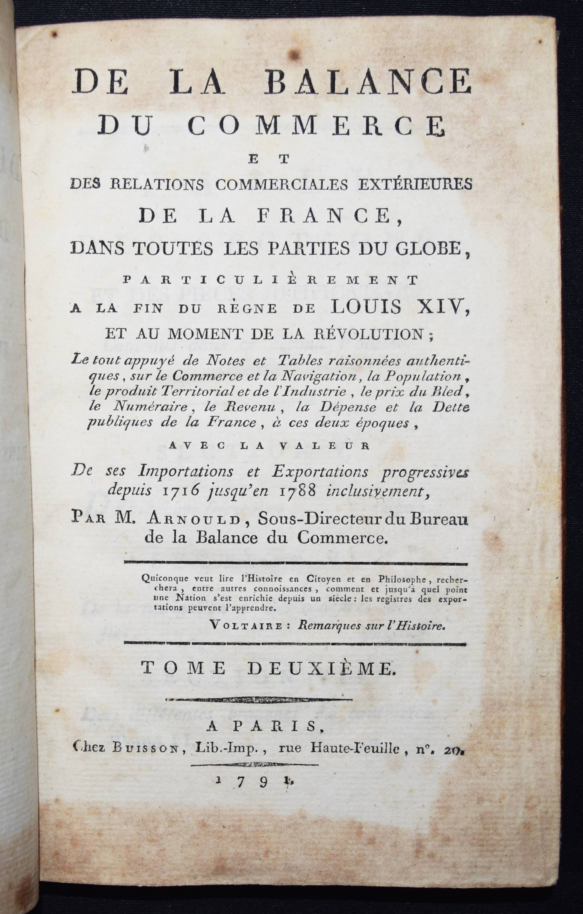 Arnould, (Ambroise Marie Henry). De la balance du commerce et des relations commerciales extérieures de la France. Dans toutes les parties du globe, particulièrement à la fin du règne de Louis XIV et au moment de la révolution. … Avec la valeur de ses importations et exportations progressives depuis 1716 jusqu’en 1788 inclusivement. 2 Bände. Paris, Buisson 1791. 8°. [2] Bl., XV, (1), 335 S.; VIII, 304 S. mit einigen Tabellen. Ldr. d. Zt. mit goldgepr. Rückensch. u. Rückenverg. Einaudi 161. Goldsmiths 14698. Kress B. 2879 (nur Band II). Monglond II, 423. – Seltene erste Ausgabe; wie meist ohne den Tabellenband, der wohl nur in einer wesentlich geringeren Auflage gedruckt wurde. – Wichtiges Quellenwerk zur Handelsgeschichte Europas. – Der franz. Jurist und Finanzfachmann A. M. H. Arnould (1757-1812) war seit 1791 Direktor verschiedener Handelsverbände, später Mitglied im Rat der Fünfhundert und im Tribunat (1799). – „M. Arnould a publié plusieurs ouvrages sur des matières de finances et d’économie politique. Aucun de ces écrits n’est classique. Cependant on a trop ravalé sa capacité. Ses occupations passées ne sont pas sans rapport avec les fonctions qu’il remplit aujourd’hui et je le range parmi ceux de nos juges qui travaillent utilement“ (F. Barbé-Marbois, Präsident des Rechnungshofes 1808). – Rücken etwas berieben, Gelenke teils etwas spröde, St.a.T., stellenweise gebräunt und etwas braunfleckig, gutes dekorativ gebundenes Exemplar.