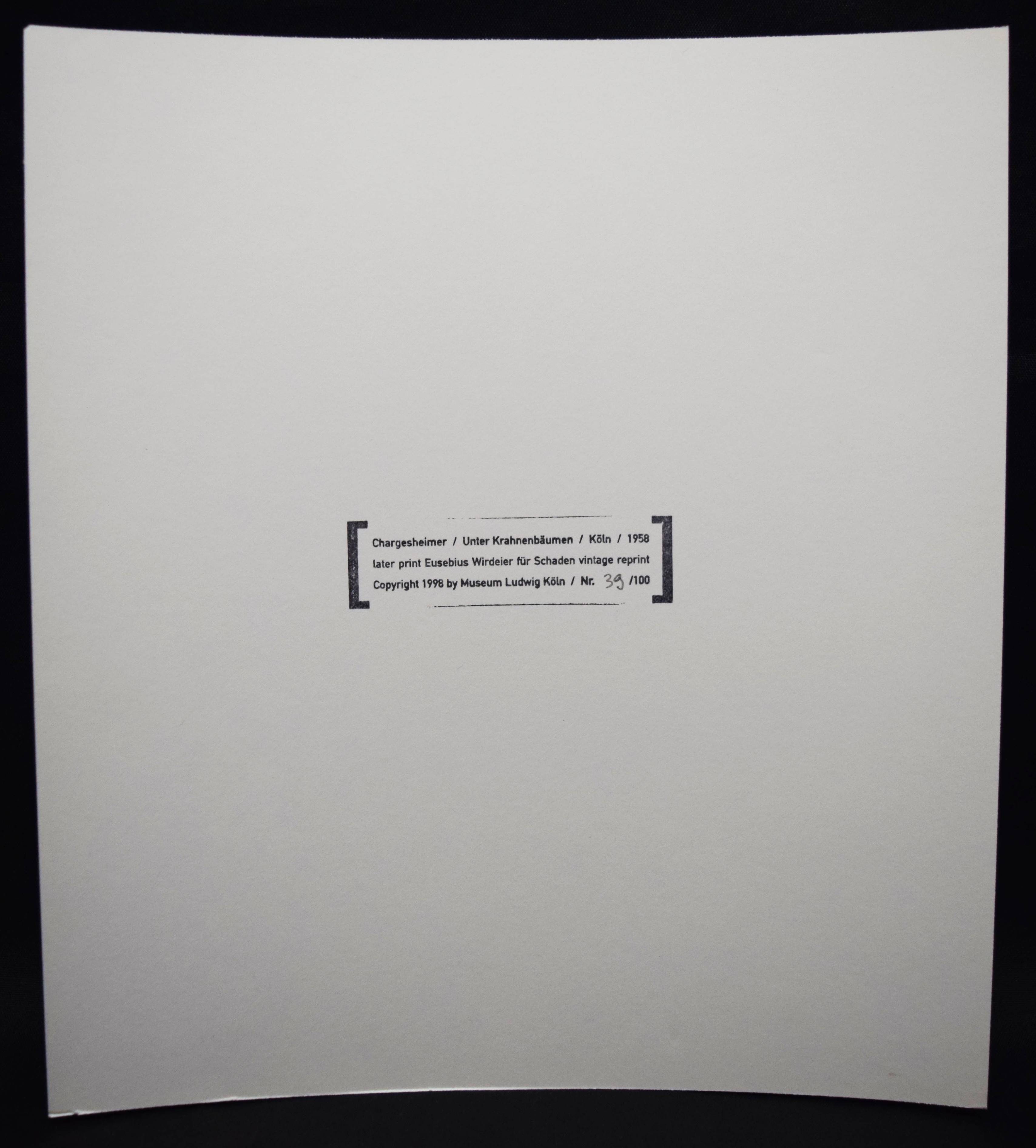 Chargesheimer (d. i. Karl-Heinz Hargesheimer). Unter Krahnenbäumen. Bilder aus einer Straße. Mit einem Text von Heinrich Böll. (Vintage reprint der 1958 im Greven Verlag Köln erschienenen Originalausgabe. 1998 neu herausgegeben, gestaltet und hergestellt von Eusebius Wirdeier). Bornheim, M. u. C. Schaden (1998). Gr.-8°. [58] Bl. mit zahlr. Abb. auf Tafeln u. 1 num. Orig.-Photographie (Silbergelatine, 23 x 20,7 cm.). Illustr. OPbd. mit illustr. OU. in illustr. Orig.-Pappschuber. Vgl. Heidtmann 19603. Heiting/Wiegand 132 f. Koetzle 86 f. – Eines von 100 Exemplaren der Vorzugsausgabe mit num. (Nr. 39) Silbergelatine-Abzug. Das Foto zeigt eine Personengruppe in Karnevalskostümen von hinten aufgenommen und ist im Buch auf Blatt 8 abgebildet. – „Vielleicht wird nur in Straßen, wie diese eine ist, richtig gelebt.“ (Heinrich Böll). – Sehr gutes Exemplar.