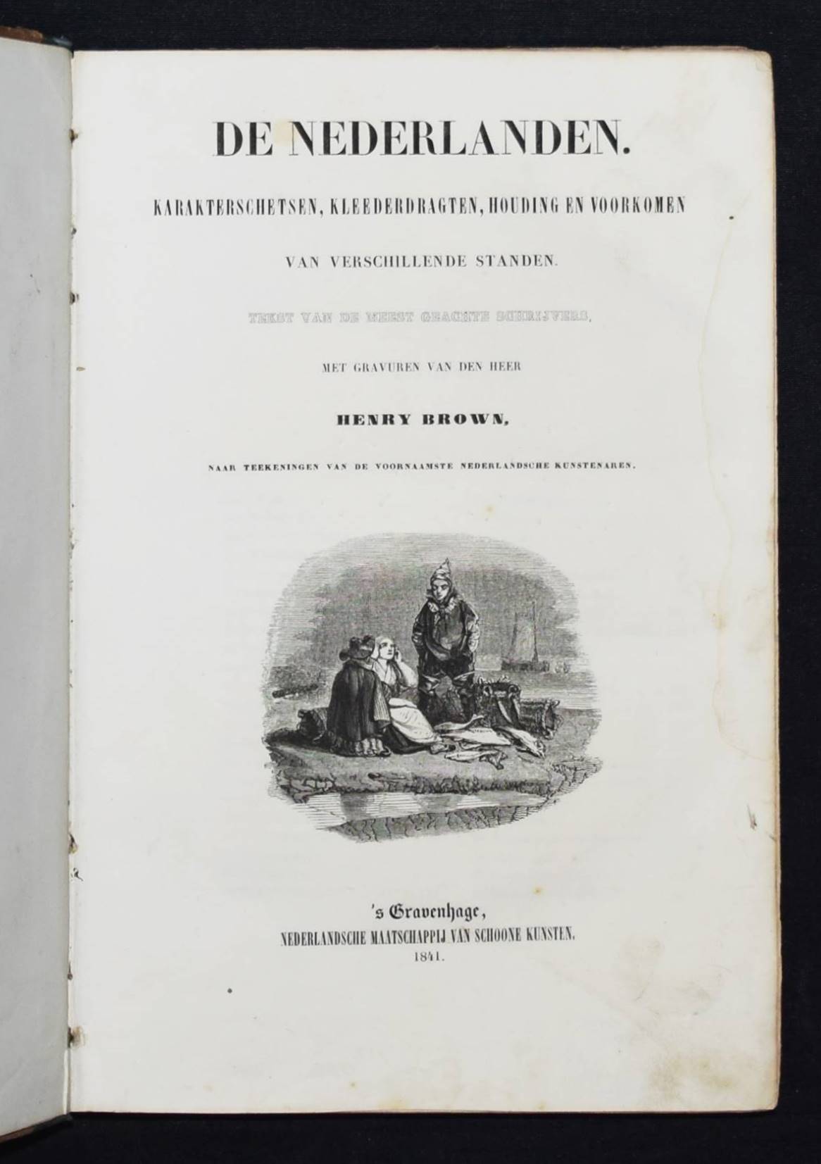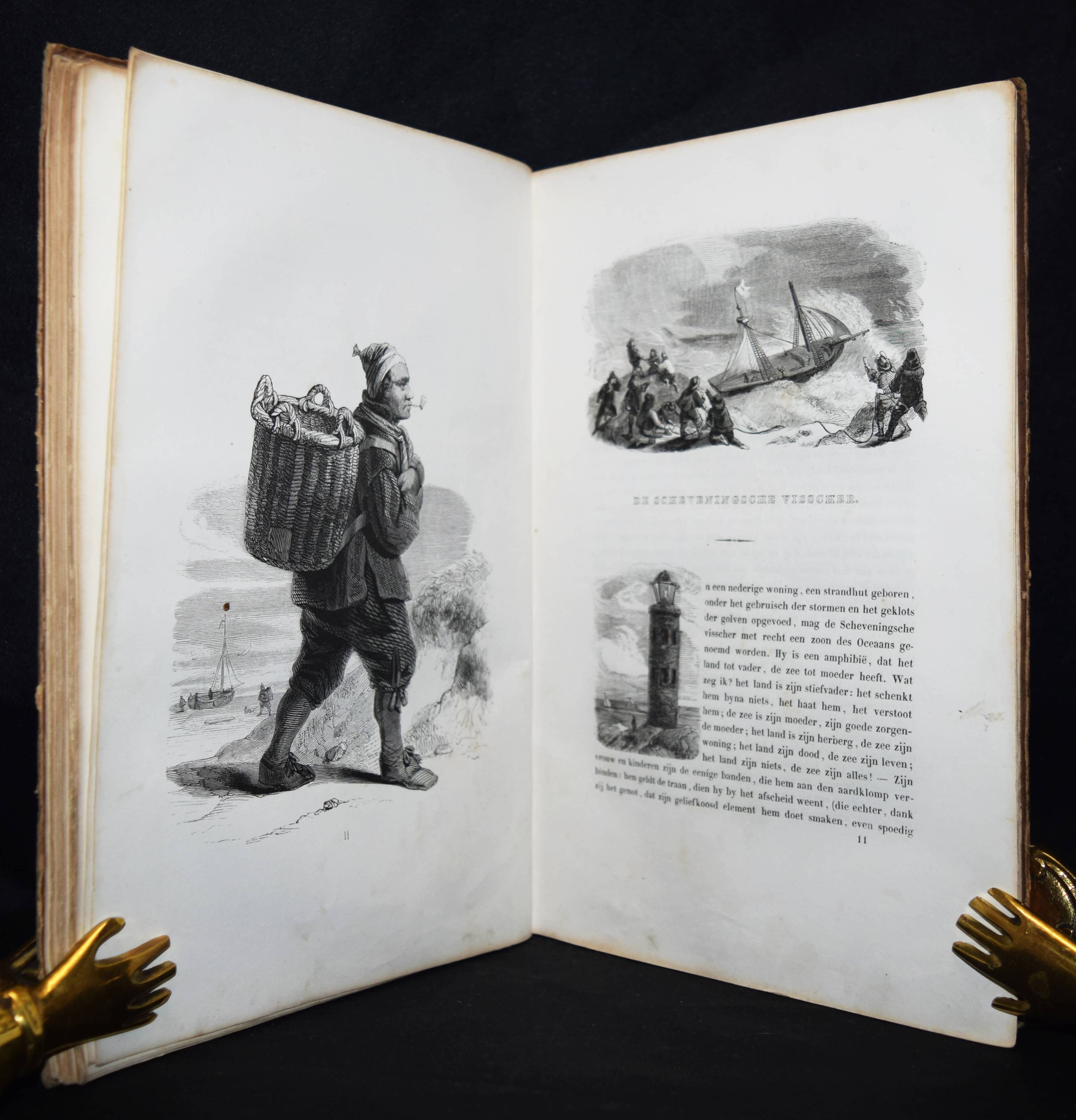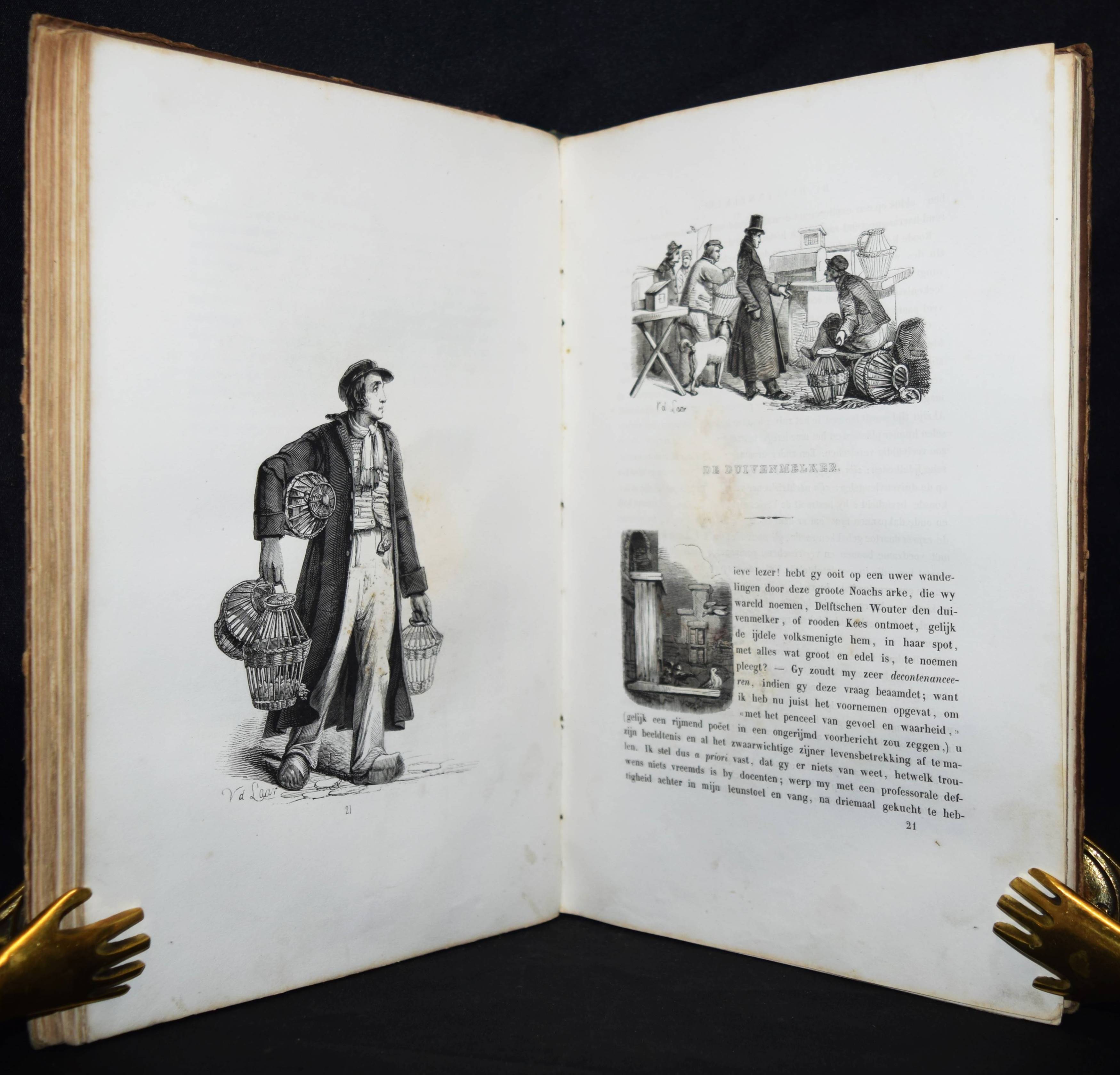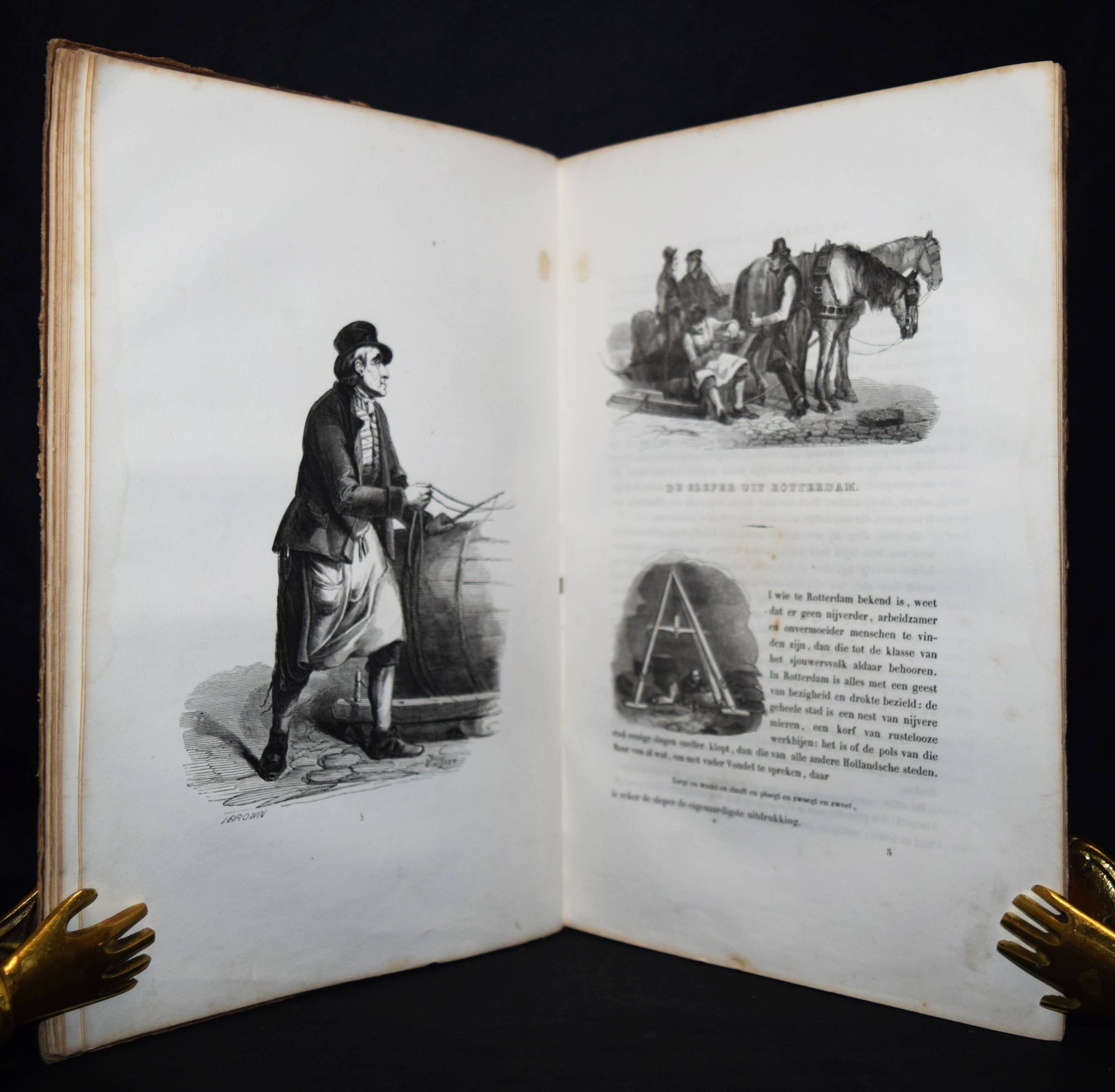 (Lennep, Jacob van, Nicolaas Beets, J. P. Heije, J. J. L. ten Kate e. a.). De Nederlanden. Karakterschetsen, kleederdragten, houding en voorkomen van verschillende standen. Tekst van de meest geachte schrijvers, met gravuren van den heer Henry Brown, naar teekeningen van de voornaamste Nederlandsche kunstenaren. Gravenhage, Nederlandsche Maatschappij van Schoone Kunsten 1841. Gr.-8°. [4] Bl., 164 S. mit 168 (42 ganzs.) Holzstich-Illustrationen. OHln. Colas 458 – Hiler 646 – Lipperheide 965 – Einzige Ausgabe. – Mit Berufsdarstellungen wie Barbier, Schiffersknecht, Milchmädchen, Jäger, Schornsteinfeger, Tierarzt u. a. – Deckel stärker berieben, angestaubt und etwas fleckig, sonst nur vereinzelt etwas fleckig und gut erhalten.