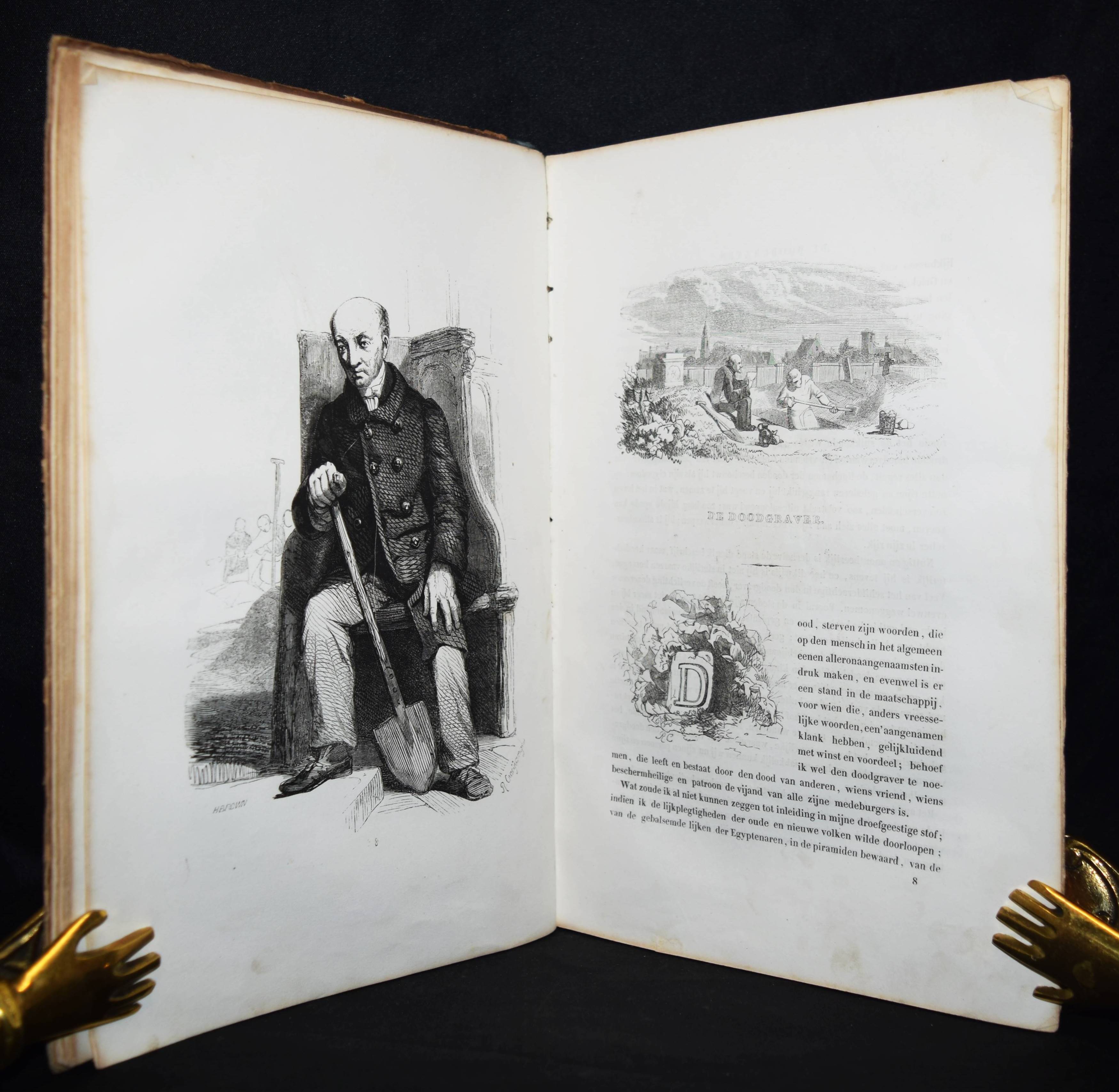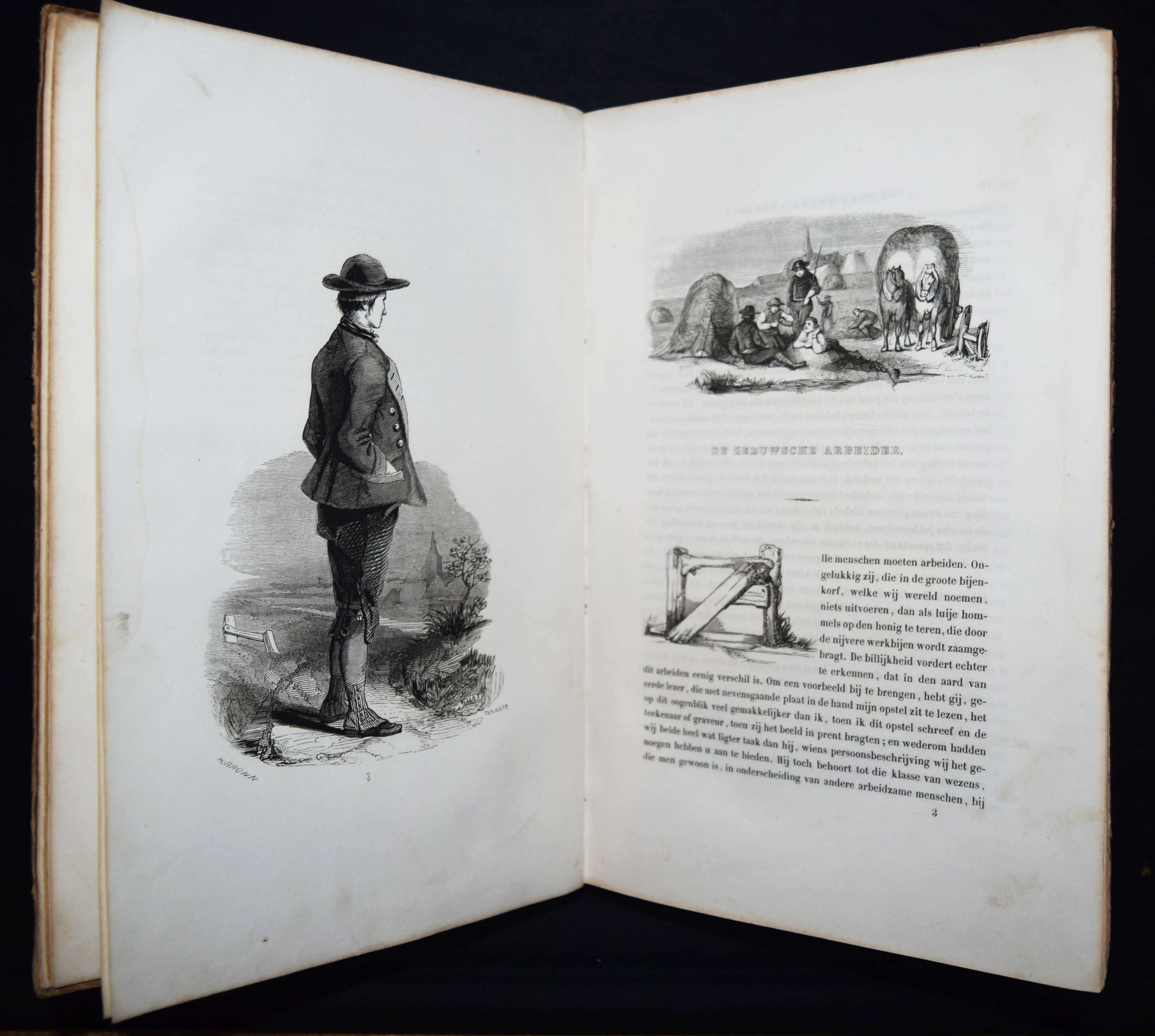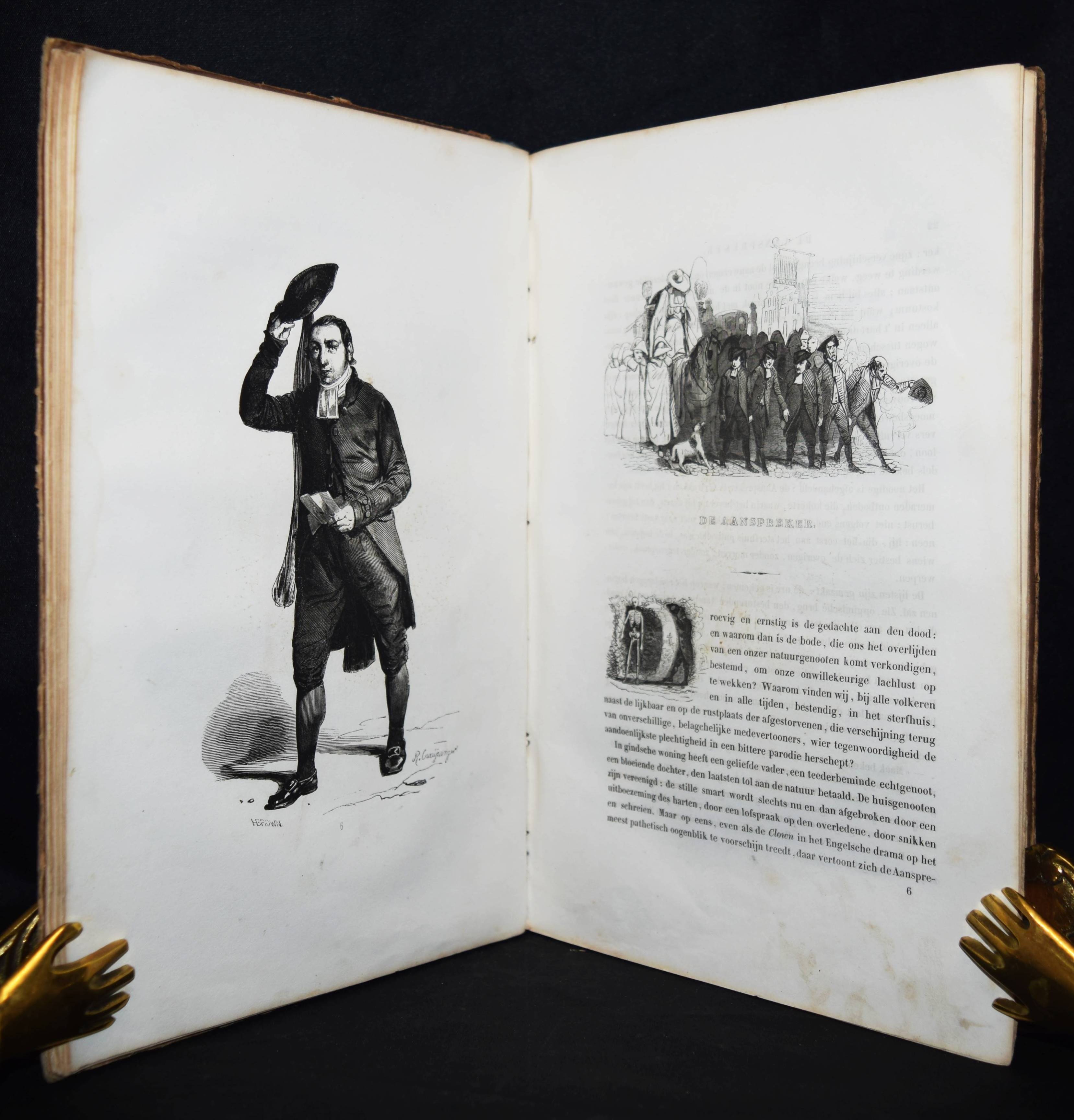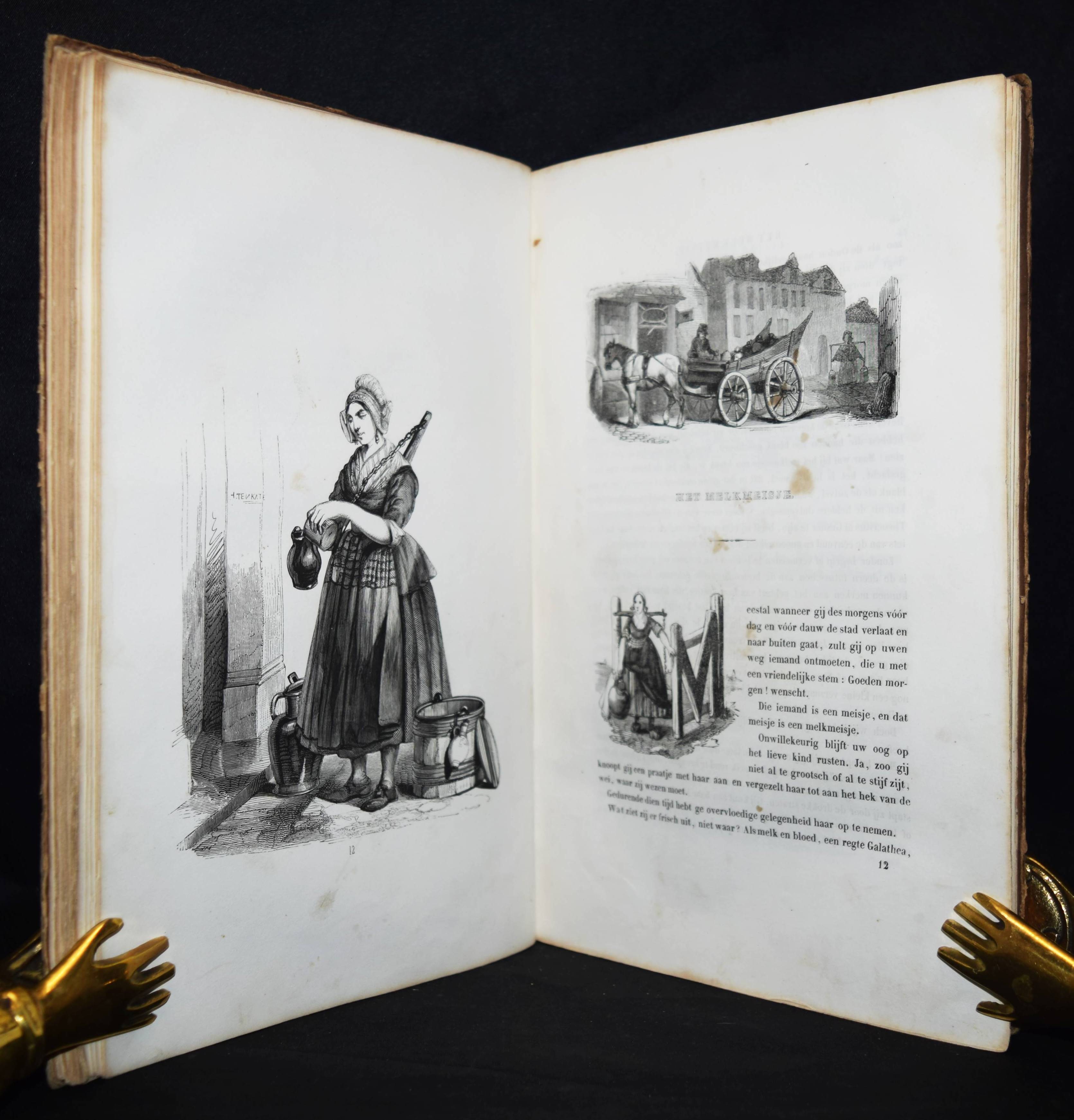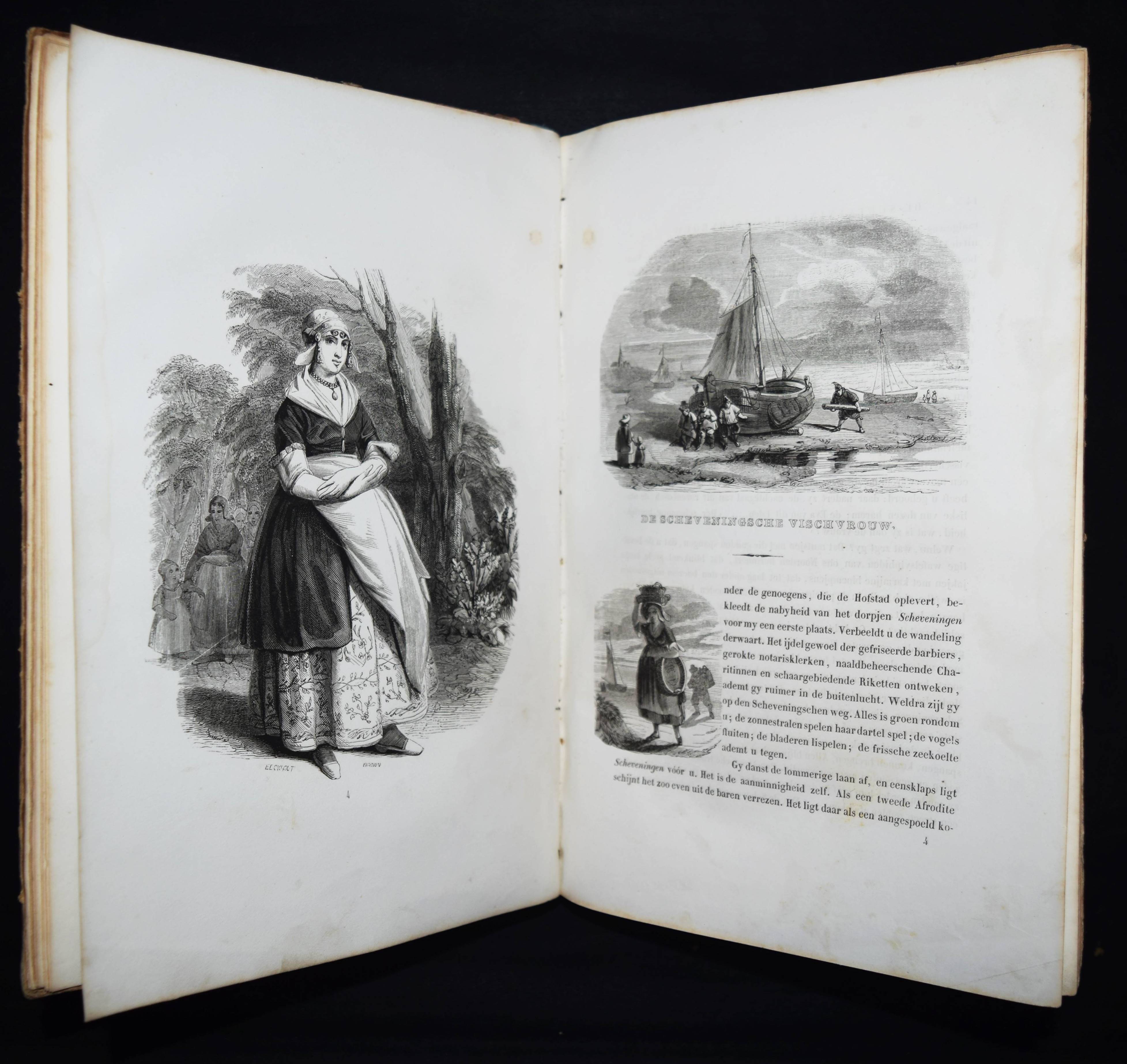(Lennep, Jacob van, Nicolaas Beets, J. P. Heije, J. J. L. ten Kate e. a.). De Nederlanden. Karakterschetsen, kleederdragten, houding en voorkomen van verschillende standen. Tekst van de meest geachte schrijvers, met gravuren van den heer Henry Brown, naar teekeningen van de voornaamste Nederlandsche kunstenaren. Gravenhage, Nederlandsche Maatschappij van Schoone Kunsten 1841. Gr.-8°. [4] Bl., 164 S. mit 168 (42 ganzs.) Holzstich-Illustrationen. OHln. Colas 458 – Hiler 646 – Lipperheide 965 – Einzige Ausgabe. – Mit Berufsdarstellungen wie Barbier, Schiffersknecht, Milchmädchen, Jäger, Schornsteinfeger, Tierarzt u. a. – Deckel stärker berieben, angestaubt und etwas fleckig, sonst nur vereinzelt etwas fleckig und gut erhalten.