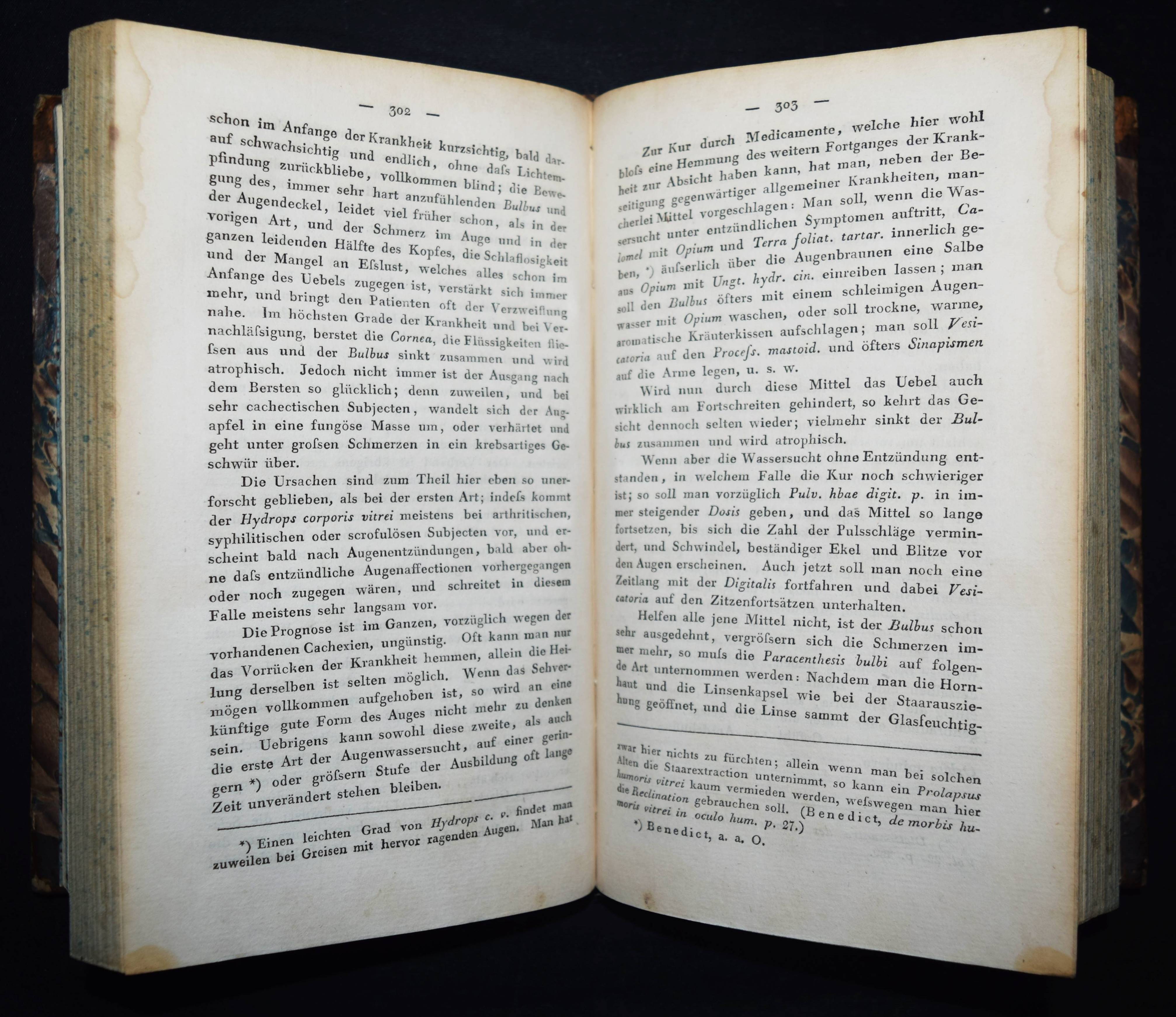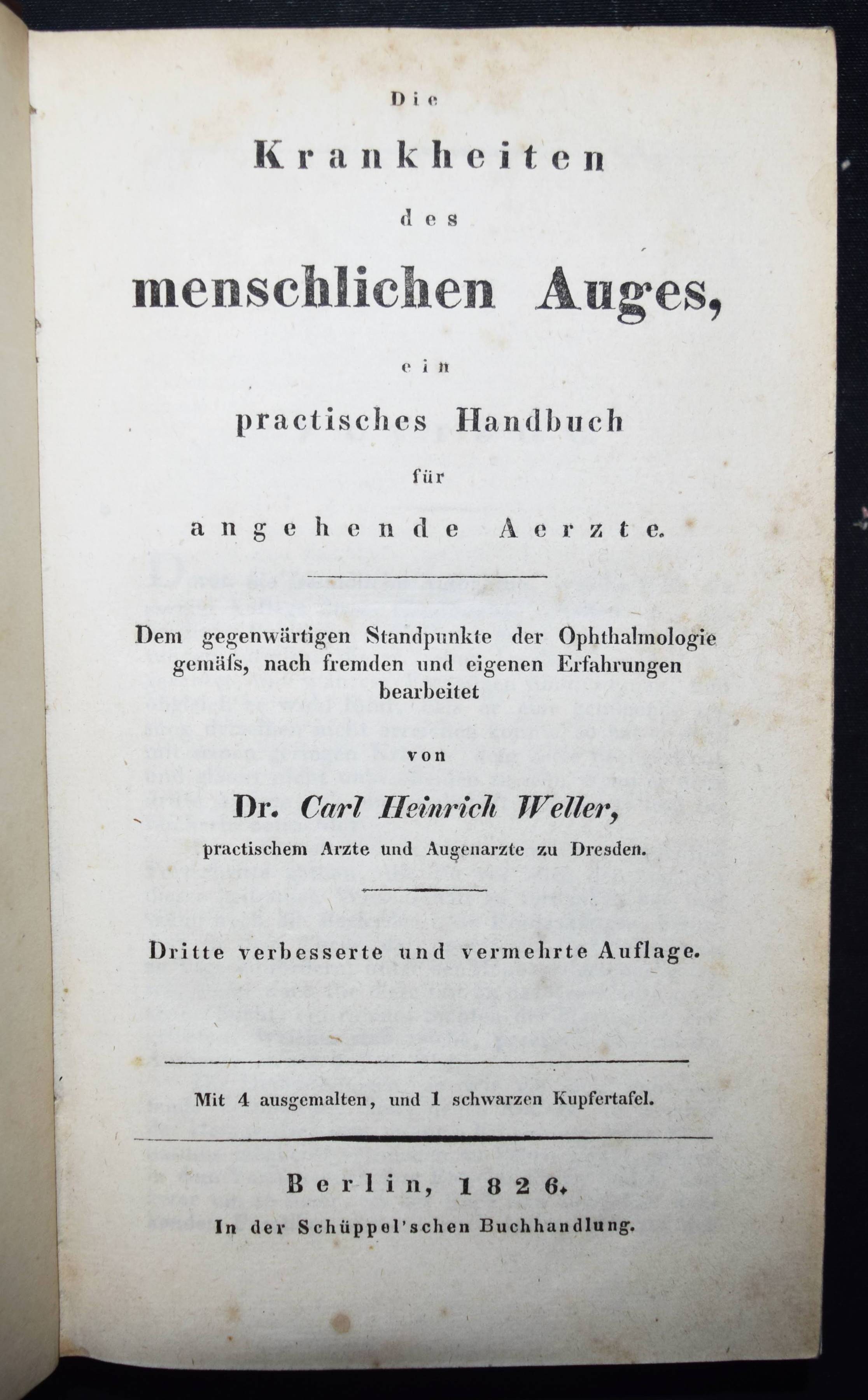 | Weller, Carl Heinrich. Die Krankheiten des menschlichen Auges, ein practisches Handbuch für angehende Aerzte. Dem gegenwärtigen Standpuncte der Ophthalmologie gemäss, nach fremden und eigenen Erfahrungen bearbeitet. 3. verb. u. verm. Aufl. Berlin, Schüppel 1826. 8°. XXVI, 610 S. mit 5 (4 handkol.) Kupfertafeln. Hldr. d. Zt. mit goldgepr. Rückenschild u. Rückenverg. Engelmann 624 (4. Aufl. 1830). Hirsch/Hüb. V, 891. Lesky 704. – Klassiker der Augenheilkunde. – Carl Heinrich Weller (1794-1854) gab bereits 1819, als 25jähriger, das Lehrbuch heraus. – Einband etwas berieben, vord. Gelenk oben restauriert, nur vereinzelt etwas braunfleckig, sehr gutes dekorativ gebundenes Exemplar.