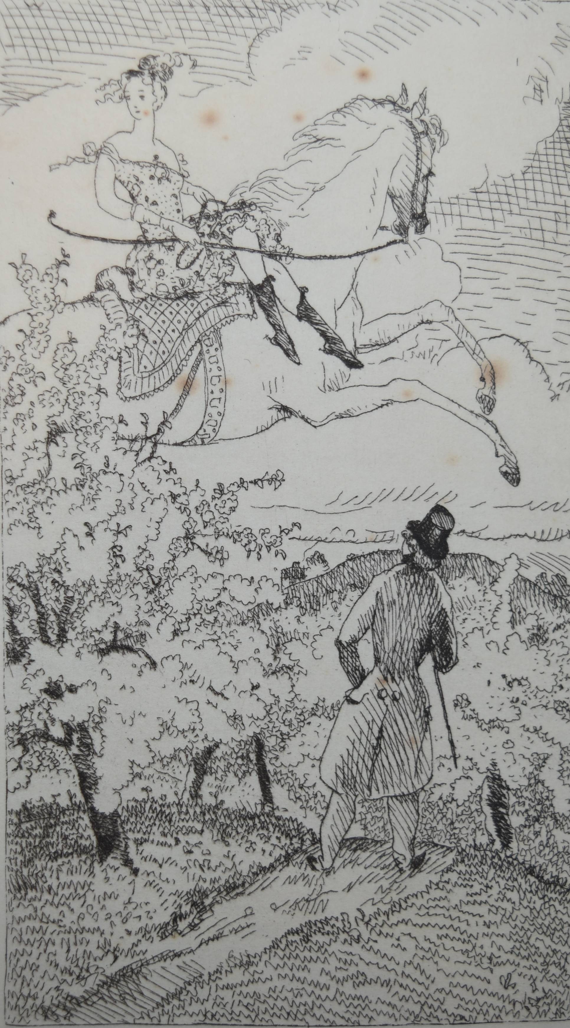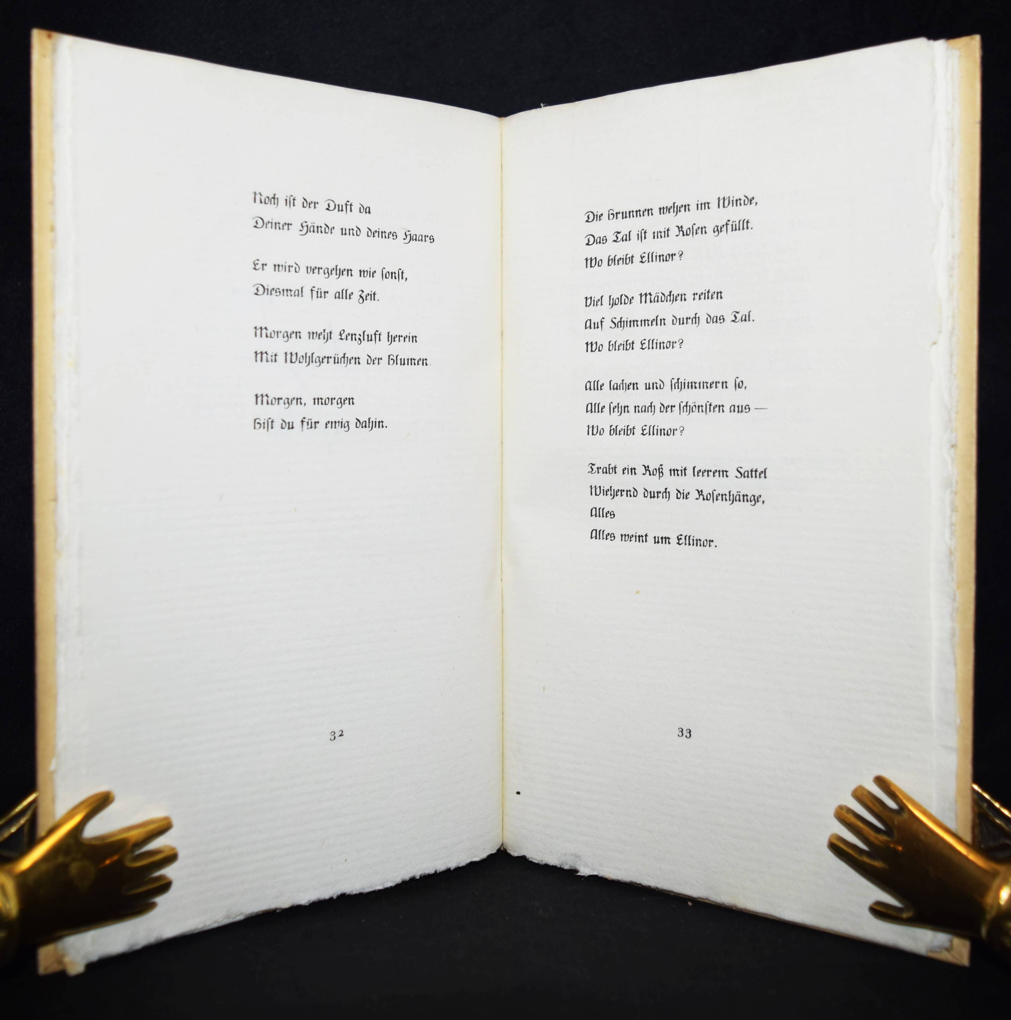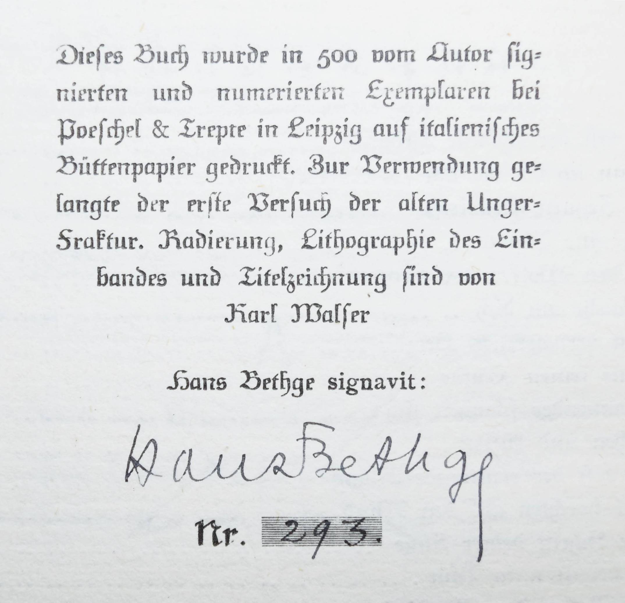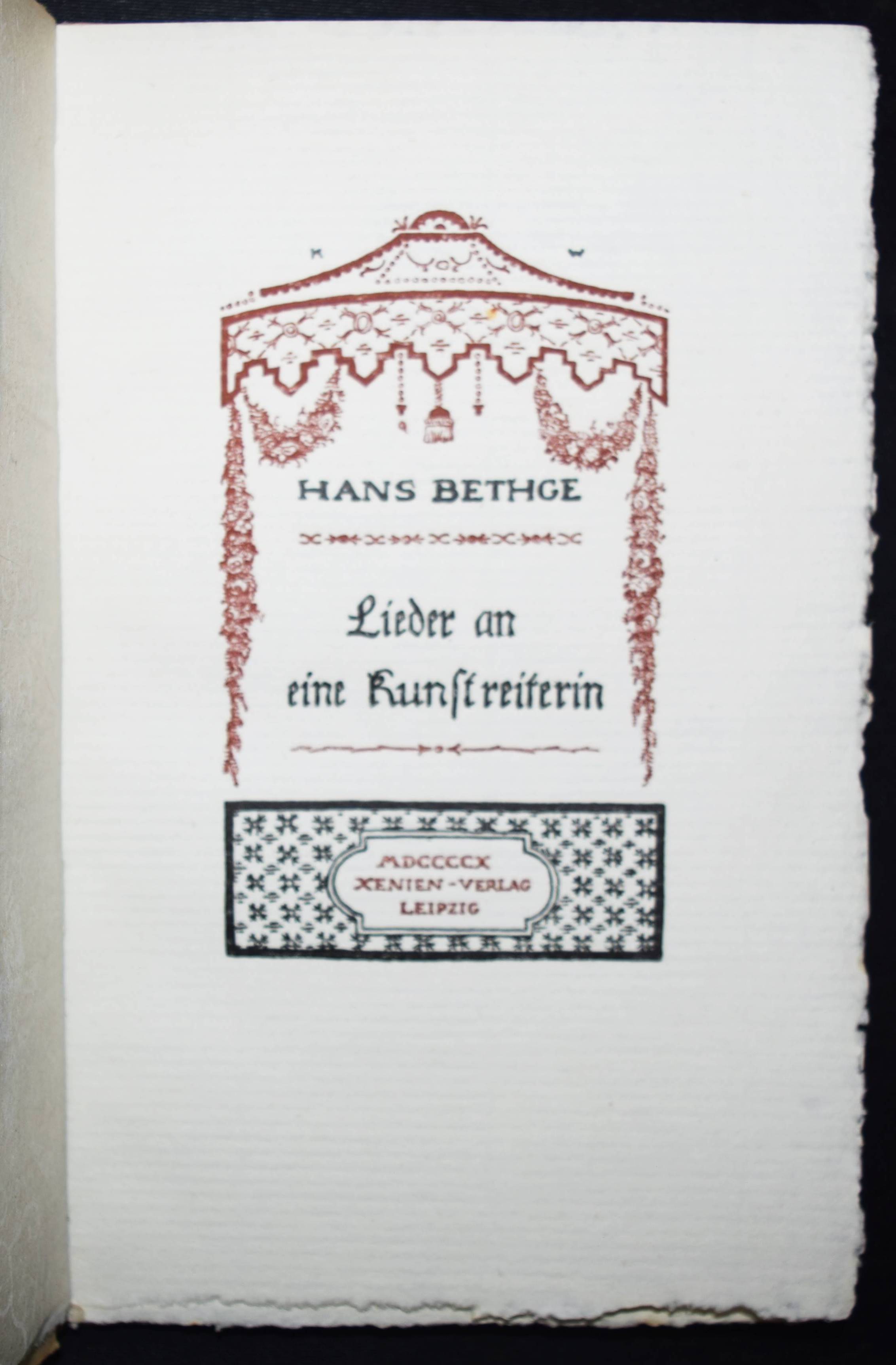 Bethge, Hans Lieder an eine Kunstreiterin. Leipzig, Xenien-Verlag 1910. 8°. 43, (1) S. mit illustriertem Titel und 1 Orig.-Radierung von Karl Walser als Frontispiz. Farbig illustr. OPbd. mit goldgepr. Rückenschild. Schauer II, 57. – Erste Ausgabe. – Eines von 500 num. Exemplaren. Von H. Bethge im Impressum signiert. – Druck in der Unger-Fraktur bei Poeschel & Trepte in Leipzig auf italienischem Büttenpapier. – Die Radierung durch das Seidenhemdchen wie meist etwas stockfleckig, sonst sehr gut erhalten.