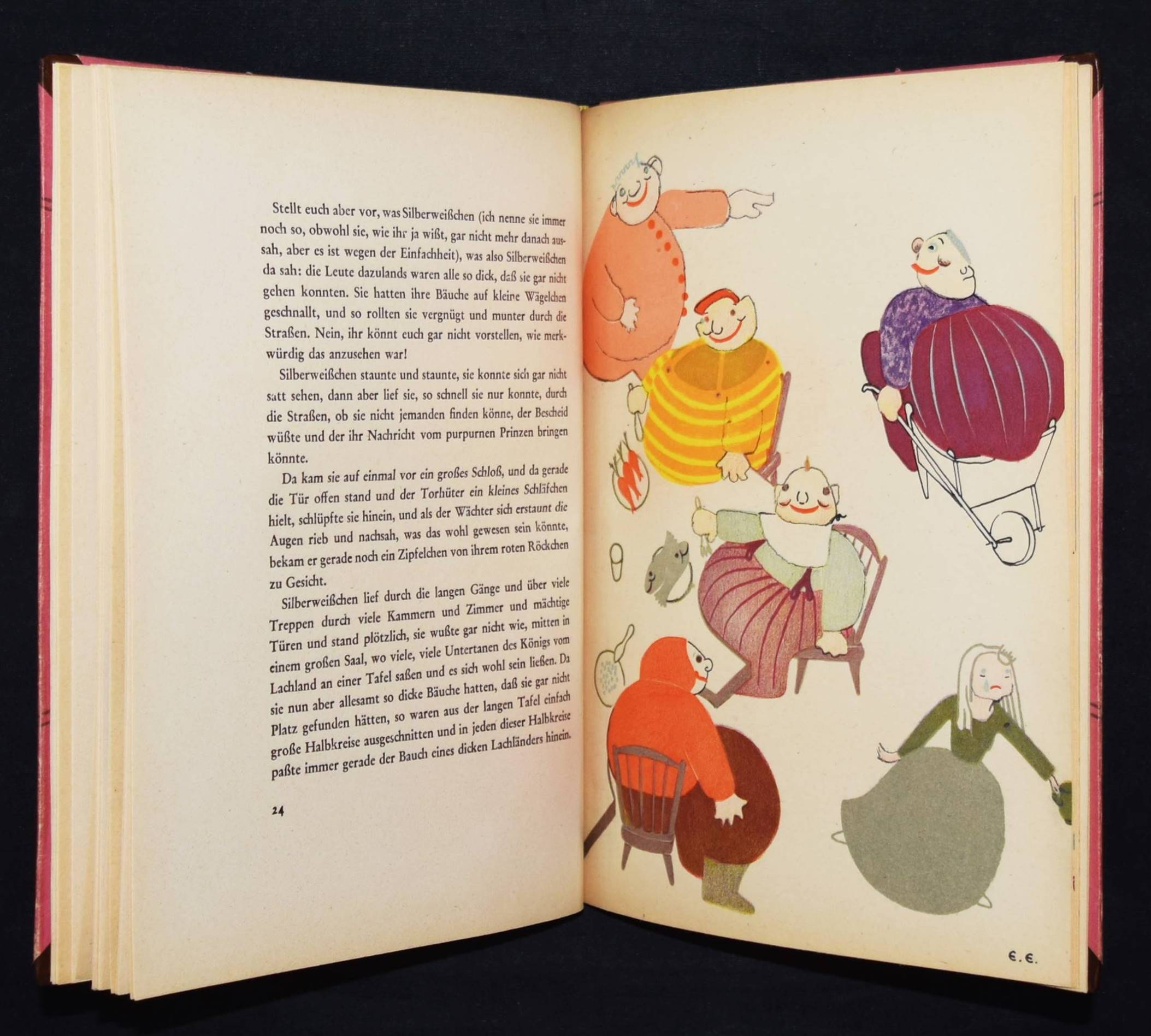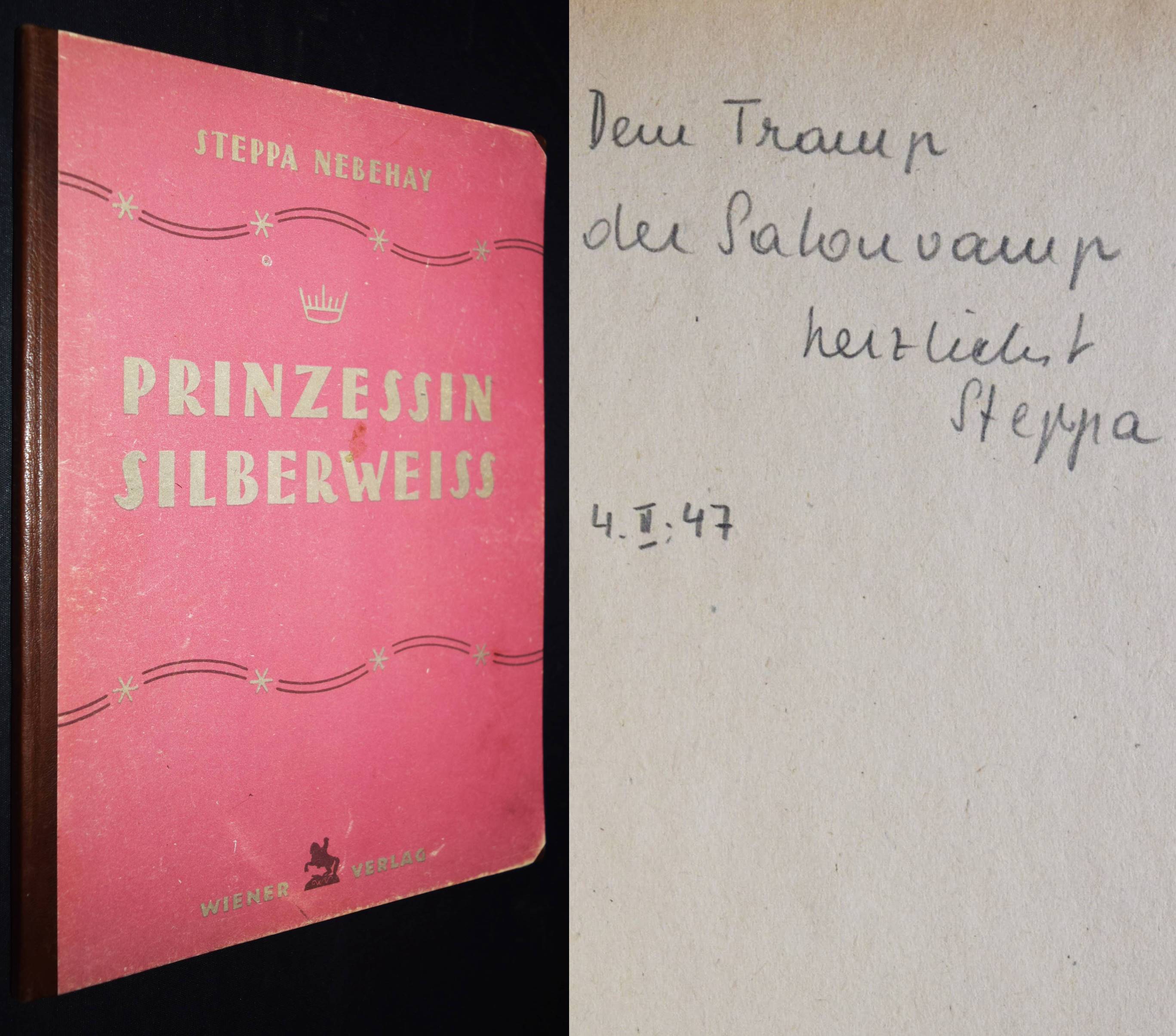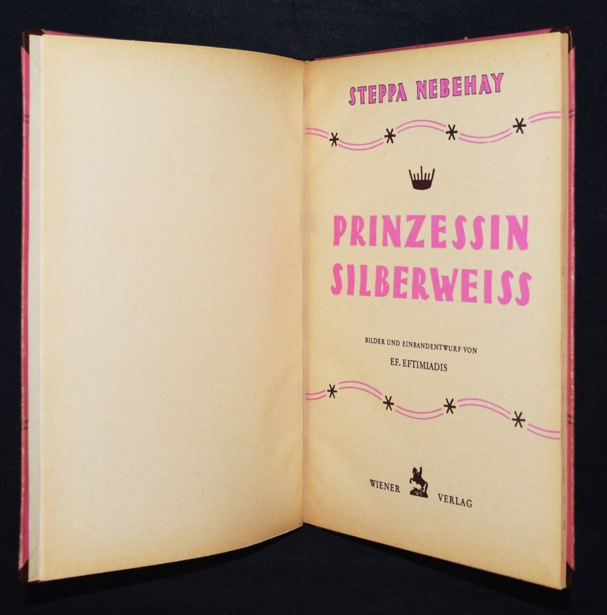 Nebehay, Steppa. Prinzessin Silberweiss. Wien, Wiener Verlag (1946). 4°. 36, (5) S. mit 8 farblithogr. Tafeln u. 2 Illustrationen im Text von Ef(timios) Eftimiadis. OHldr. mit silberfarb. Deckeltitel. Vgl. Muck II, 4900 (2. Ausgabe von 1948). – Erste Ausgabe des seltenen Wiener Märchenbilderbuchs mit außergewöhnlichen Illustrationen. – Mit eigenhändiger Widmung von S. Nebehay. – Die Autorin (1923-?) ist die Tochter des legendären Kunsthändlers Gustav Nebehay und die Schwester der bekannten Wiener Antiquare Christian M. und Ingo Nebehay.– Deckel etwas berieben, gutes Exemplar im seltenen Halbledereinband.